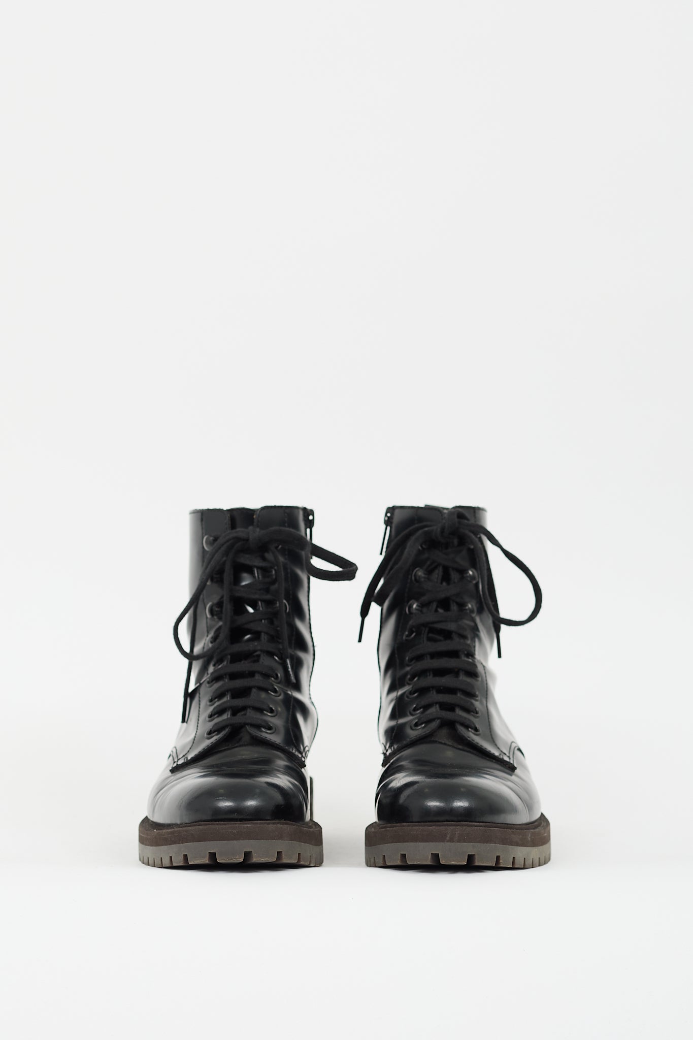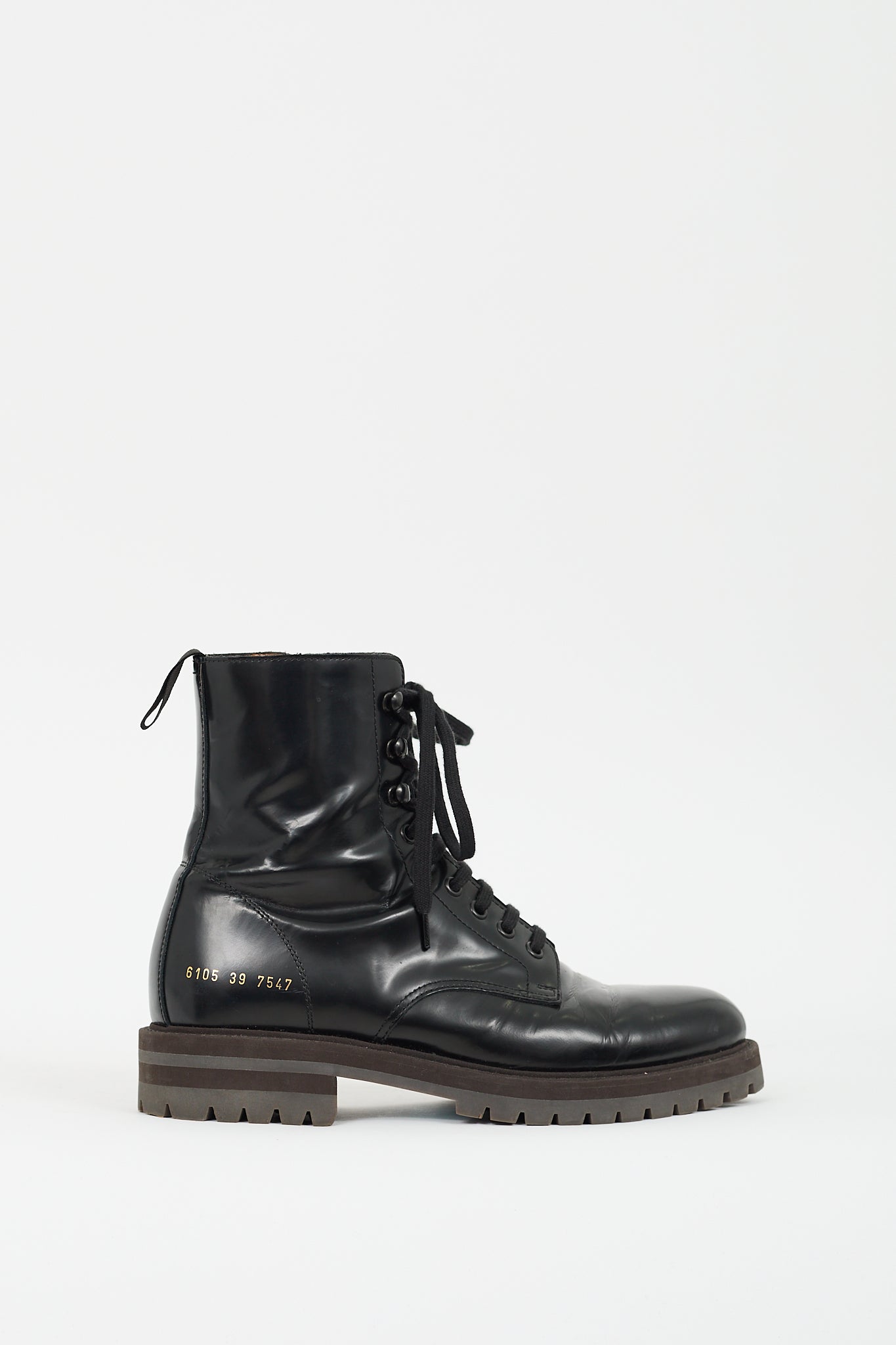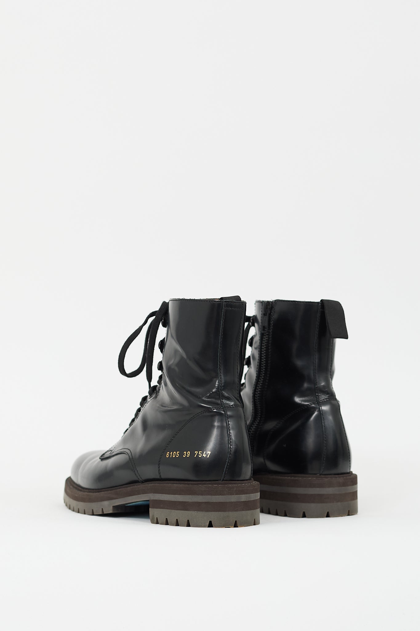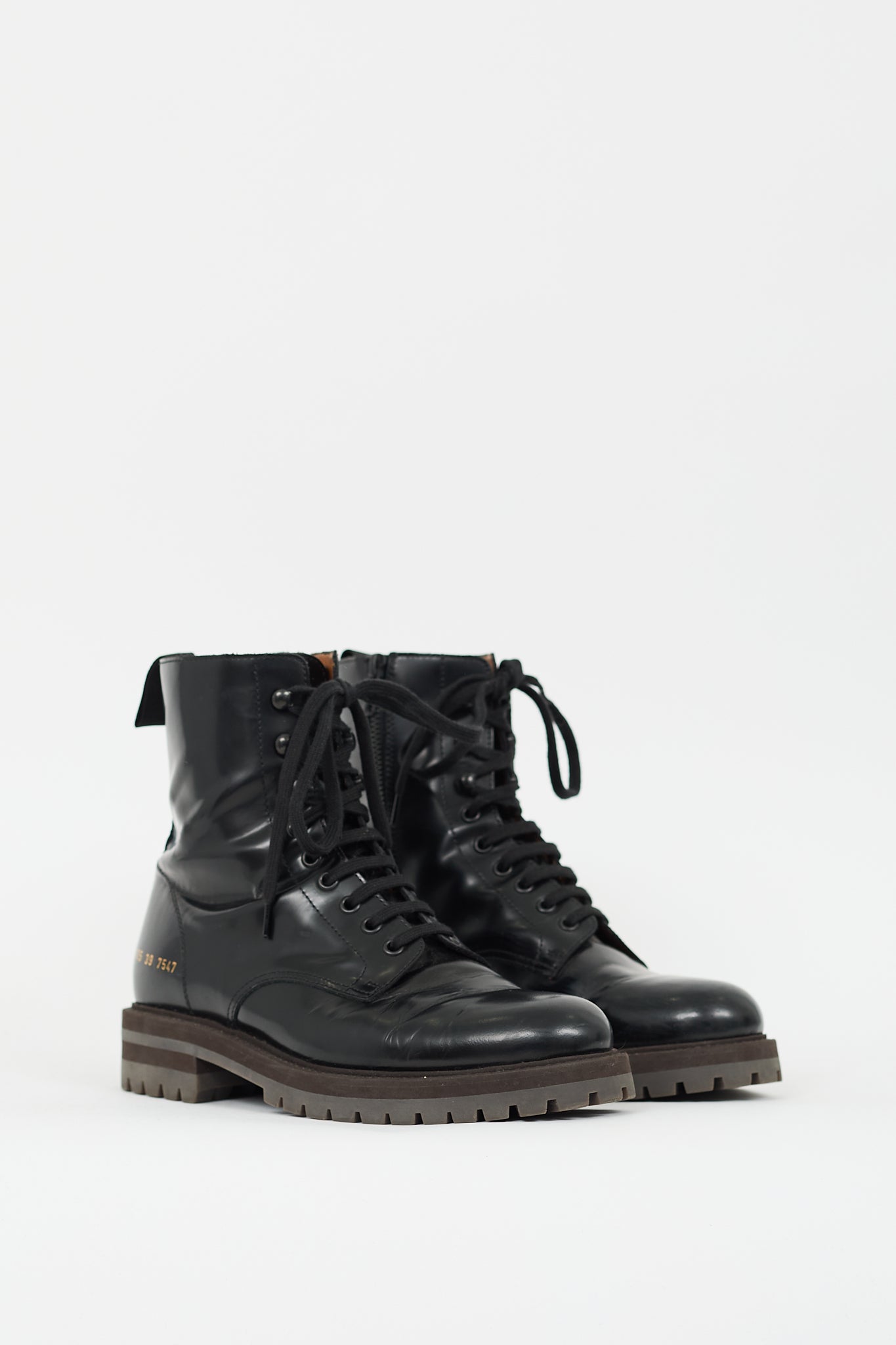 Pre-owned Woman by Common Projects combat boots featuring rounded toe, lace up front, inner side zip closure, pull tab at counter, gold tone printed numbers at outer side of counter, and rubber lug sole.