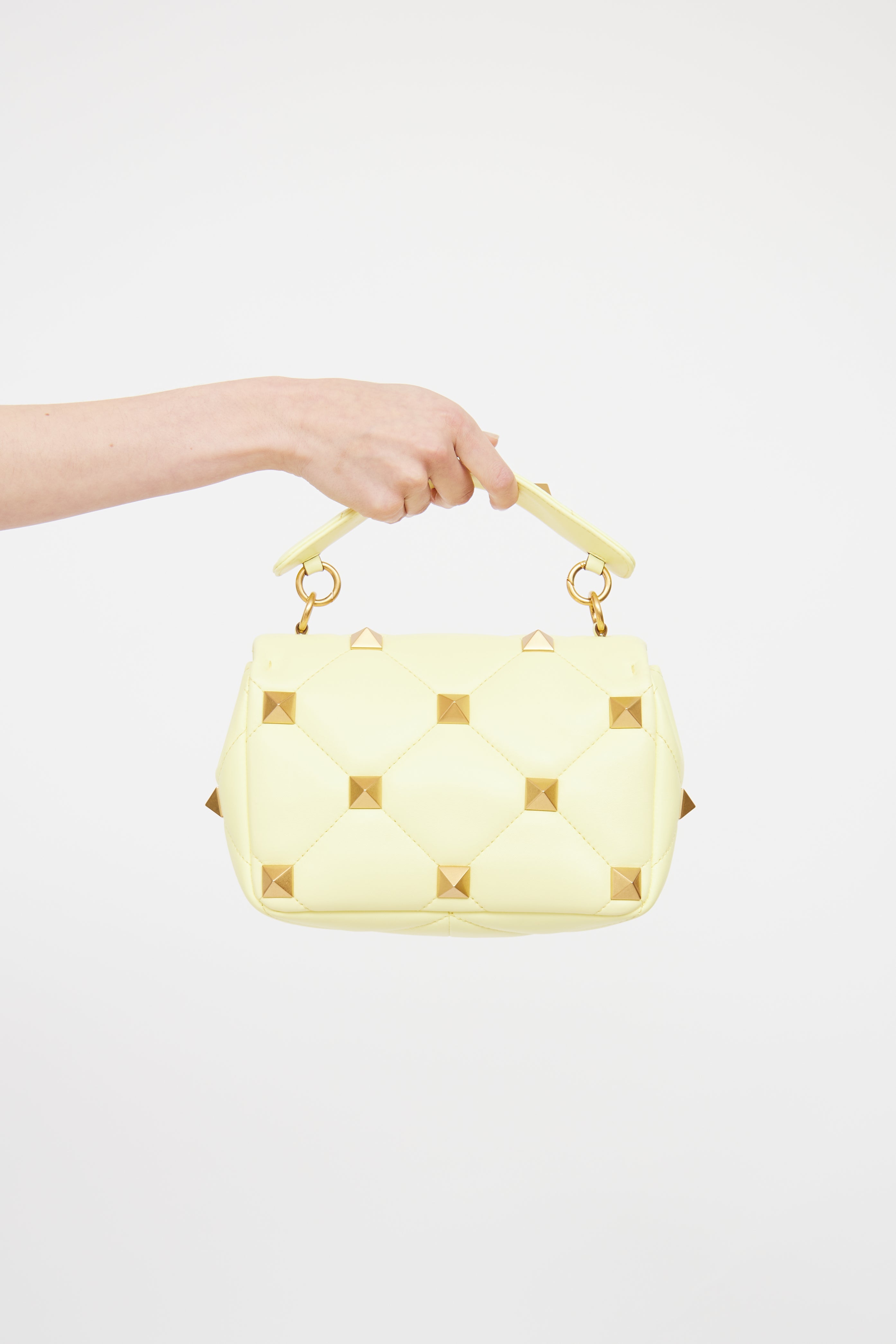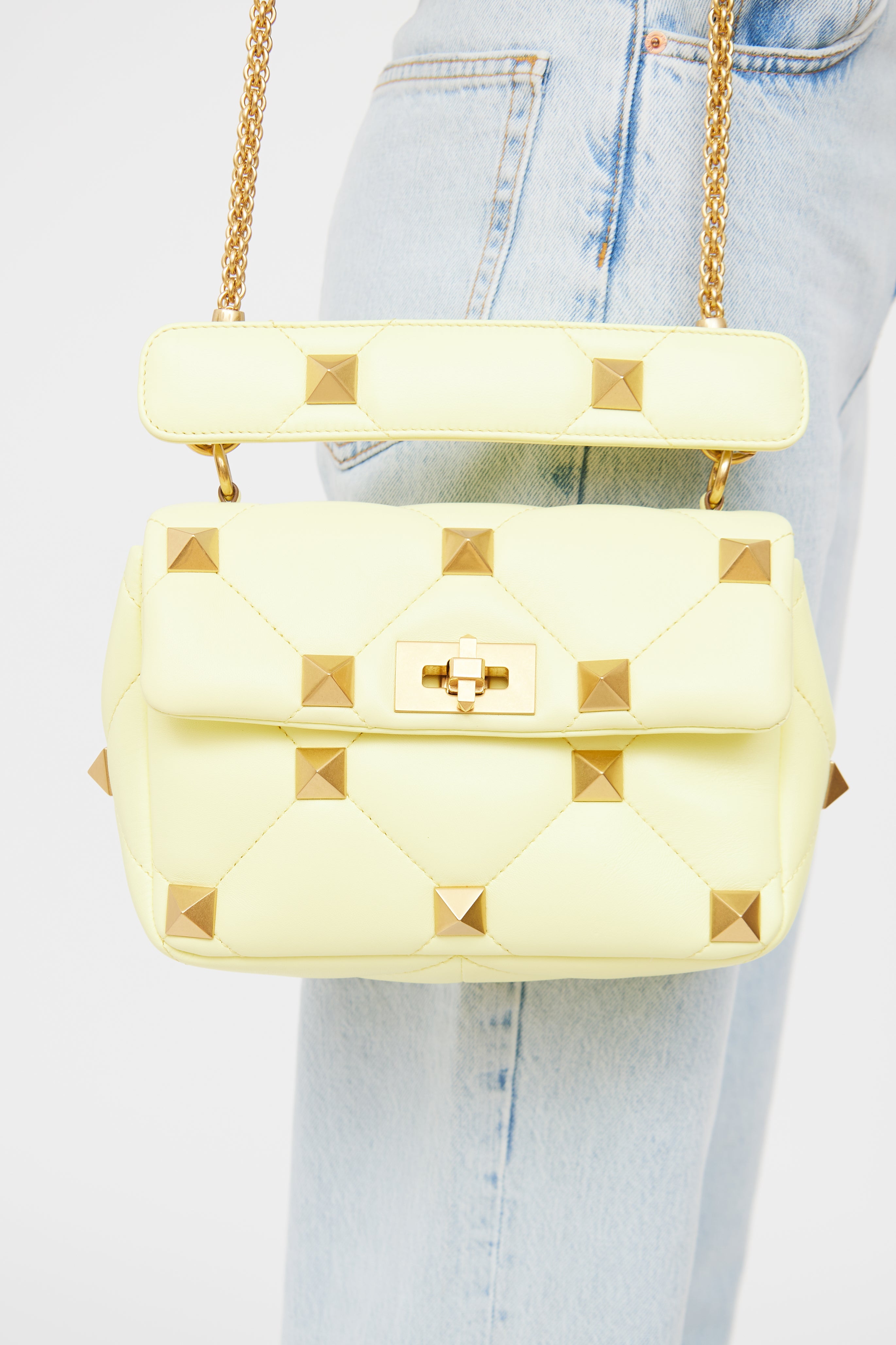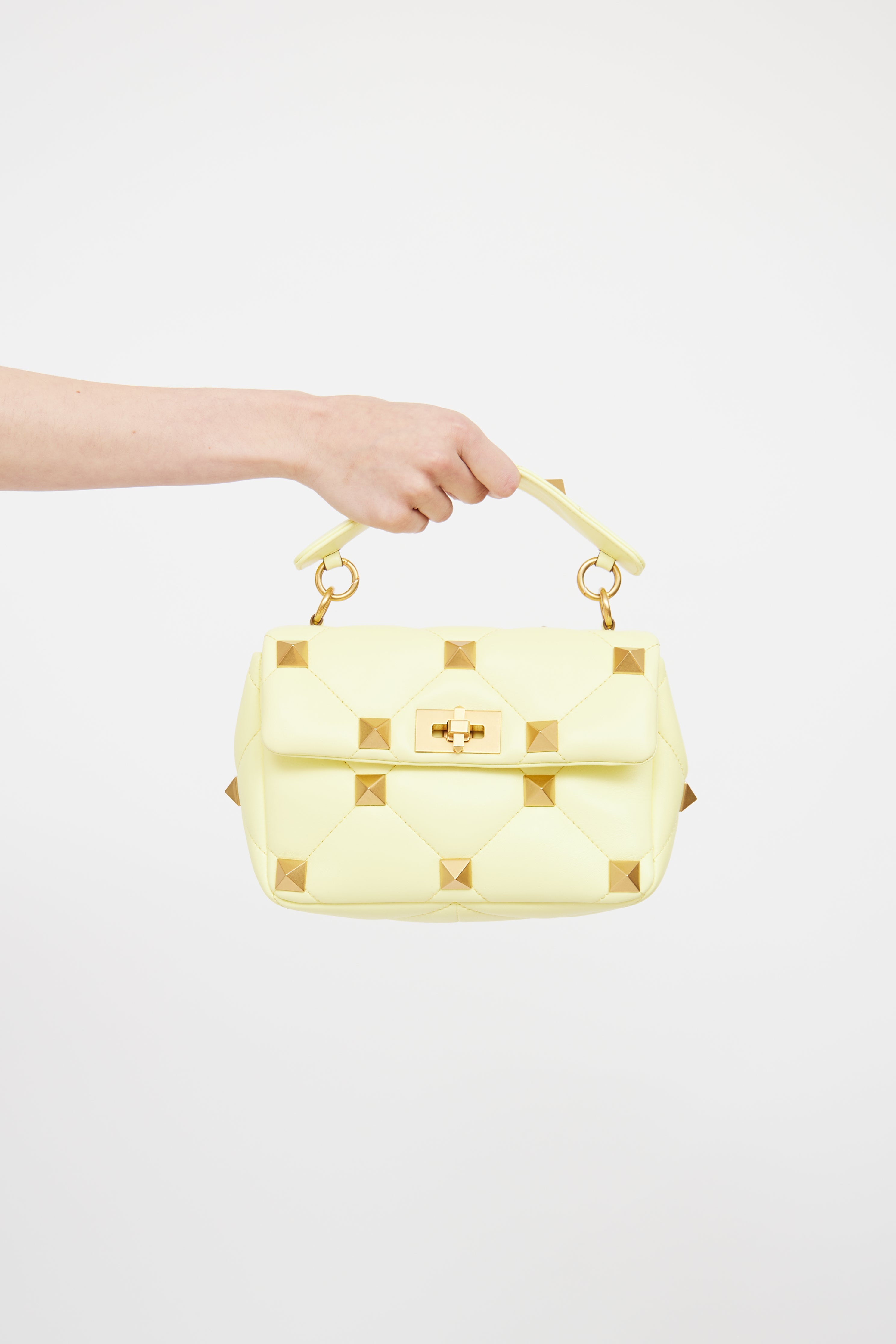 Pre-owned Valentino yellow Roman Stud leather bag featuring quilted stitching, gold tone rockstud hardware, two main compartments with one slip pocket, removable chain shoulder strap, wrapped top handle and twist lock closure.