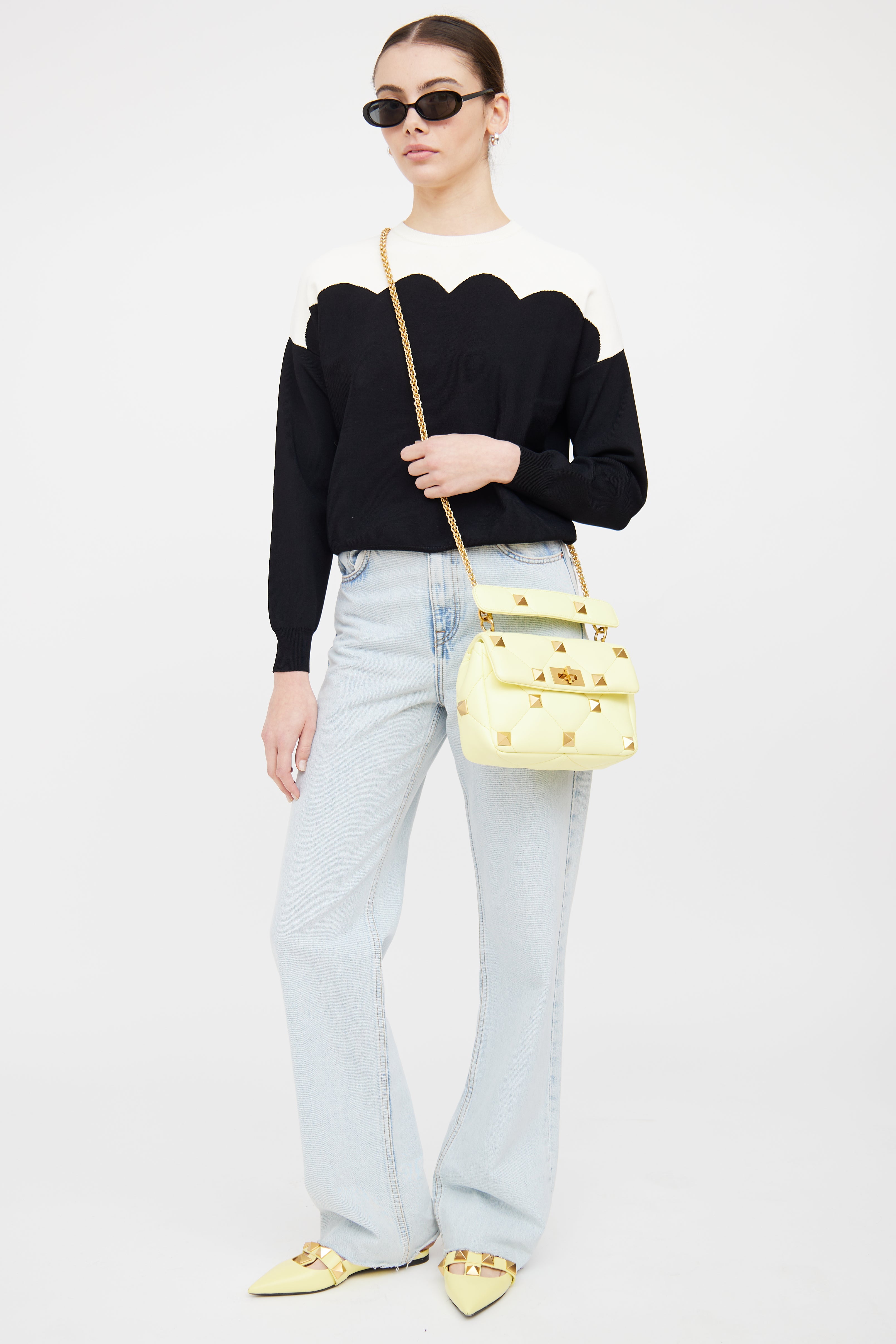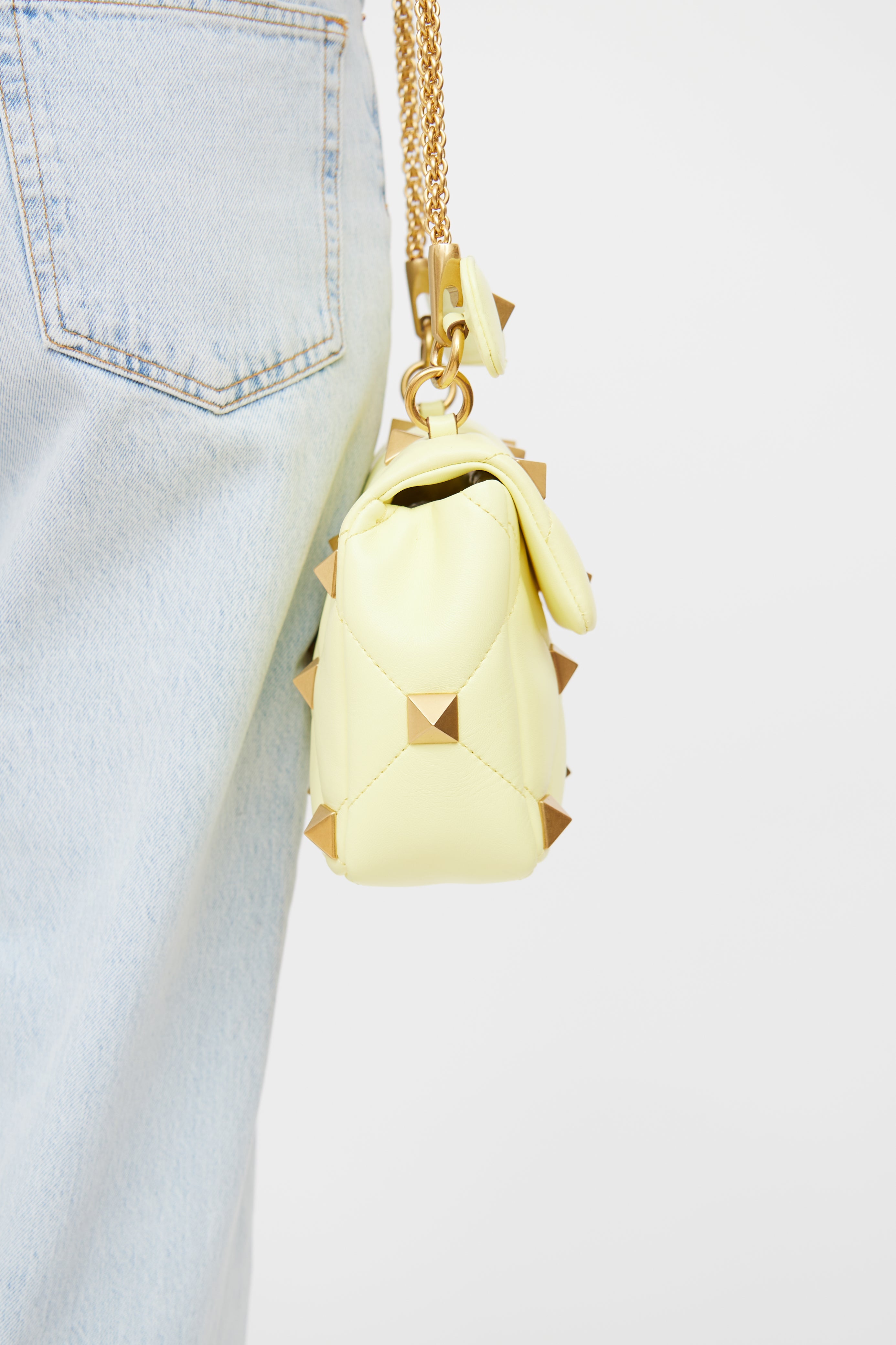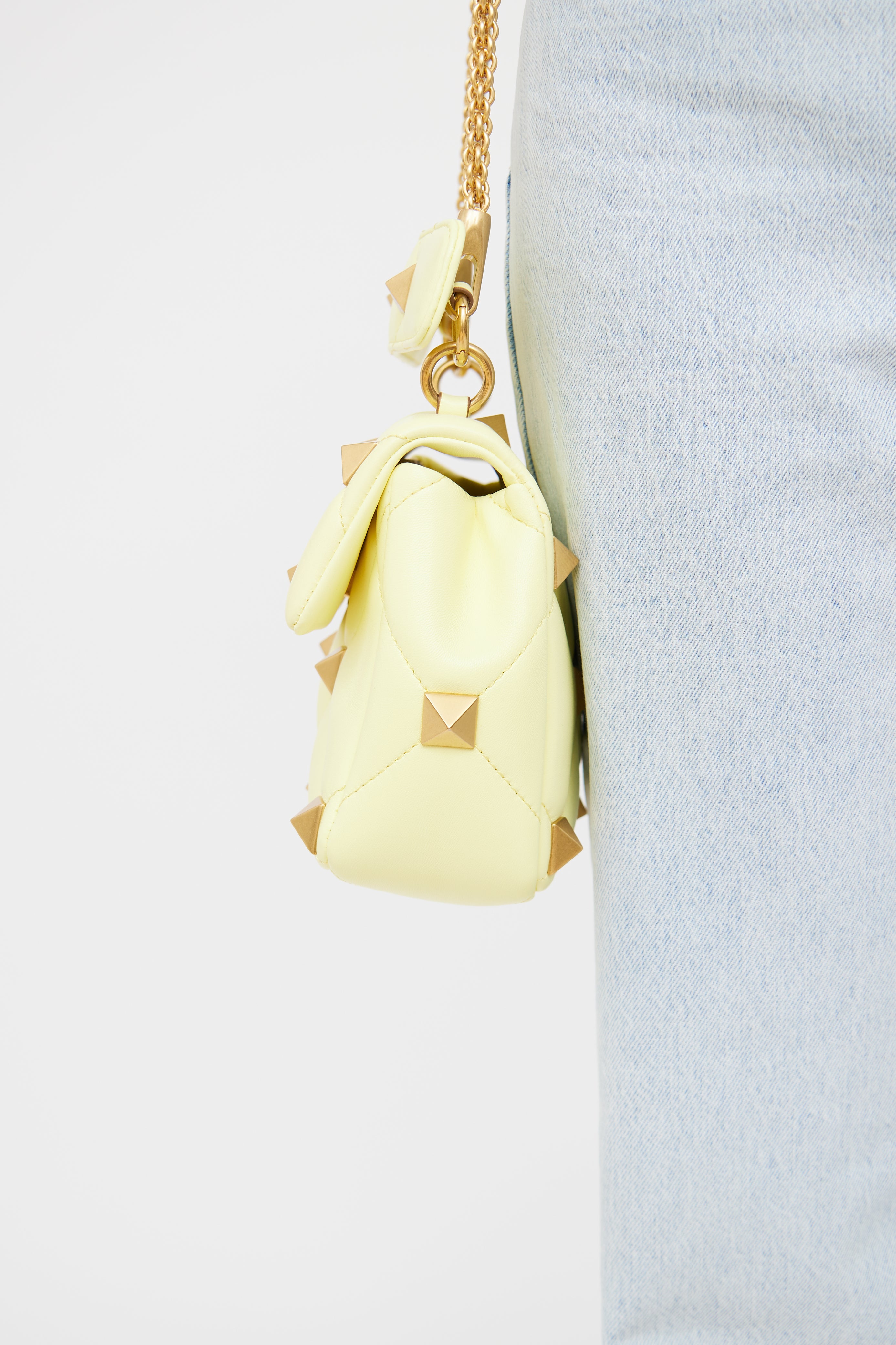 Pre-owned Valentino yellow Roman Stud leather bag featuring quilted stitching, gold tone rockstud hardware, two main compartments with one slip pocket, removable chain shoulder strap, wrapped top handle and twist lock closure.