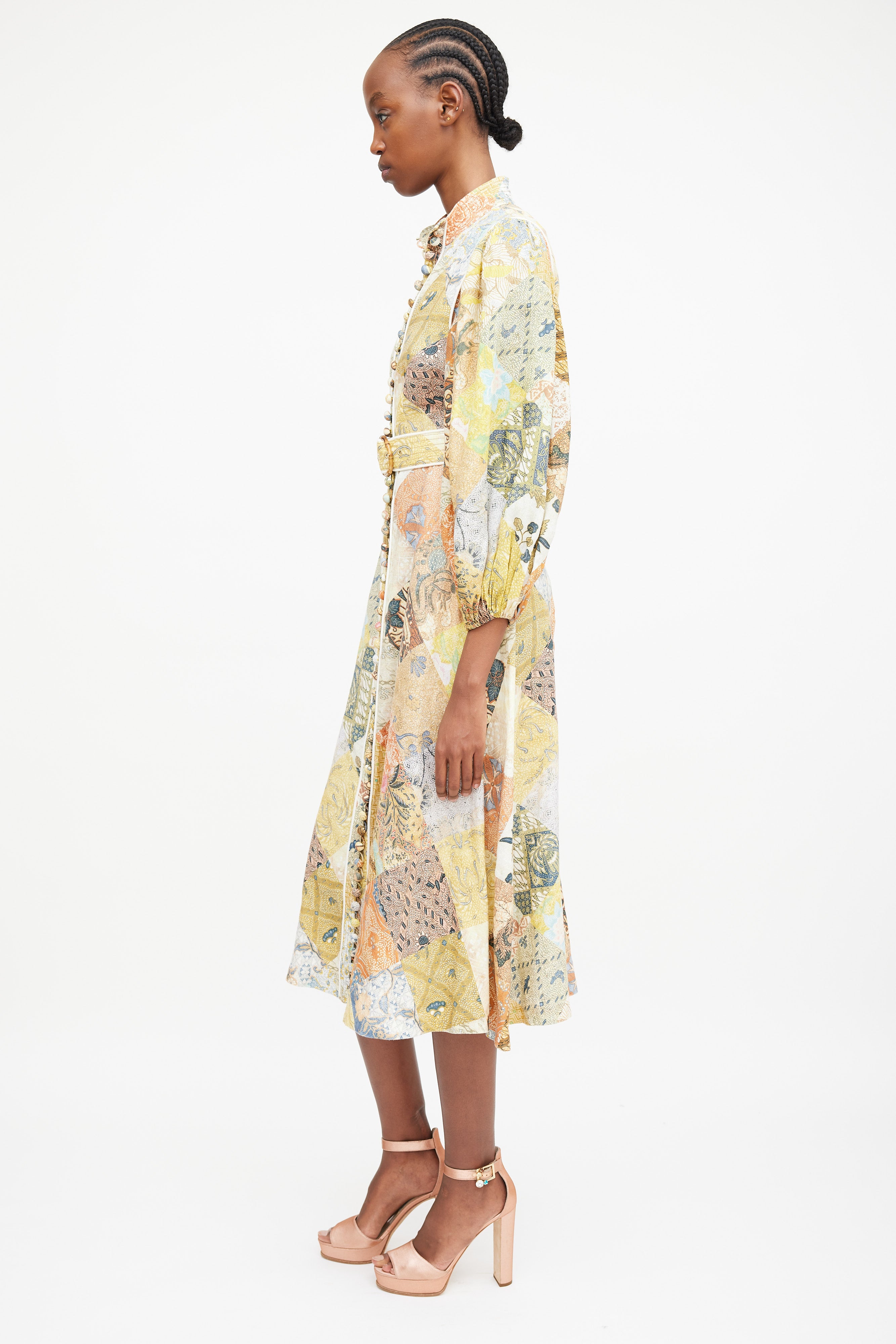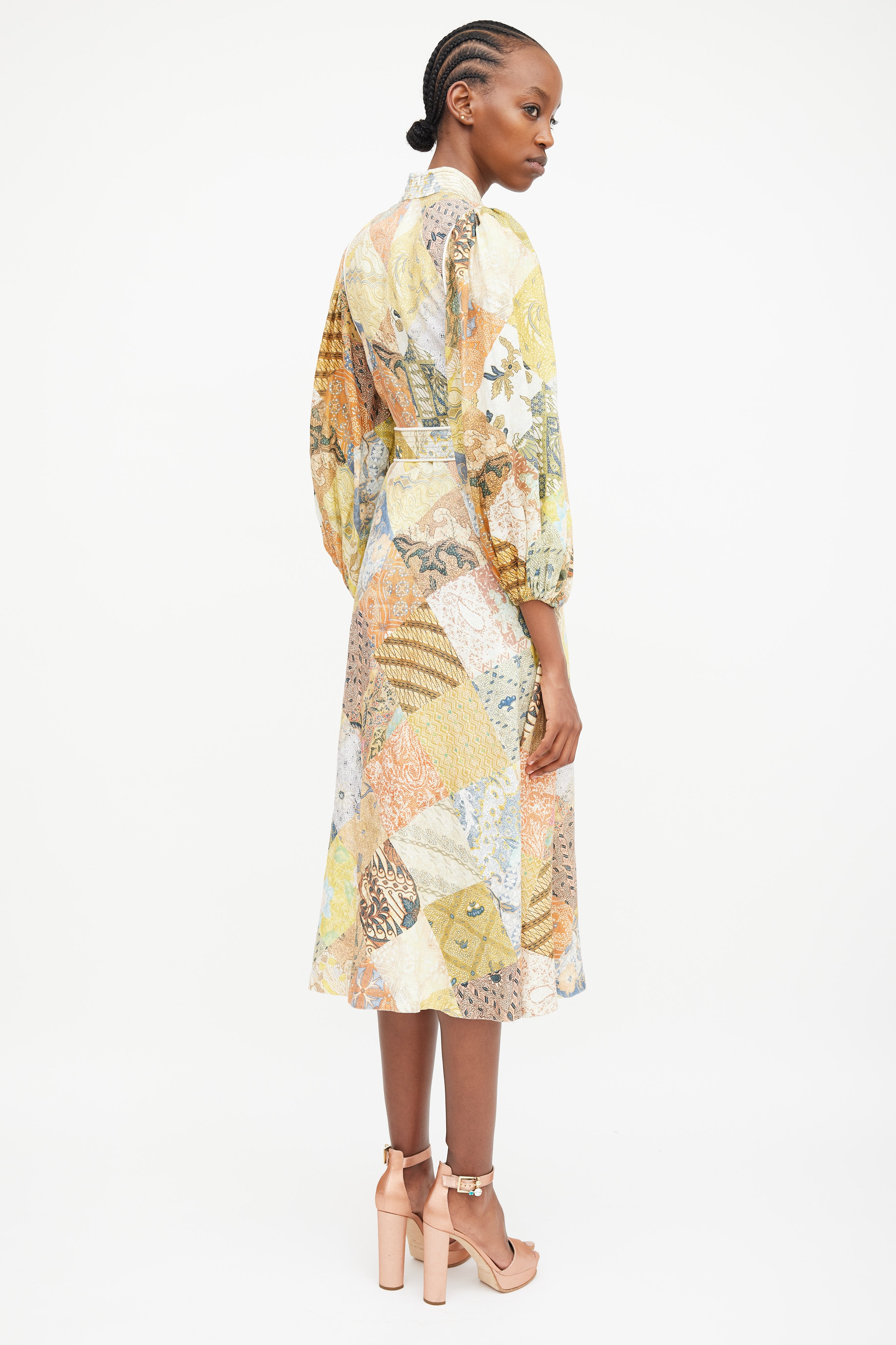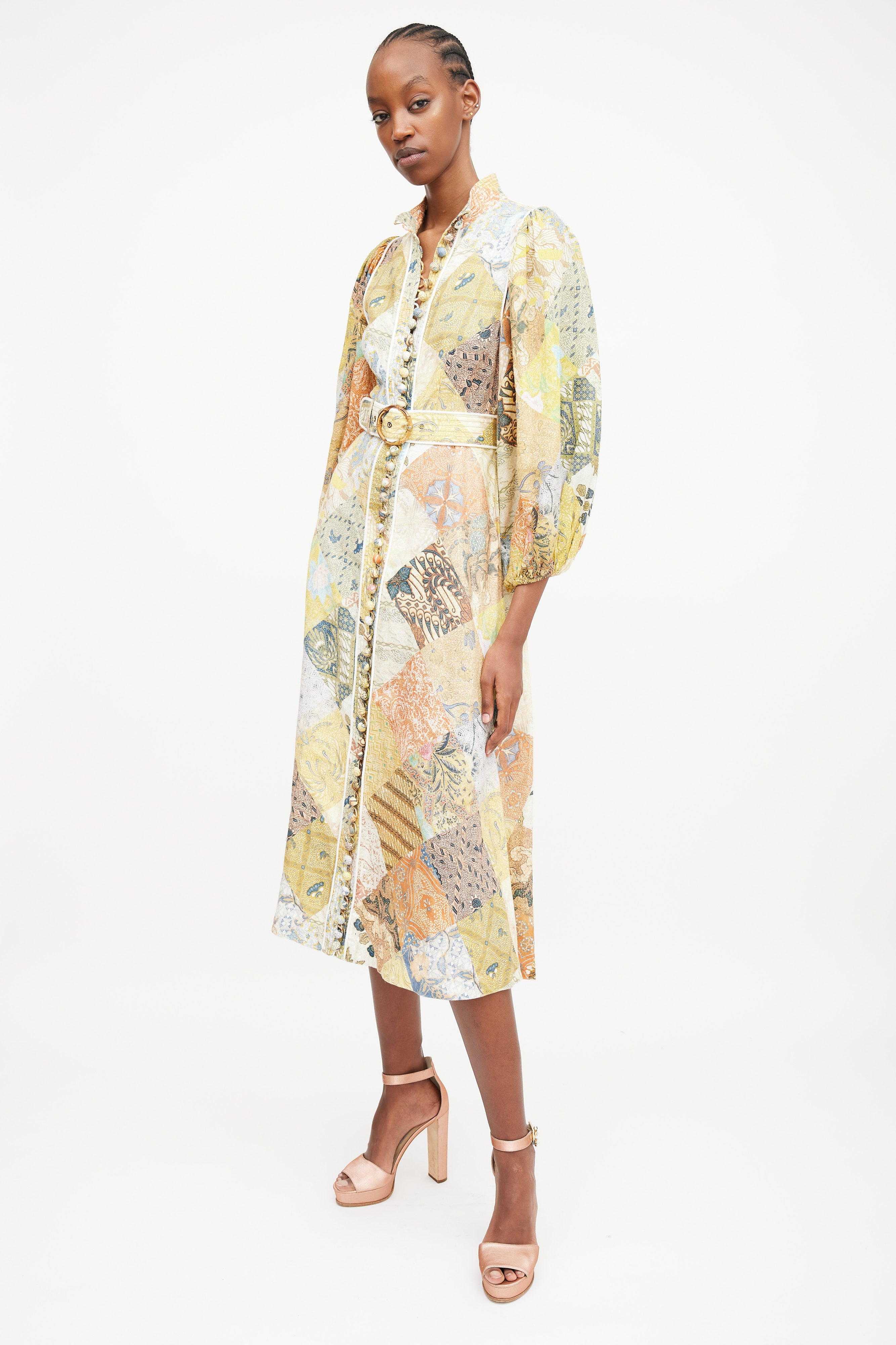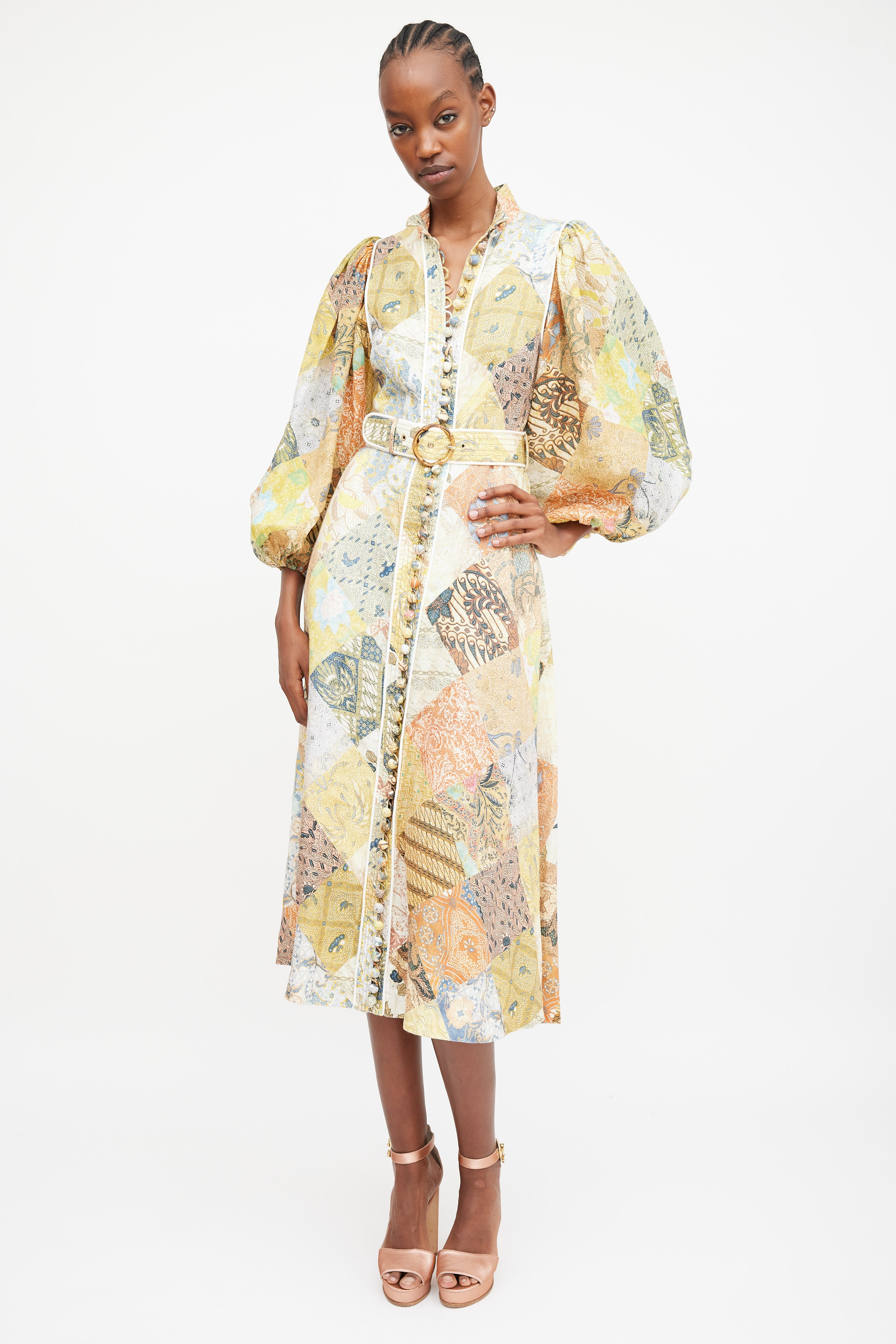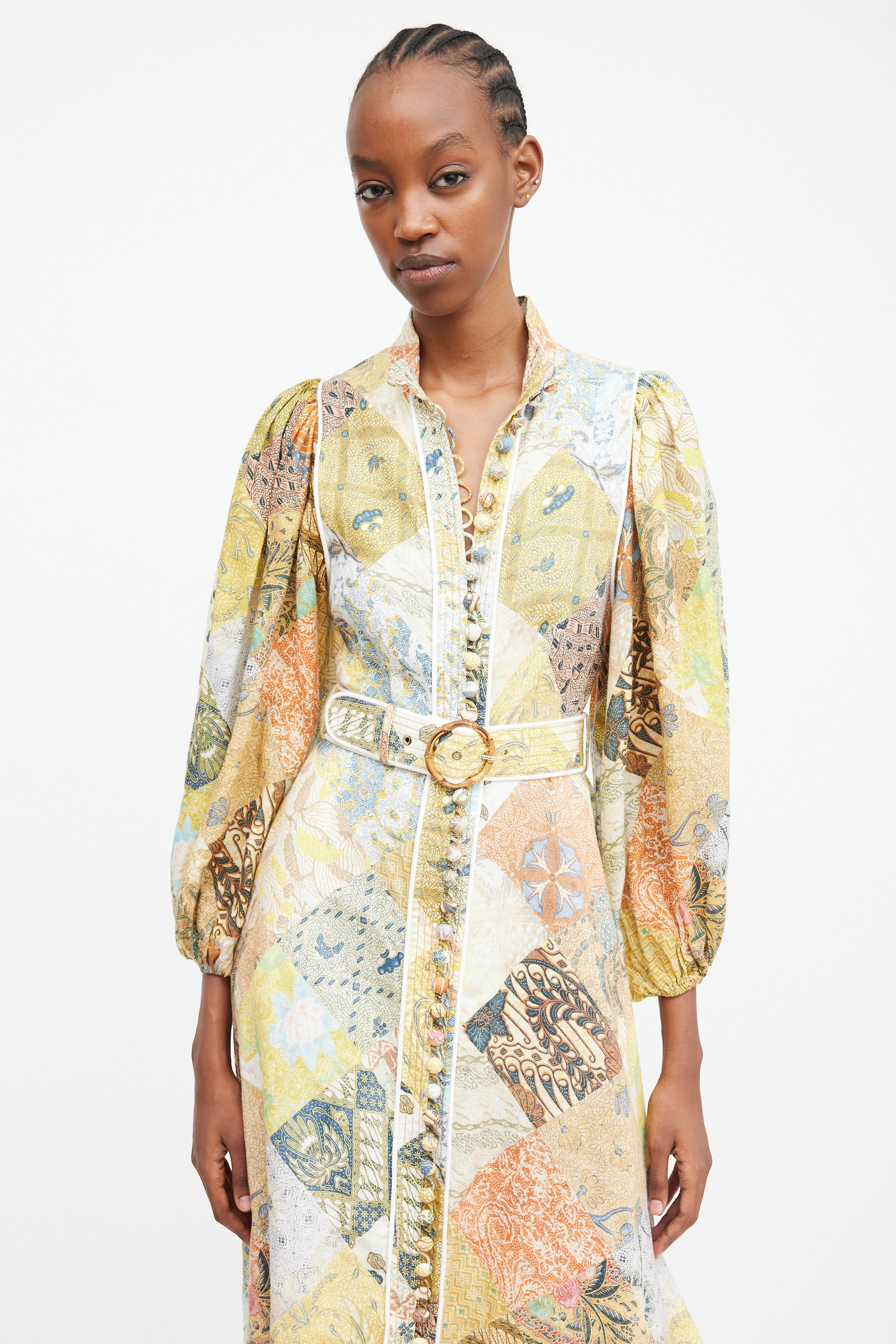 Pre-owned Zimmermann multicolour linen Brightside dress featuring mock collar, button up front, patchwork batik print, blouson sleeves with elasticized cuffs, two hip pockets, concealed zip closure at back, and tonal waist belt.