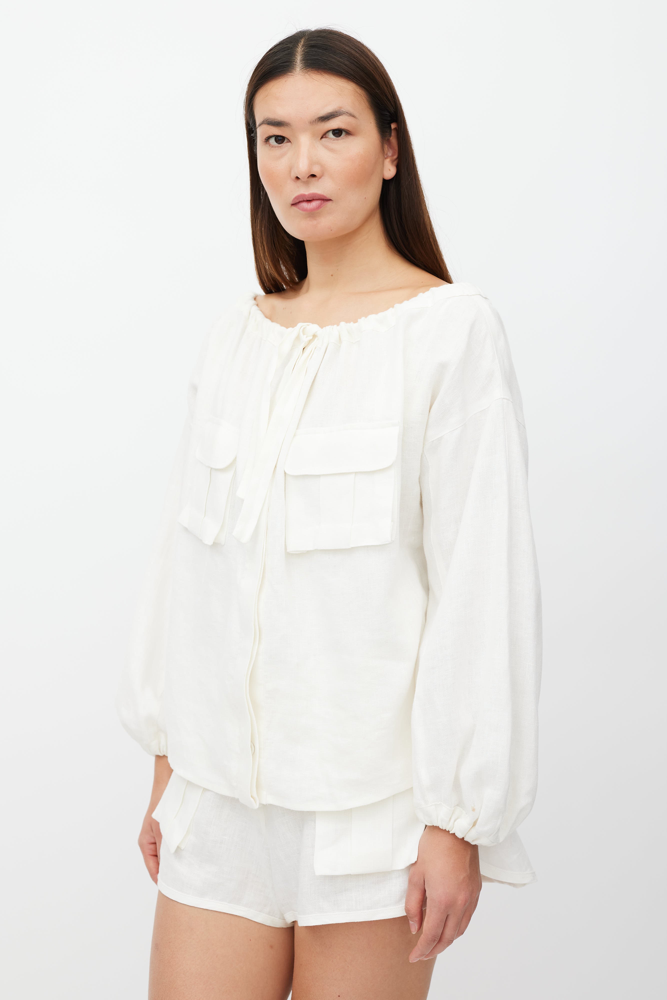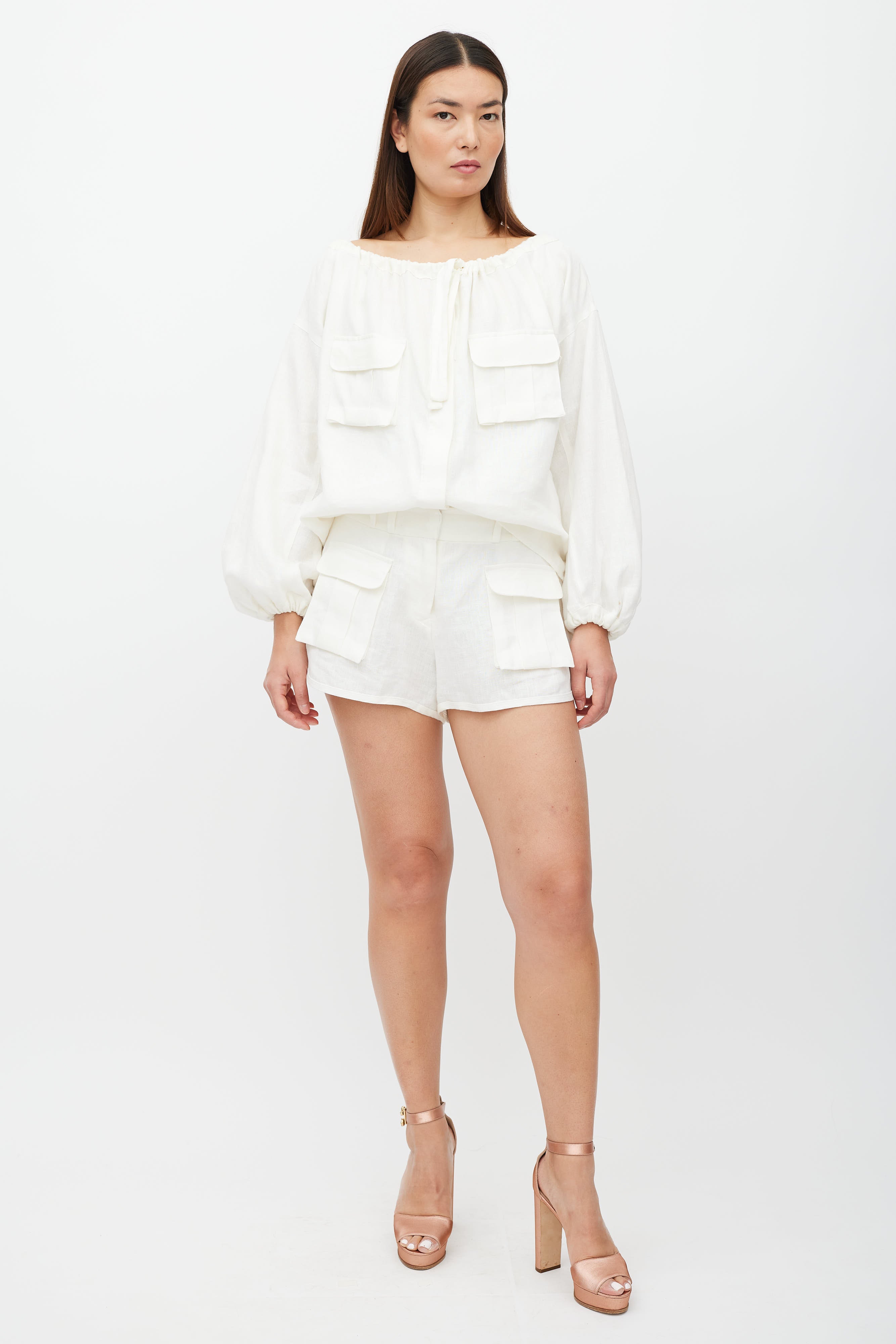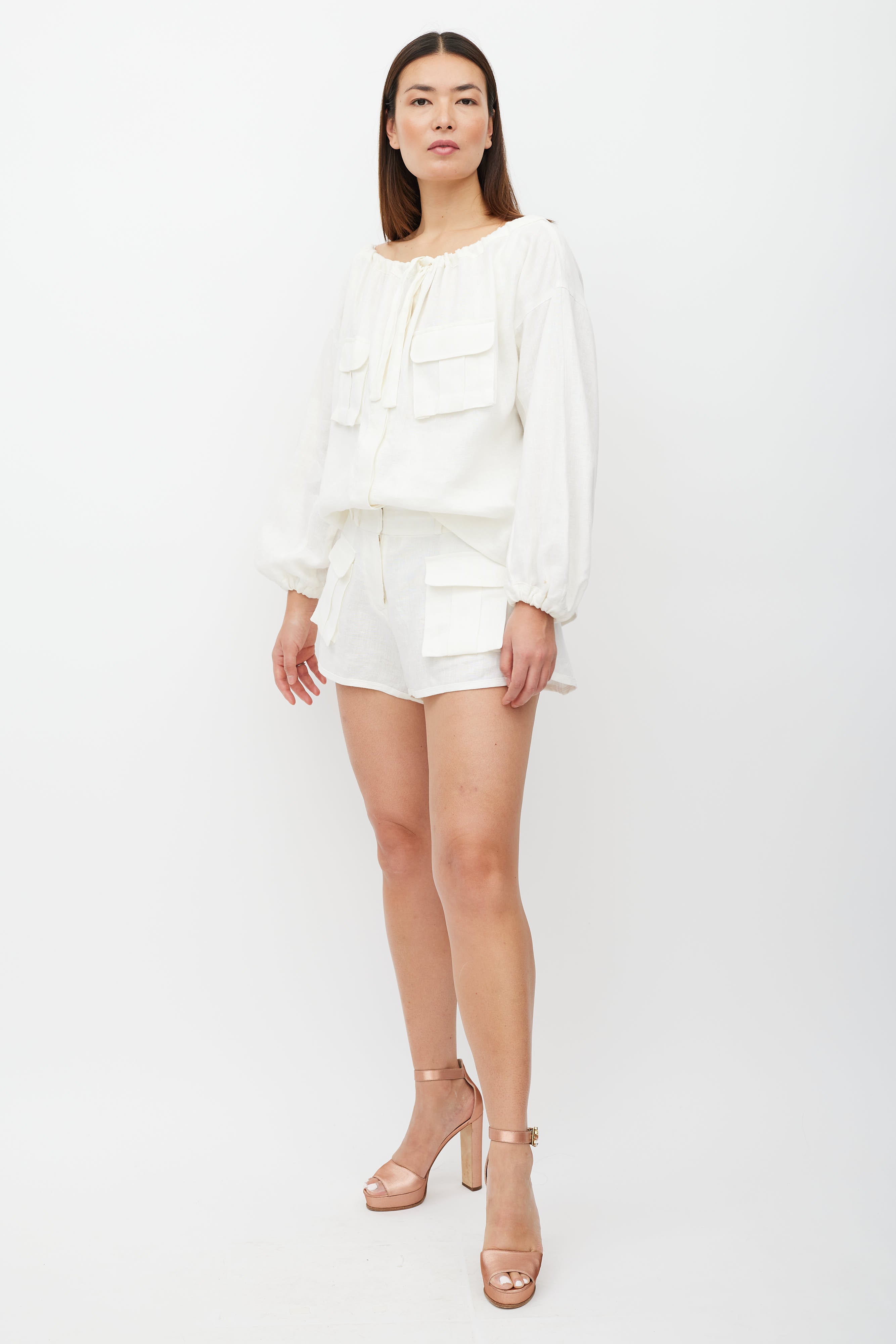 Pre-owned Zimmermann white linen co-ord set featuring a top with wide drawstring neckline, two cargo pockets at front chest, dropped shoulders, long sleeves with elasticized cuffs, and a button front closure. Matching shorts feature two front cargo pockets, waist band with belt loops, and front zip closure with top hook and eye fasteners. Shorts clipped to fit model.