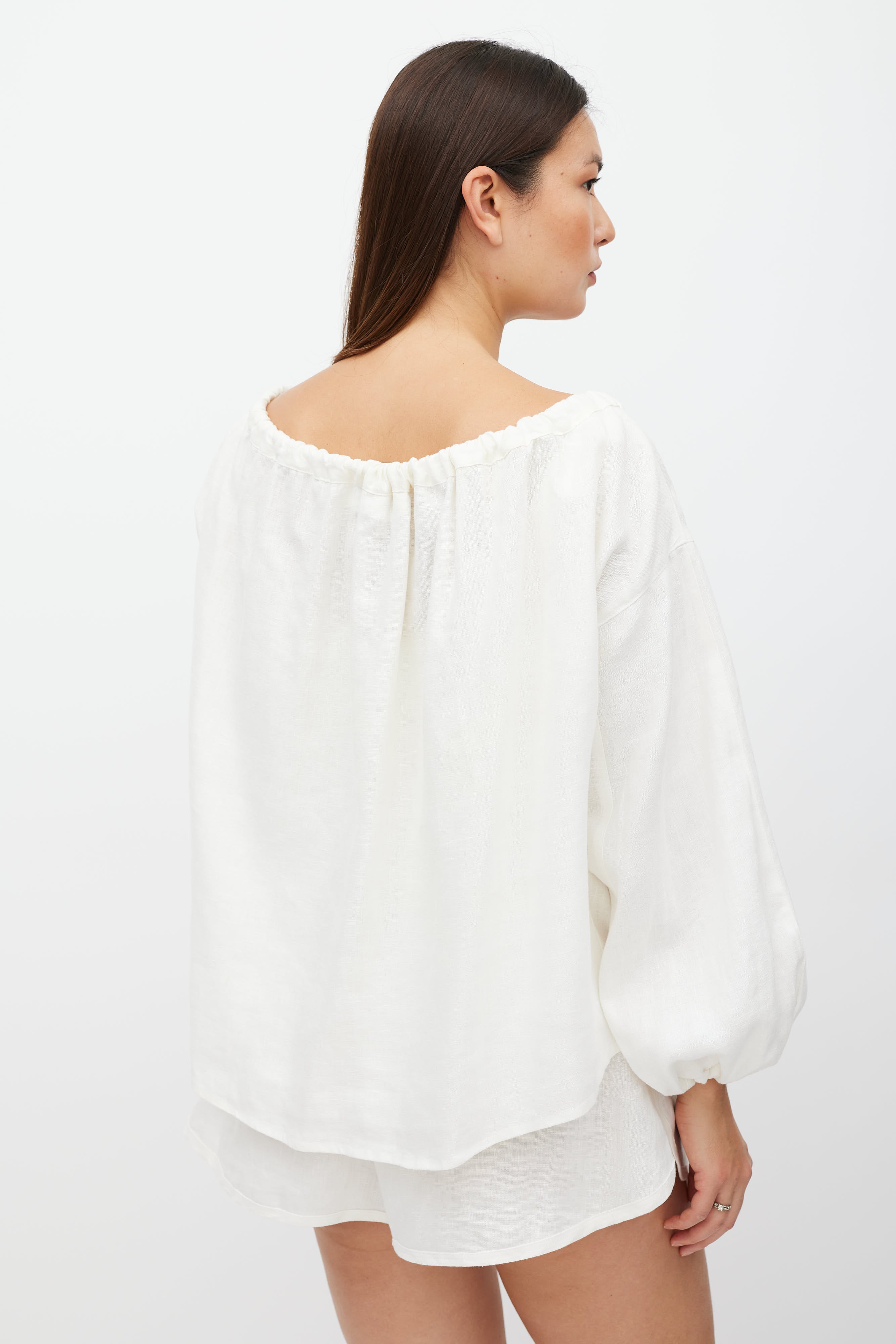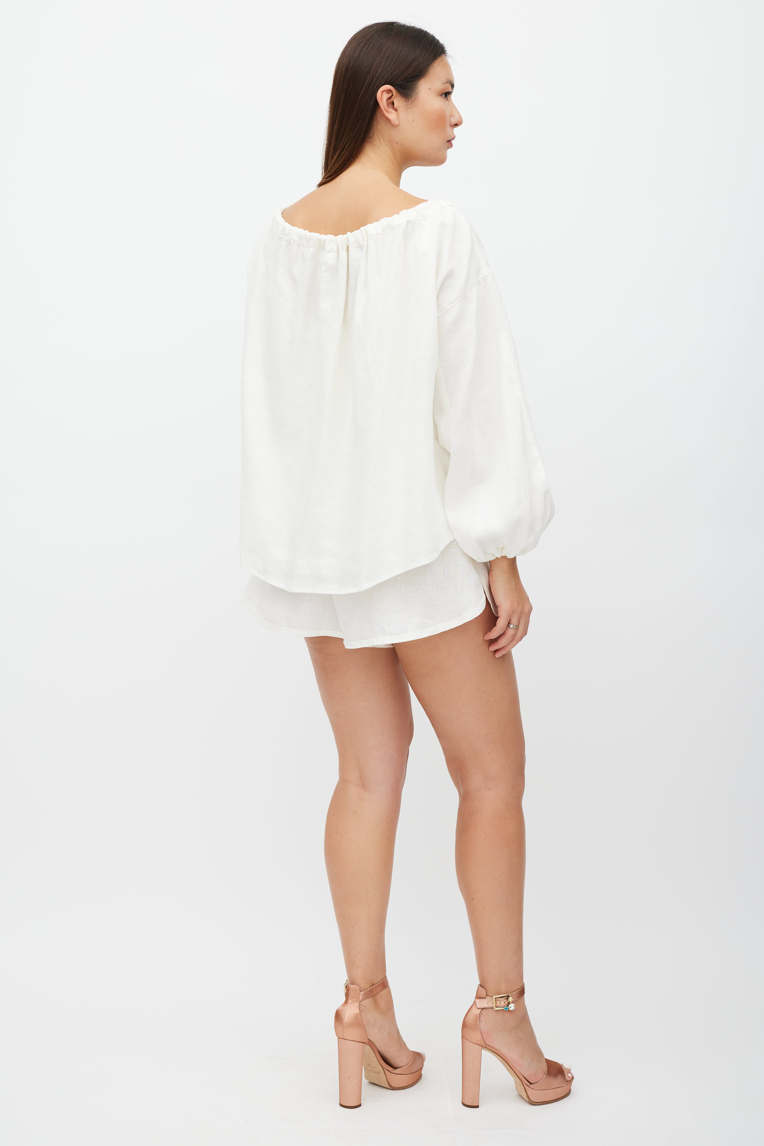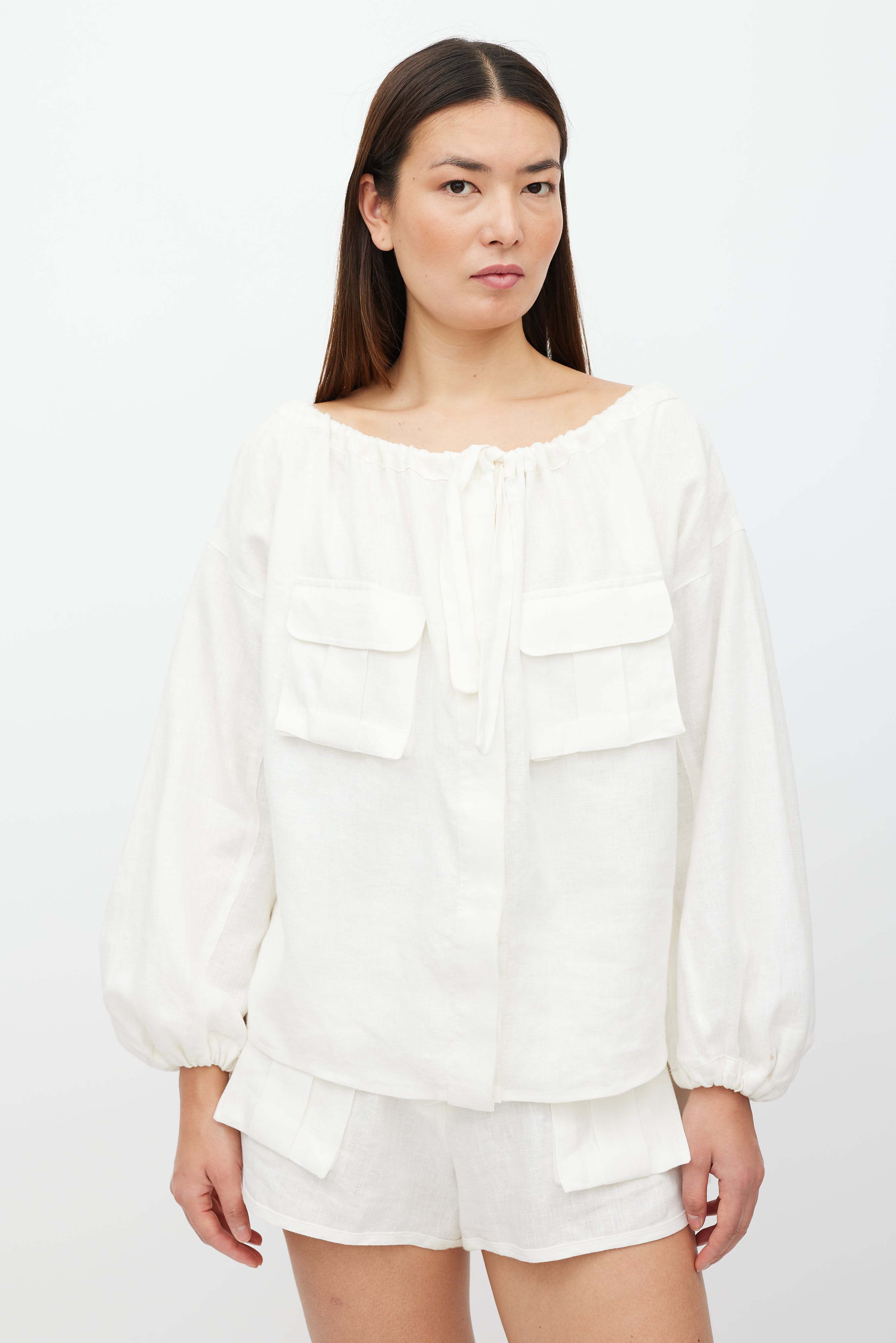 Pre-owned Zimmermann white linen co-ord set featuring a top with wide drawstring neckline, two cargo pockets at front chest, dropped shoulders, long sleeves with elasticized cuffs, and a button front closure. Matching shorts feature two front cargo pockets, waist band with belt loops, and front zip closure with top hook and eye fasteners. Shorts clipped to fit model.