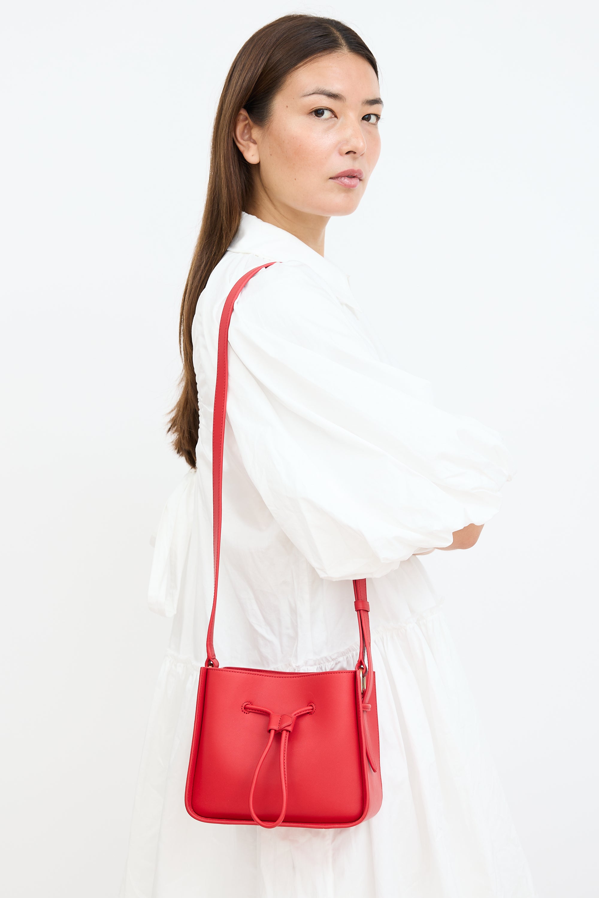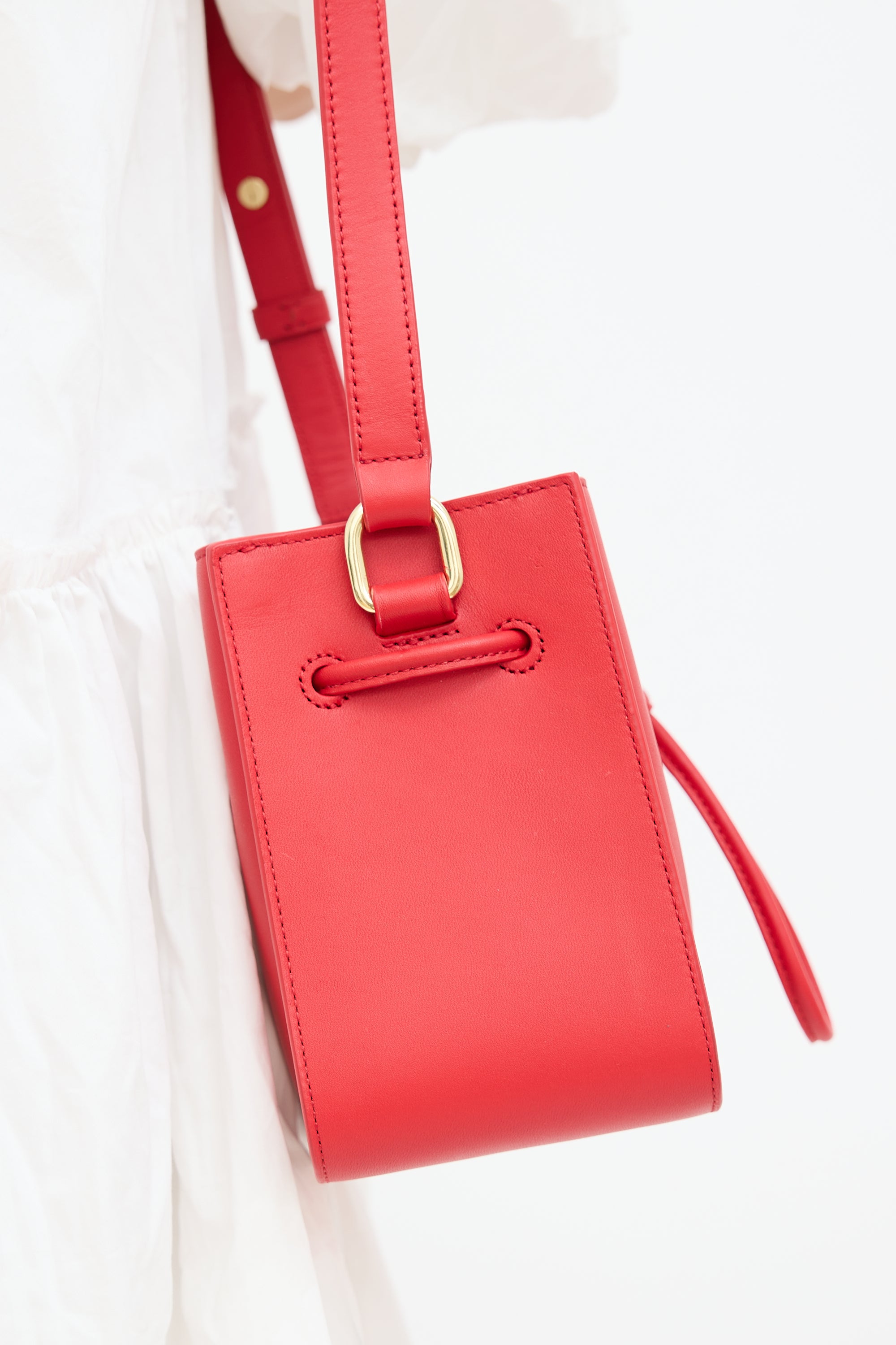 Pre-owned 3.1 Phillip Lim red leather Soleil Mini Bucket bag featuring attached adjustable shoulder strap, drawstring closure, open main compartment, and one slip pocket inside. Comes with original dust bag.