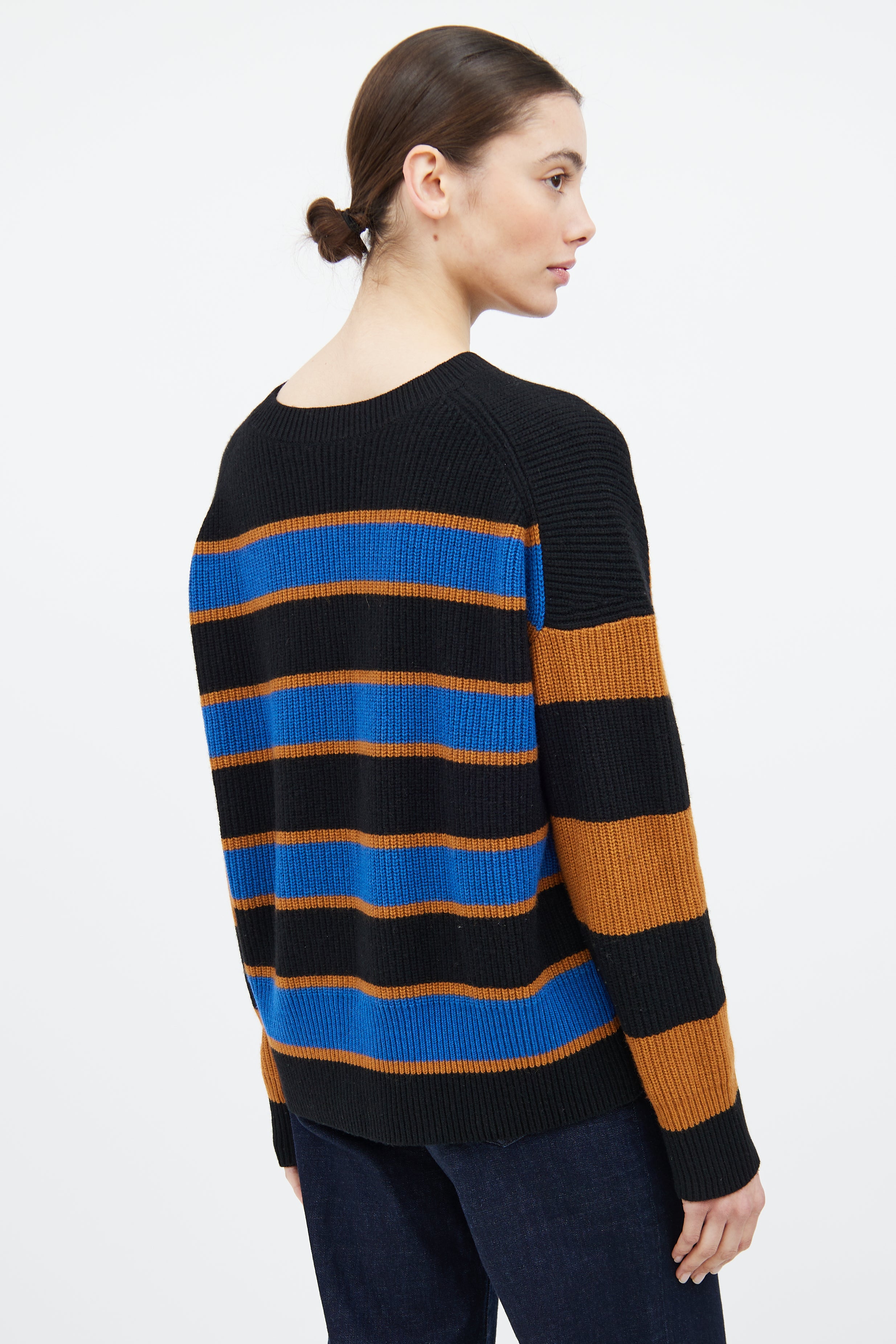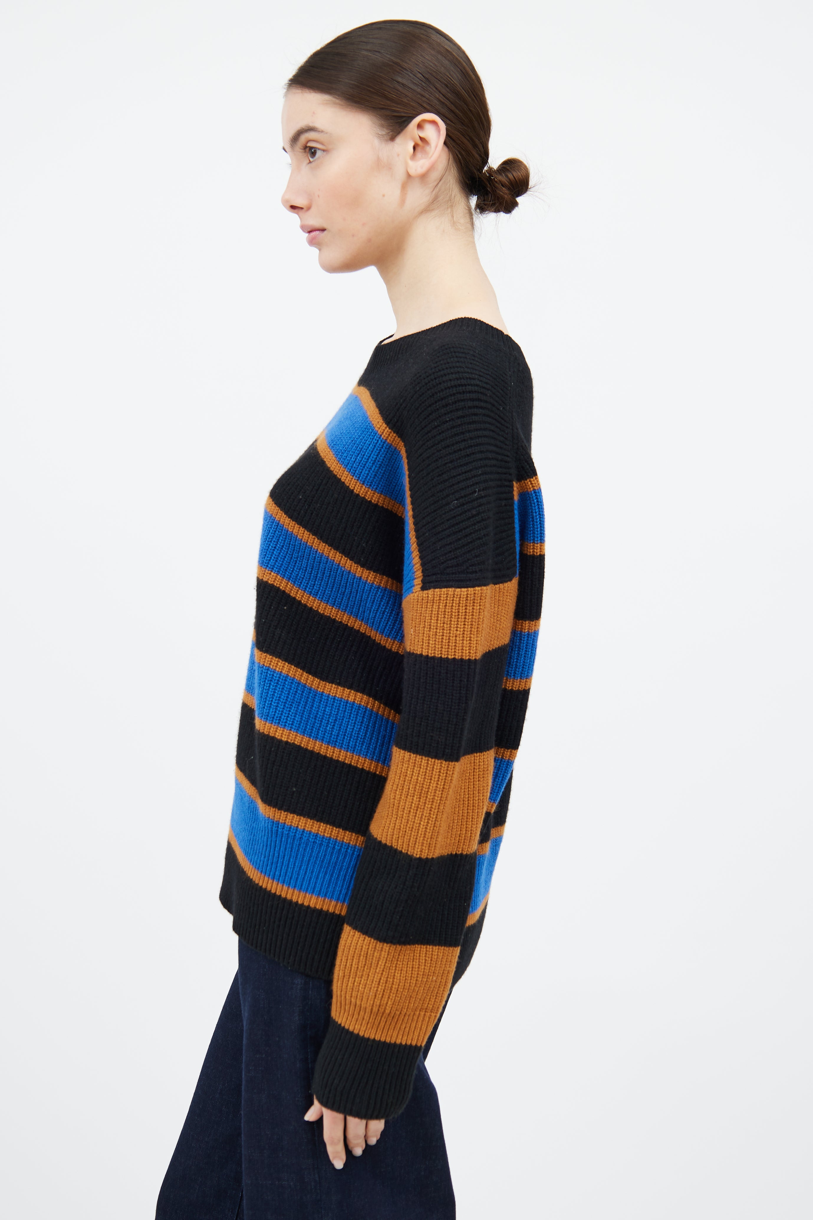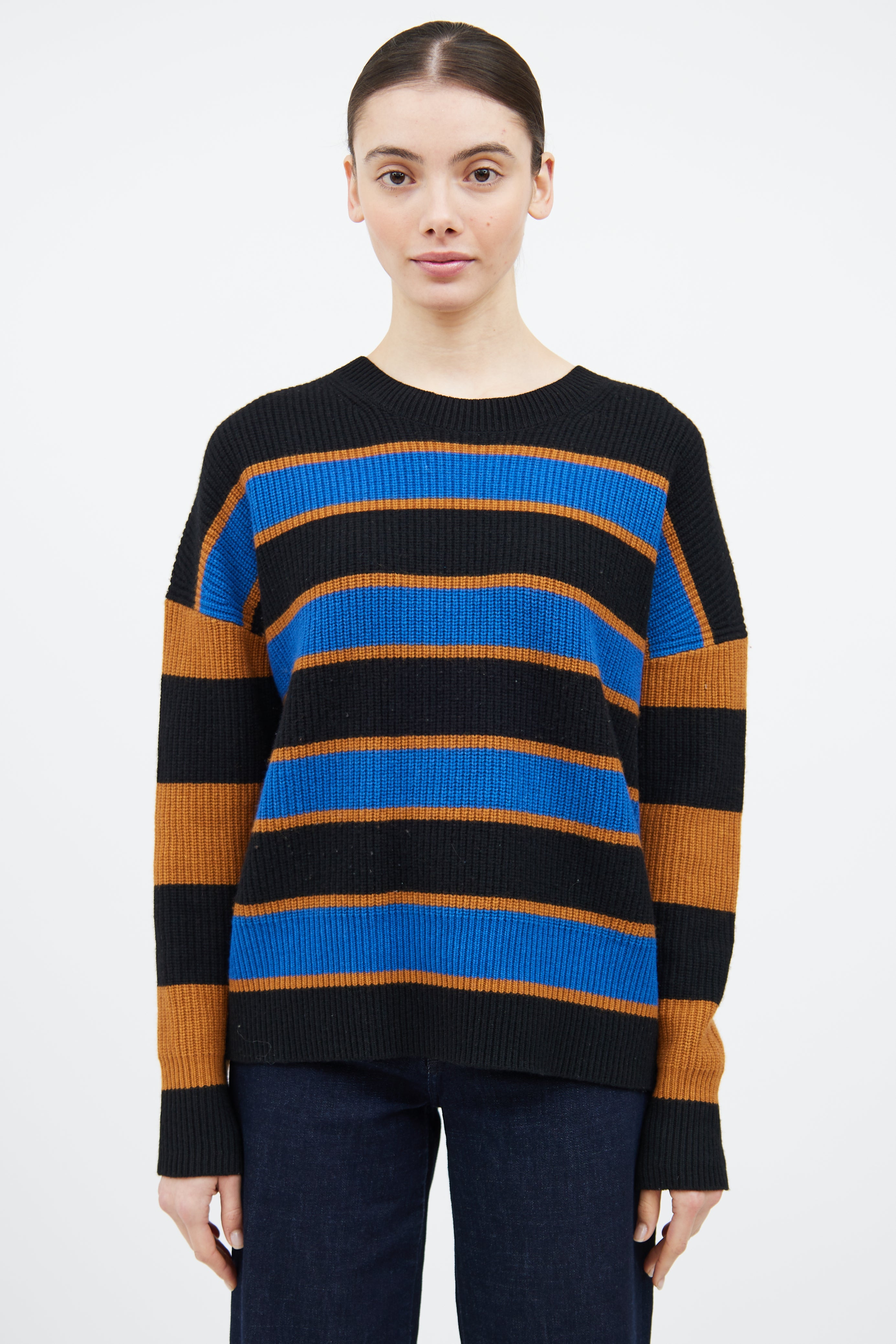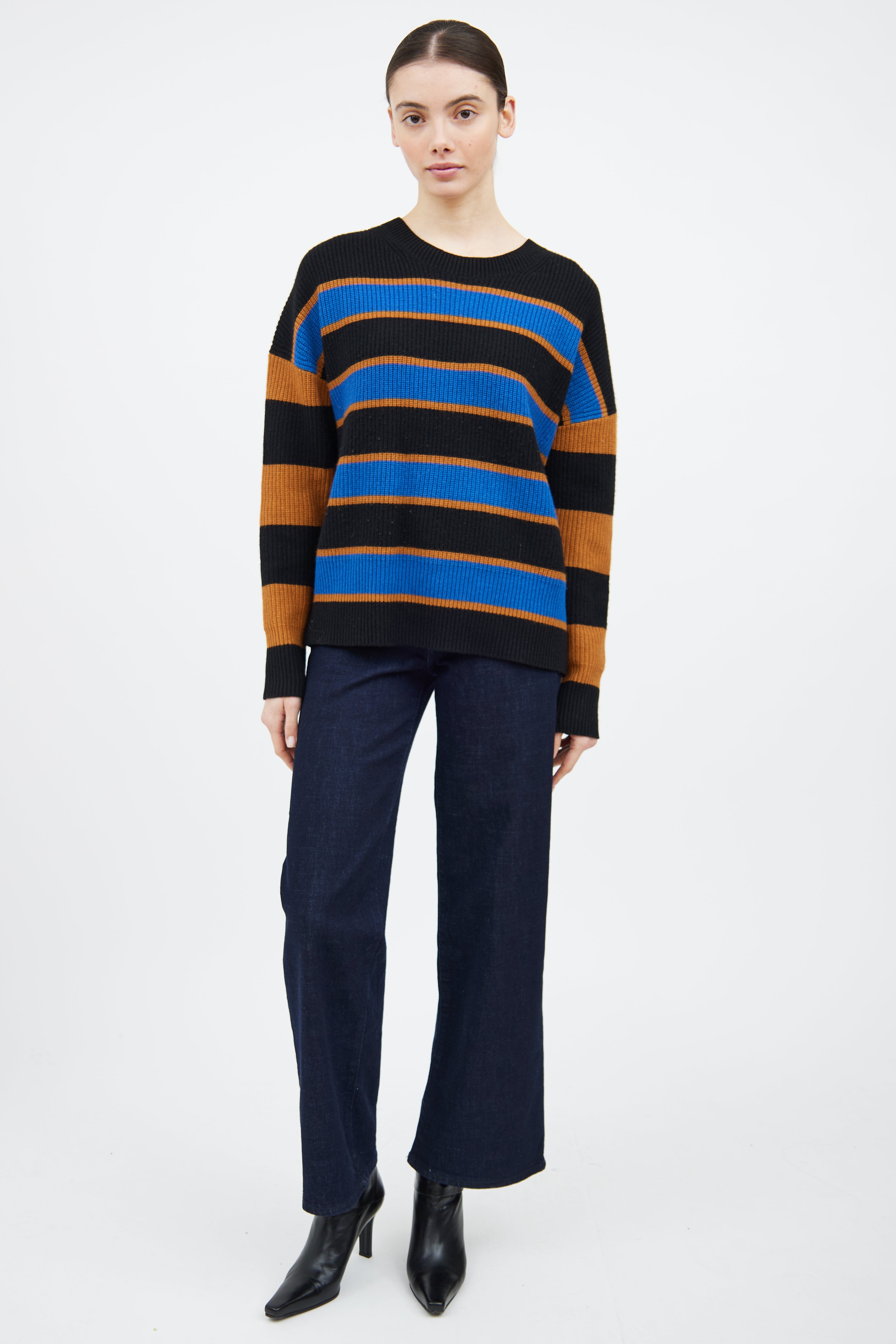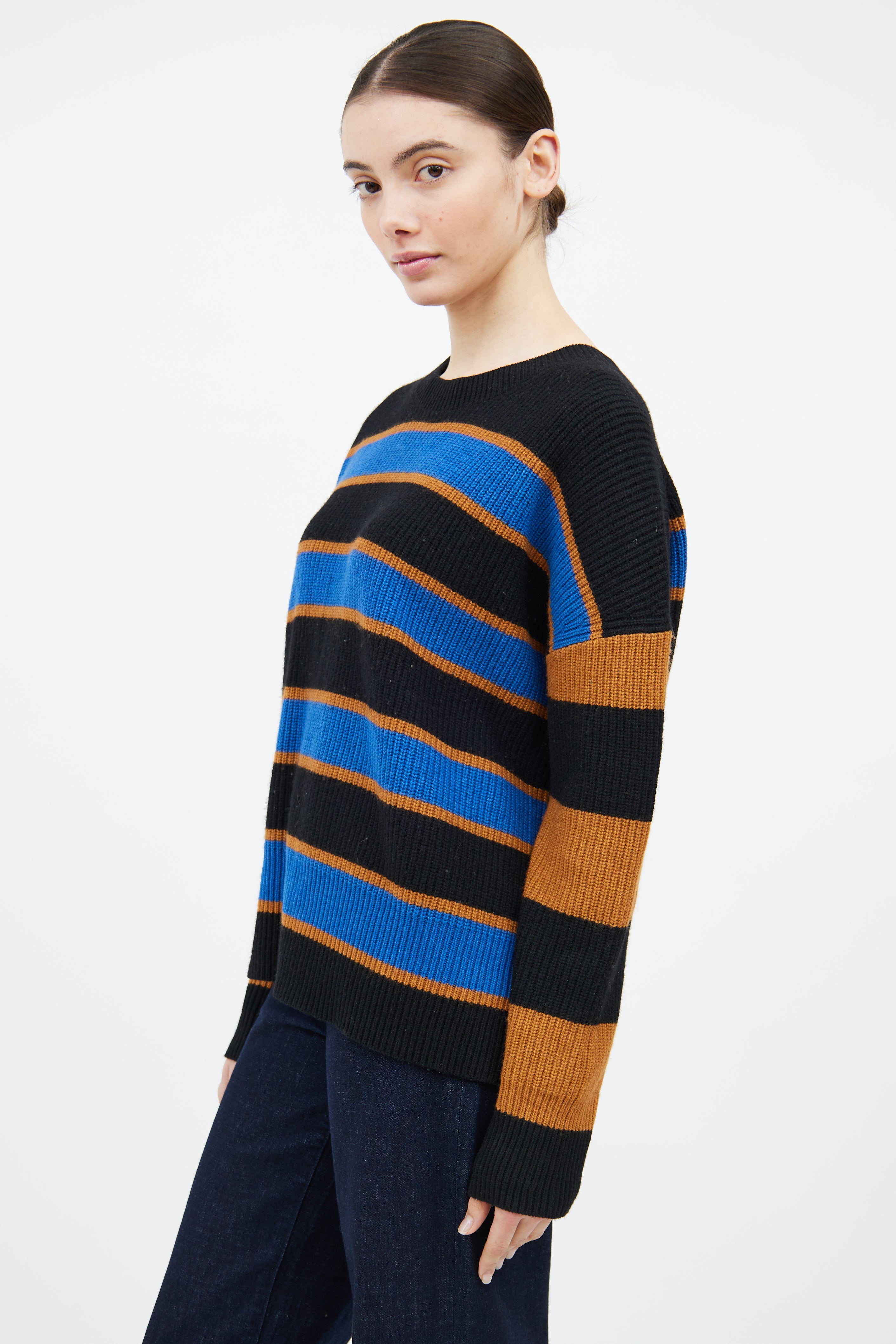 Pre-owned A.L.C. black wool blend knit sweater featuring a multicolour striped pattern throughout, round neckline, long sleeves, and ribbed detailing.