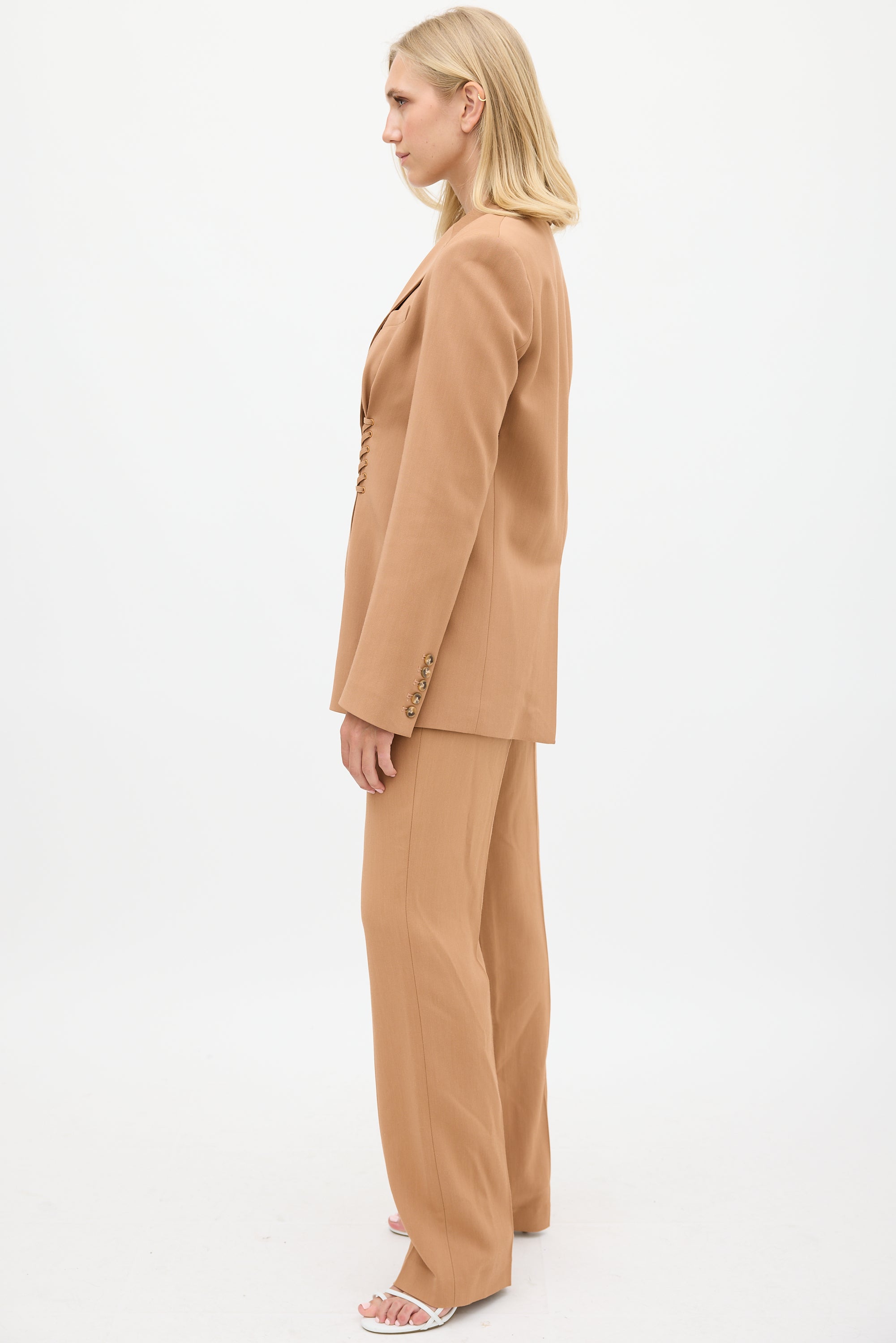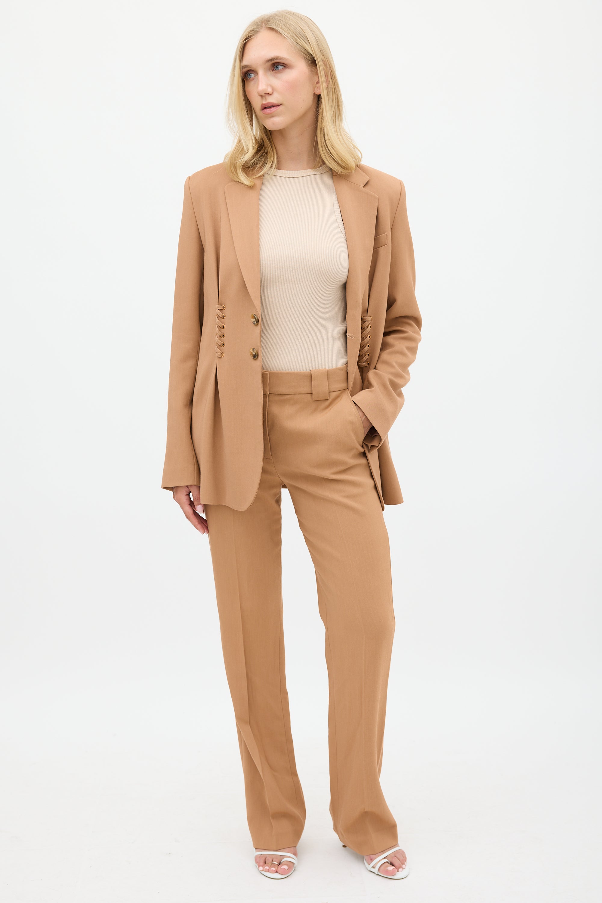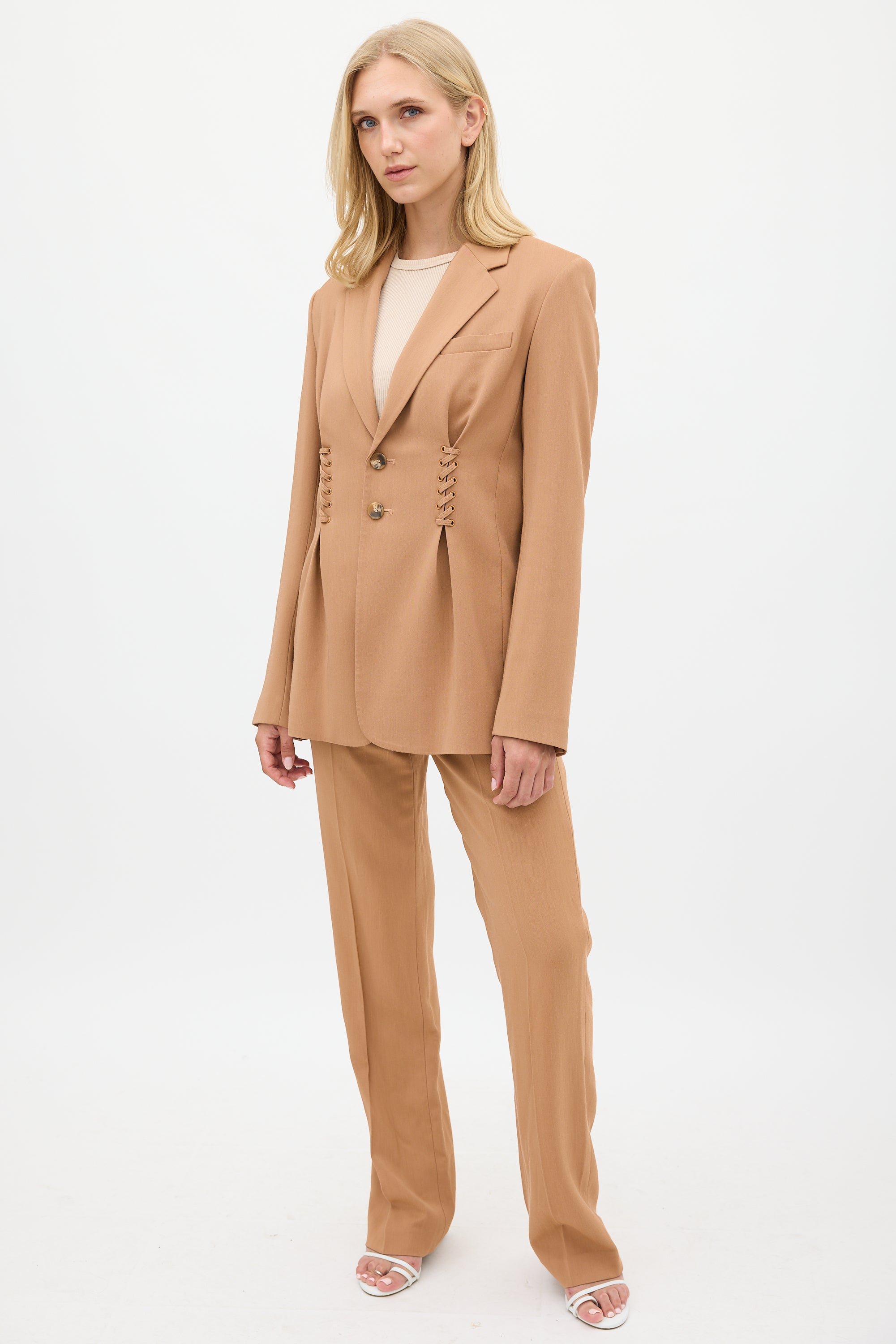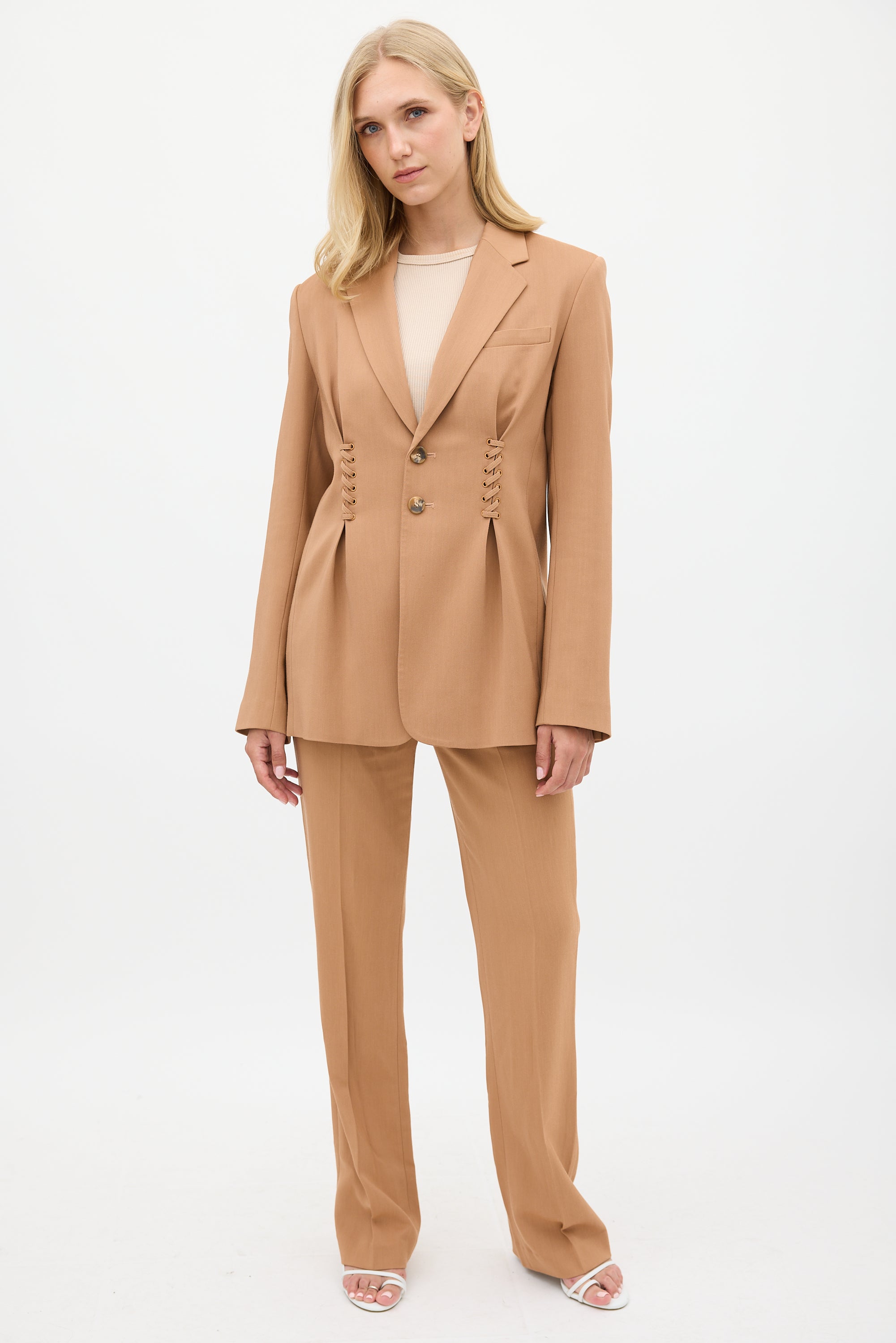 Pre-owned A.L.C. brown suit featuring blazer with a notched collar, single breasted two button front, lace up detail at front waist, slip pocket at left chest, back vent, padded shoulders. and long sleeves with buttoned cuffs. Matching trousers feature regular waist, dropped seat, straight leg with creases, two front slash pockets, two back welt pockets, and zip fly. Blazer is lined.