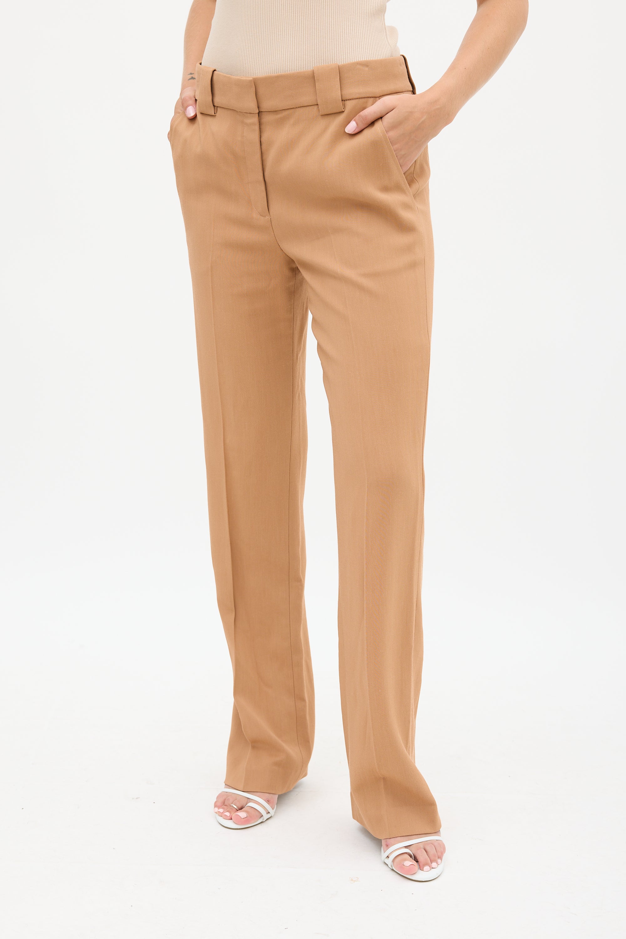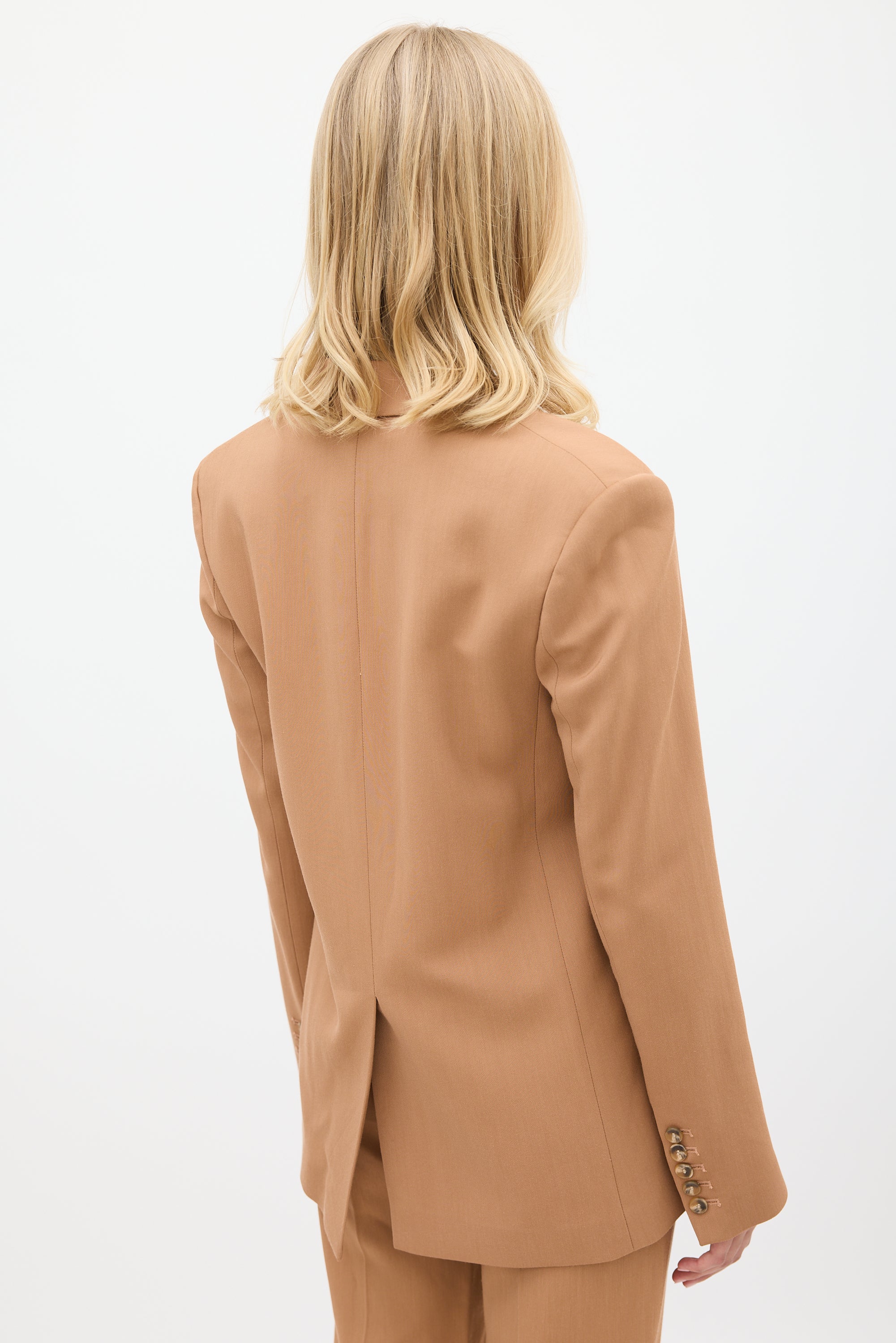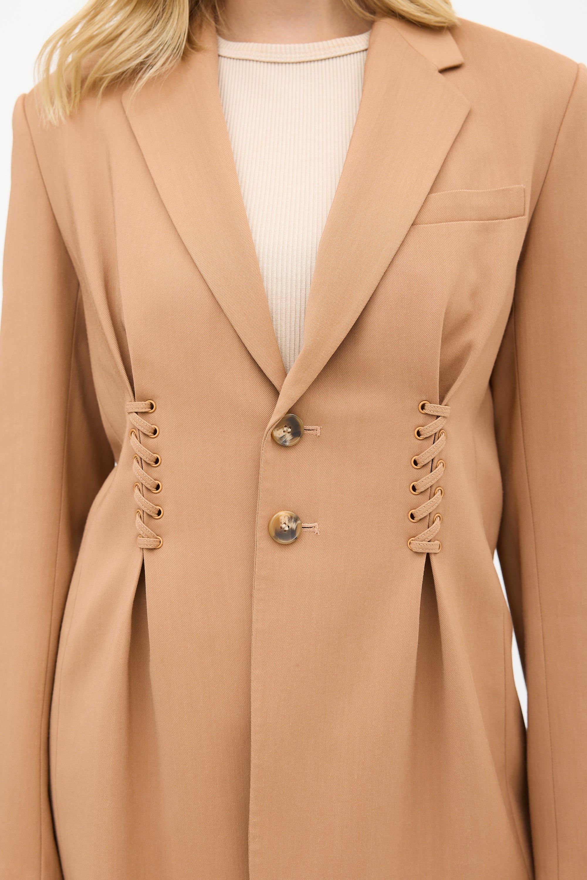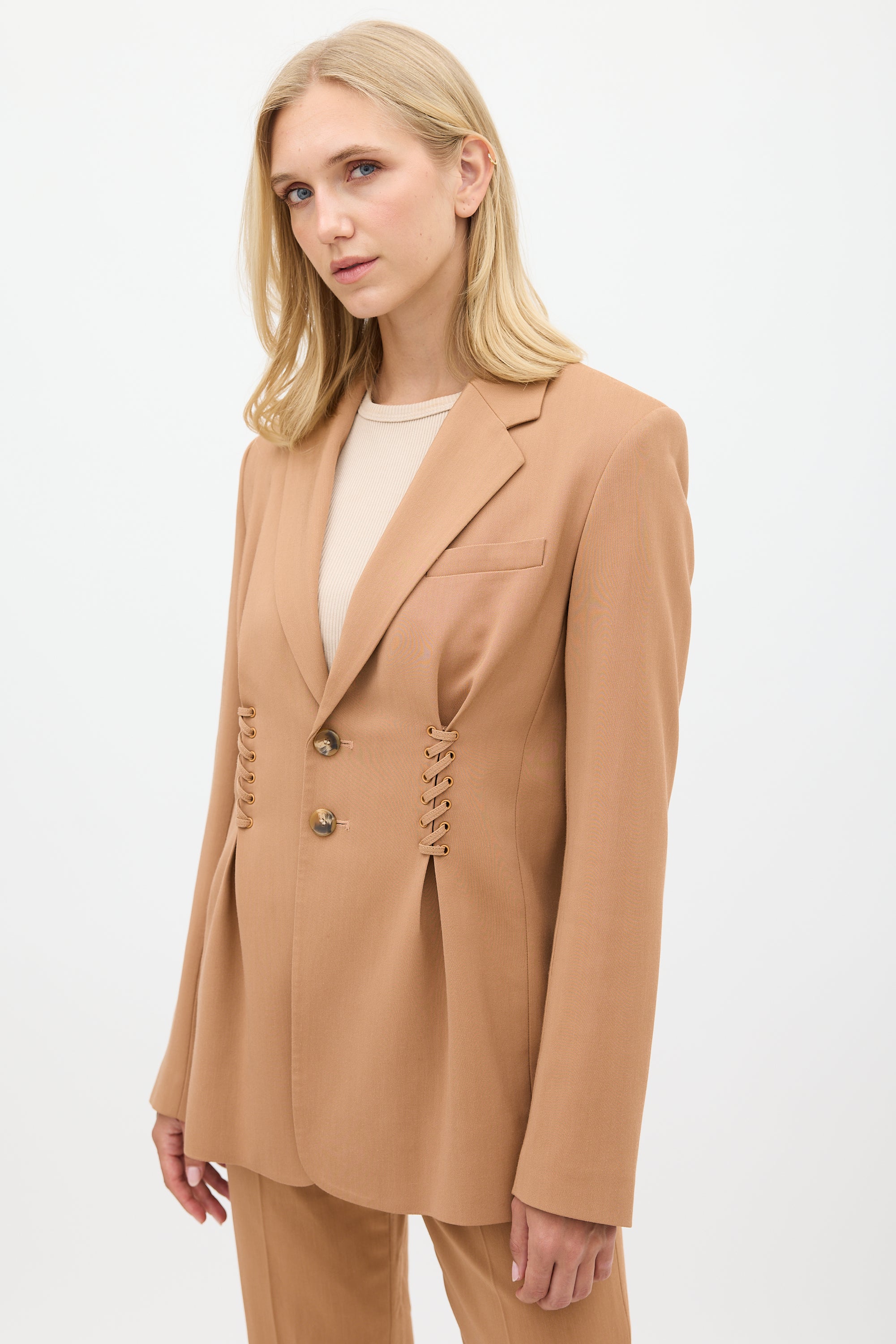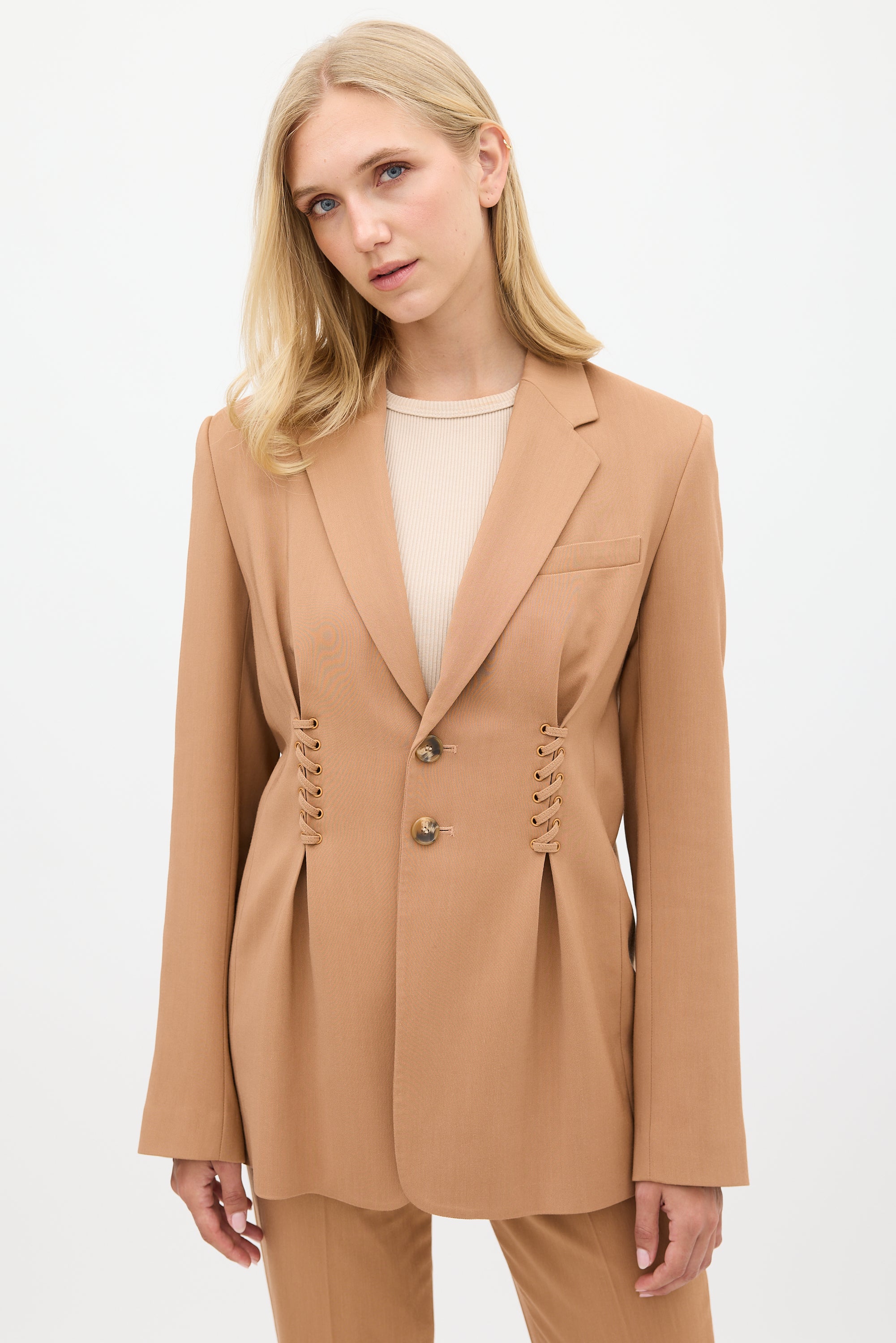 Pre-owned A.L.C. brown suit featuring blazer with a notched collar, single breasted two button front, lace up detail at front waist, slip pocket at left chest, back vent, padded shoulders. and long sleeves with buttoned cuffs. Matching trousers feature regular waist, dropped seat, straight leg with creases, two front slash pockets, two back welt pockets, and zip fly. Blazer is lined.