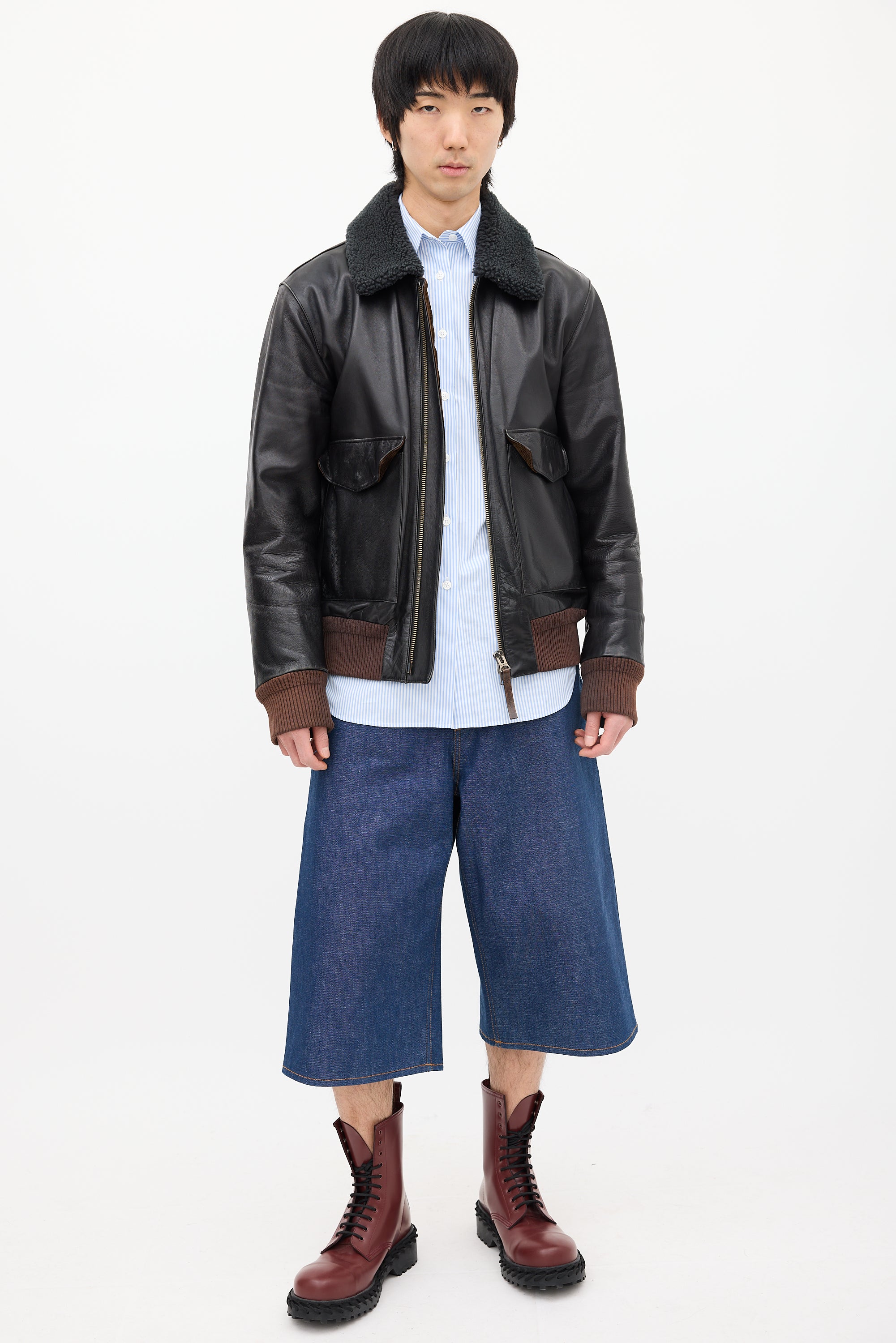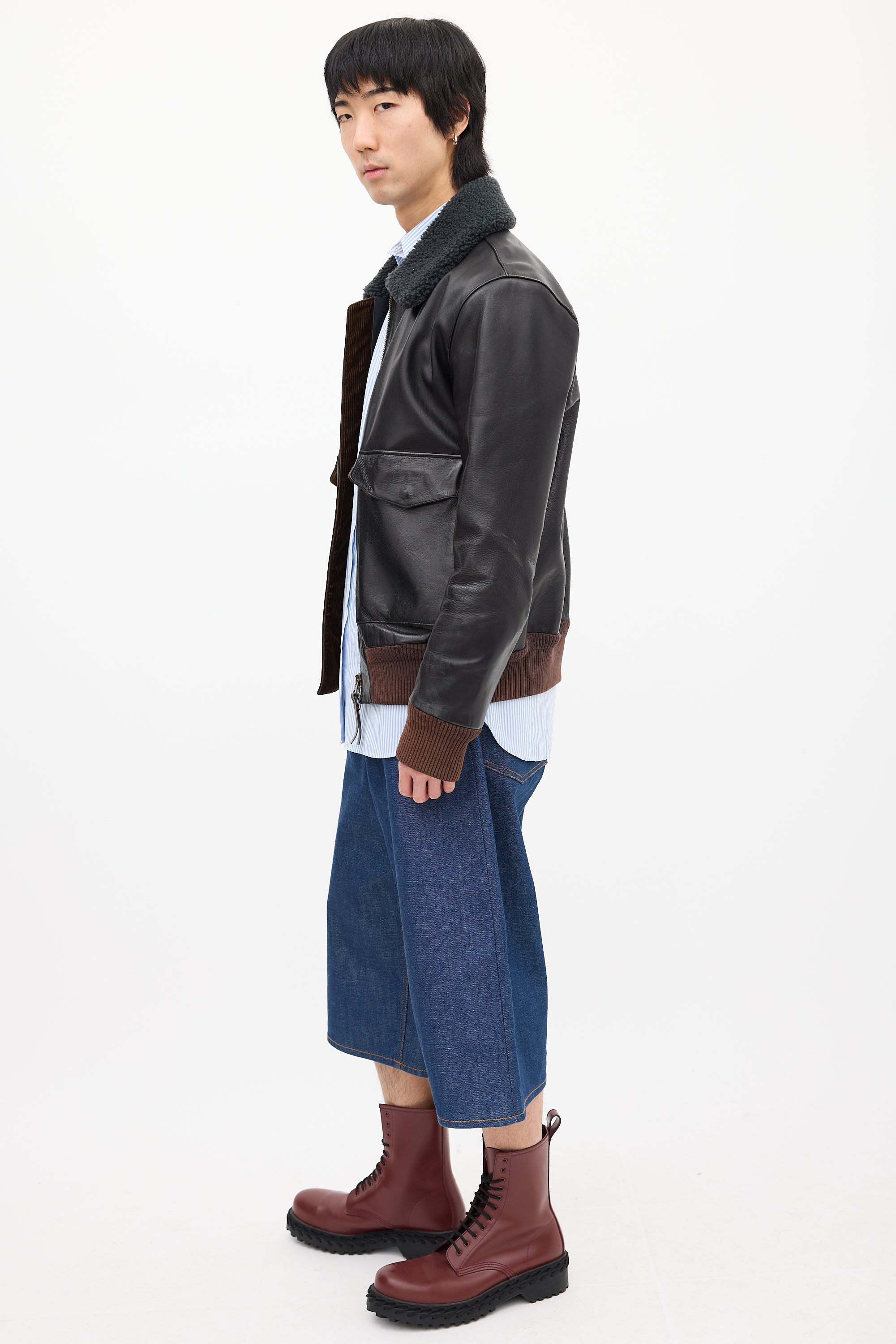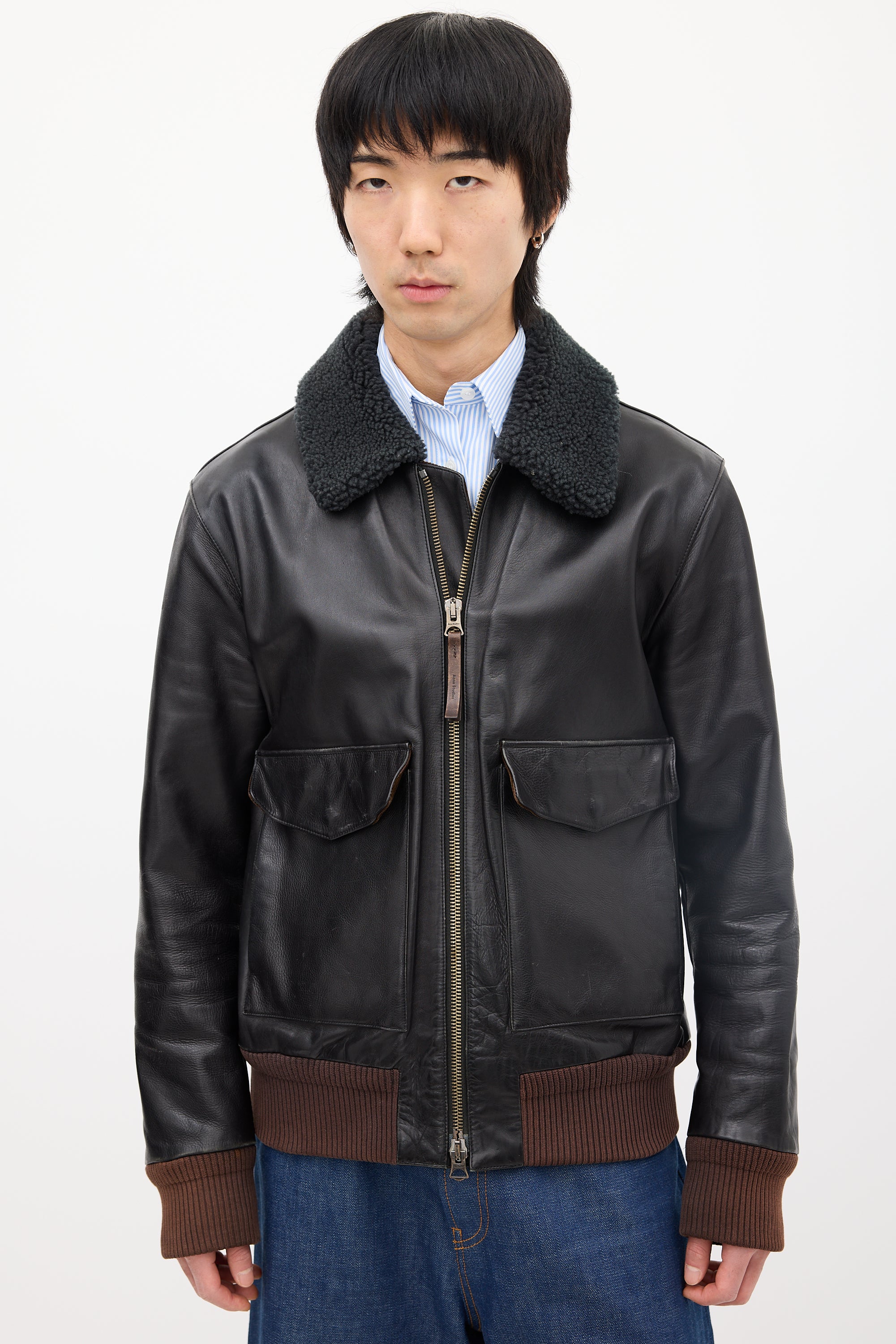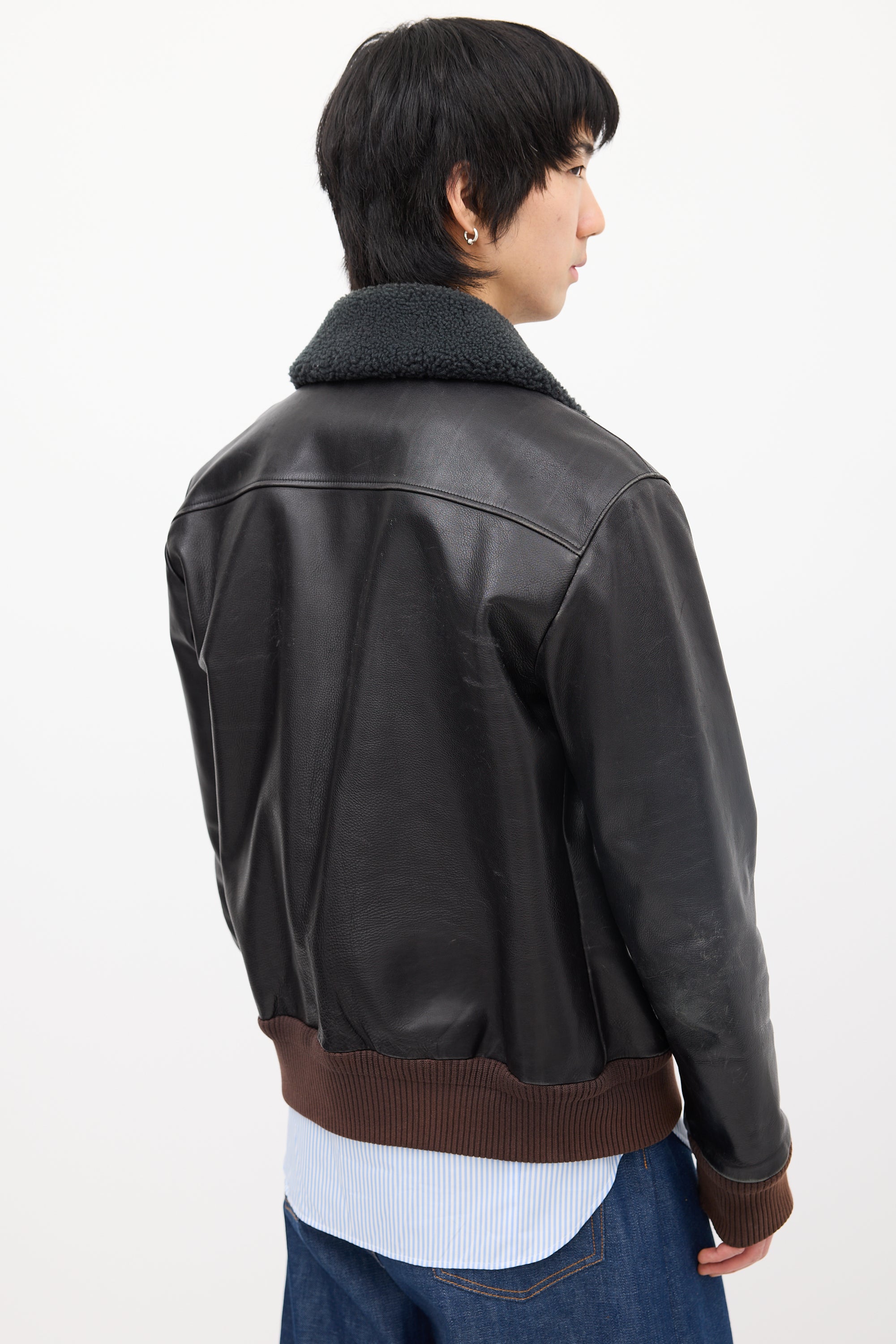 Pre-owned Acne Studios black leather jacket featuring a sherpa collar, front double zip closure, two front pockets, two interior pockets, and ribbed hem and cuffs. Lined.
