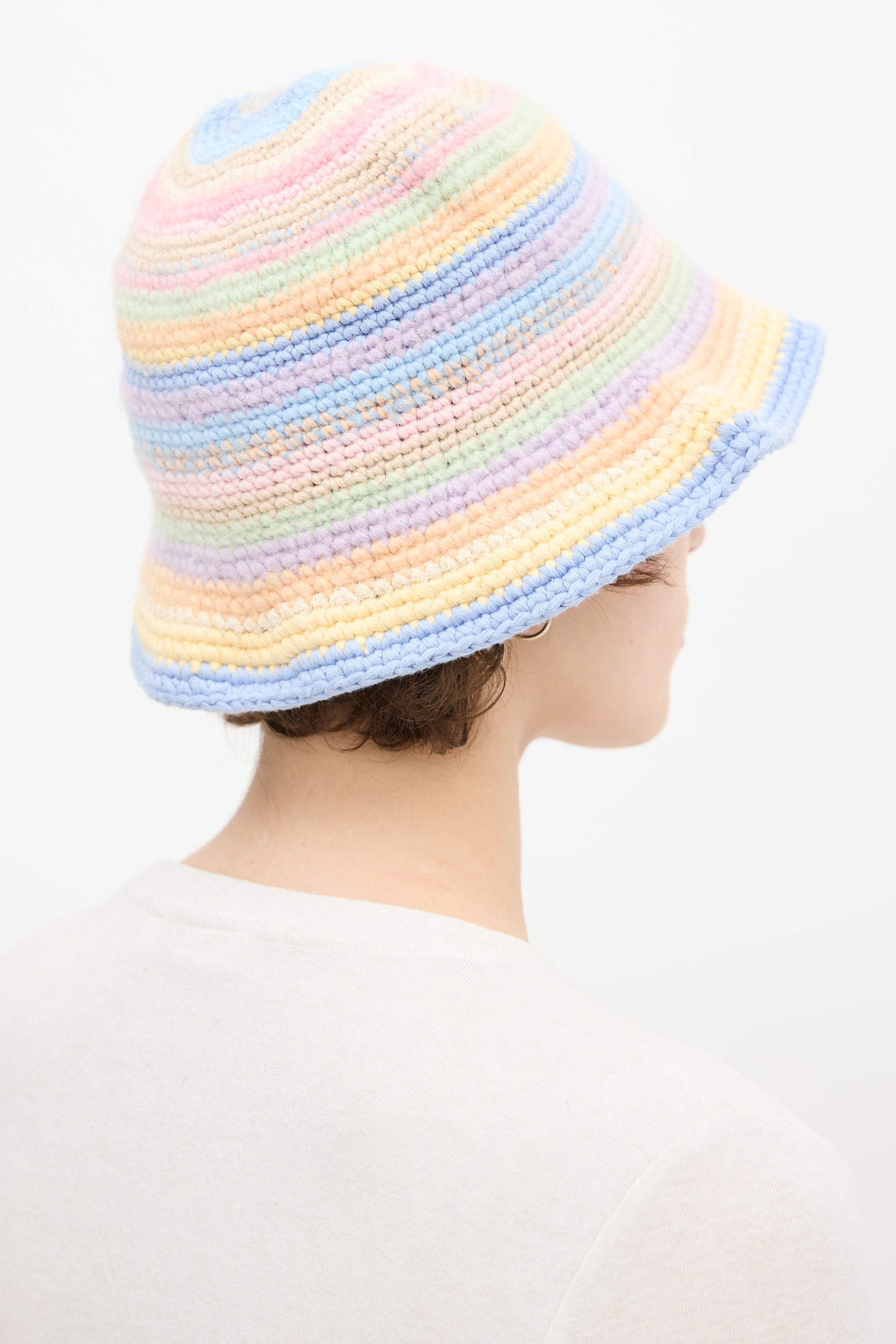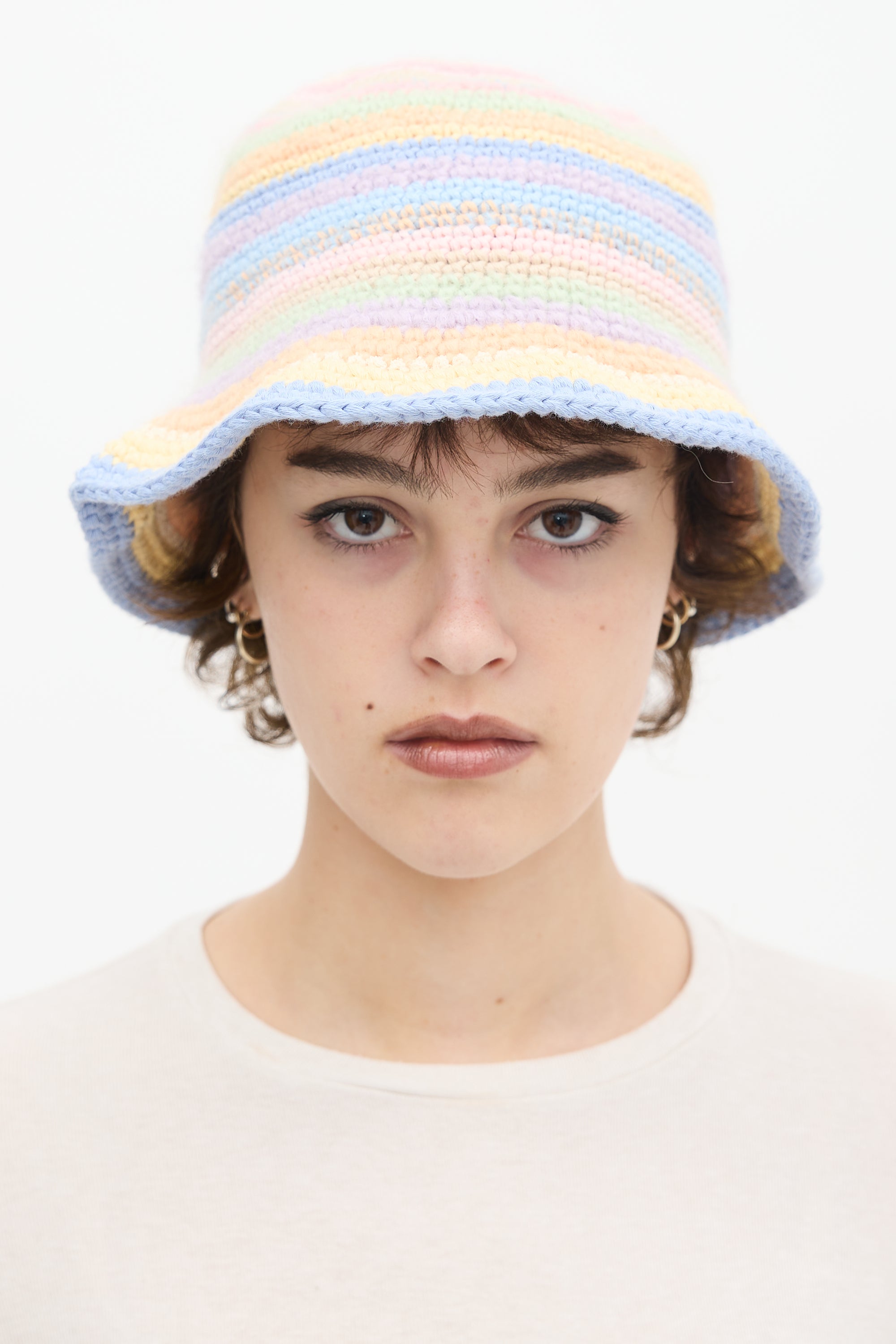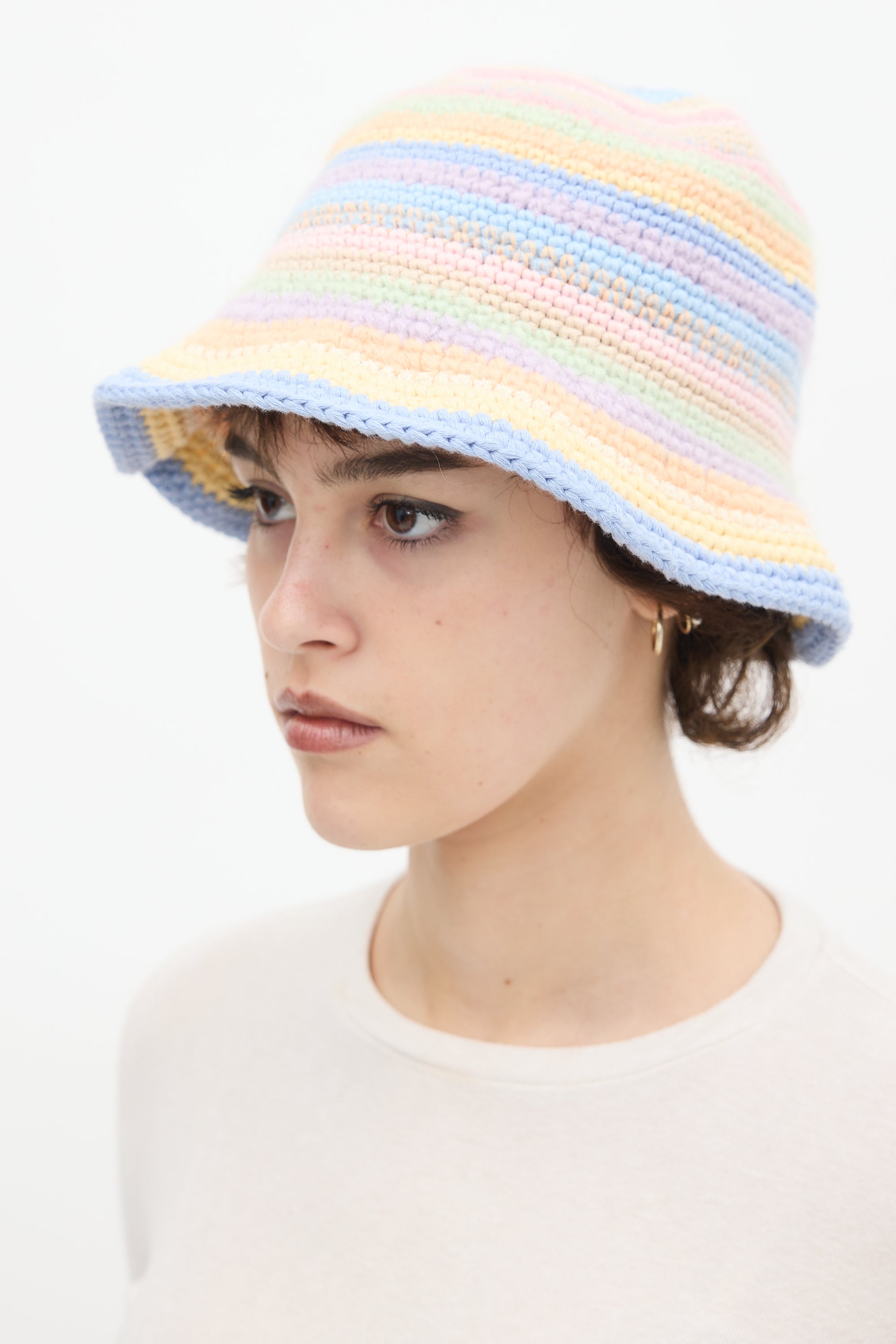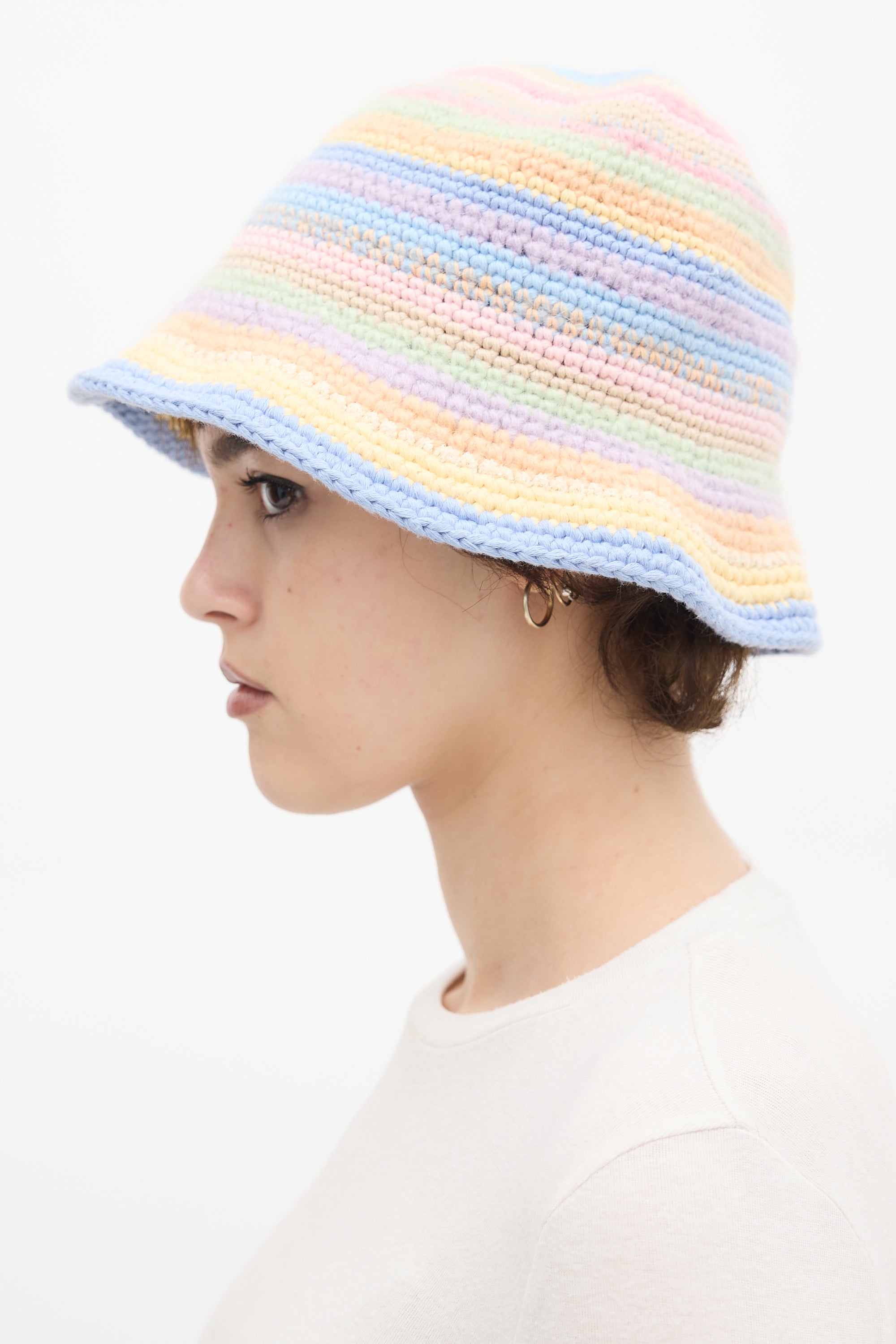 Pre-owned Acne Studios multicolour cotton and wool blend bucket hat featuring striped crochet rows, flared brim, and logo tab at interior.