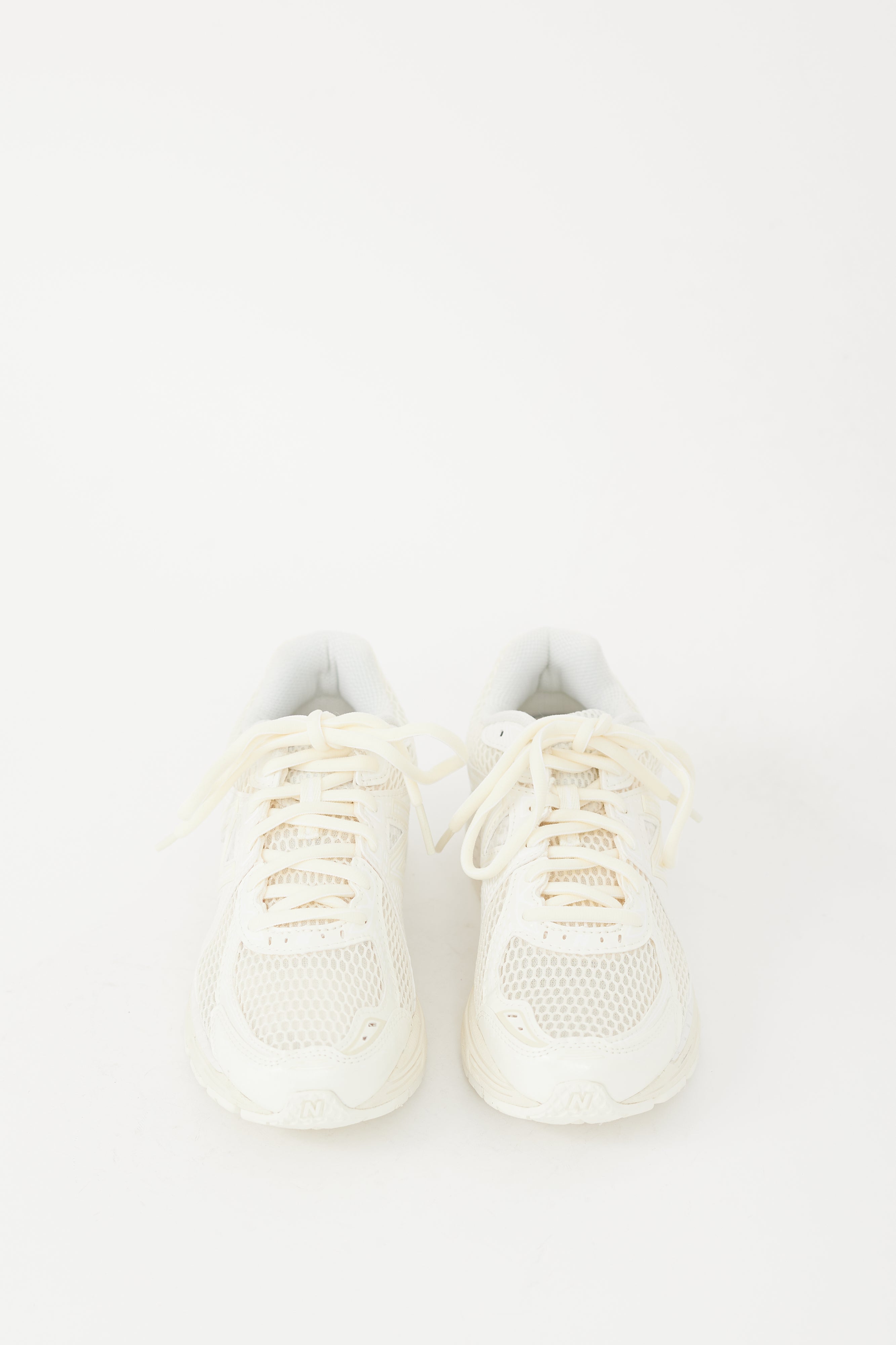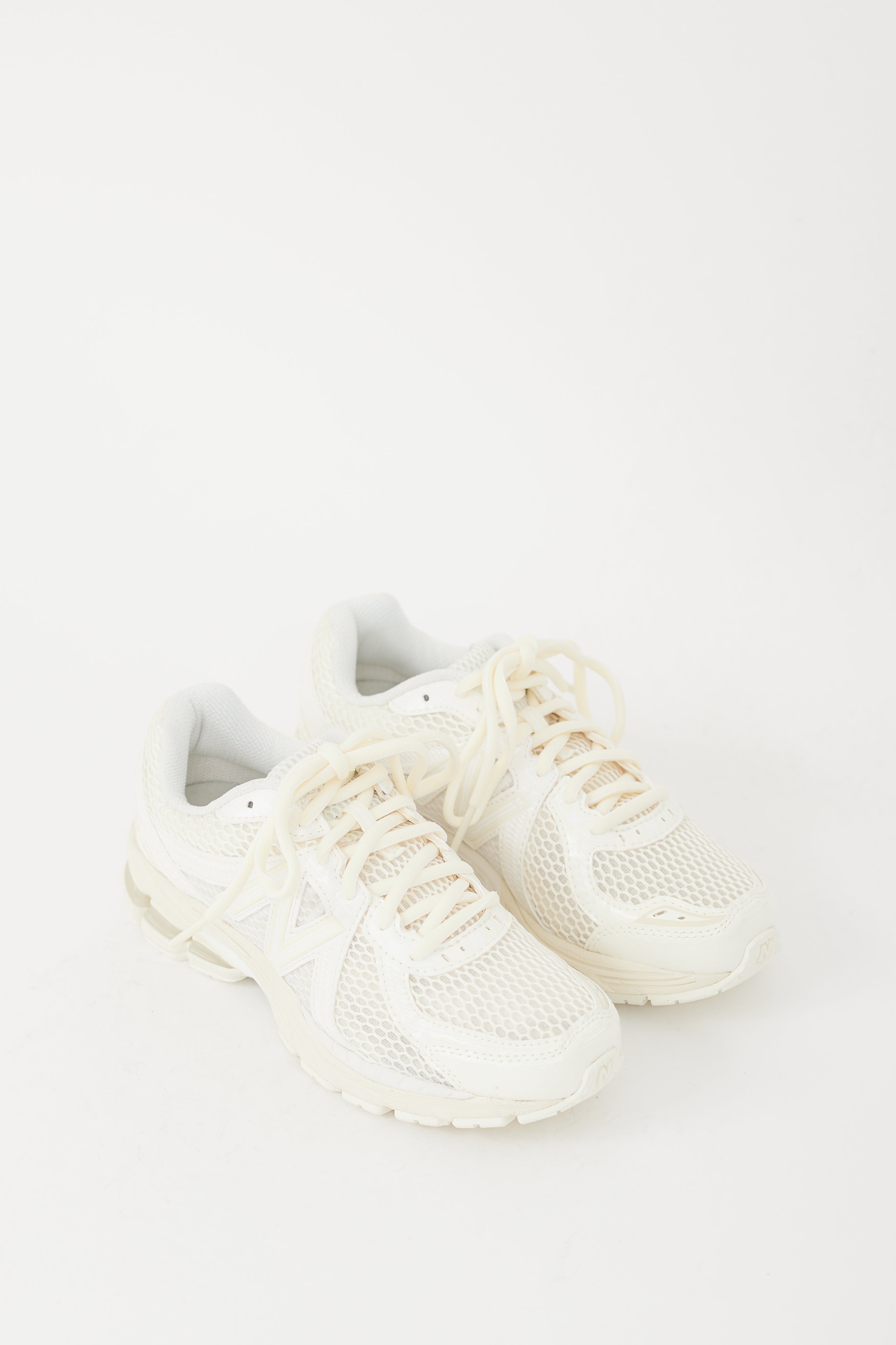 Pre-owned Aimé Leon Dore X New Balance cream 860v2 sneakers featuring a round toe, mesh upper, patent leather panelling throughout, lace up front, rubberized logo at tongue, and treaded rubber sole. Comes with original box and extra set of laces.
