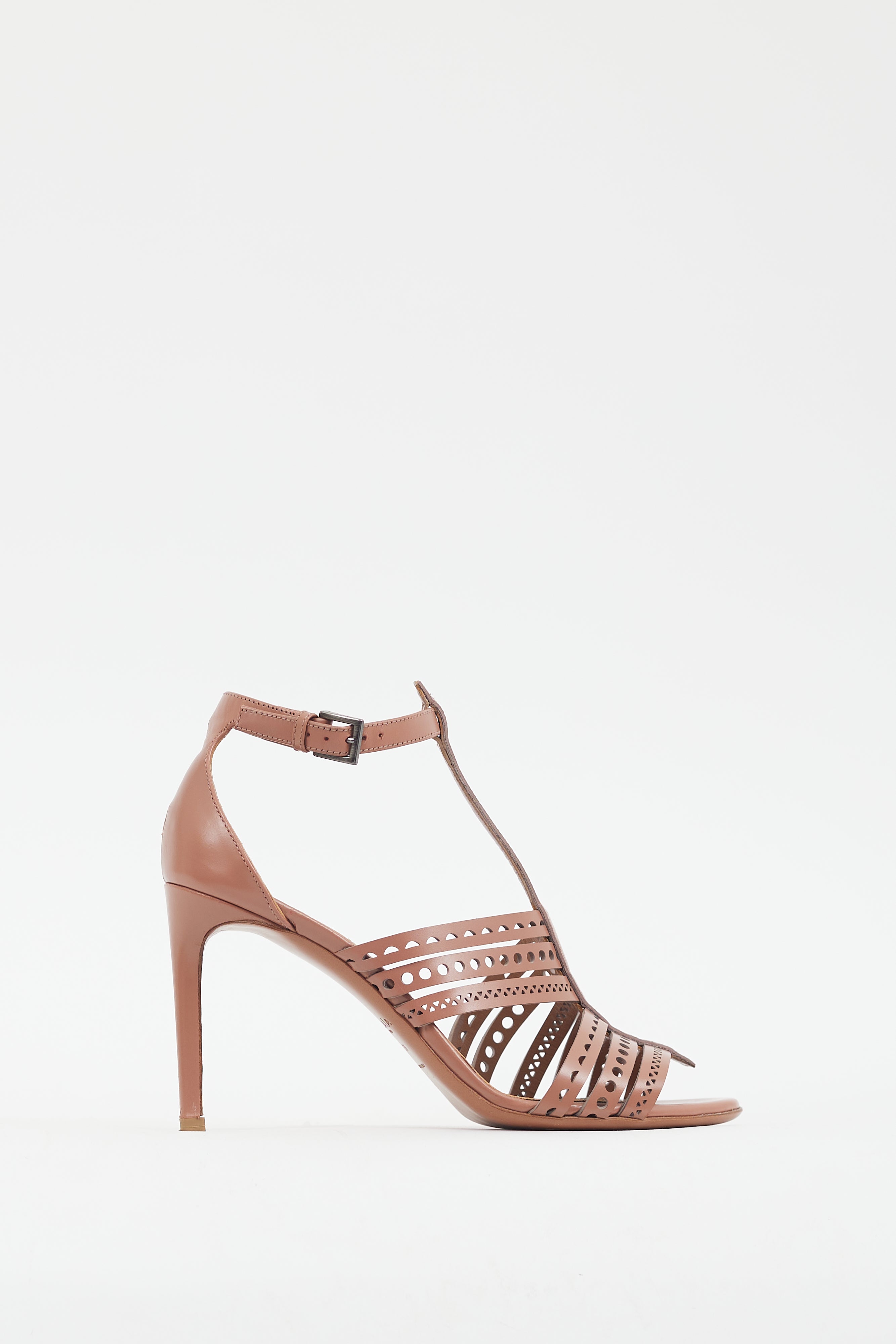 Pre-owned Alaïa pink leather laser cut heels featuring multi-strap detail at vamp, round toe, adjustable buckle with strap at ankle, covered stiletto heel and leather insoles. Comes with original box.