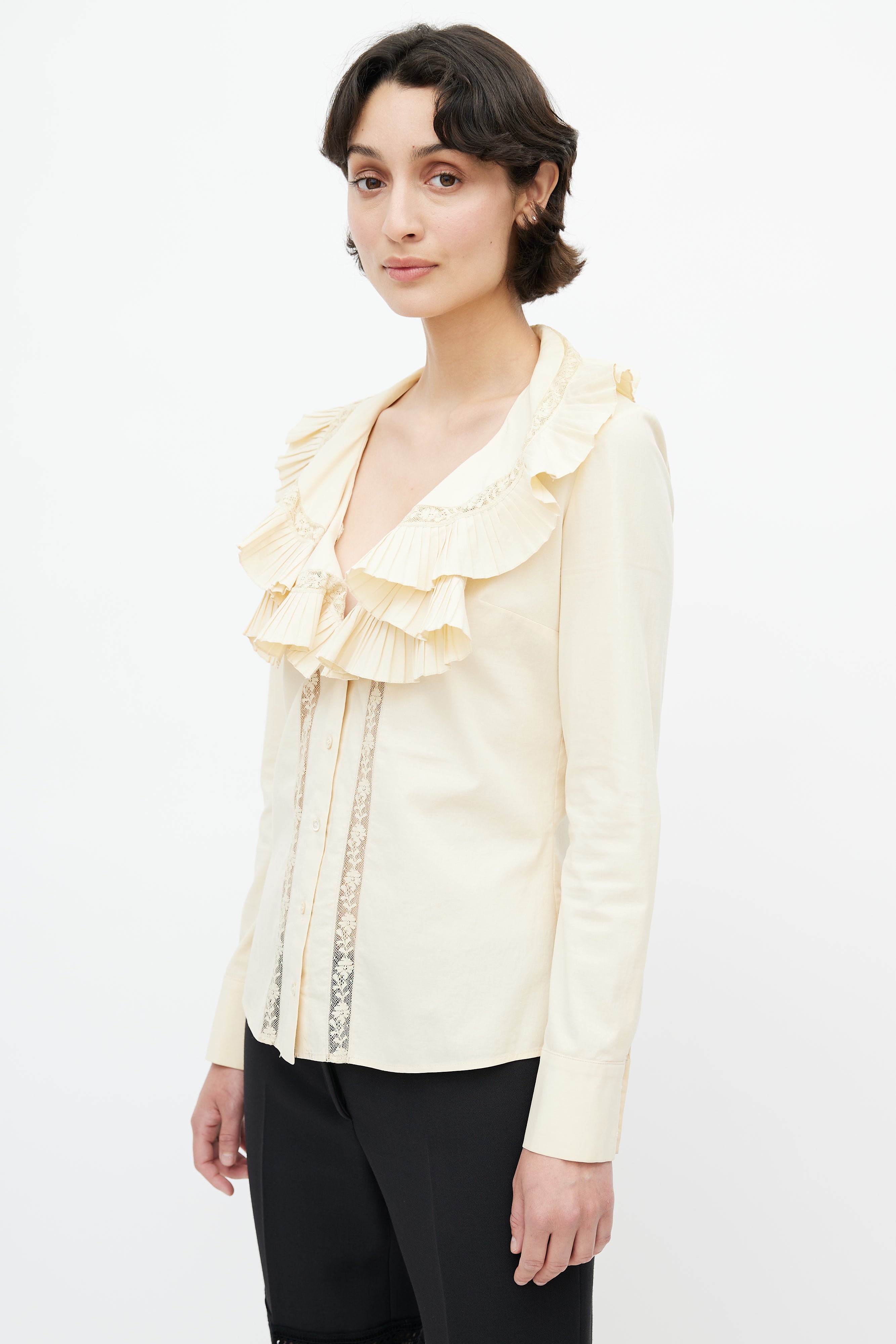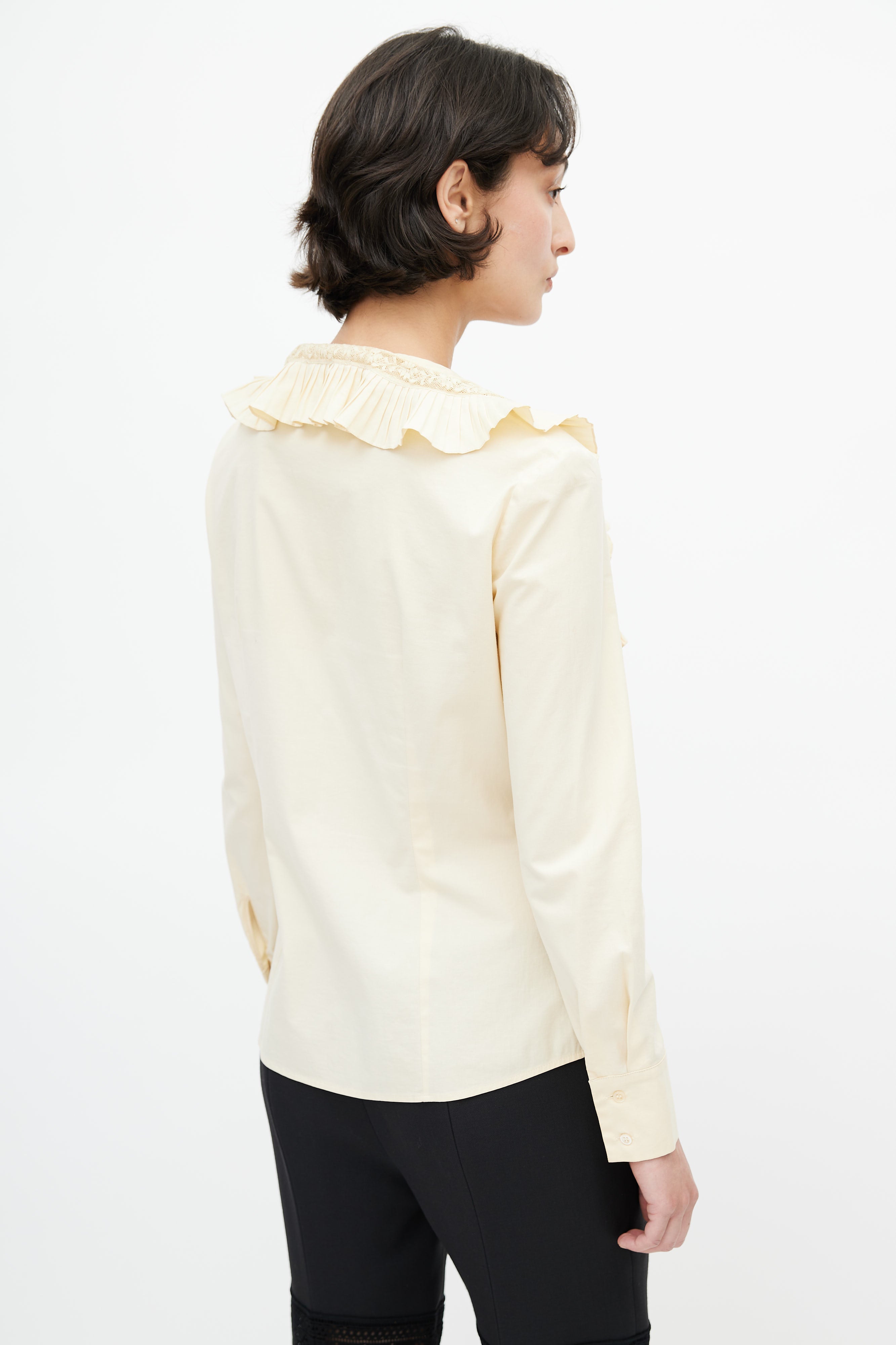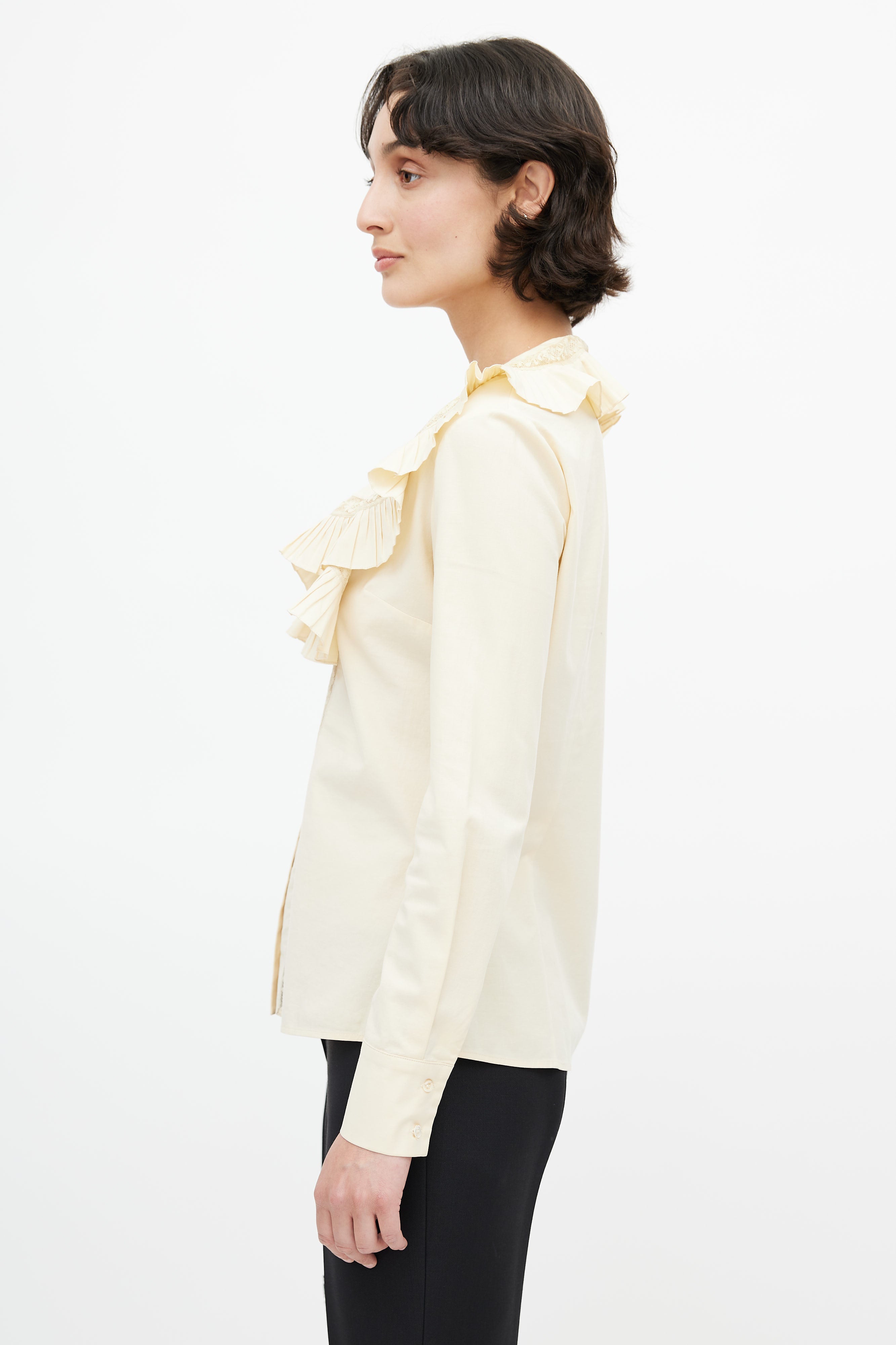 Pre-owned 2006 Alexander McQueen yellow blouse featuring pleated ruffle collar, lace trim at front, button up front, and buttoned cuffs.