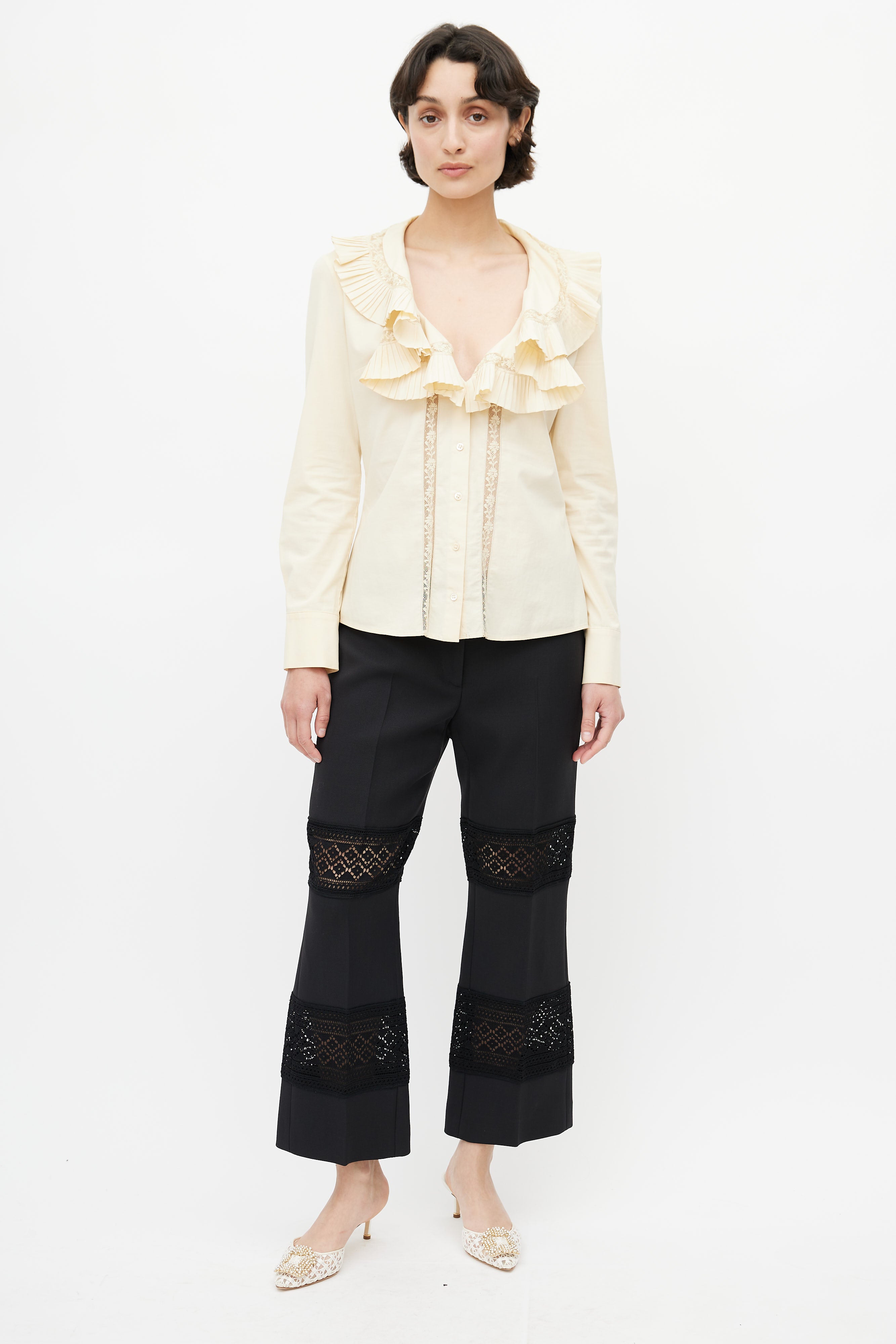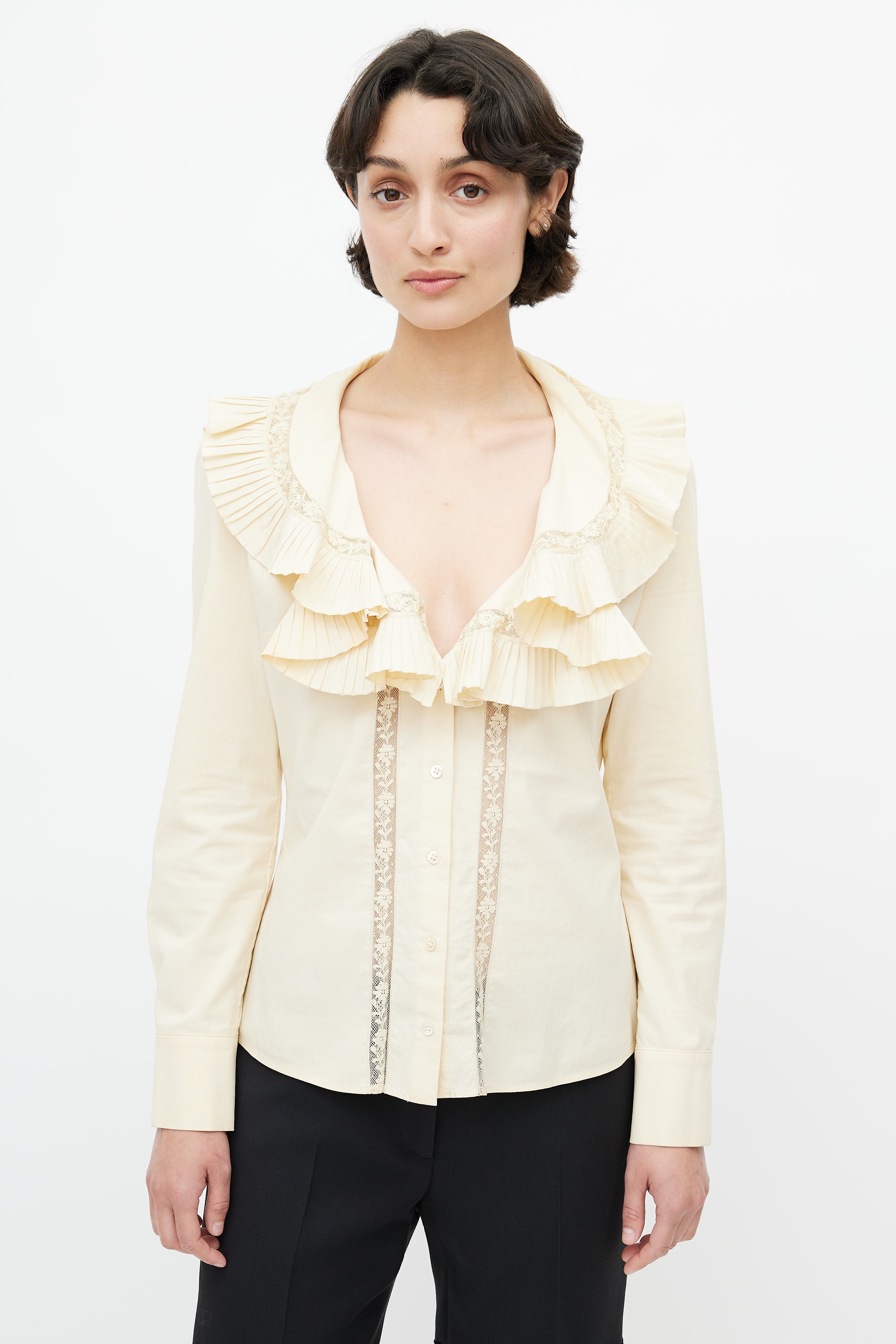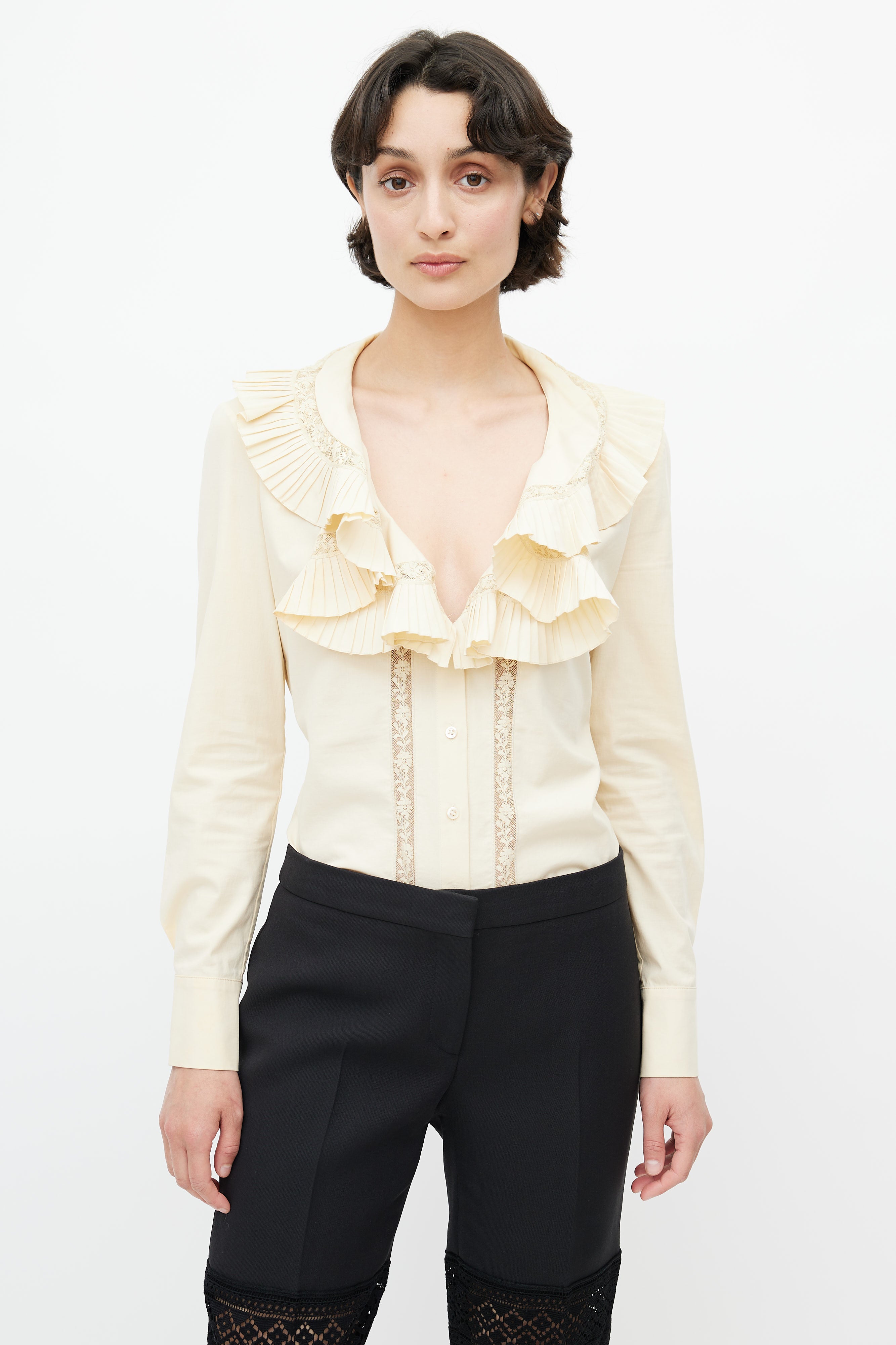 Pre-owned 2006 Alexander McQueen yellow blouse featuring pleated ruffle collar, lace trim at front, button up front, and buttoned cuffs.
