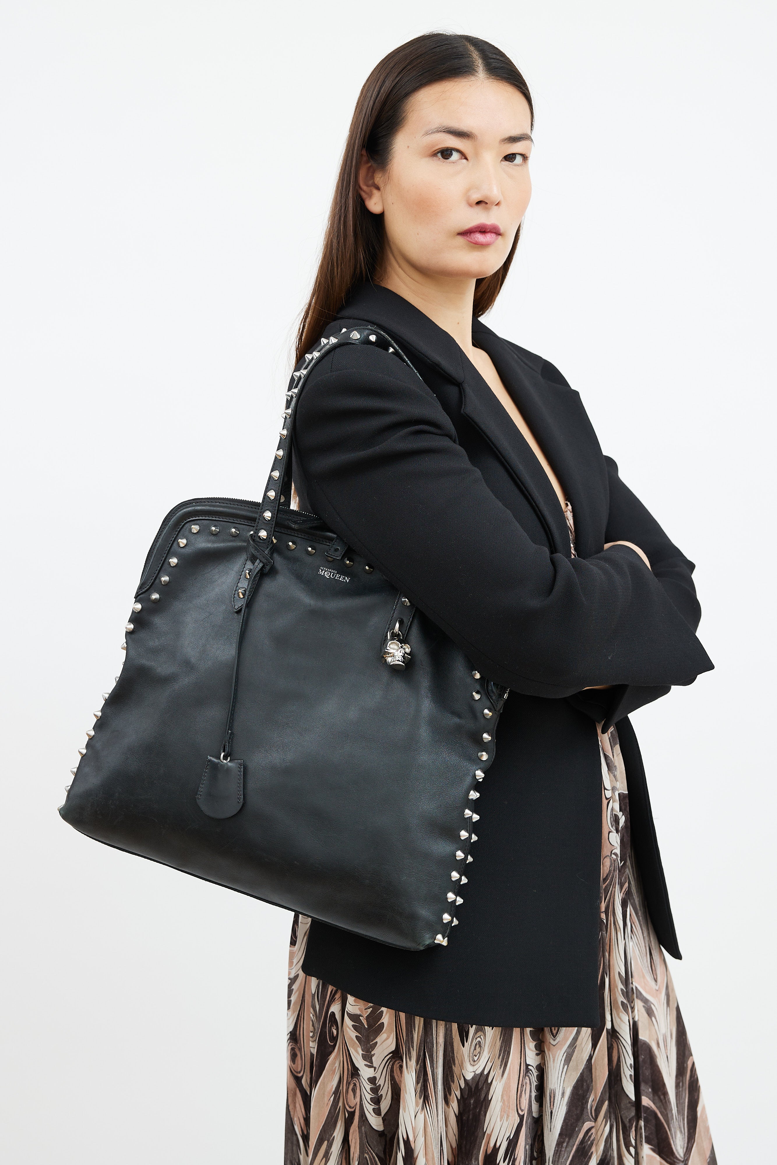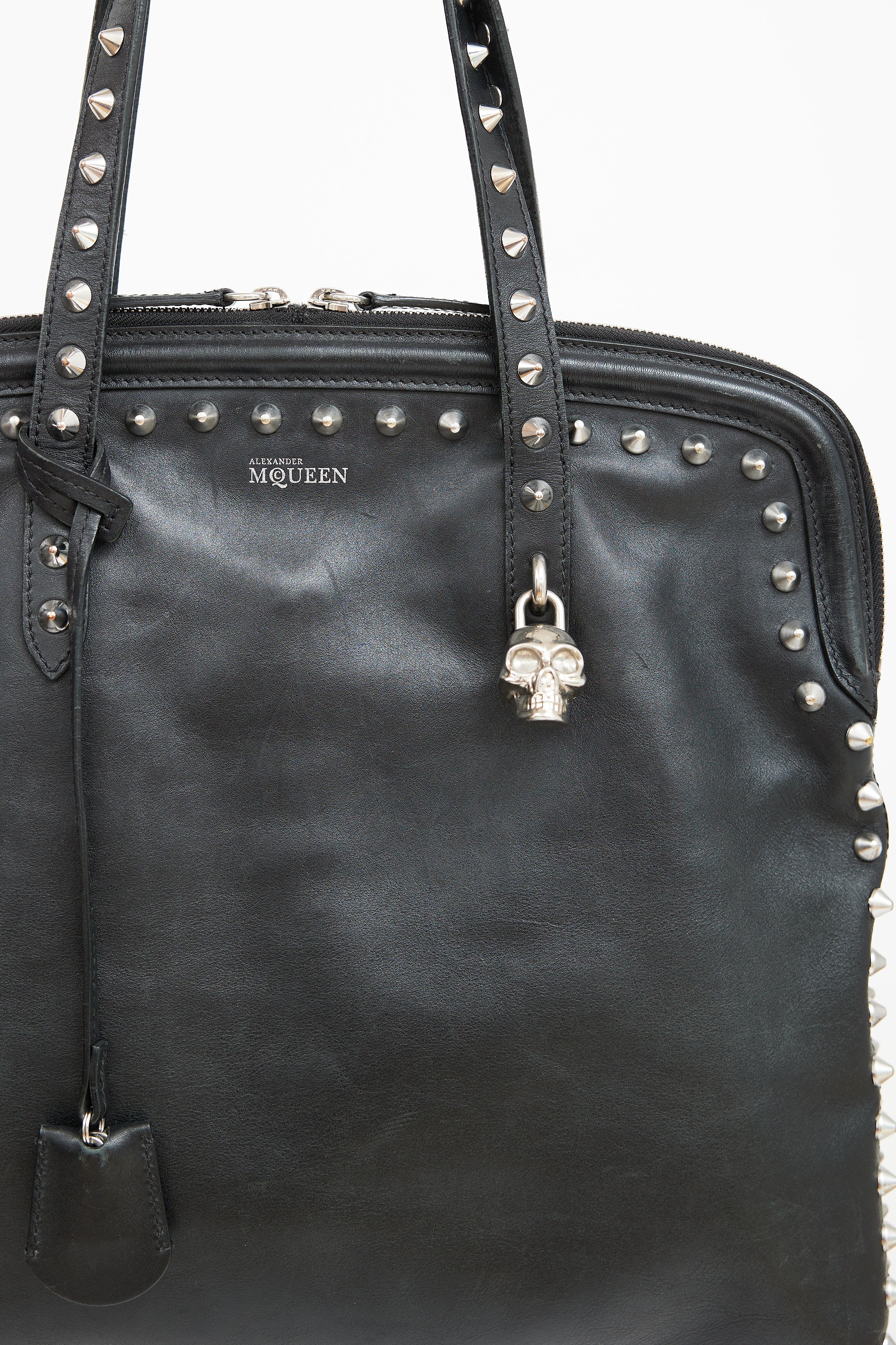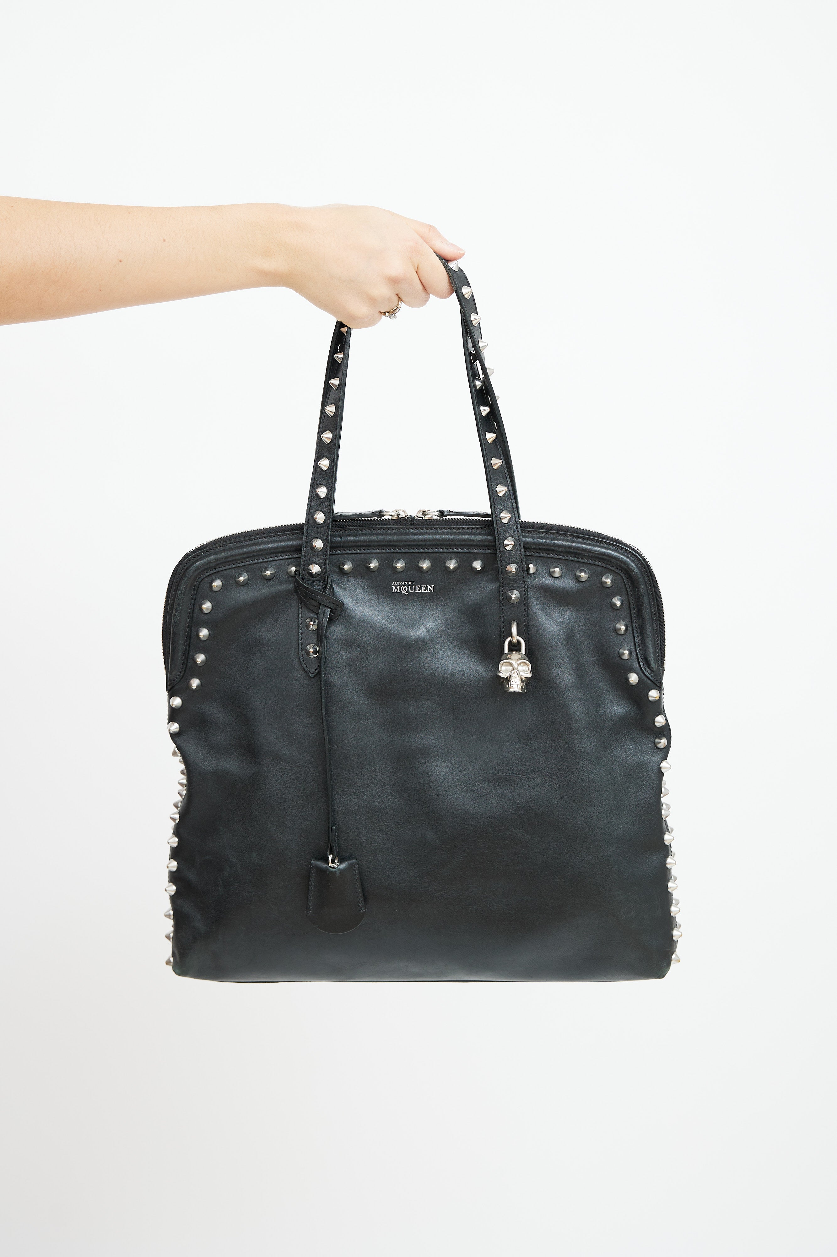 Pre-owned Alexander McQueen black leather tote bag featuring silver tone top dual zip closure, dual leather flat top handle, keyring cloche, silver tone stud trim throughout body and handles, signature skull lock charm adornment, silver tone logo at centre front, and one main lined compartment with two slip pockets and one zip pocket.