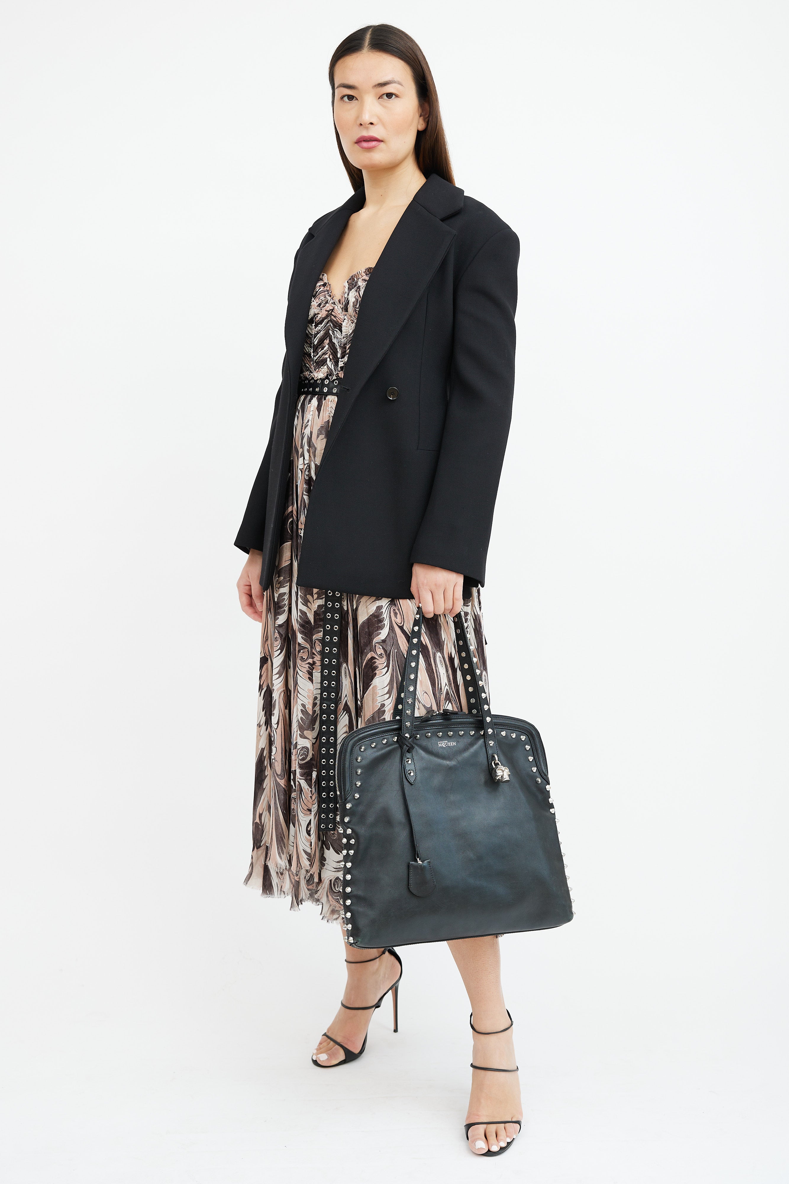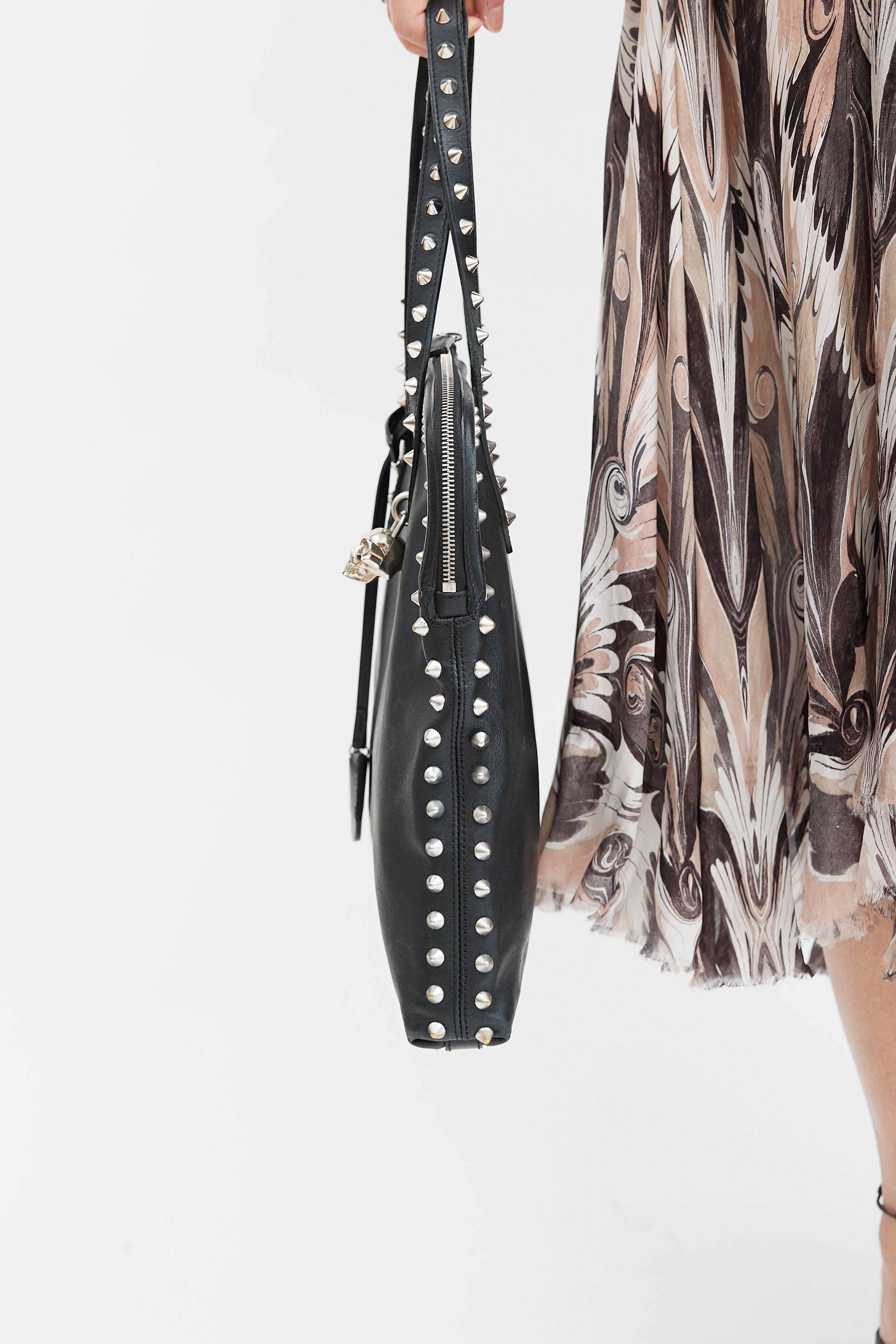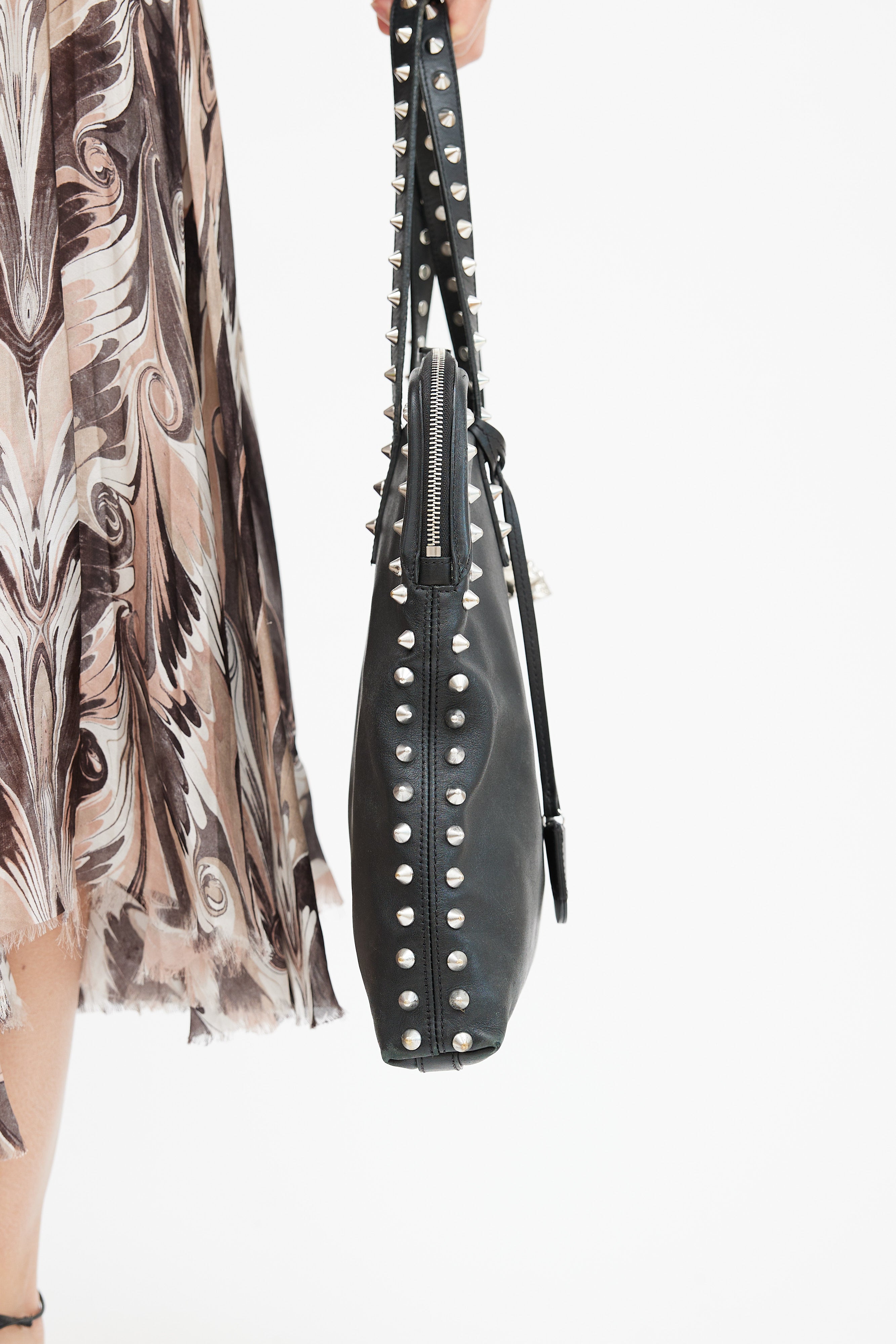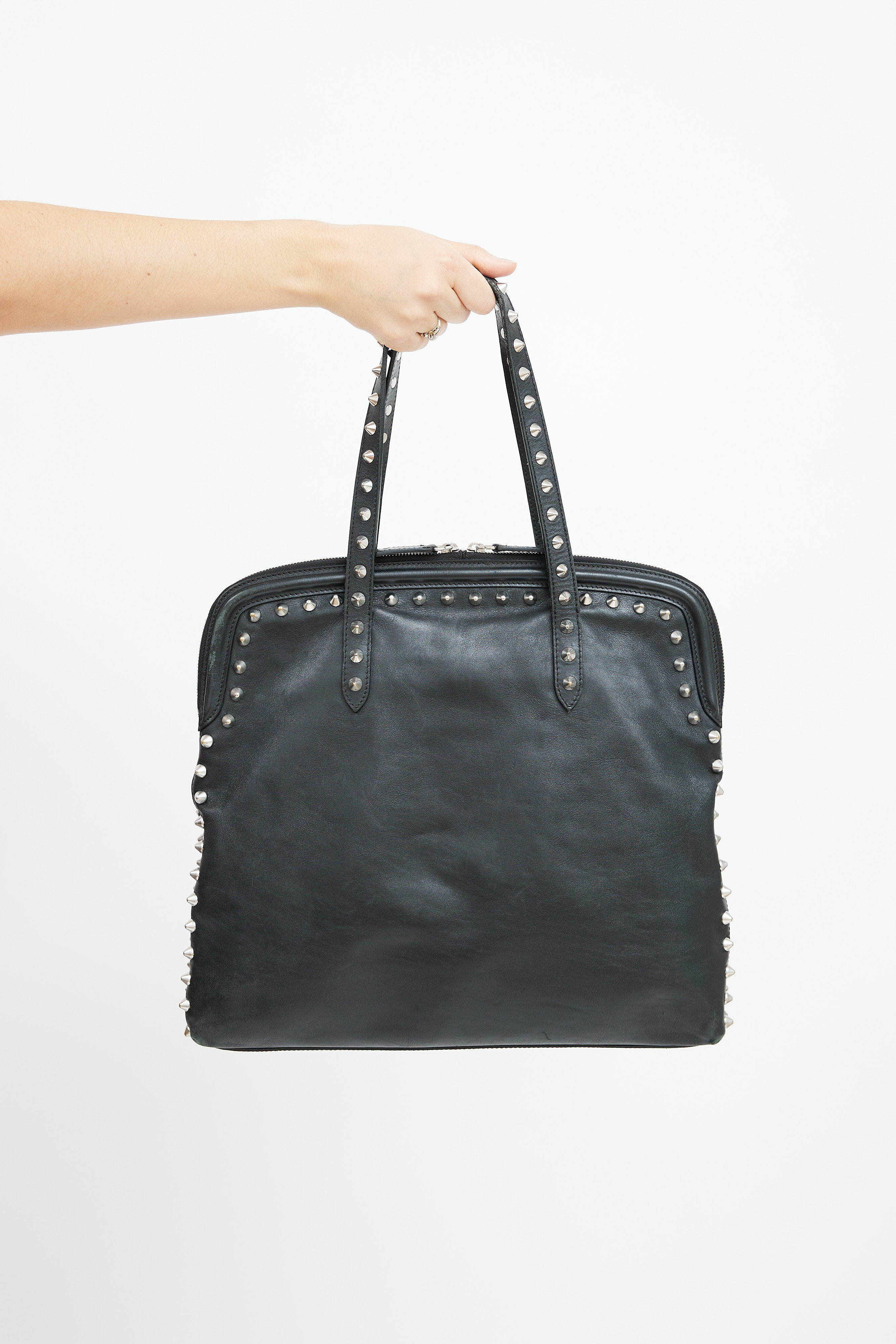 Pre-owned Alexander McQueen black leather tote bag featuring silver tone top dual zip closure, dual leather flat top handle, keyring cloche, silver tone stud trim throughout body and handles, signature skull lock charm adornment, silver tone logo at centre front, and one main lined compartment with two slip pockets and one zip pocket.