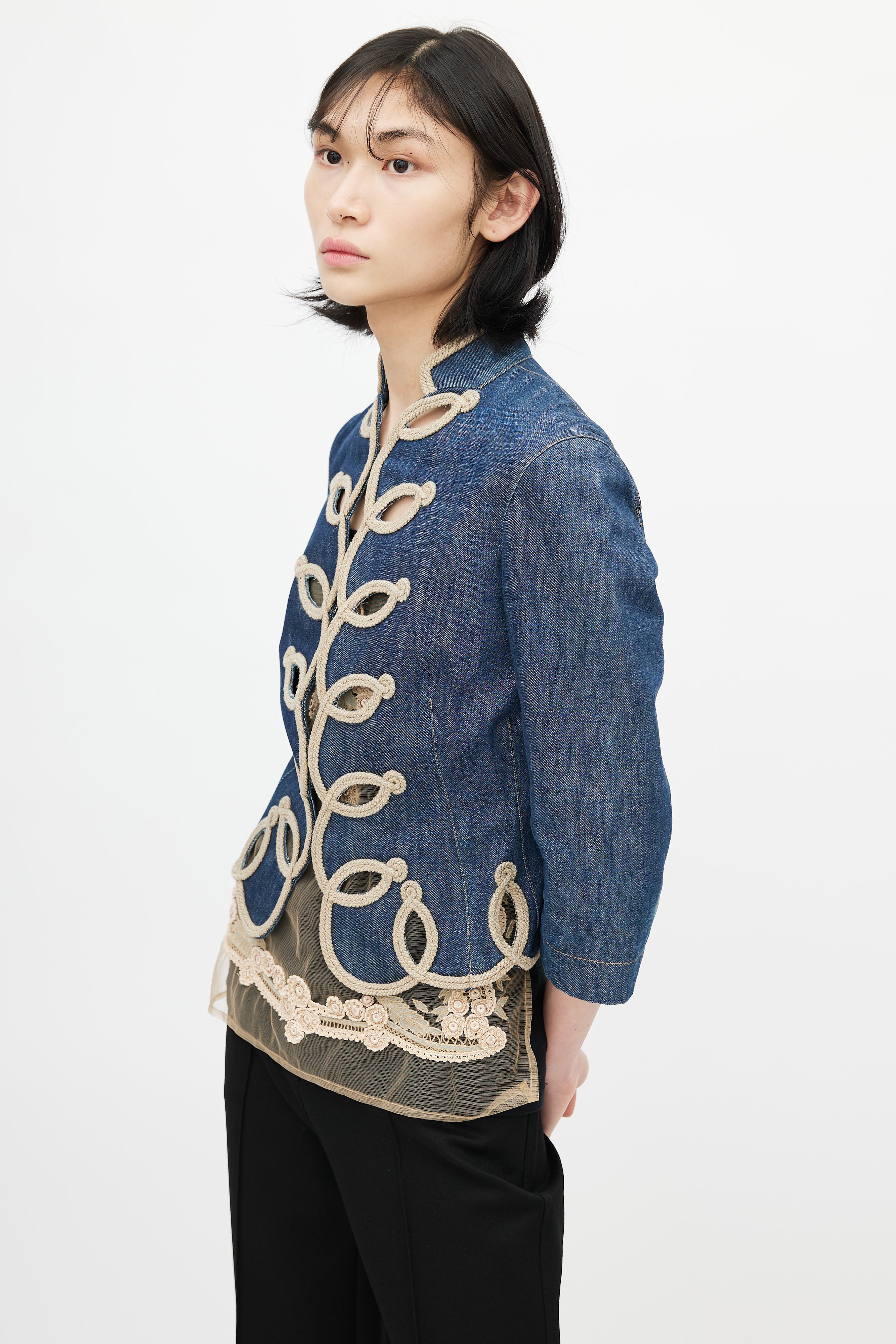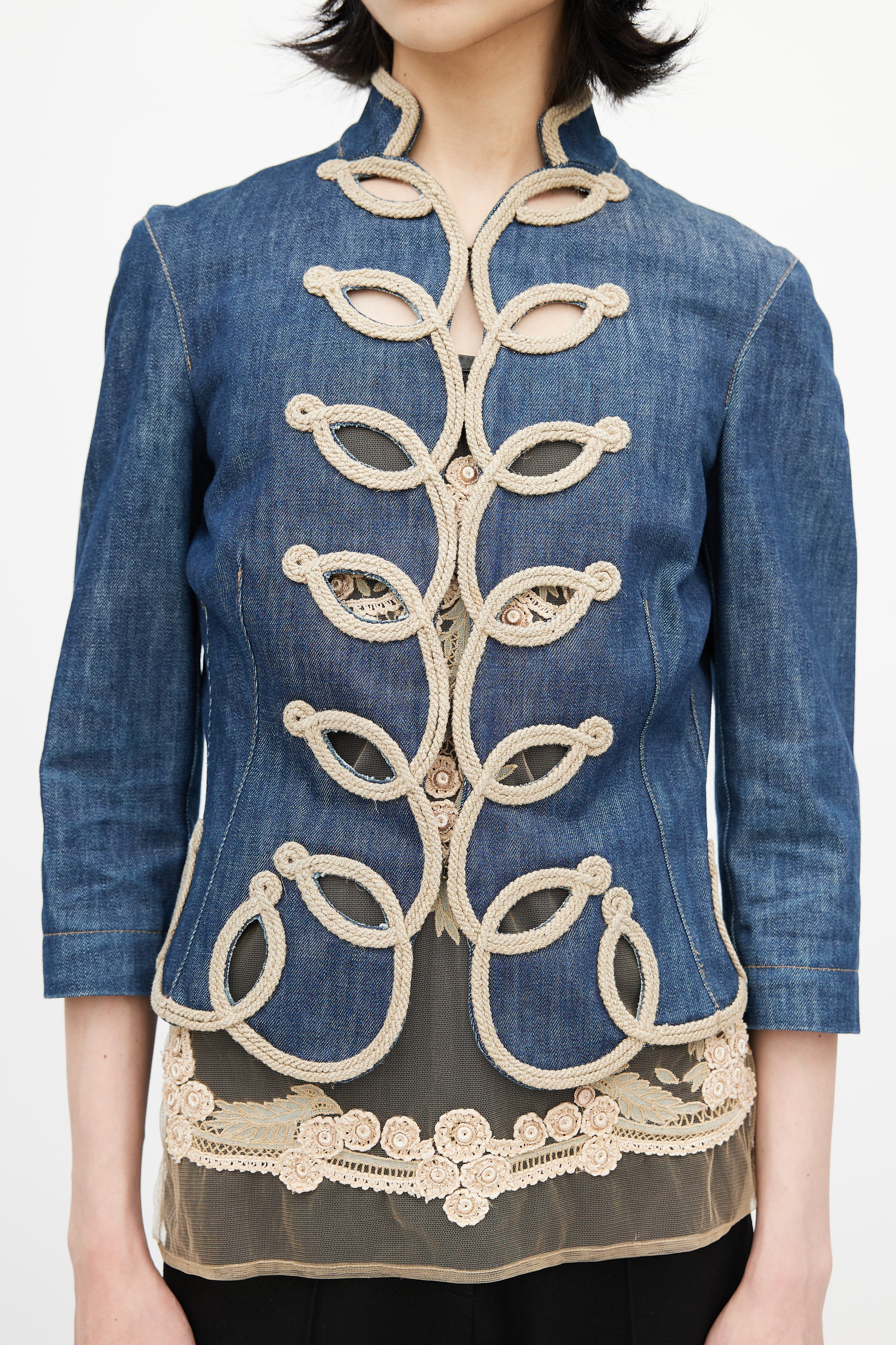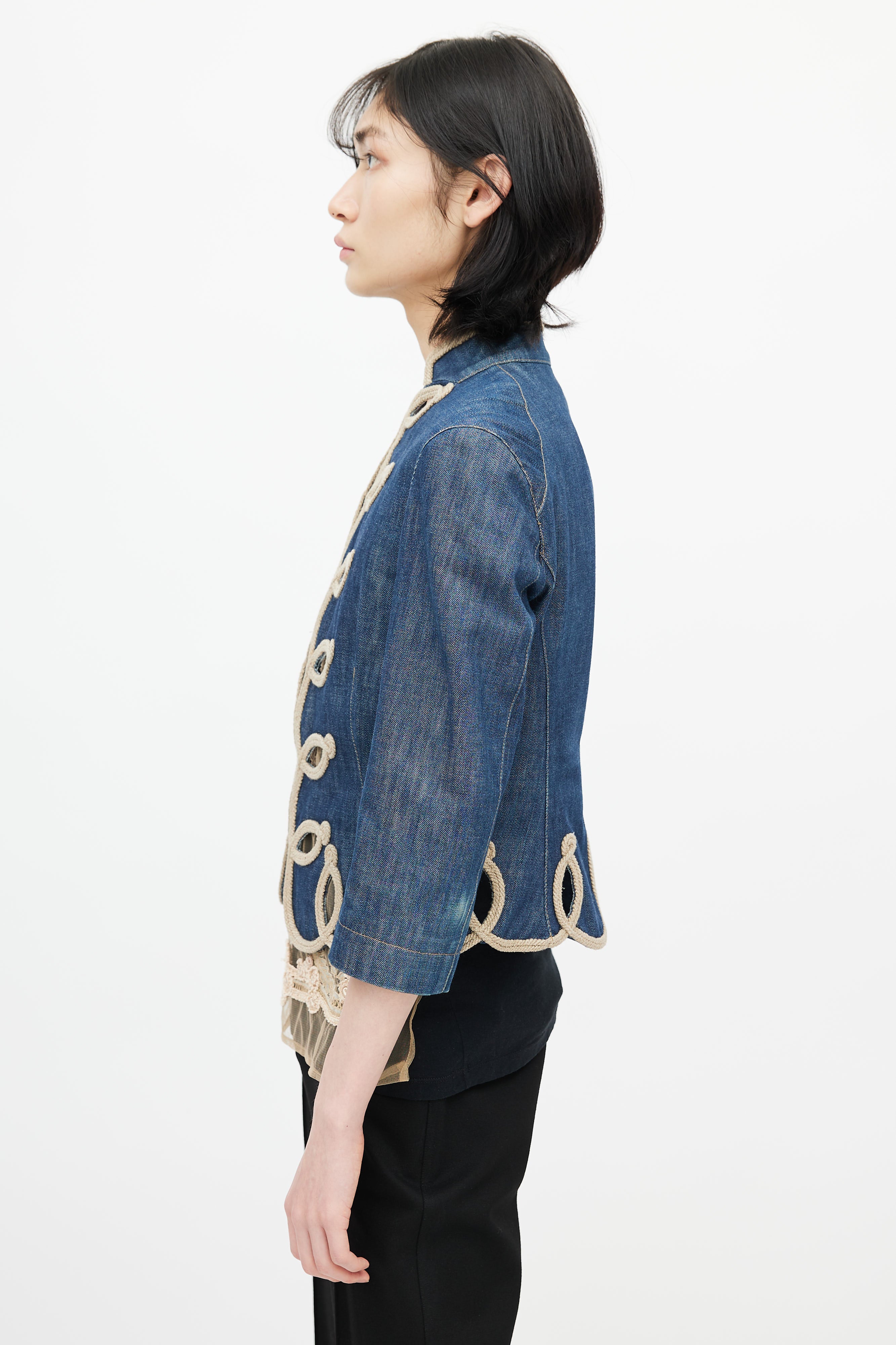 Pre-owned Spring/Summer 2005 Alexander McQueen blue denim jacket featuring cut out at front, mock collar, brown rope embroidery throughout, hook and eye closure at front, and back vent. Lined. From "It's Only A Game" collection.