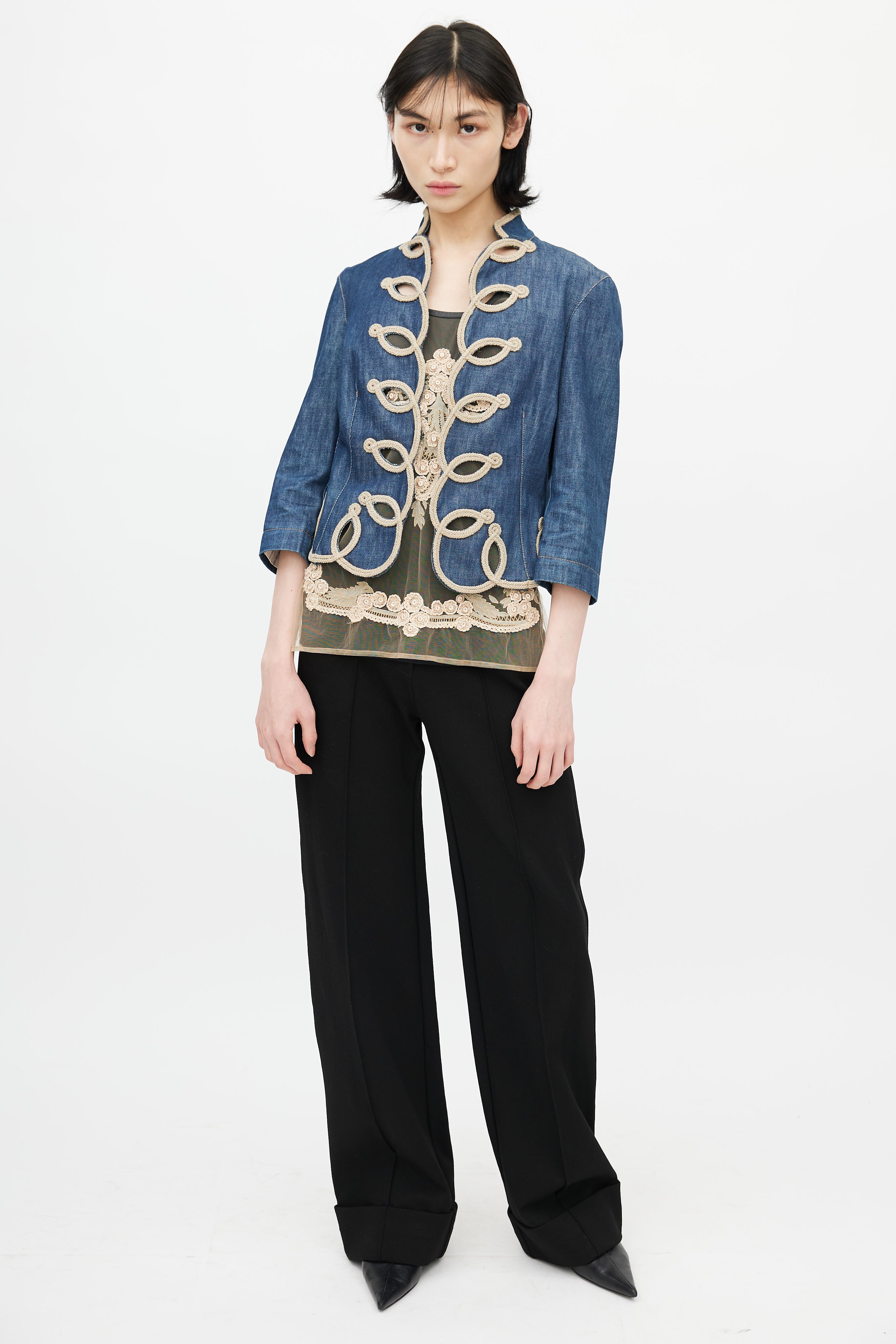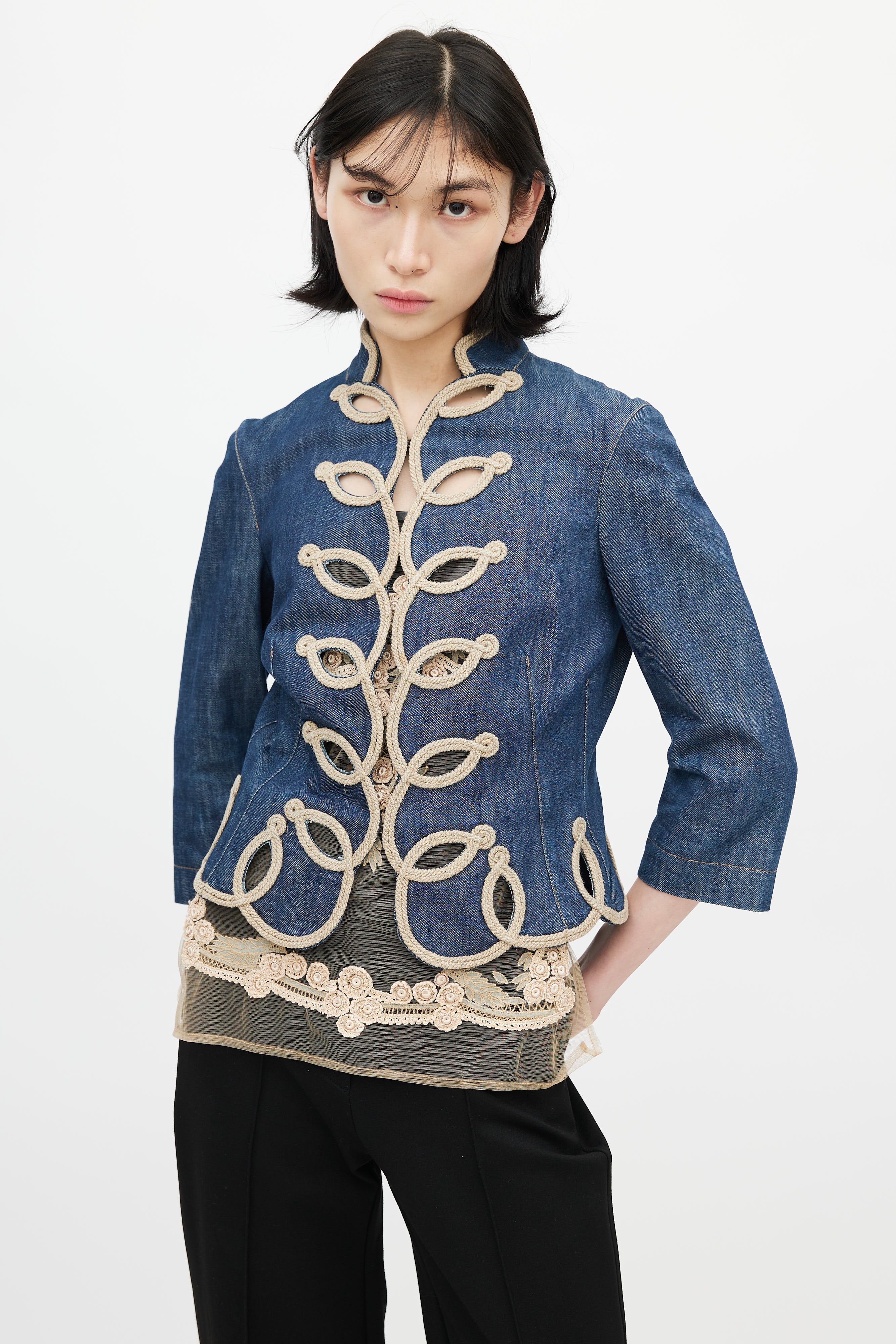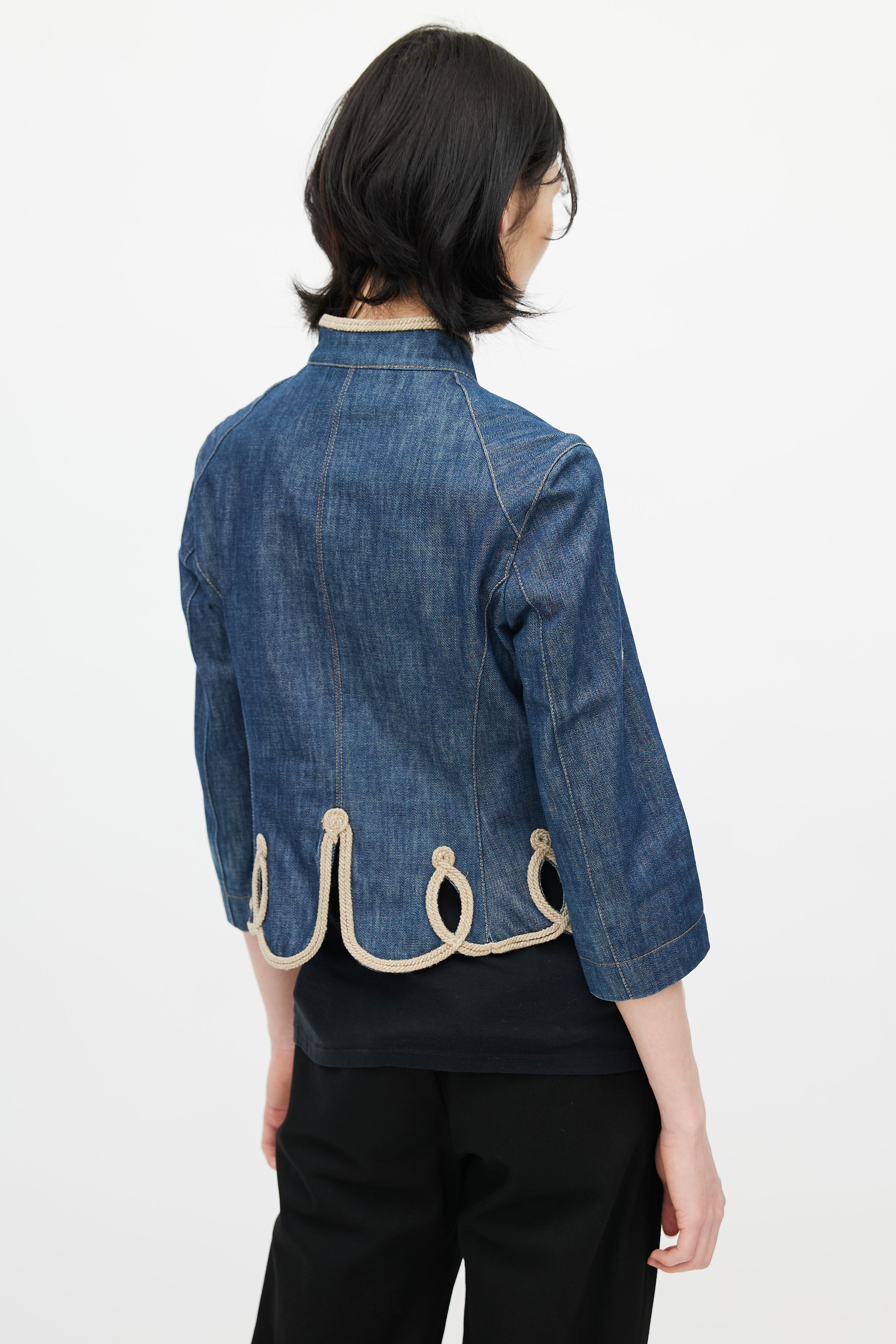 Pre-owned Spring/Summer 2005 Alexander McQueen blue denim jacket featuring cut out at front, mock collar, brown rope embroidery throughout, hook and eye closure at front, and back vent. Lined. From "It's Only A Game" collection.
