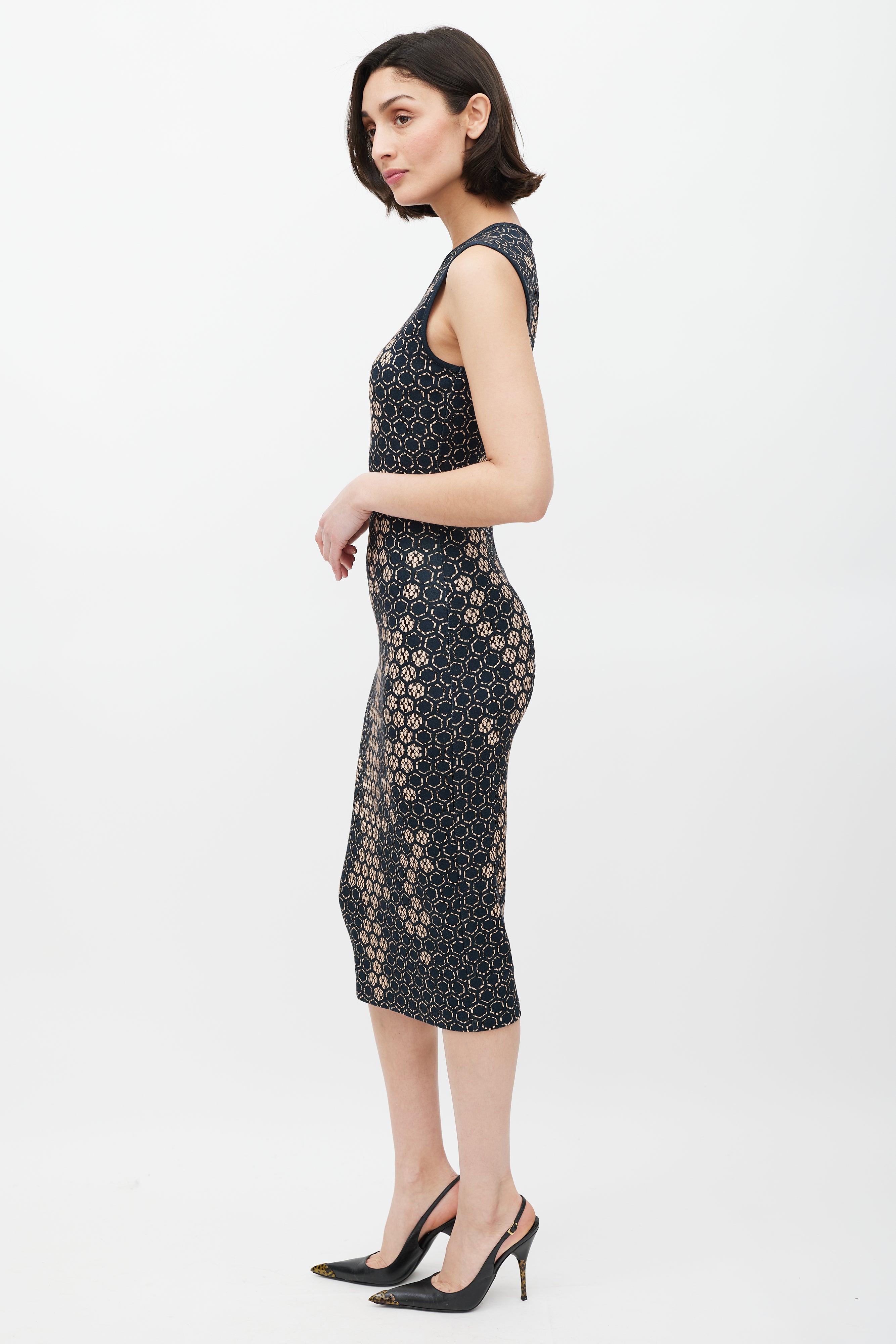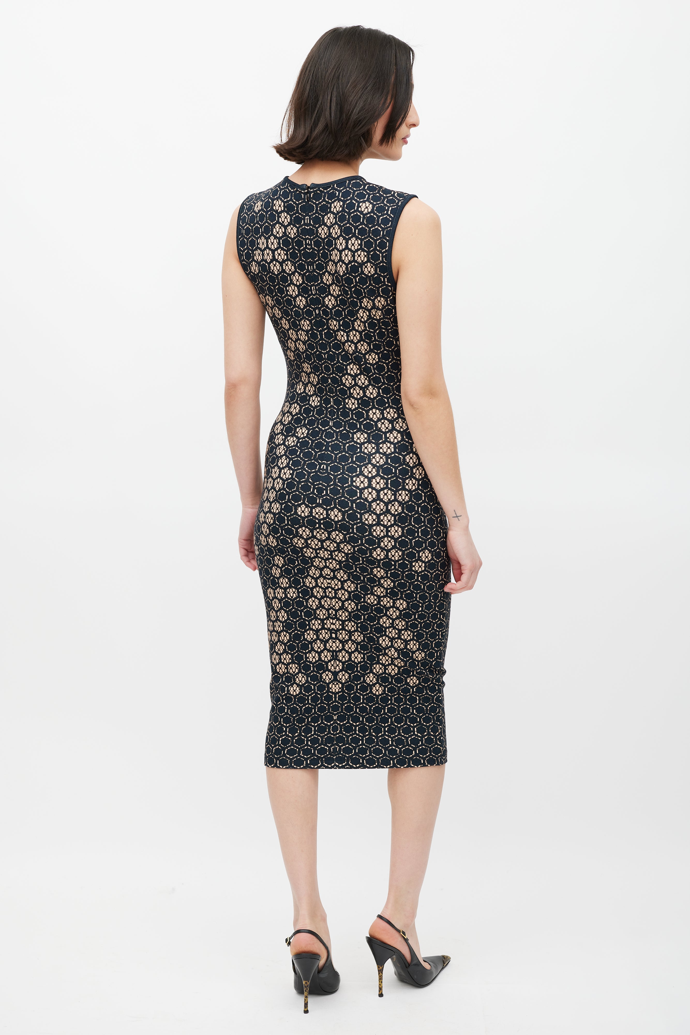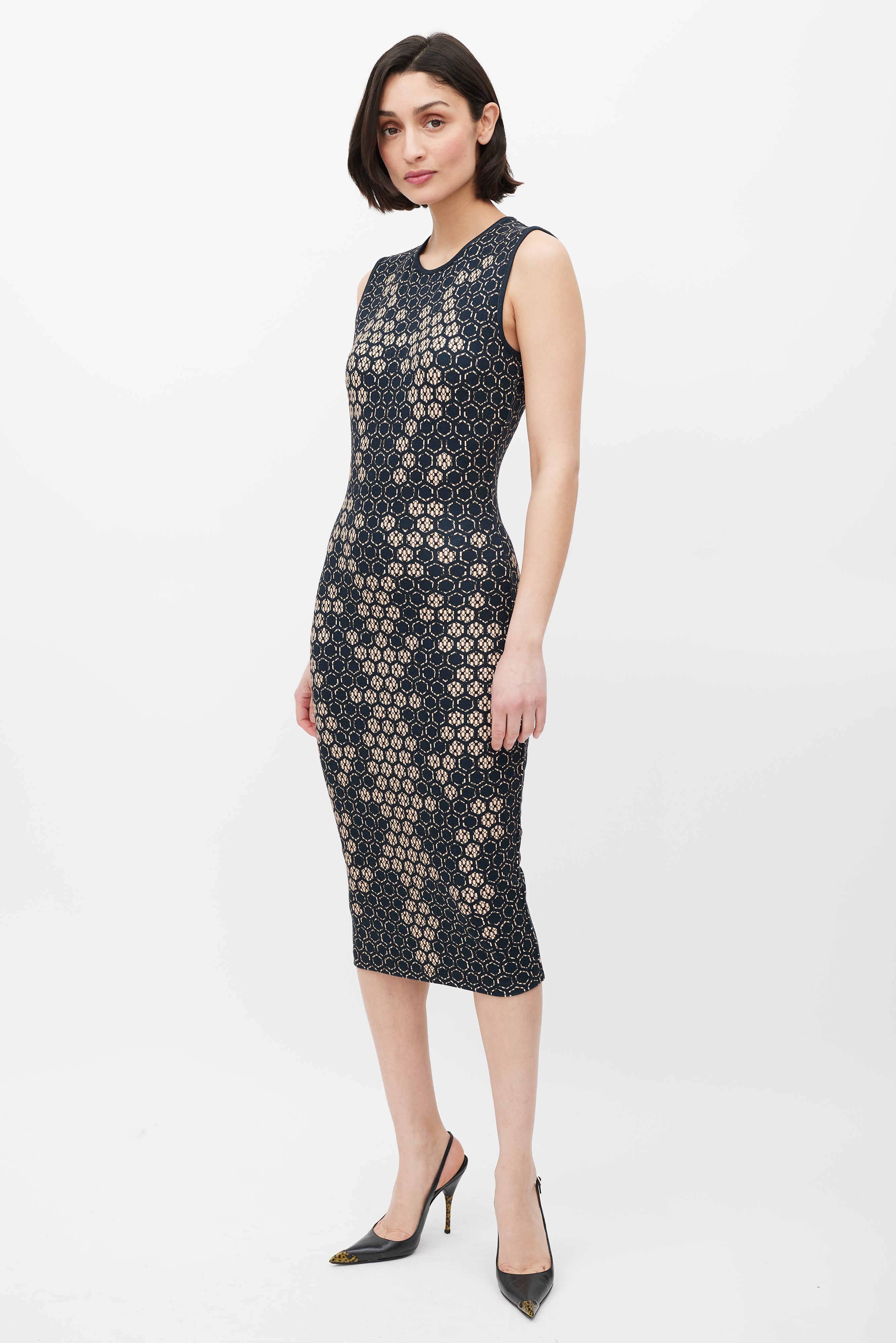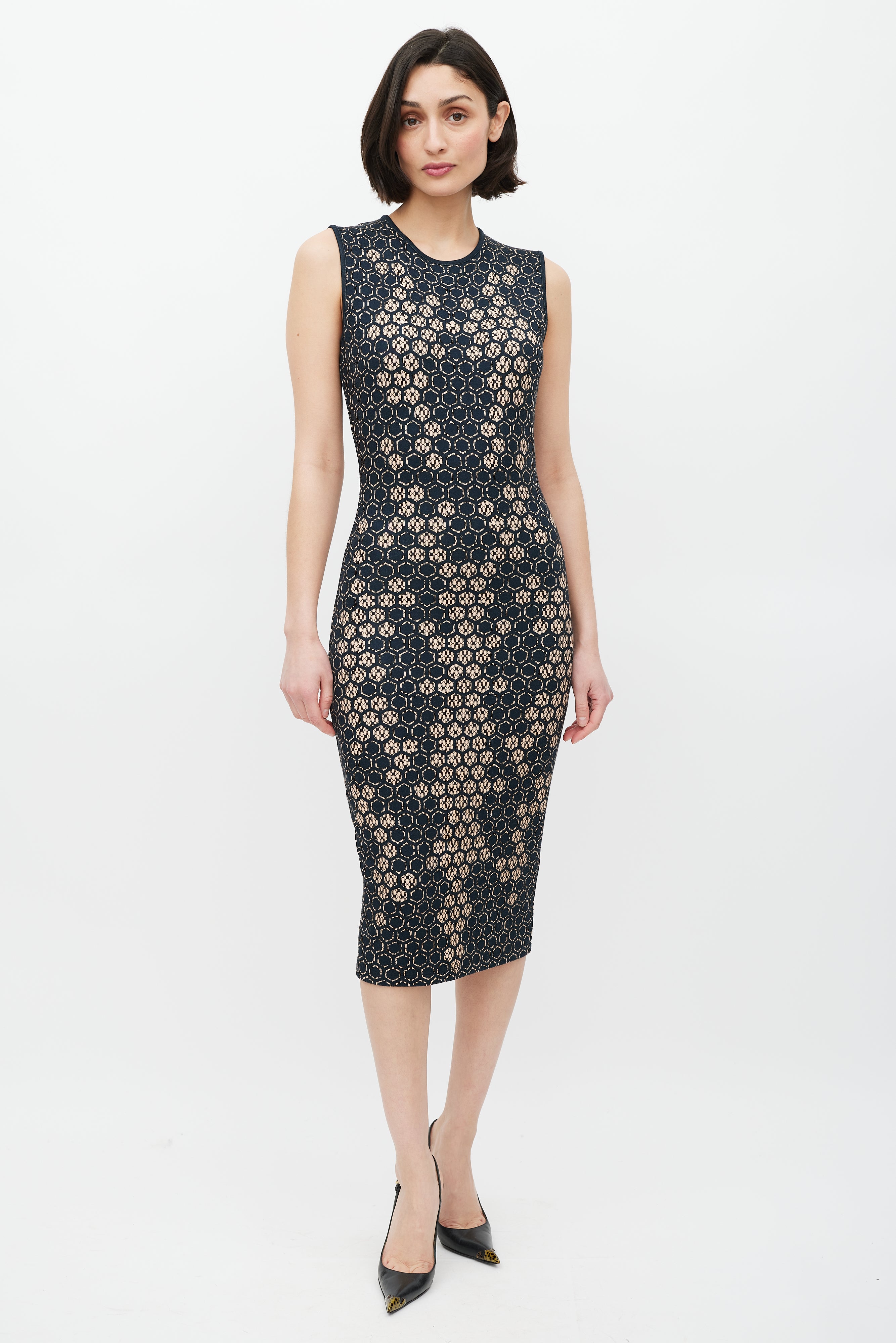 Pre-owned Spring/Summer 2013 Alexander McQueen navy dress featuring a cream honeycomb pattern throughout, round neckline, sleeveless styling, and zip closure at back.