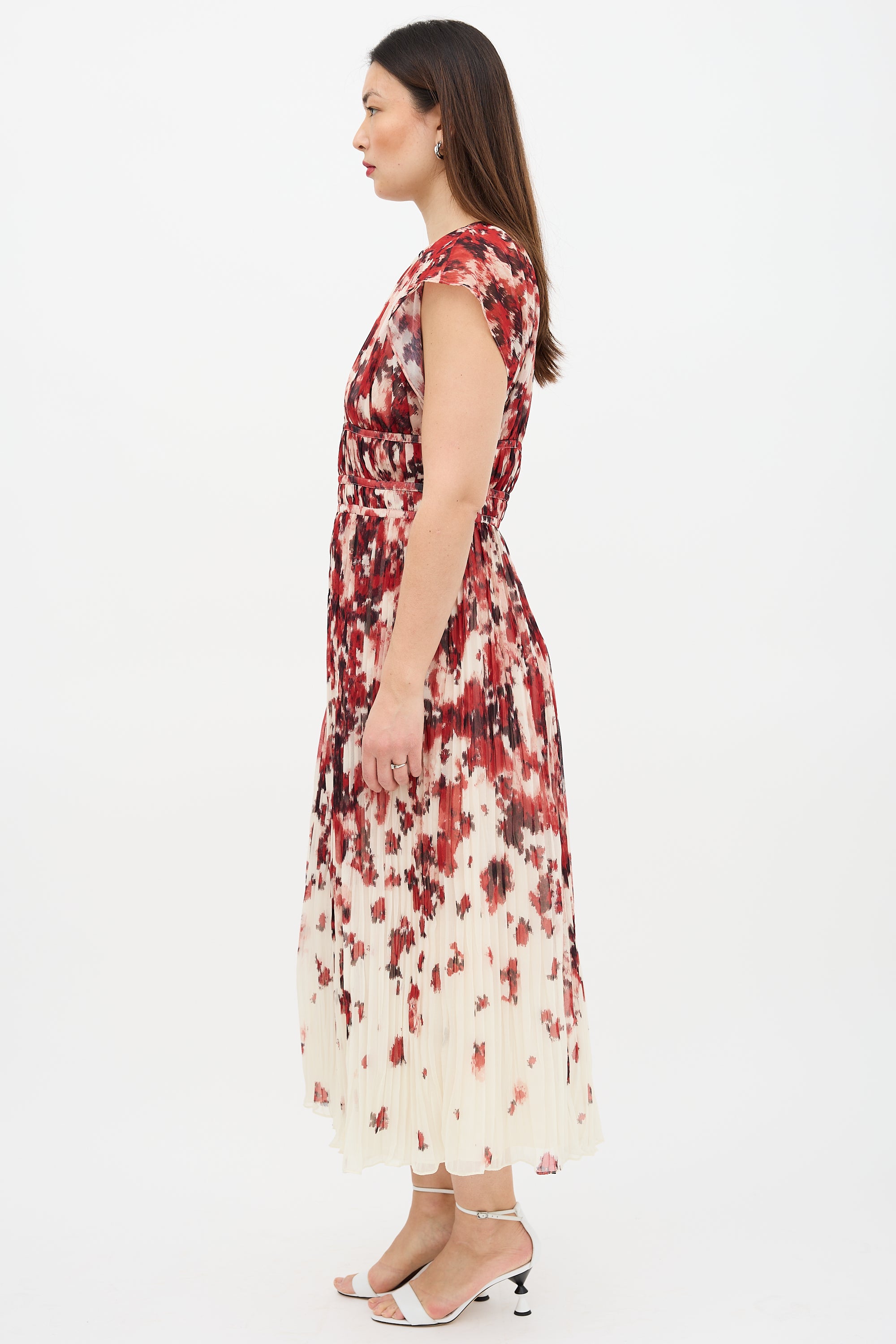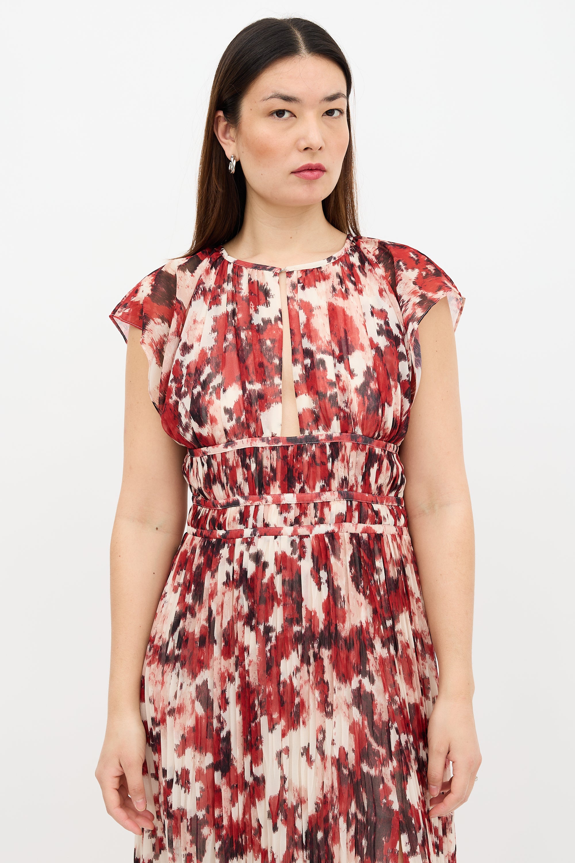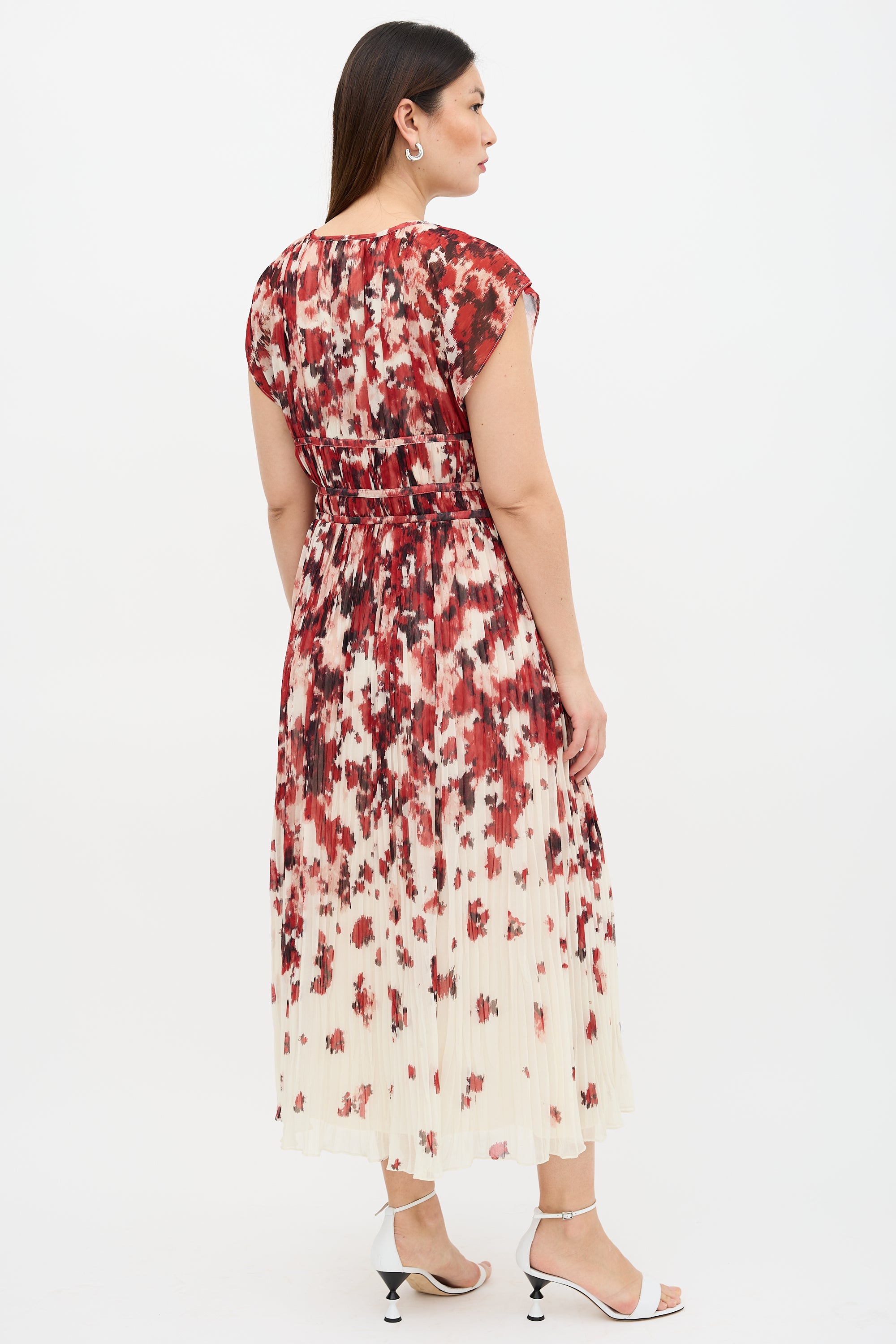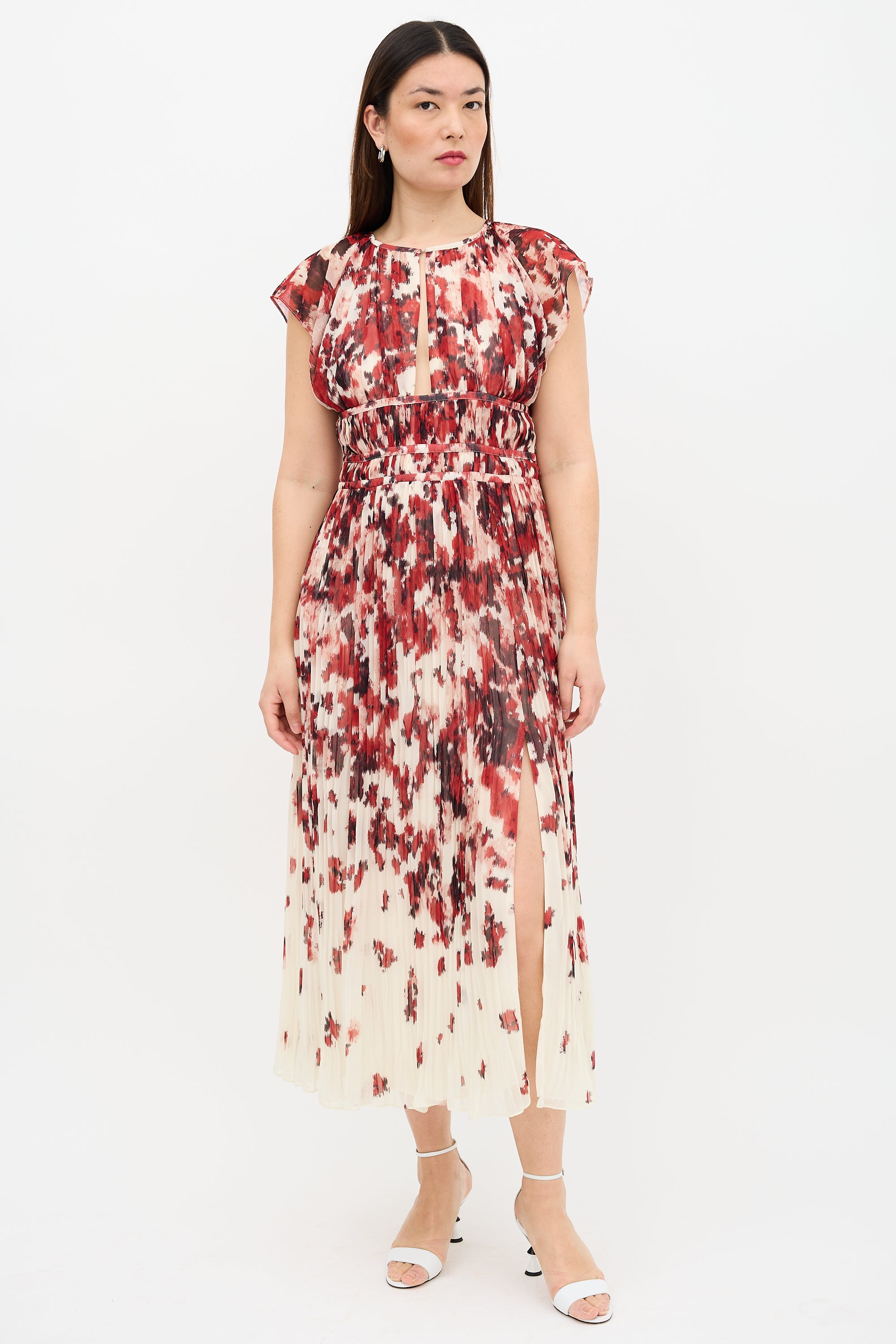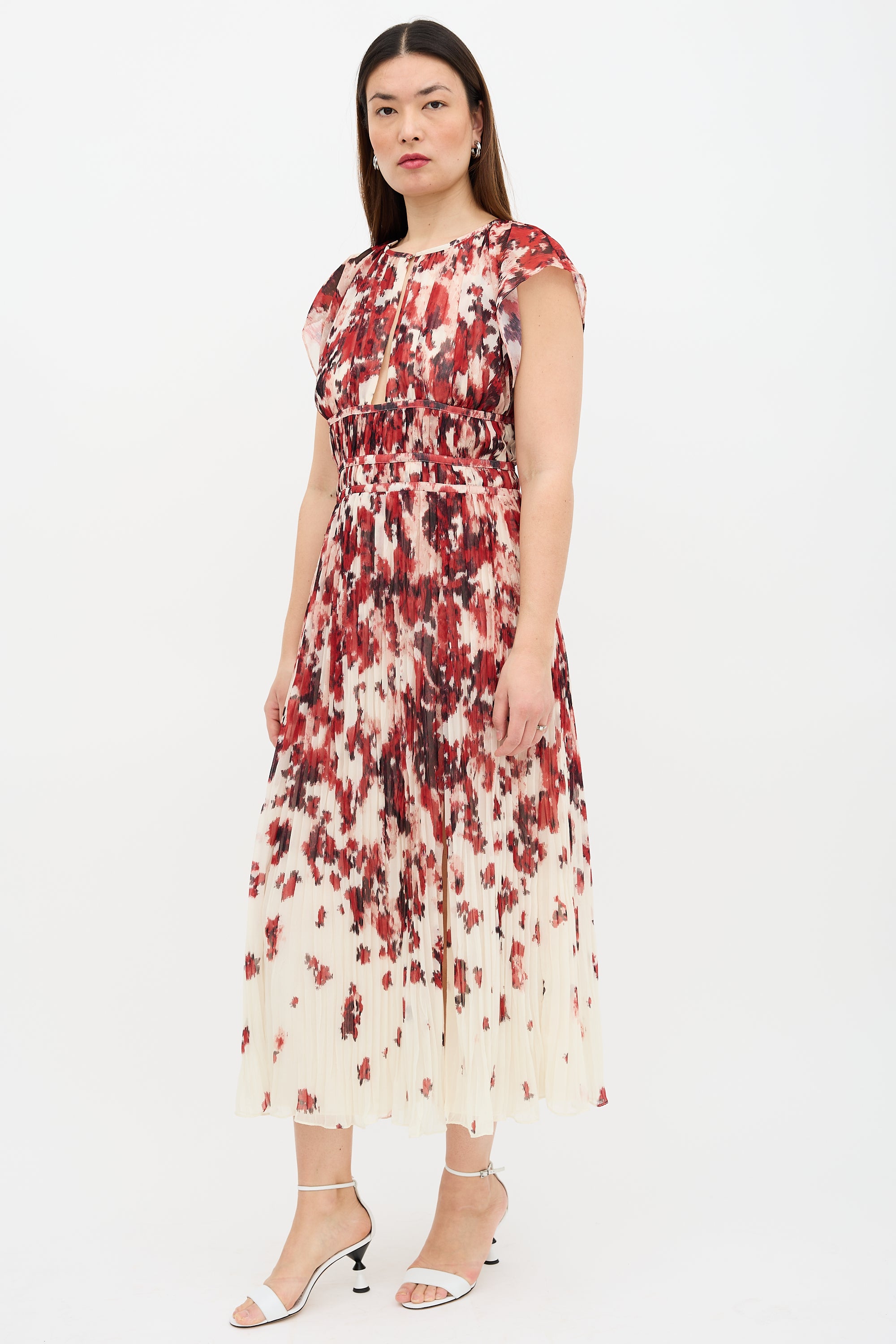 Pre-owned Altuzarra red and cream Angi midi dress featuring a round neckline with keyhole detail at chest, abstract print, hook closure at collar, flutter sleeves, pleating throughout, and a side zip closure. Lined.