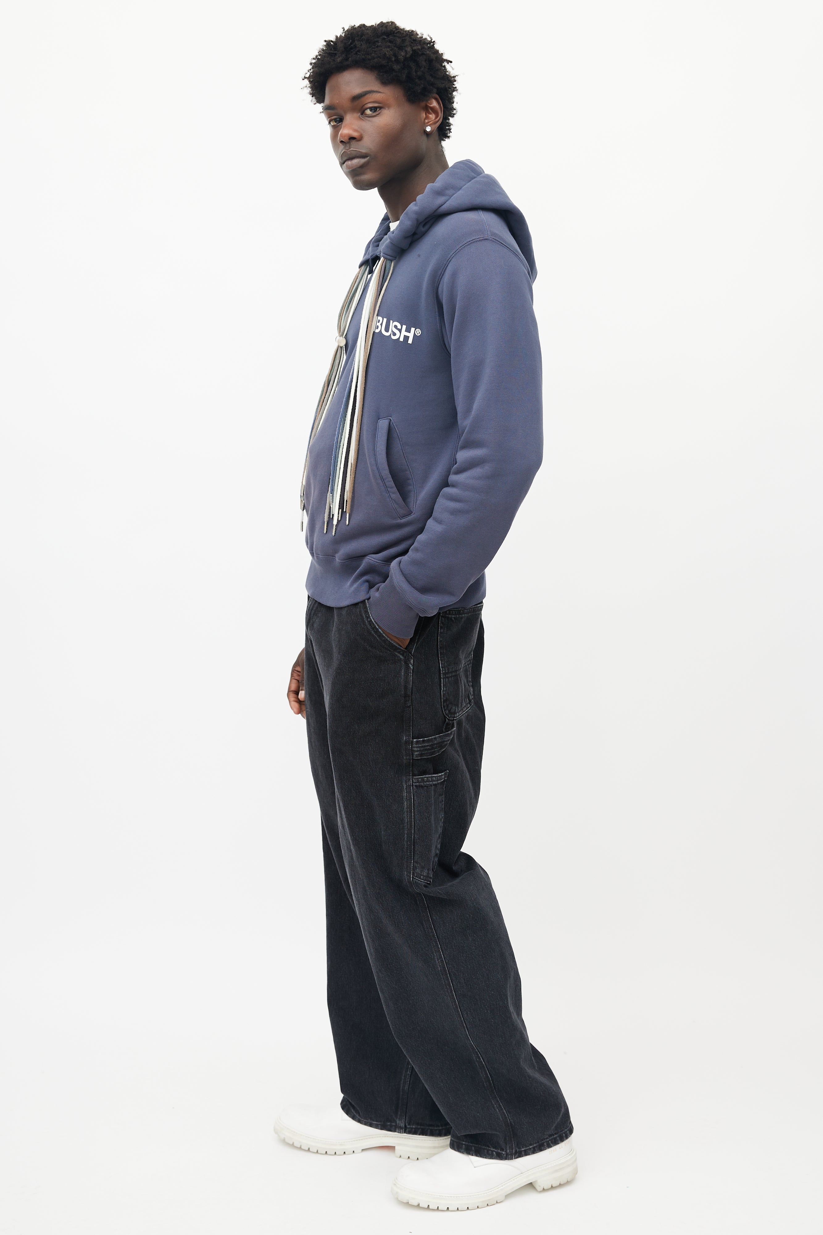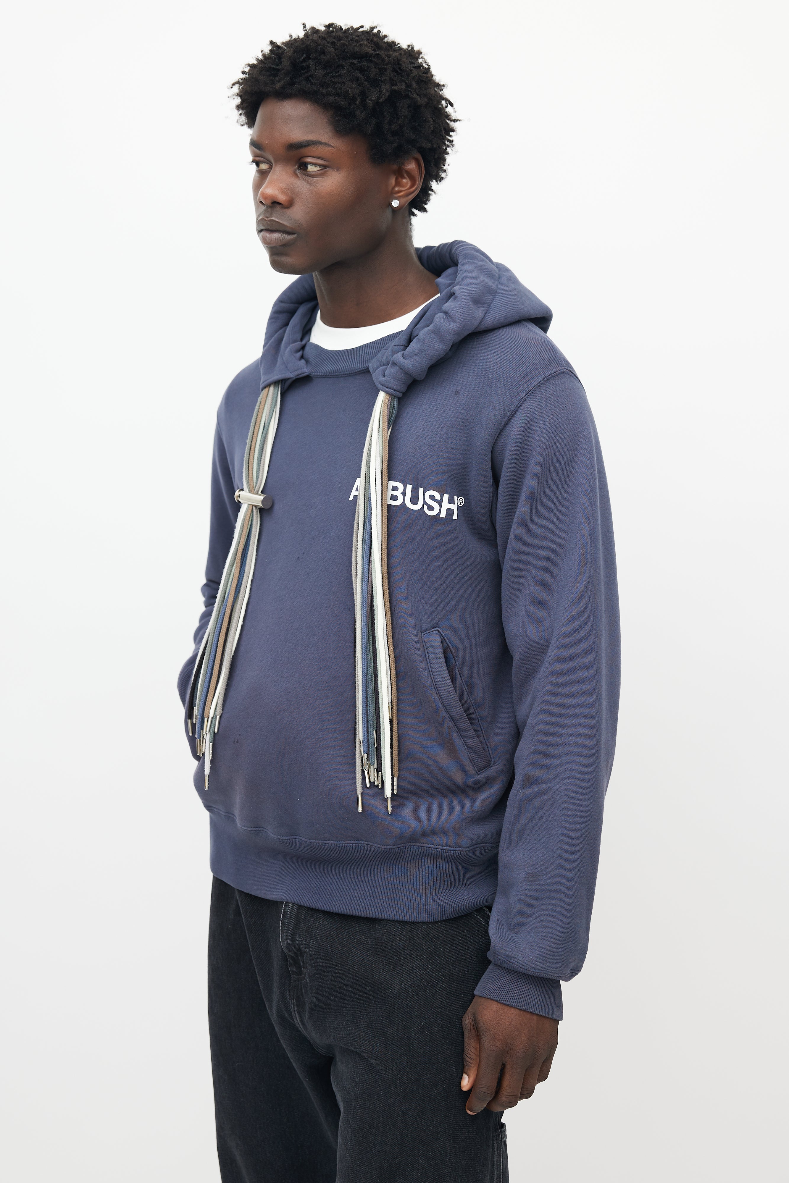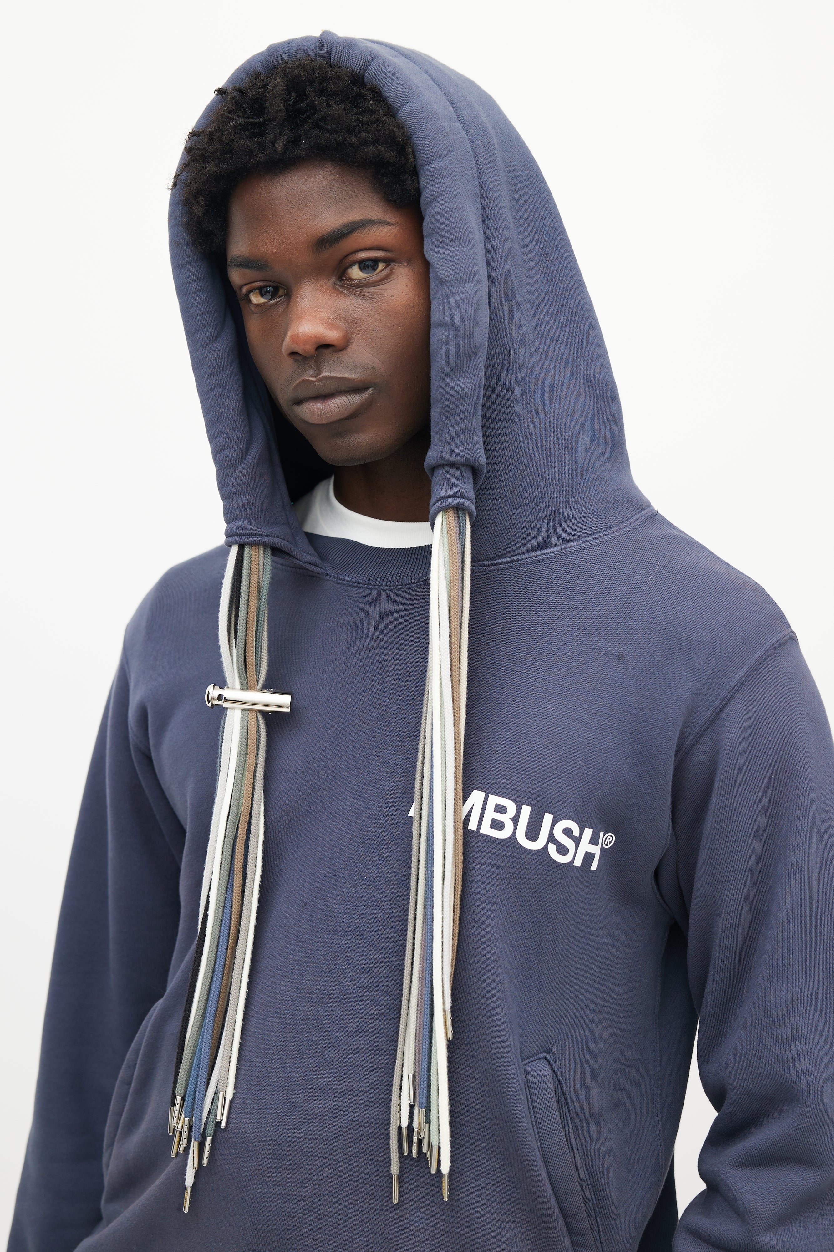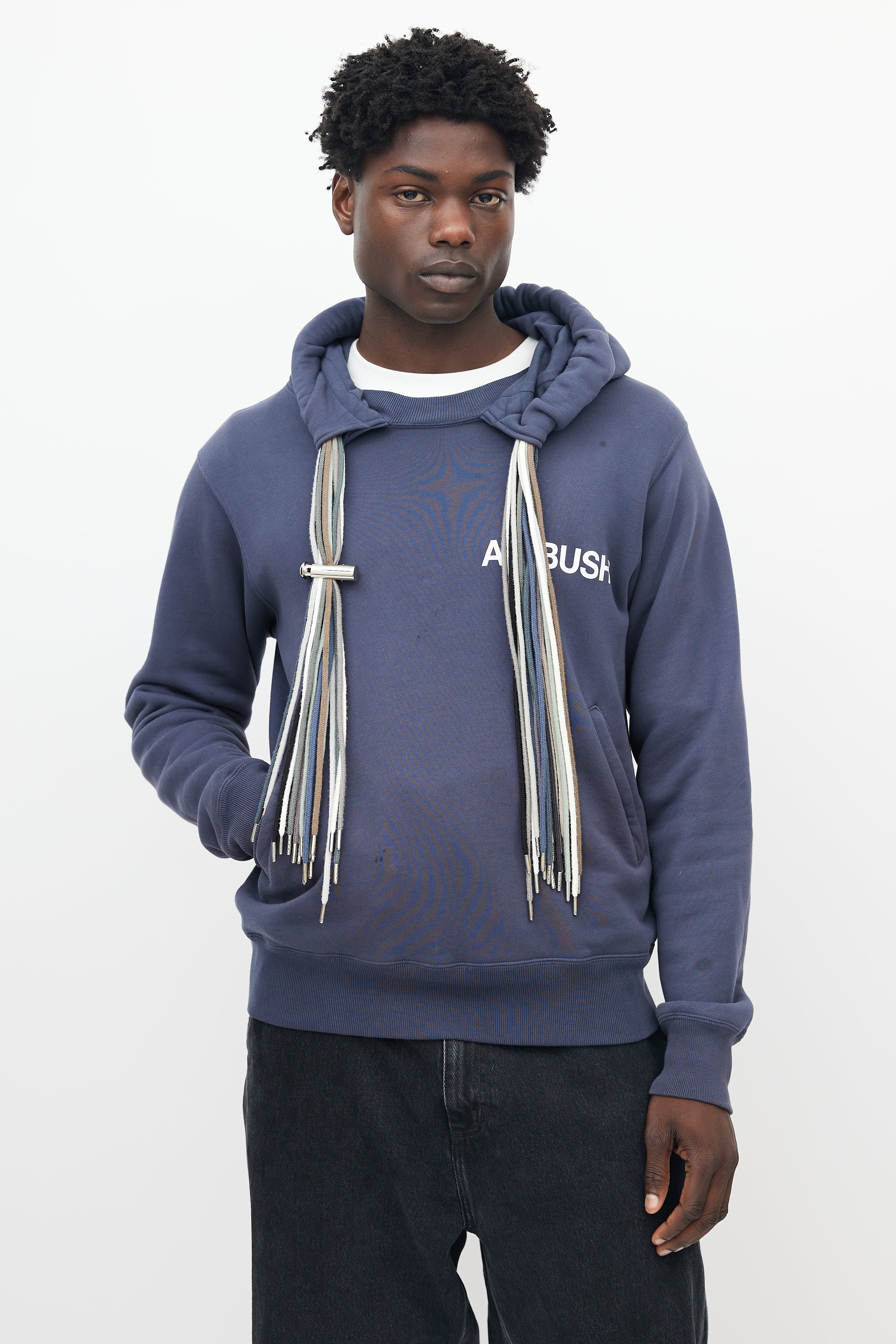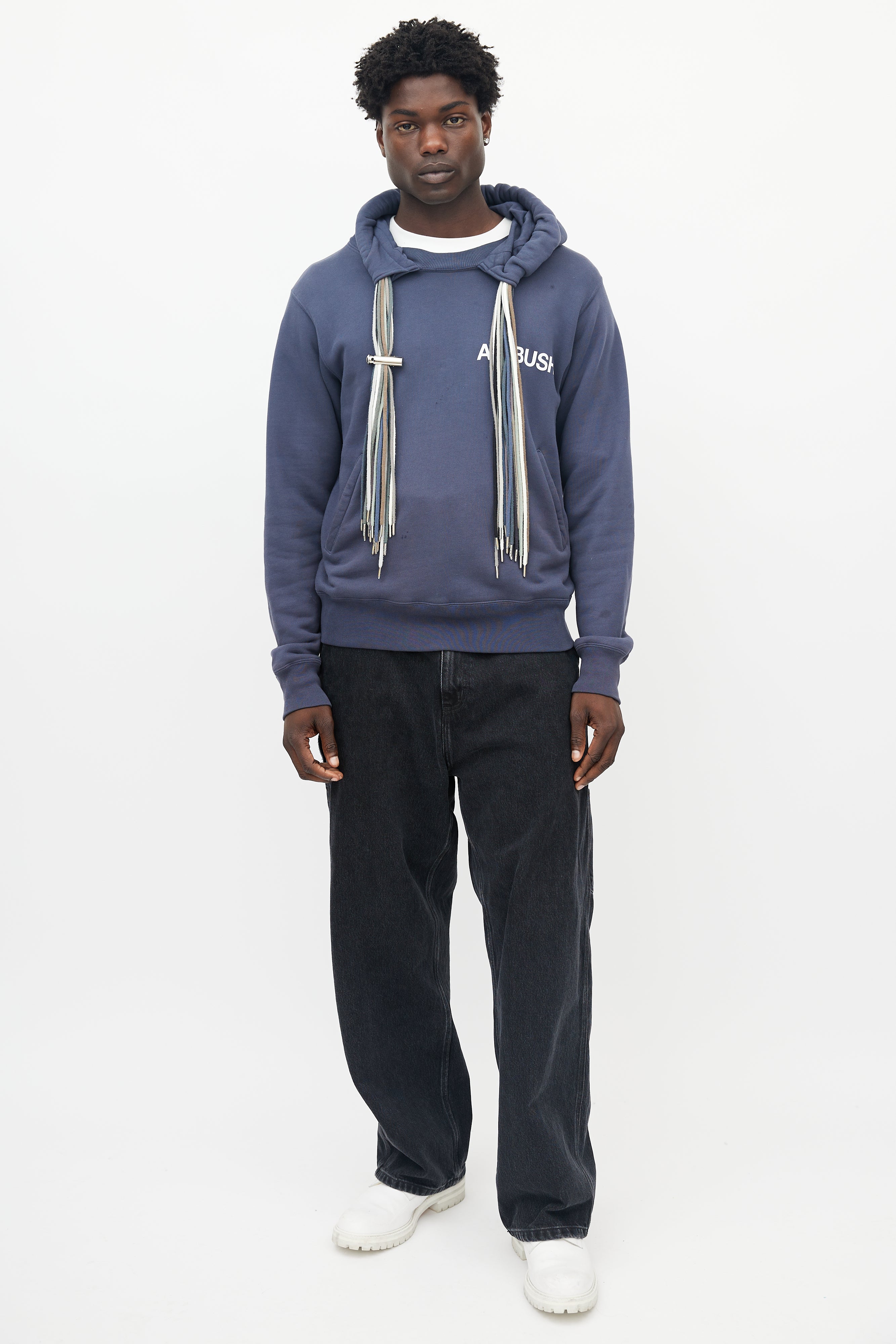 Pre-owned Ambush Multi Cord sweatshirt featuring multiple neutral drawstrings at hood, silver tone hardware clasp, ribbed collar detail at hood and kangaroo pockets at front waist.