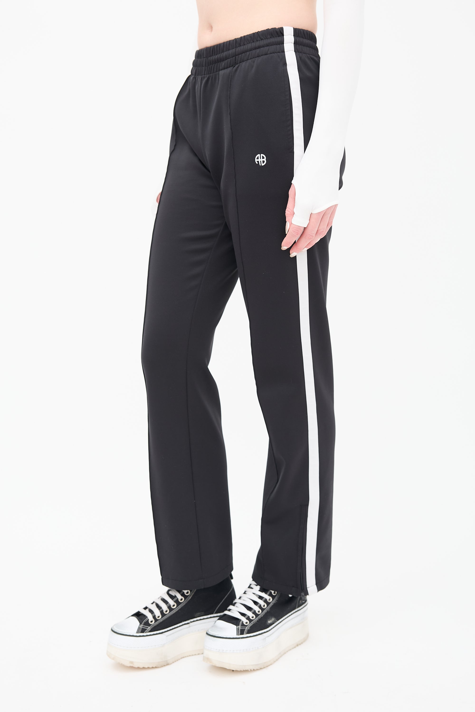 Pre-owned Anine Bing Sport black Kameron lounge pant featuring an elasticized waist, interior drawstring, in seam pockets, straight leg with front pin tucks, white side stripes, embroidered logo at left hip, and zipped hem.