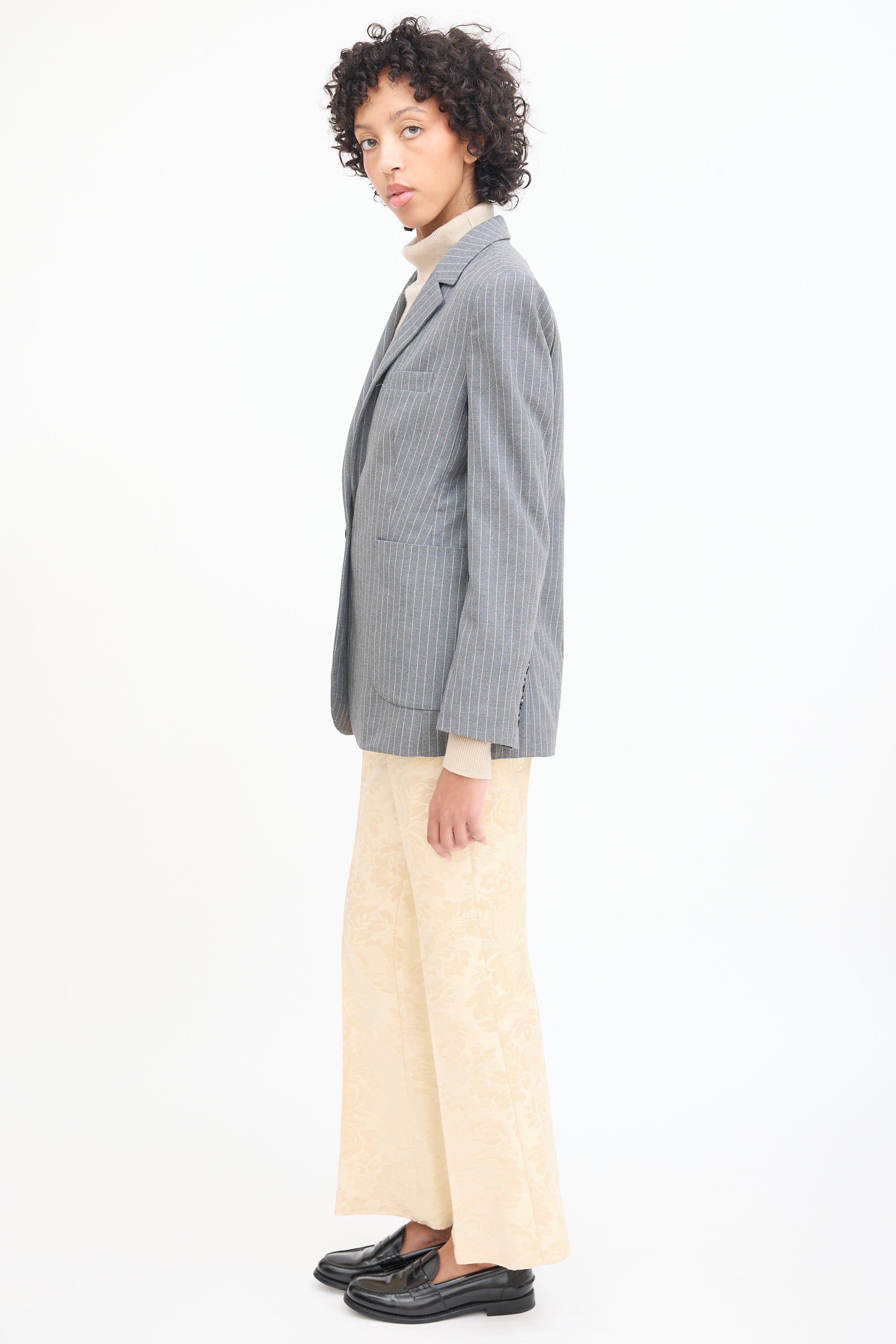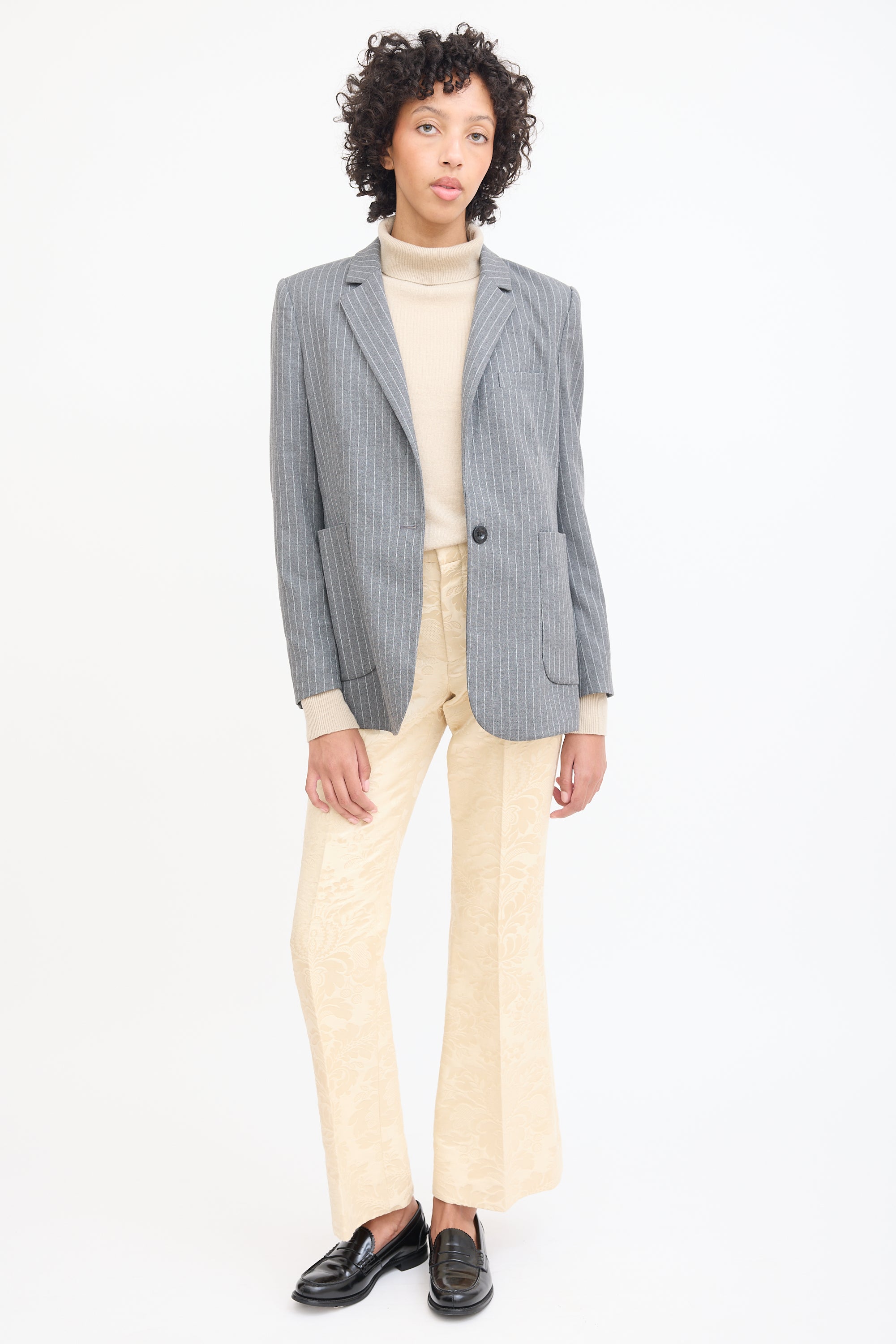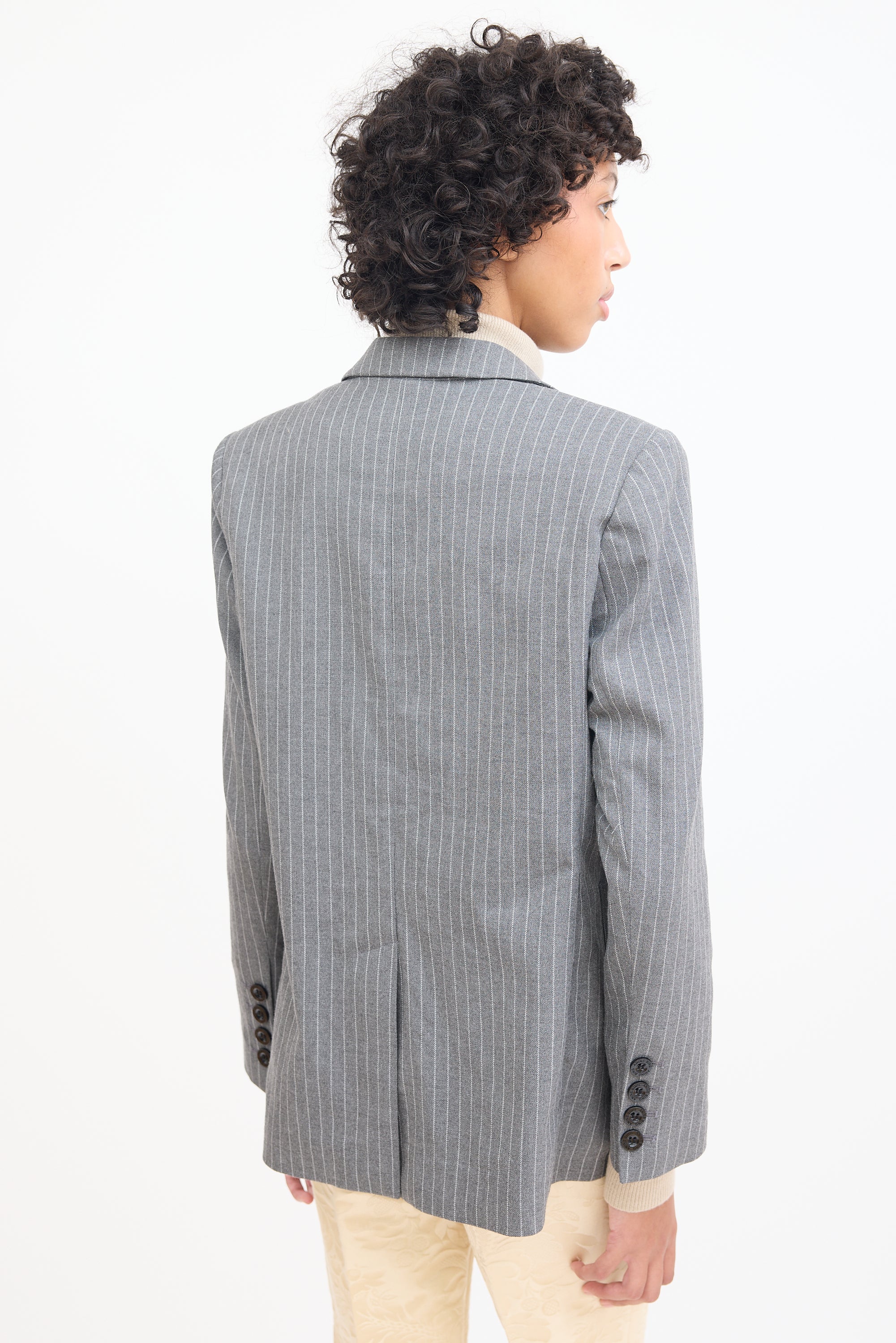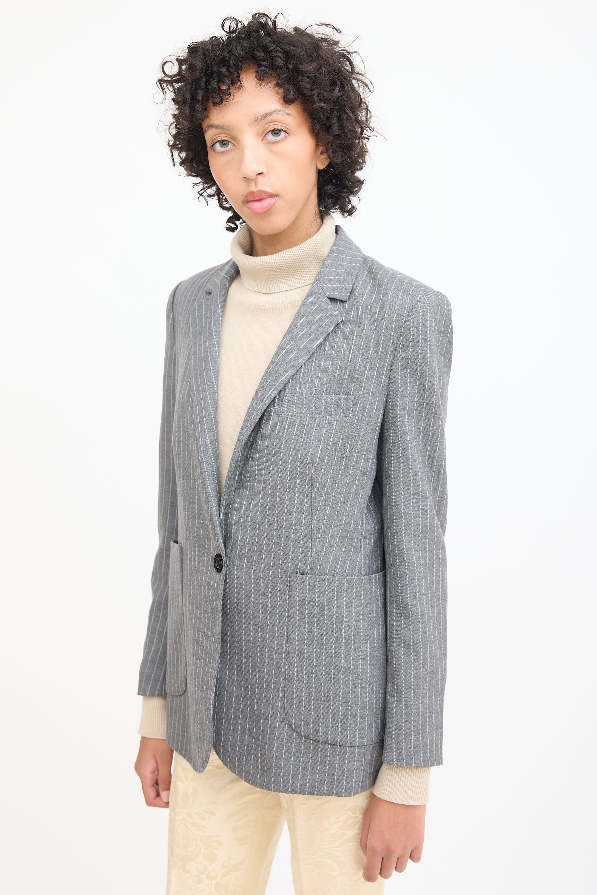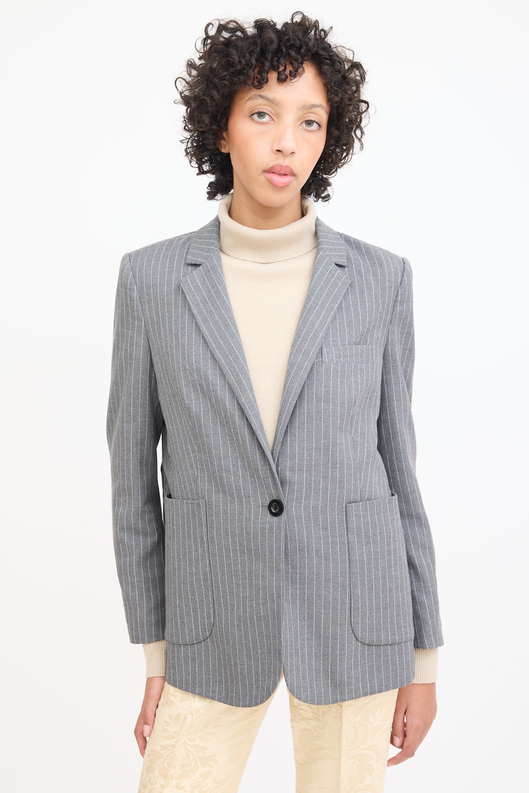 Pre-owned Anine Bing grey blazer featuring a white pinstripe pattern throughout, notched lapel, long sleeves with buttoned cuffs, one welt pocket at chest, two patch pockets at hip, and button up closure. Lined.