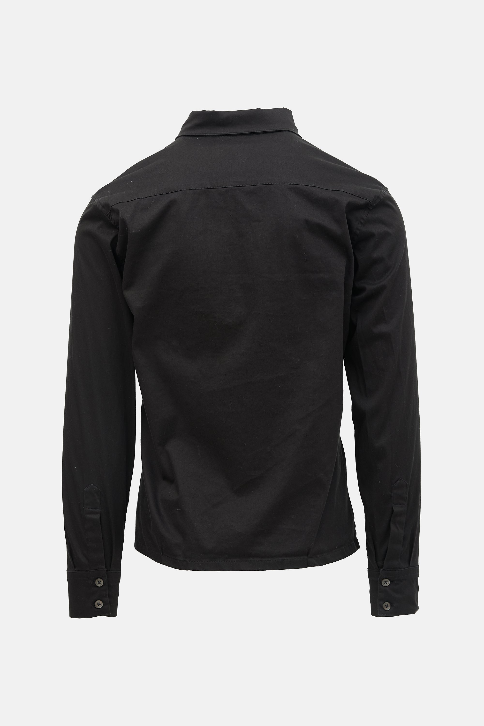 Pre-owned Ann Demeulemeester black shirt featuring a point collar, button front, patch pocket at chest, side slits, and buttoned cuffs.