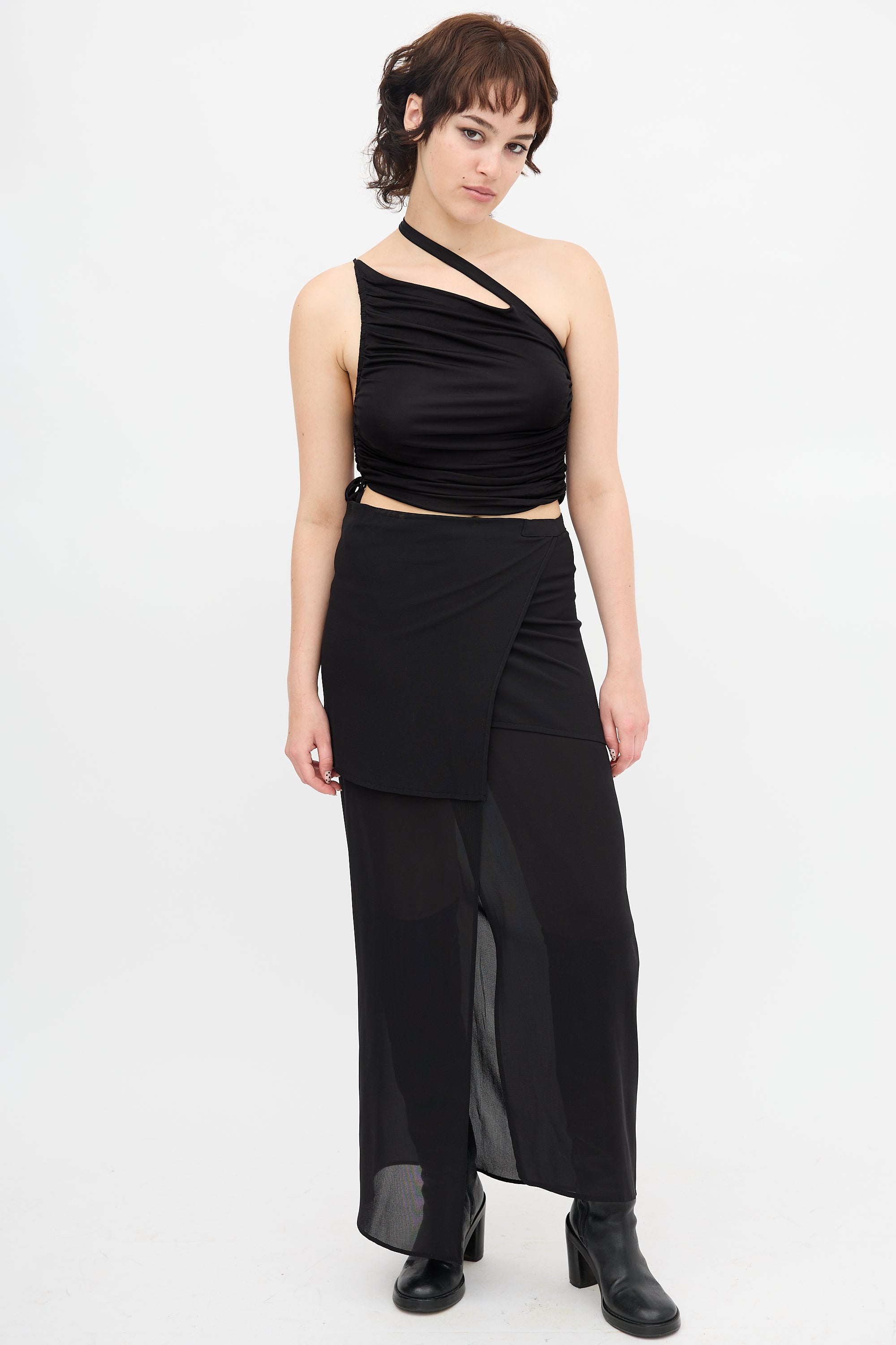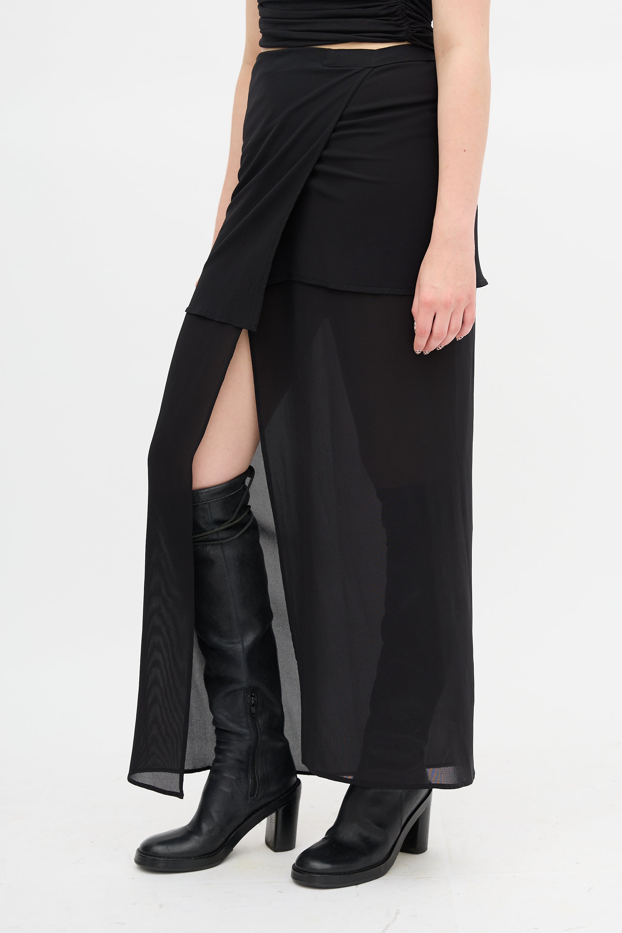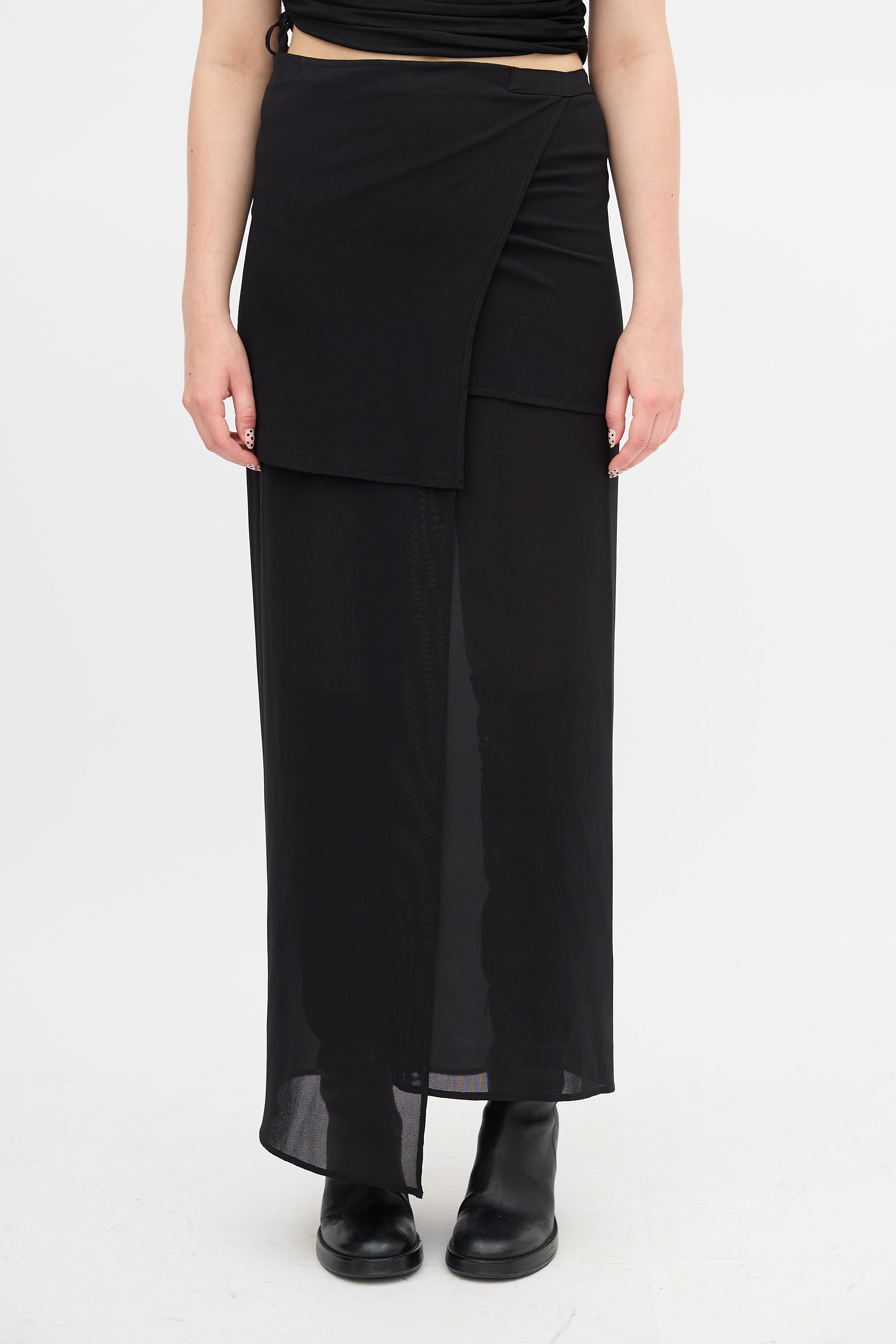 Pre-owned Ann Demeulemeester black silk blend sheer wrap skirt featuring adjustable side button closure and asymmetrical layers.