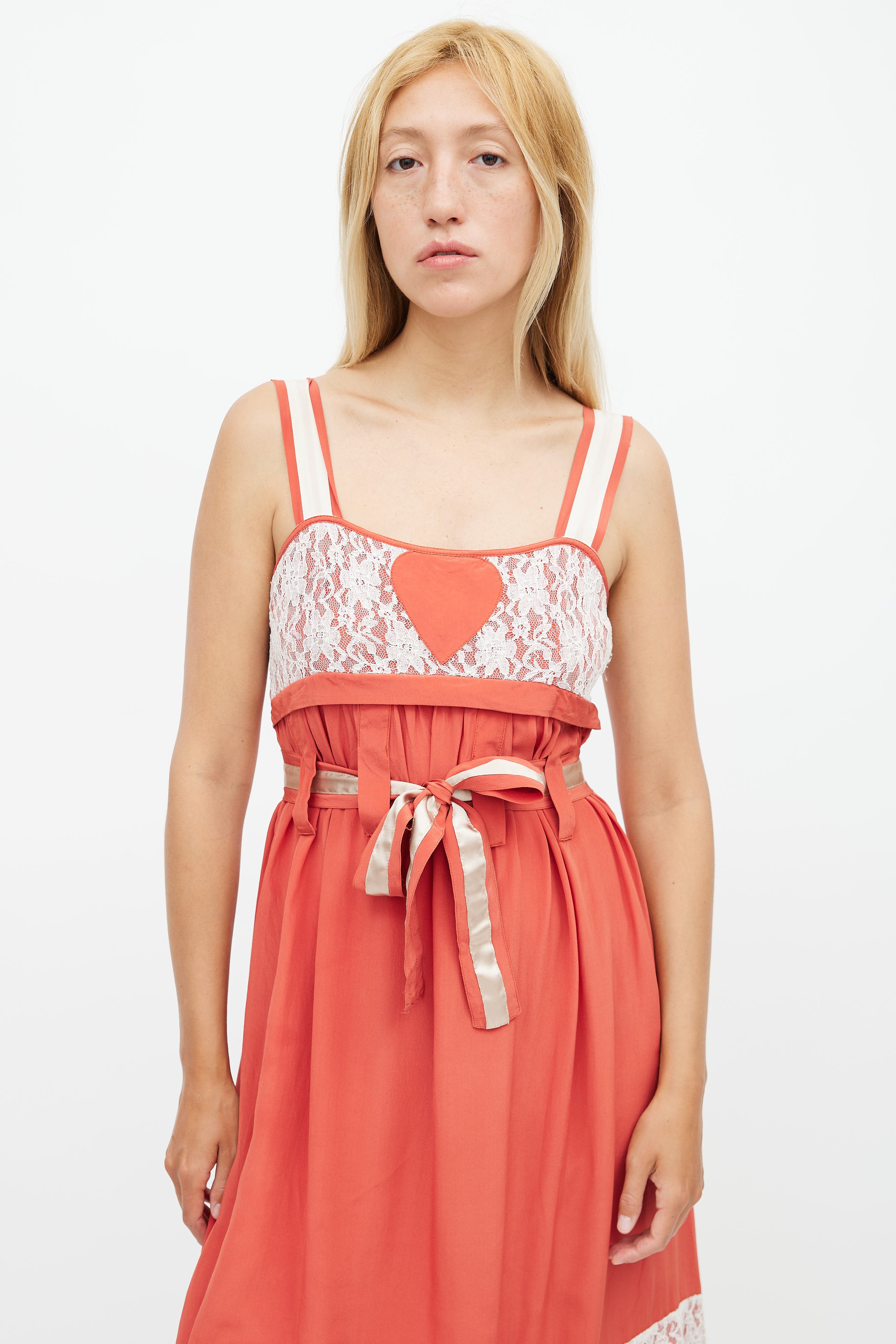 Pre-owned Anna Sui red dress featuring a white lace overlay detail, scoop neckline, tie belt at waist, and zip closure at right side. Lined.