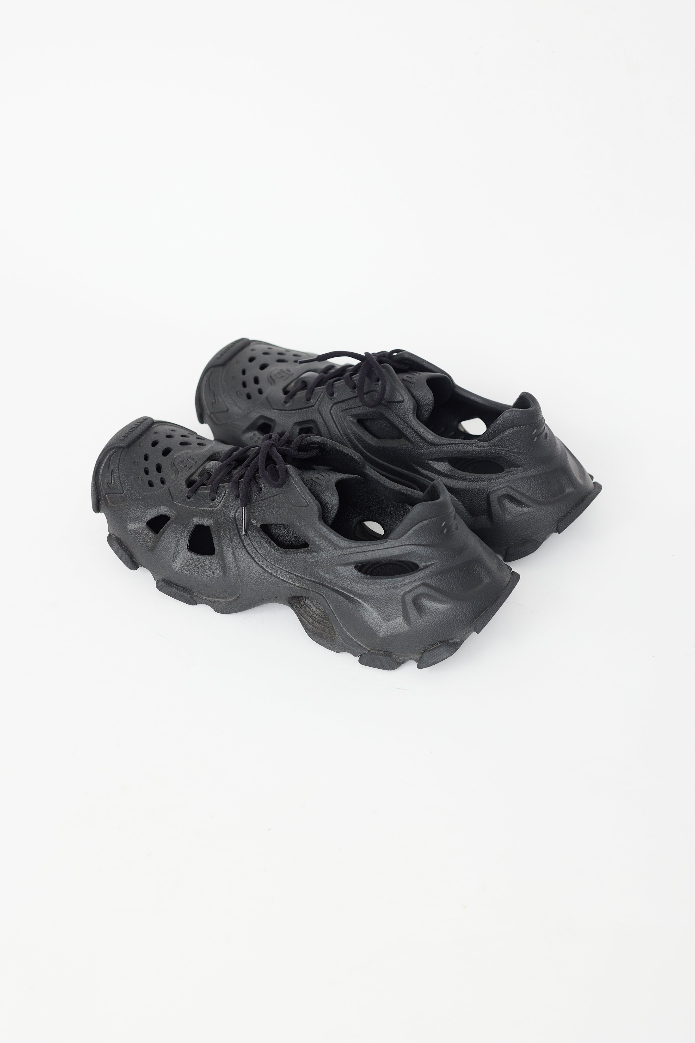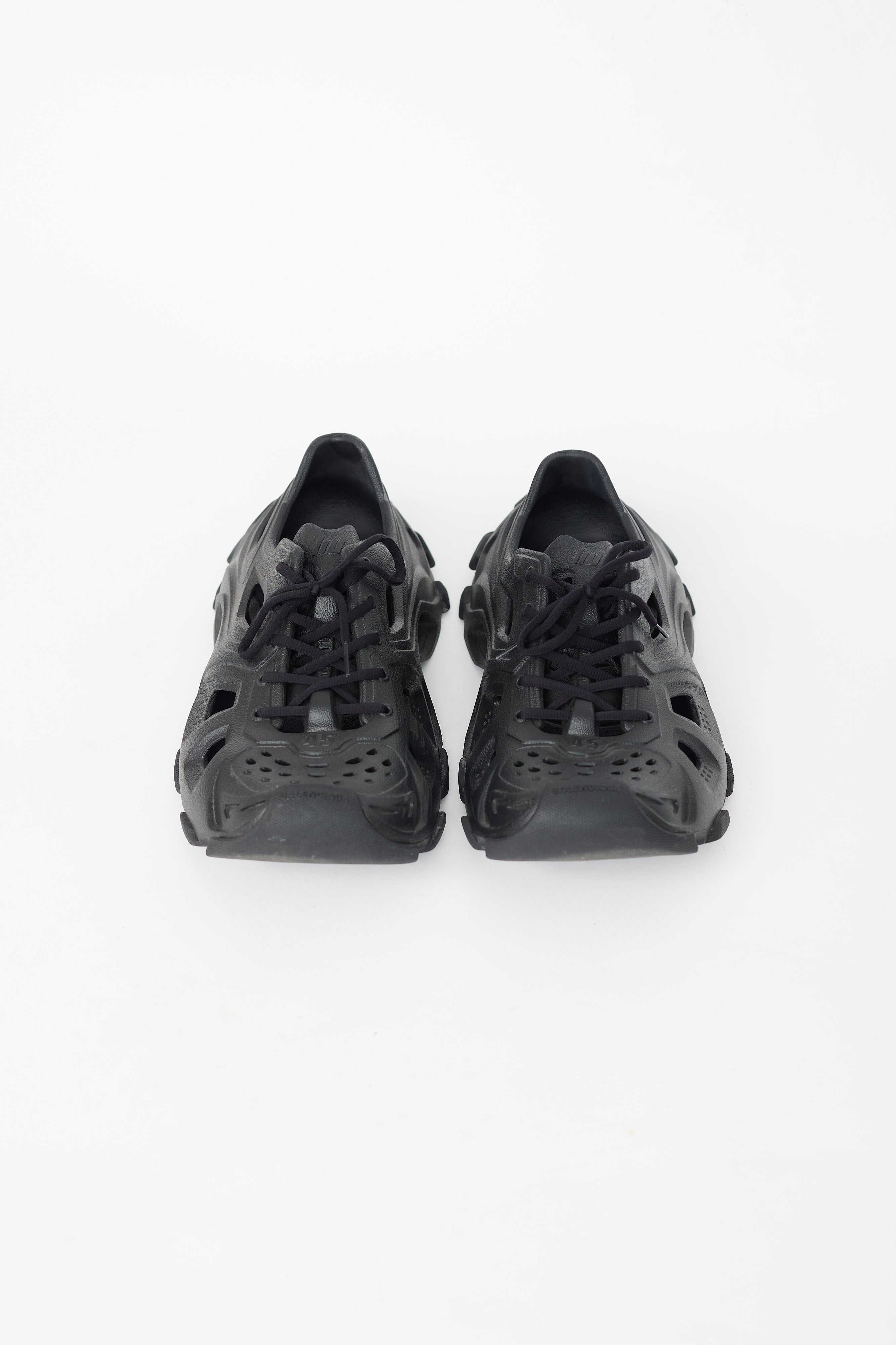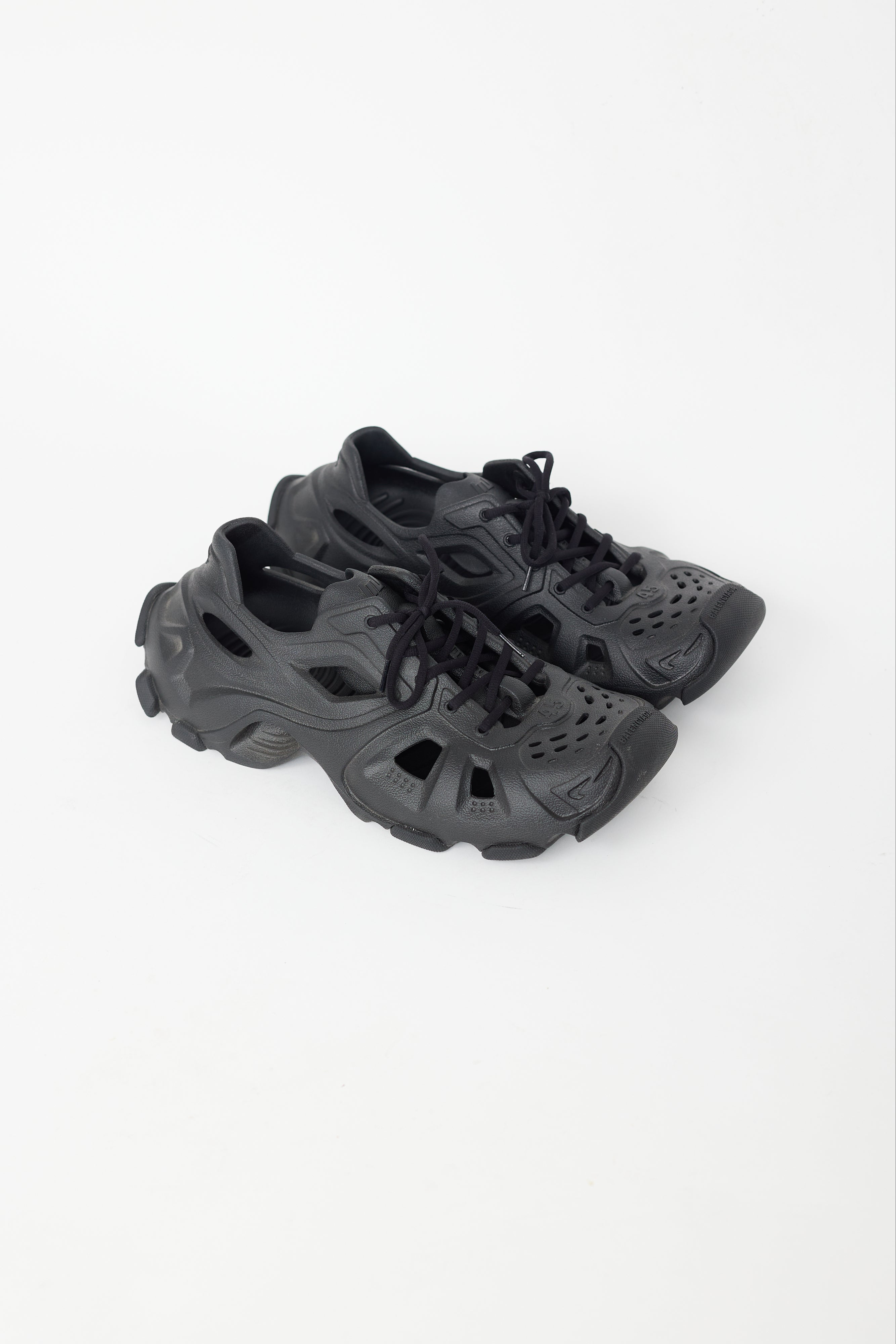 Pre-owned Balenciaga HD sneakers featuring black foam throughout upper, insole and outsole, lace up vamp, cut outs throughout and logo at toe. Comes with original box.