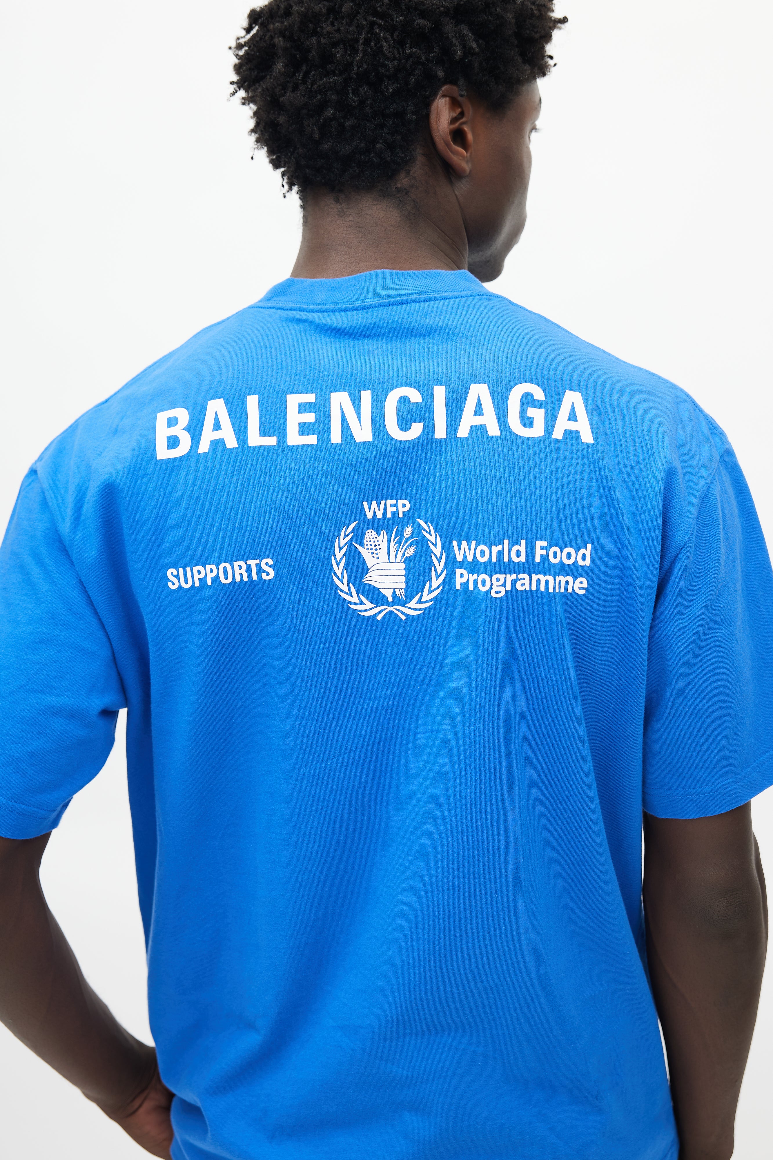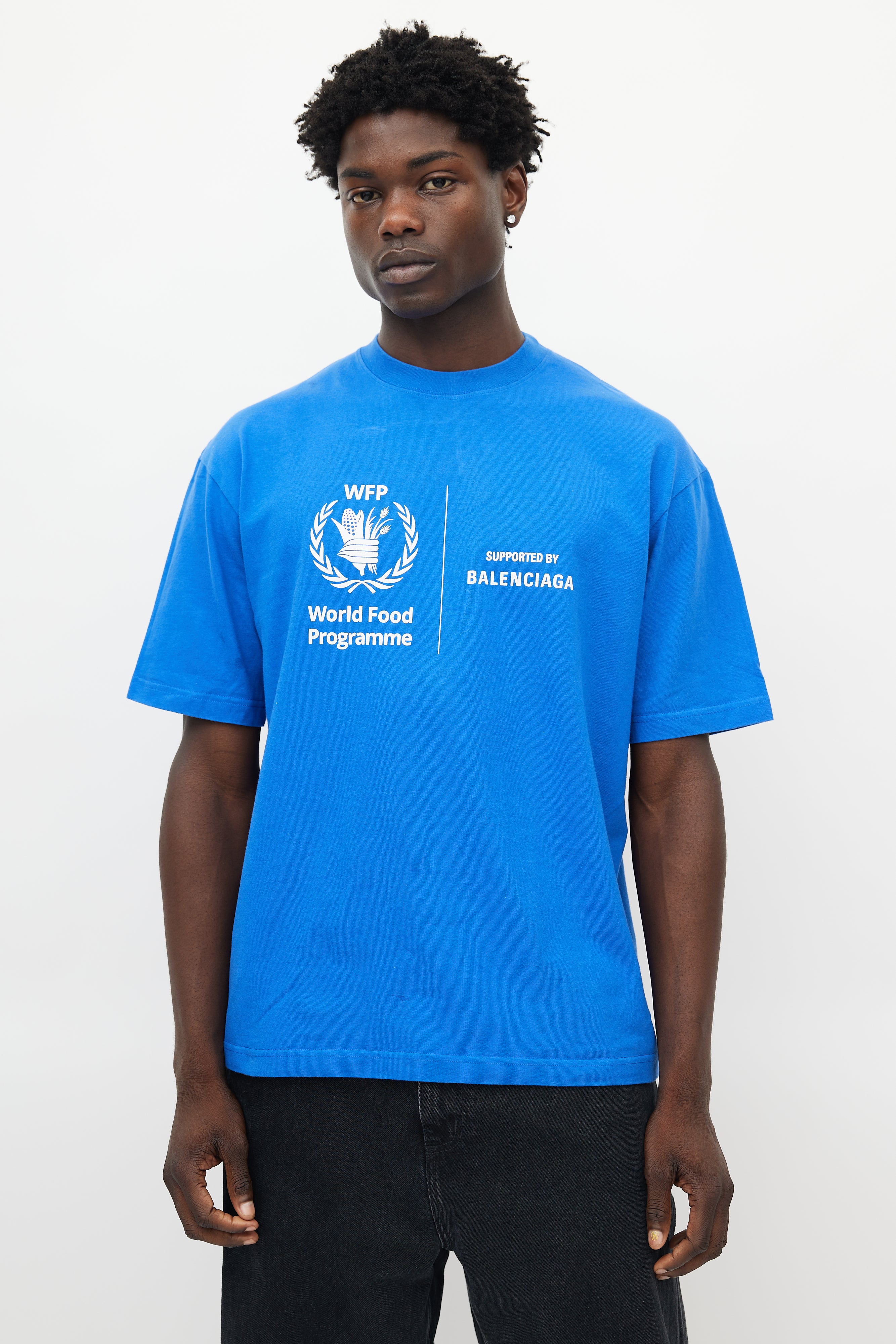 Pre-owned Balenciaga blue T-shirt featuring a white World Food Programme logo at front and back, crew neckline, and short sleeves.