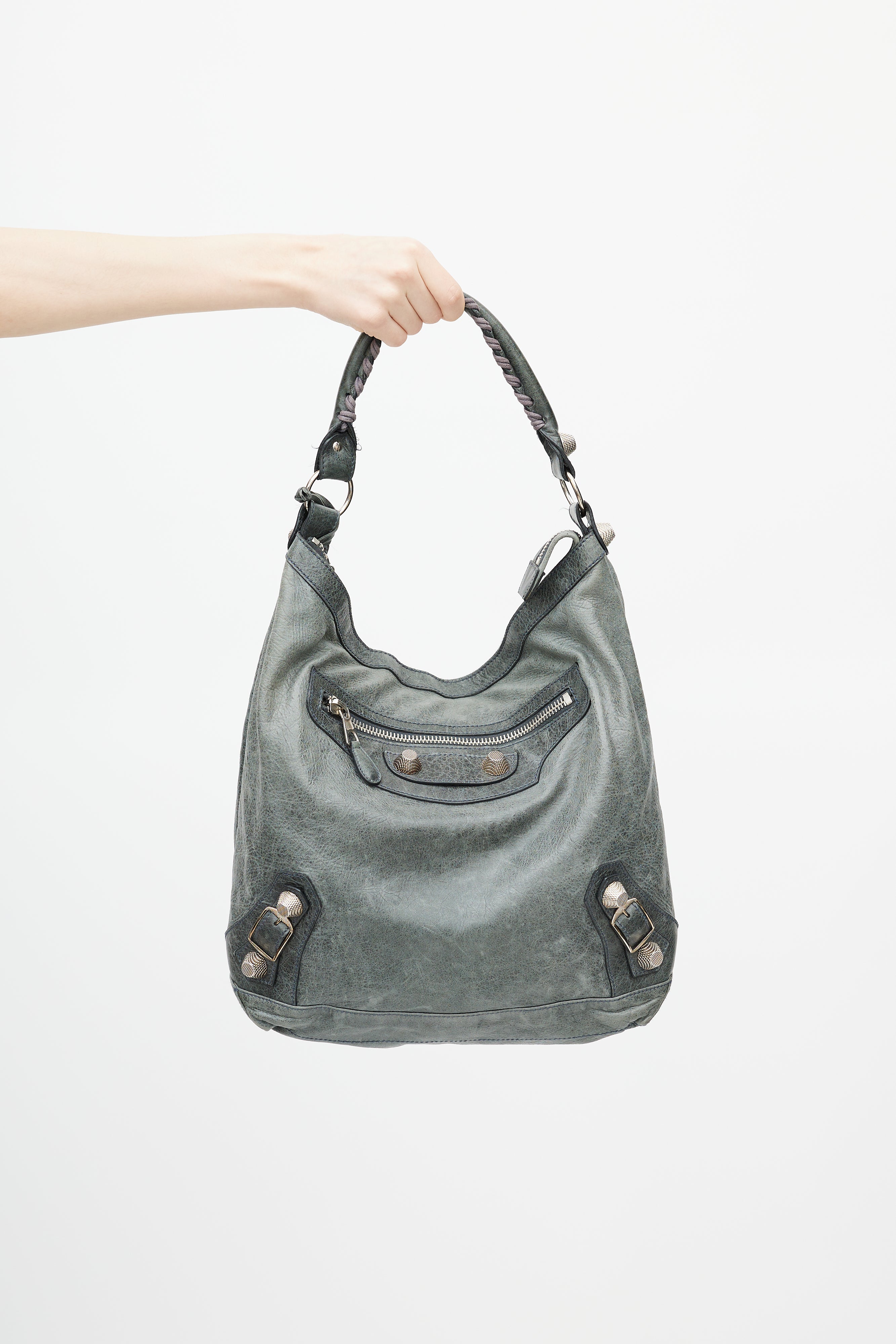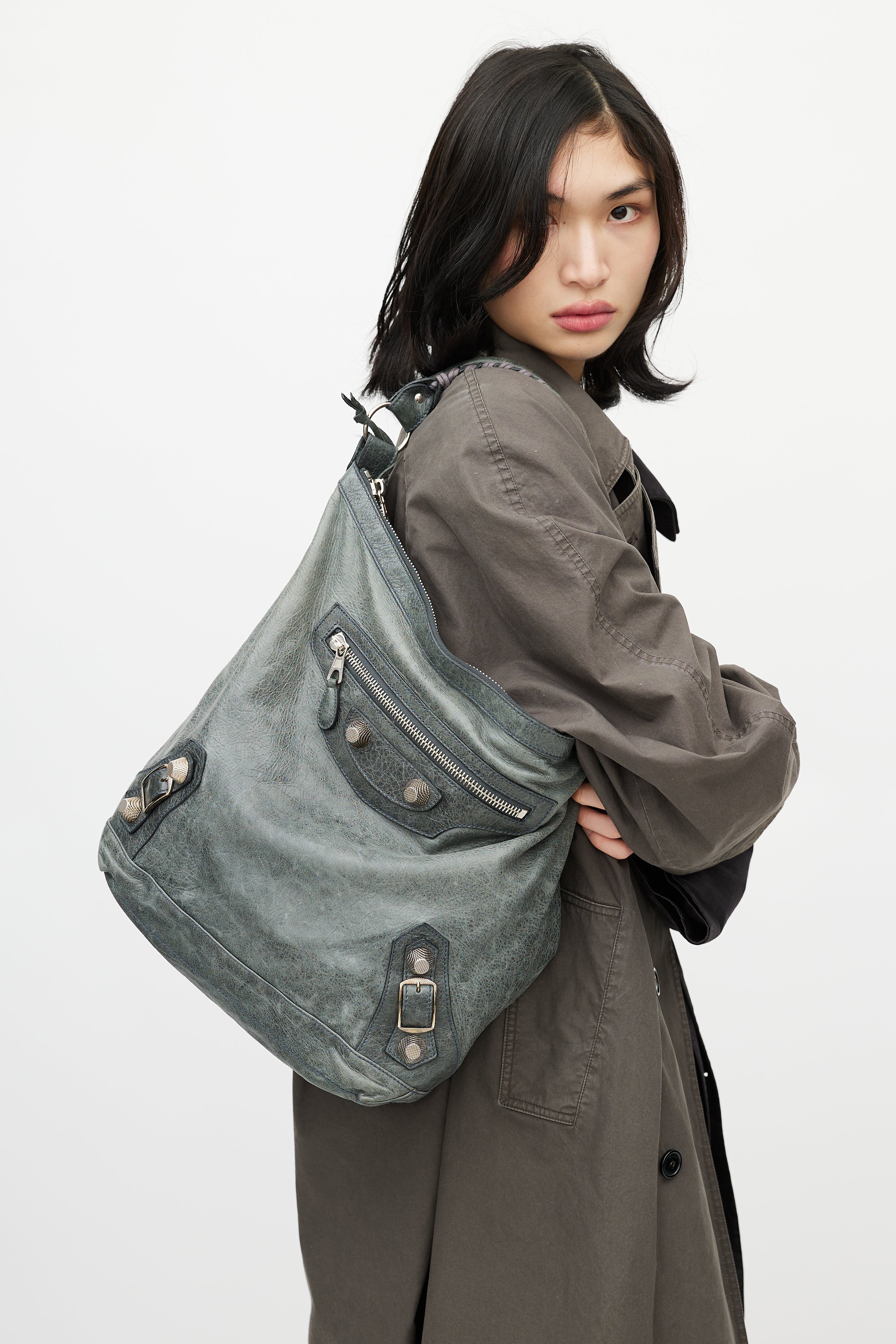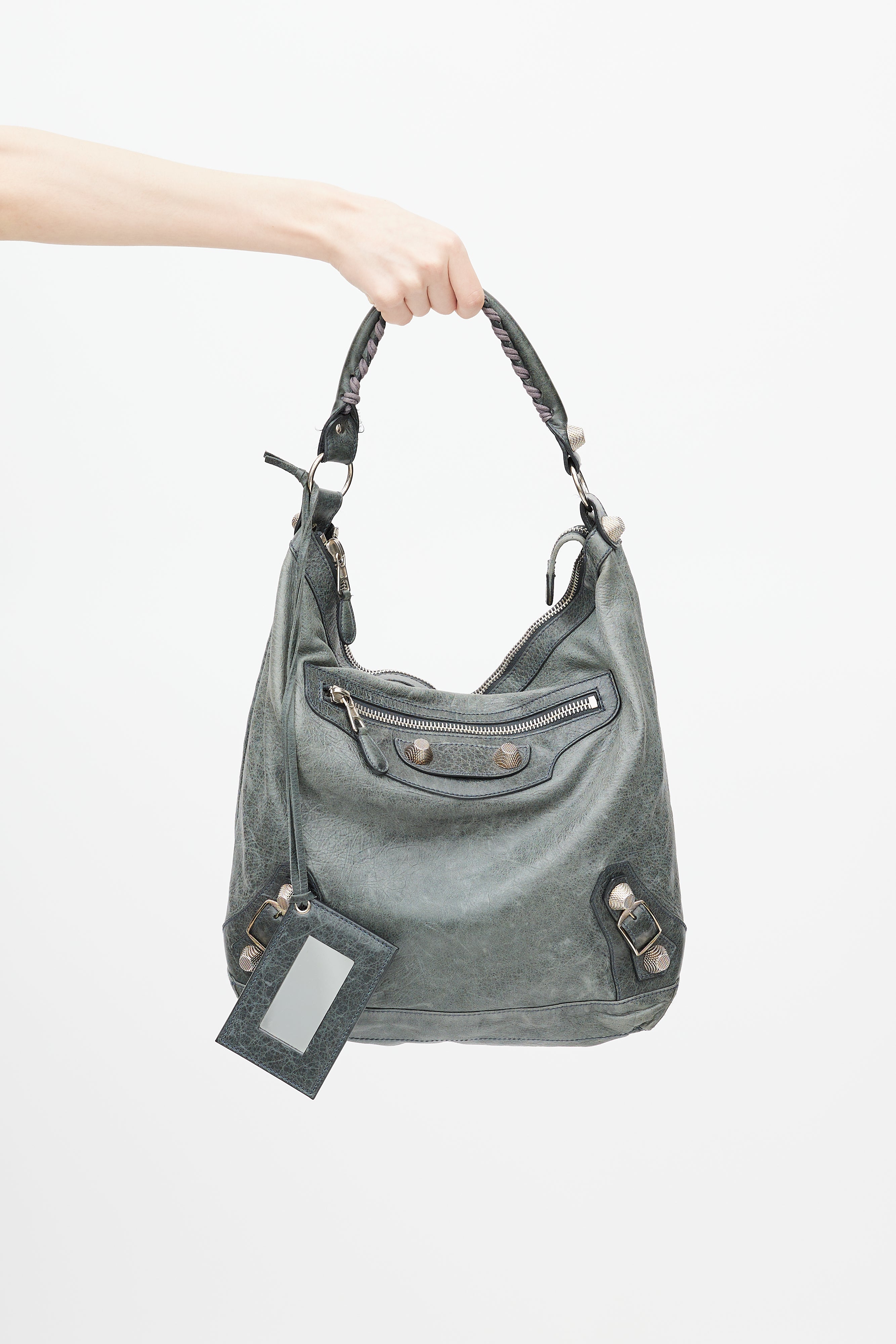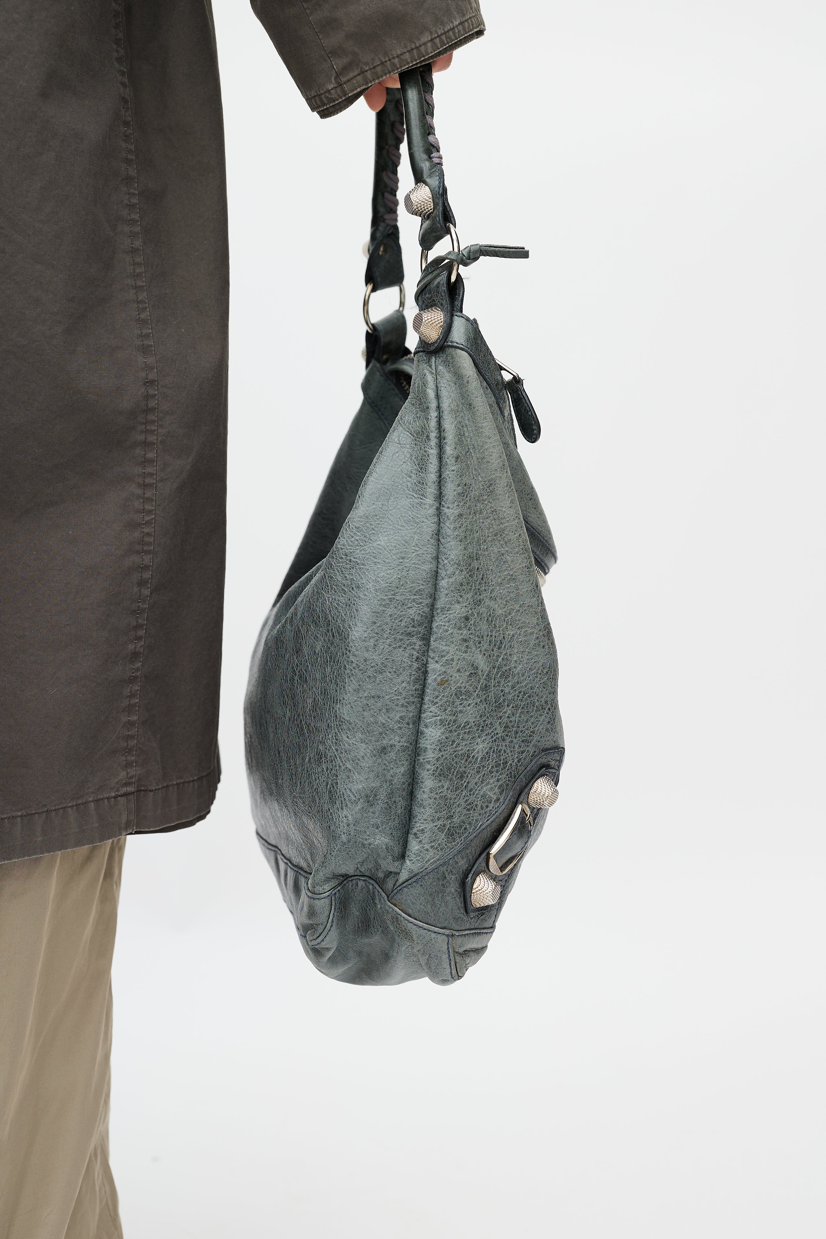 Pre-owned Balenciaga grey Giant Day tote bag featuring crinkled leather, signature silver tone City studs embellishment, zip pocket at front, rolled top handle with braided trim, detachable pocket mirror, zip closure at top, canvas lining, and slip pocket inside. Comes with original dust bag.
