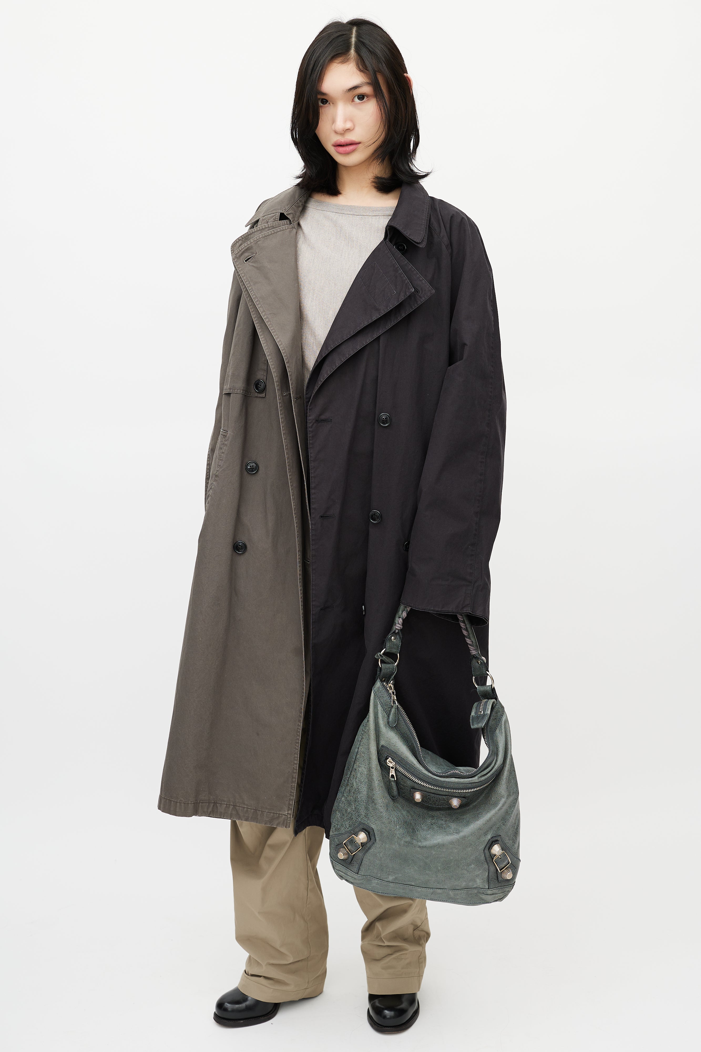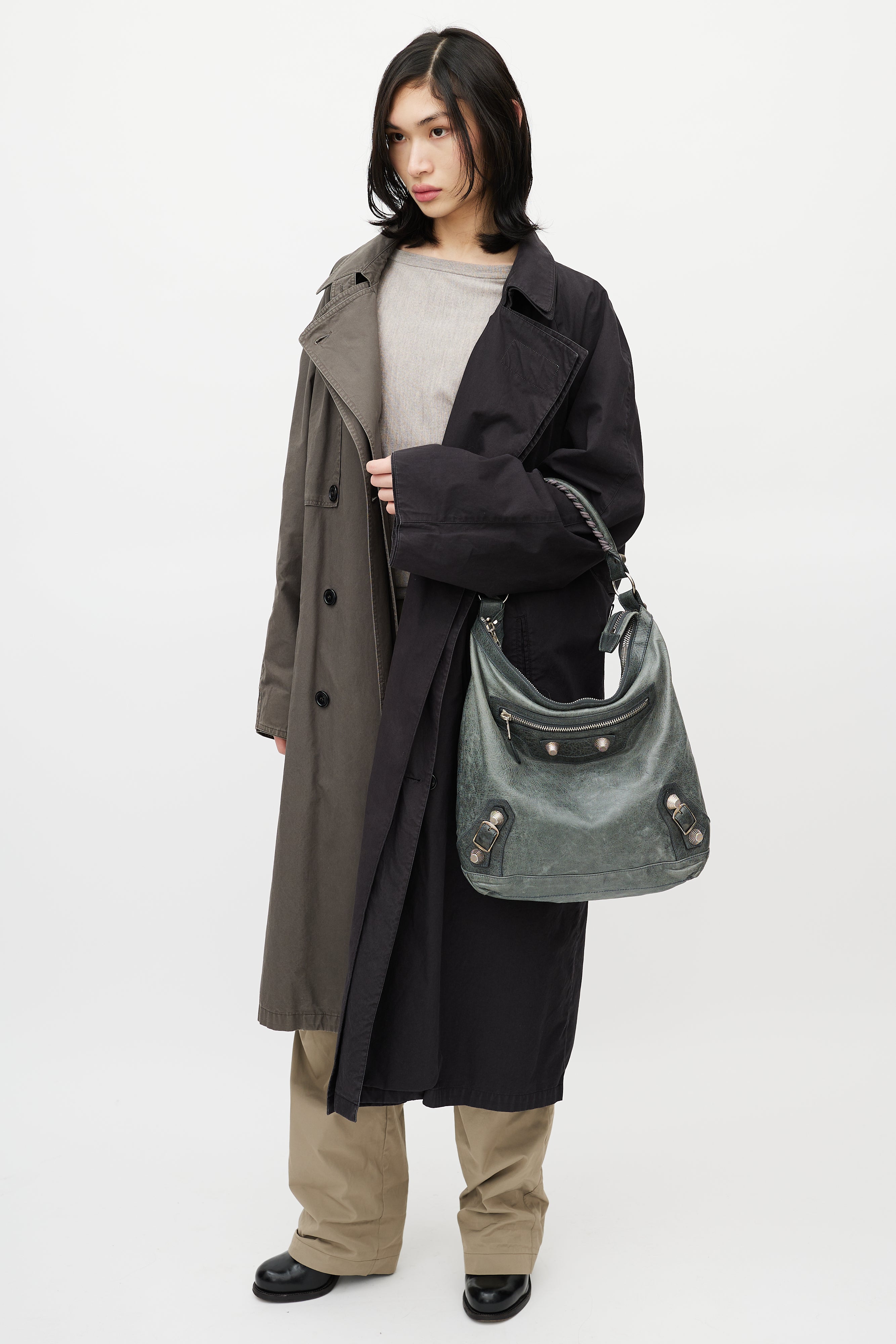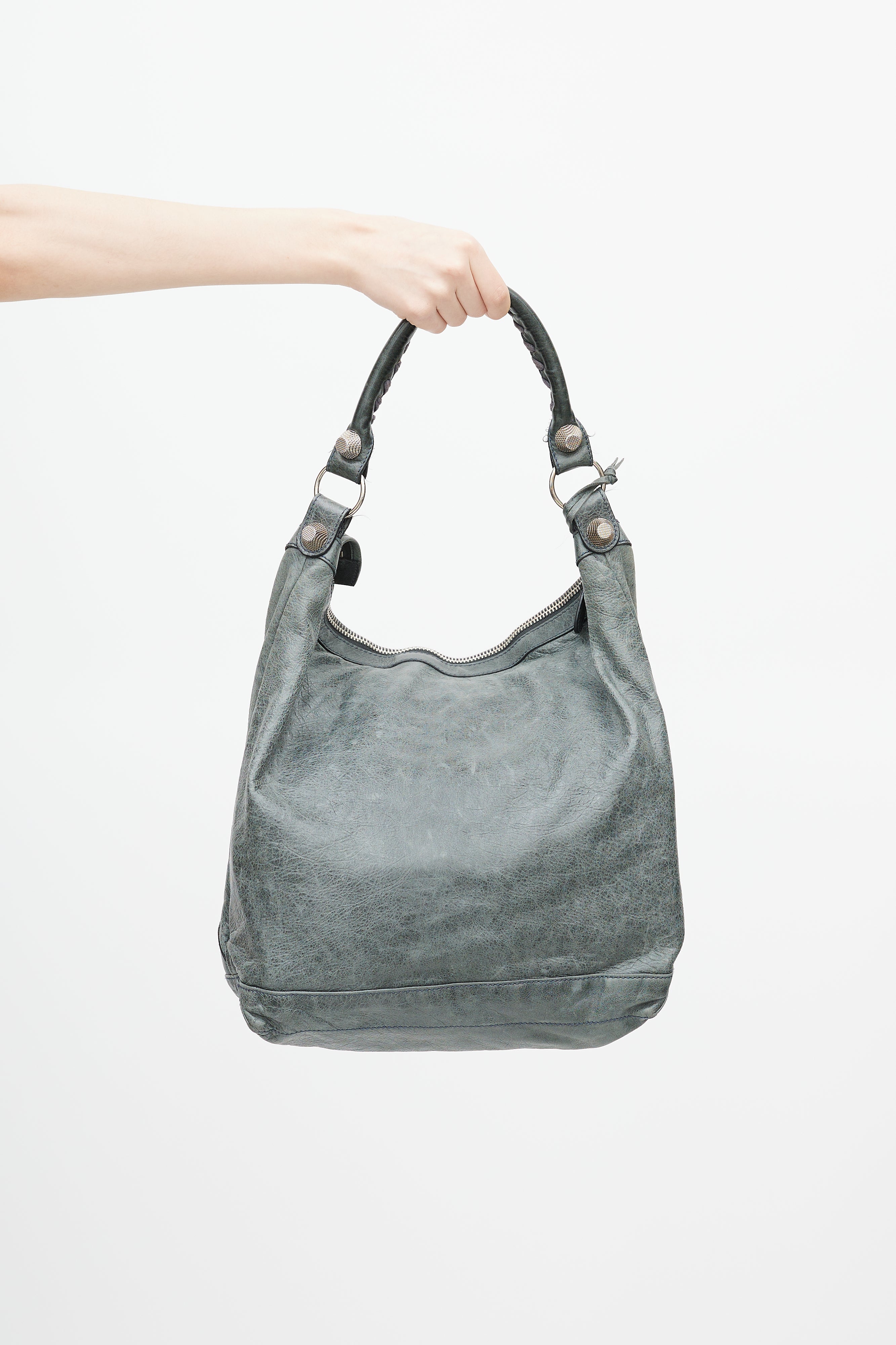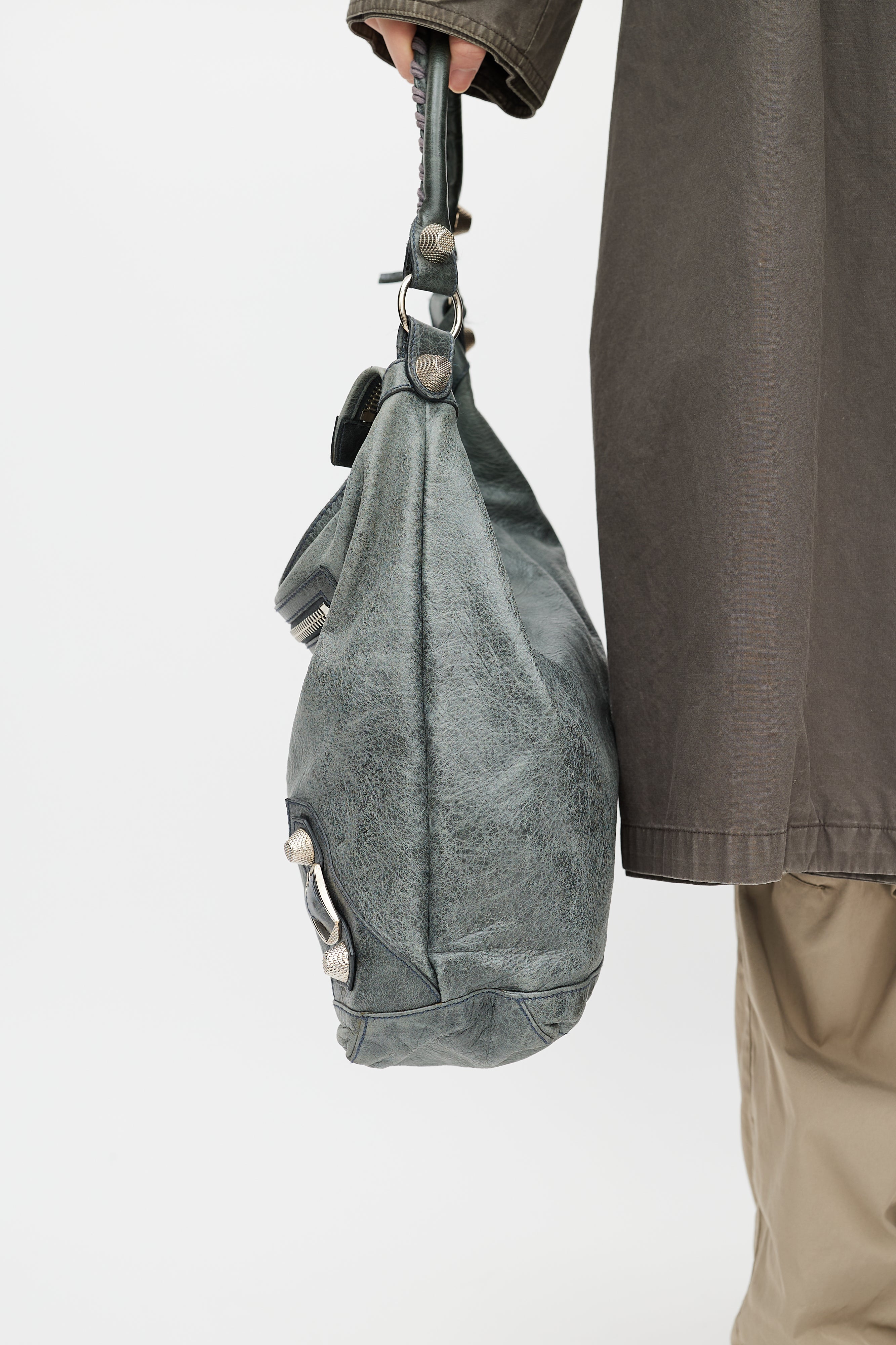 Pre-owned Balenciaga grey Giant Day tote bag featuring crinkled leather, signature silver tone City studs embellishment, zip pocket at front, rolled top handle with braided trim, detachable pocket mirror, zip closure at top, canvas lining, and slip pocket inside. Comes with original dust bag.