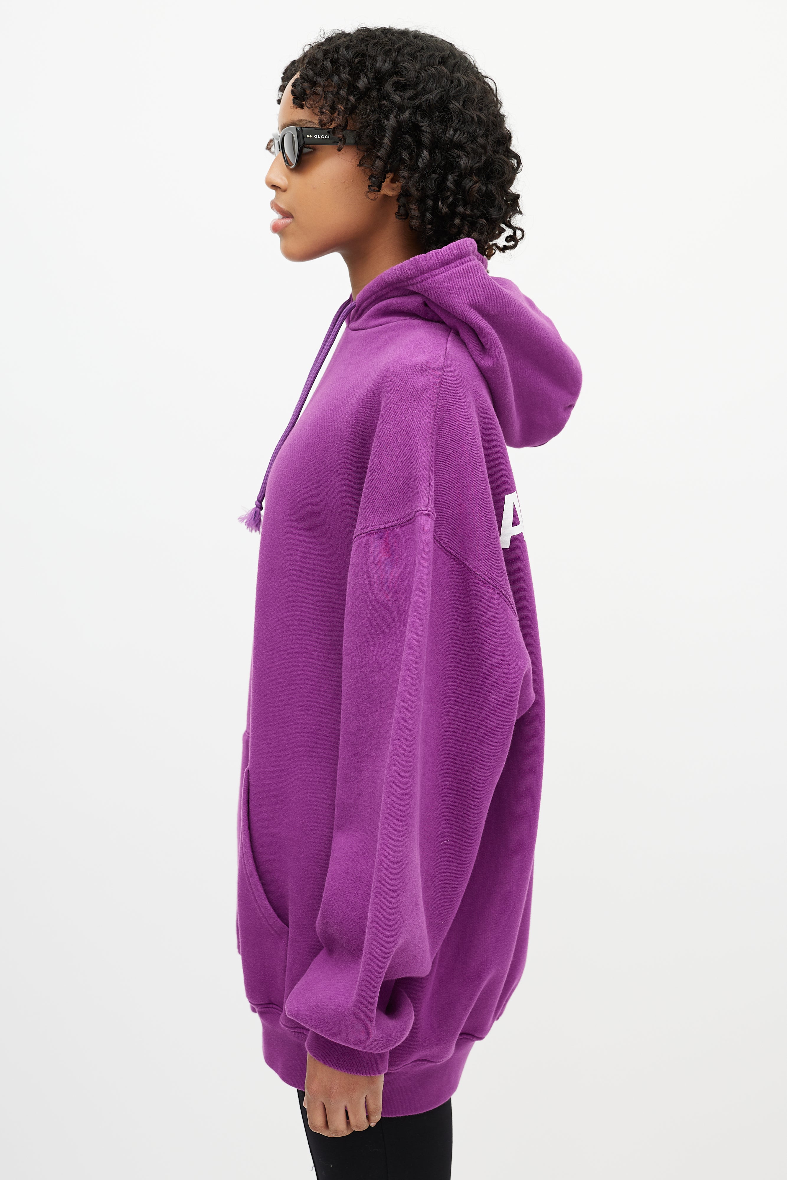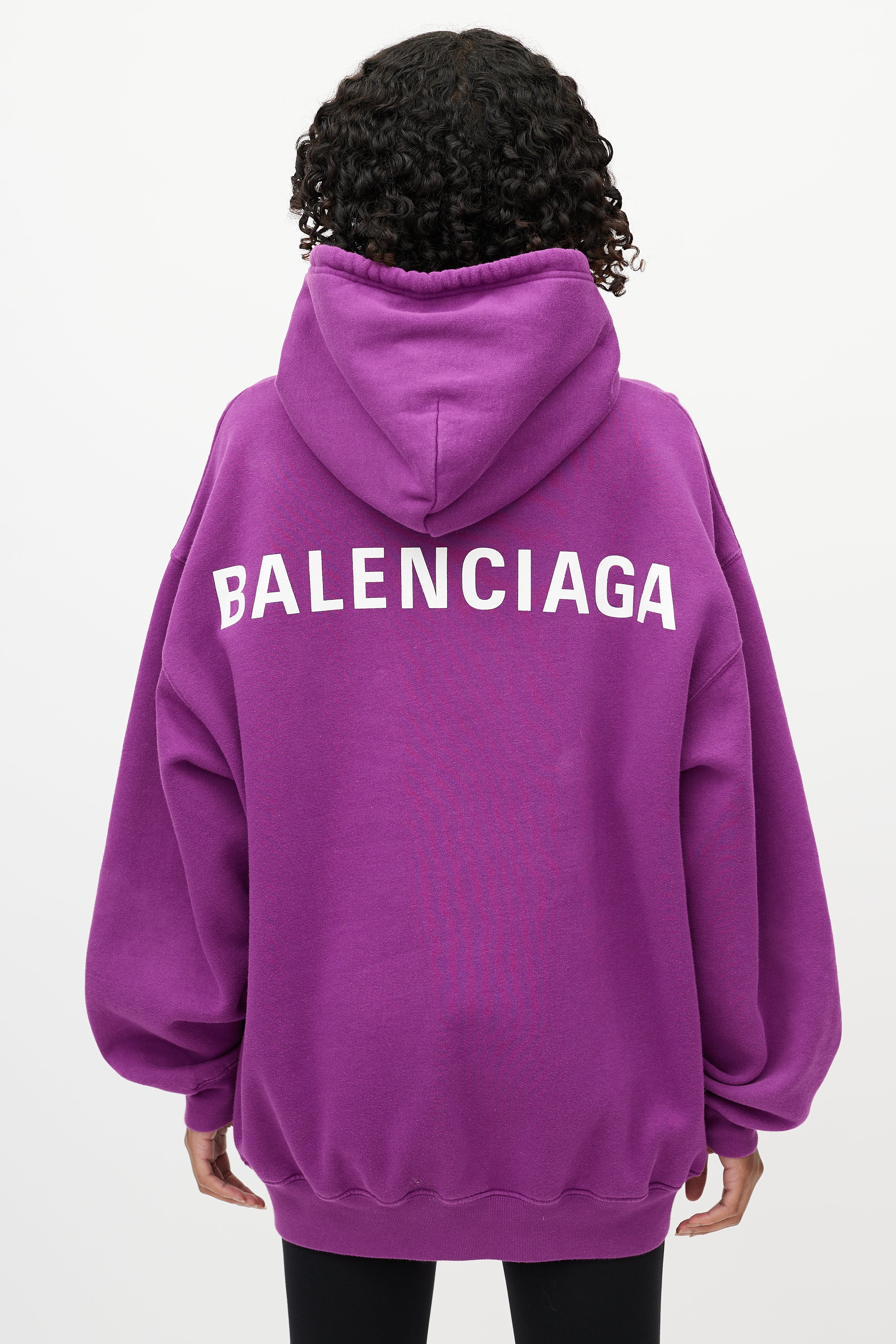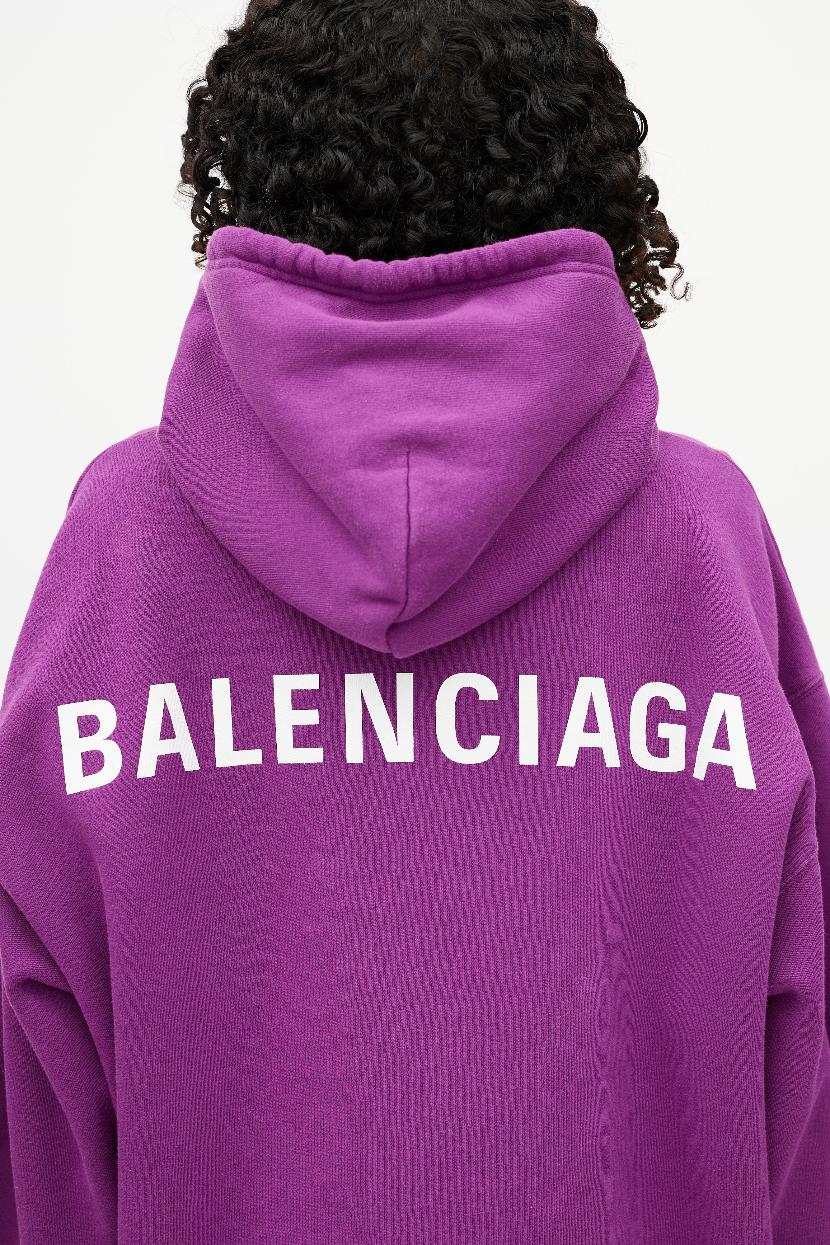 Pre-owned Balenciaga purple hoodie featuring woven drawstring at hood, logo text at upper back, ribbed cuffs and hem and kangaroo pocket at waist.