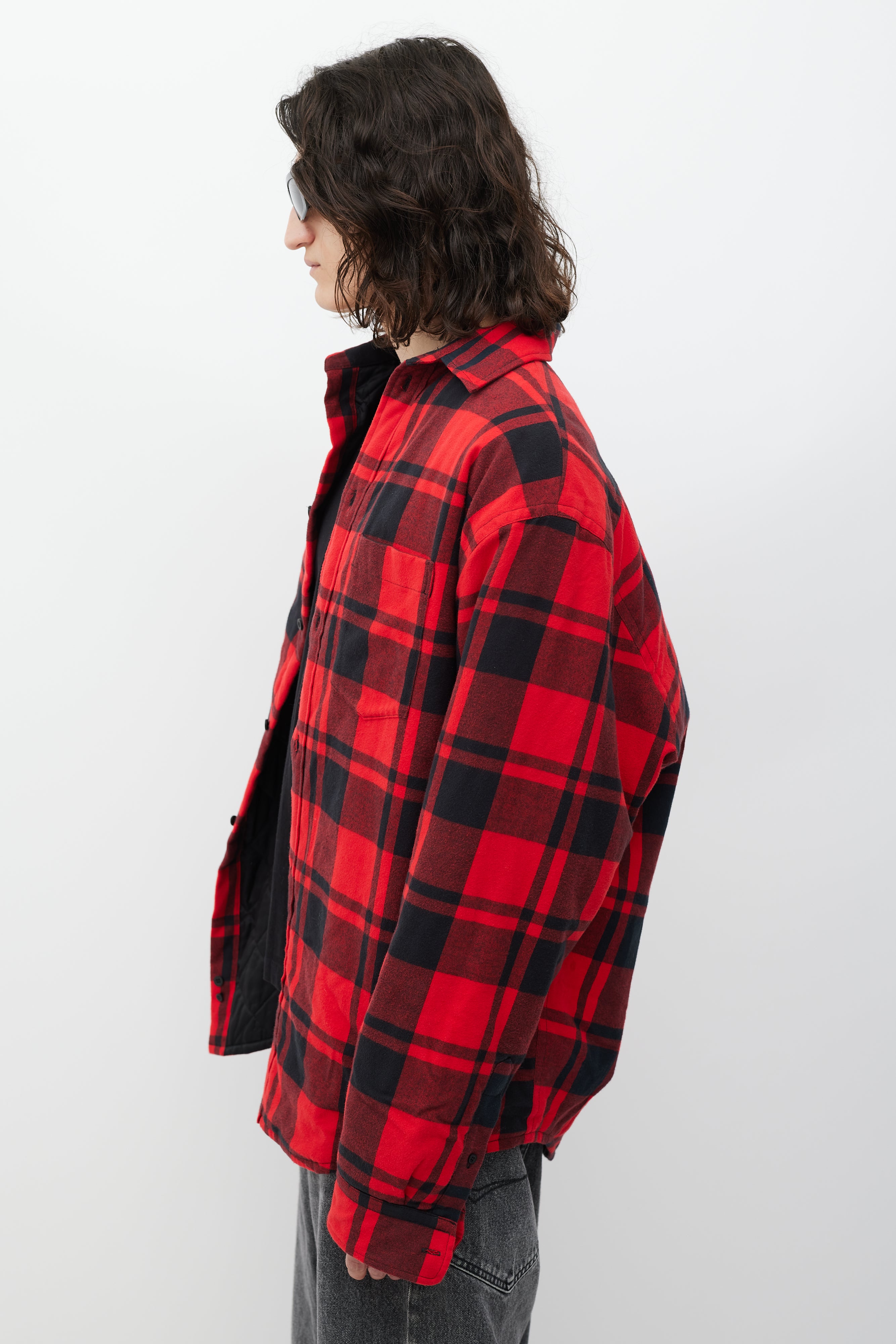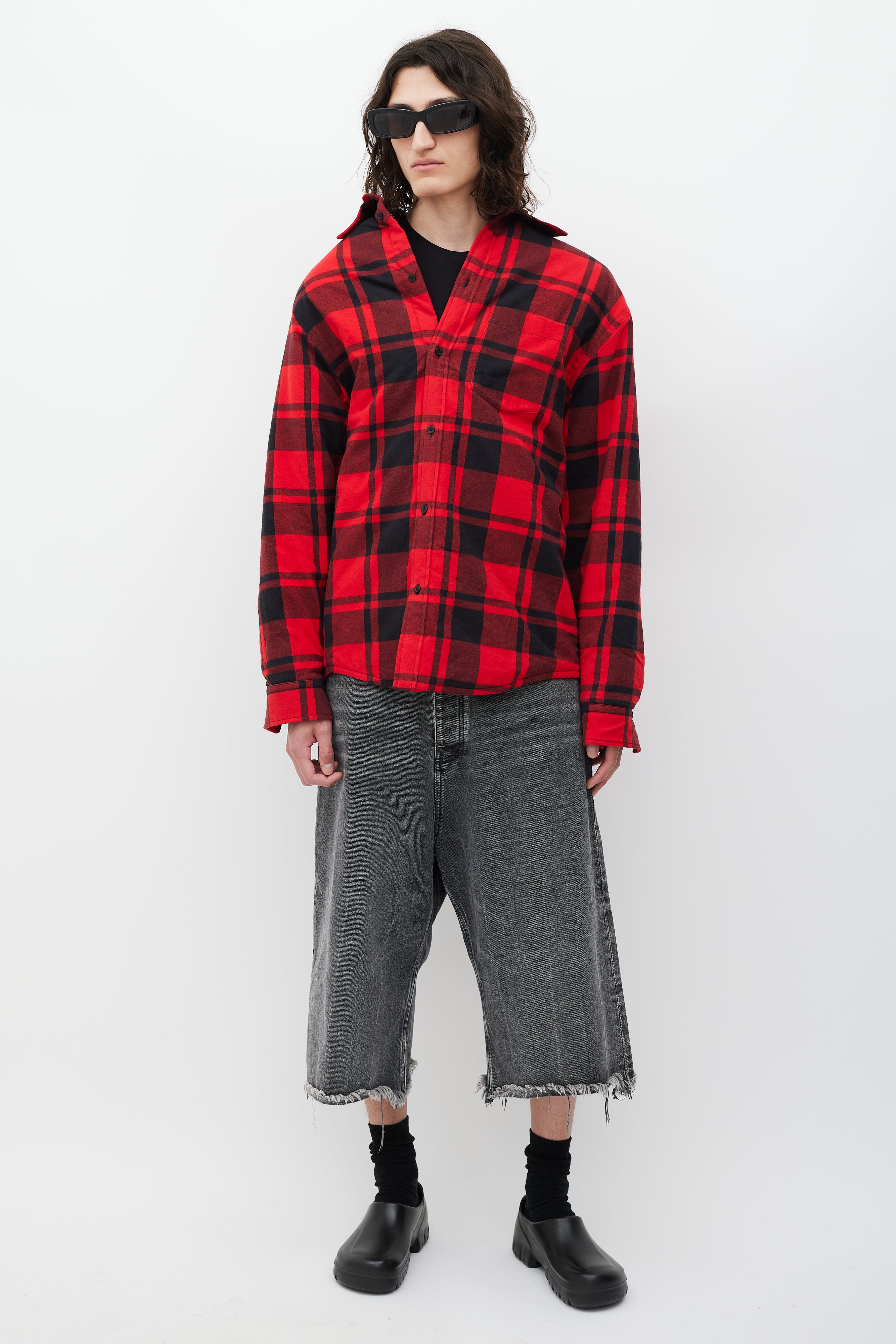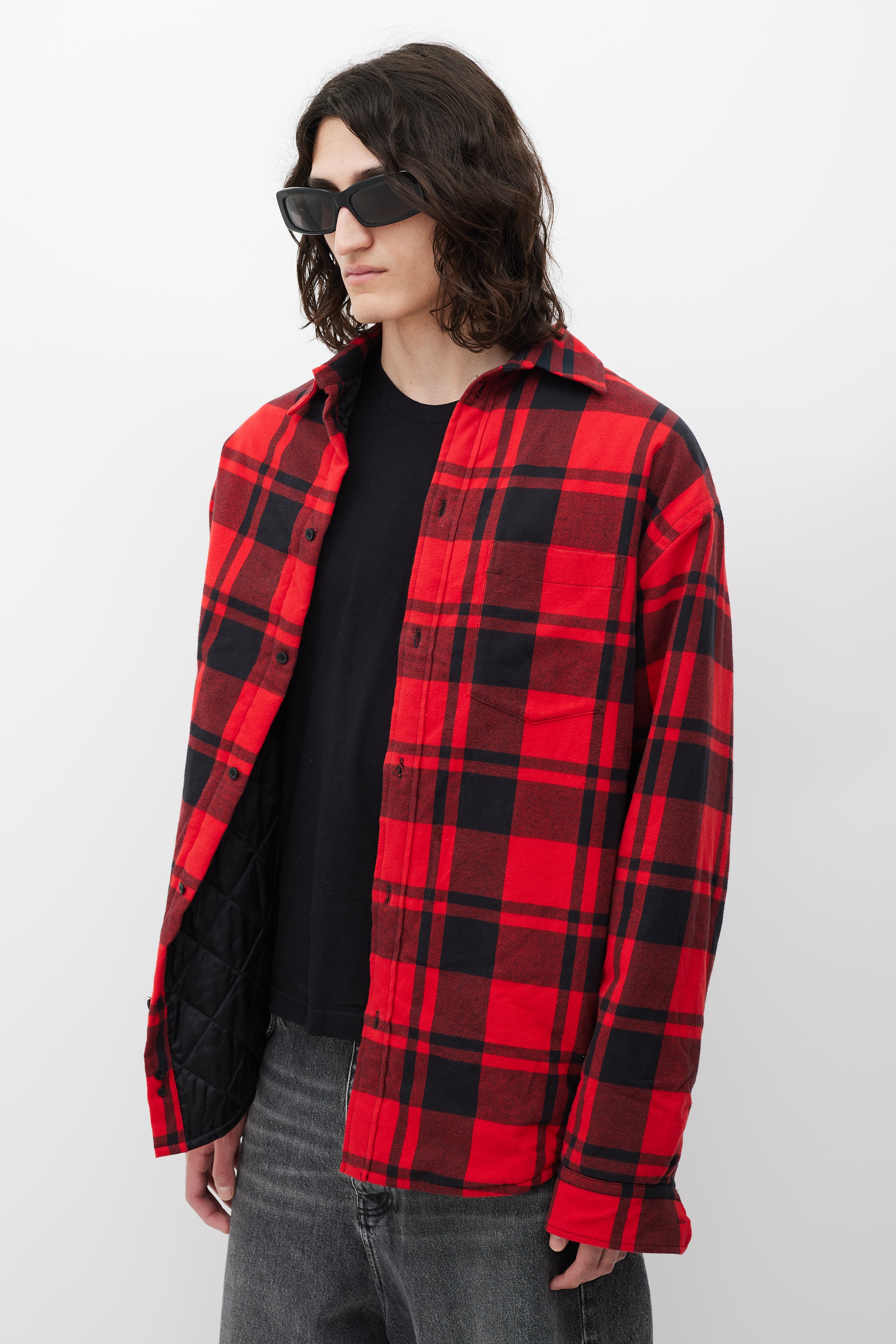 Pre-owned Balenciaga red padded jacket featuring a black plaid pattern throughout, pointed collar, long sleeves, one slip pocket at chest, asymmetrical styling, quilted lining, and button up closure. Lined.