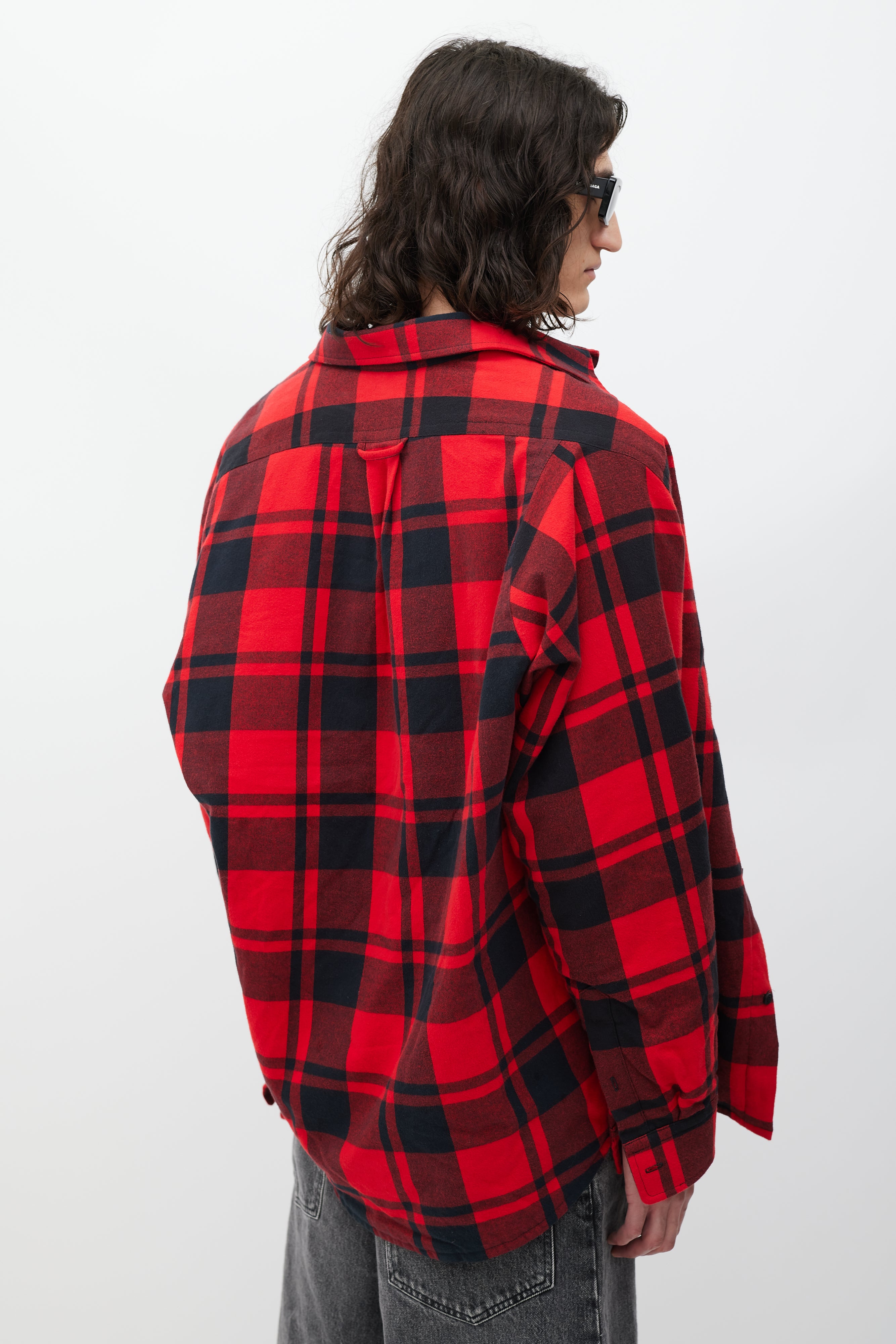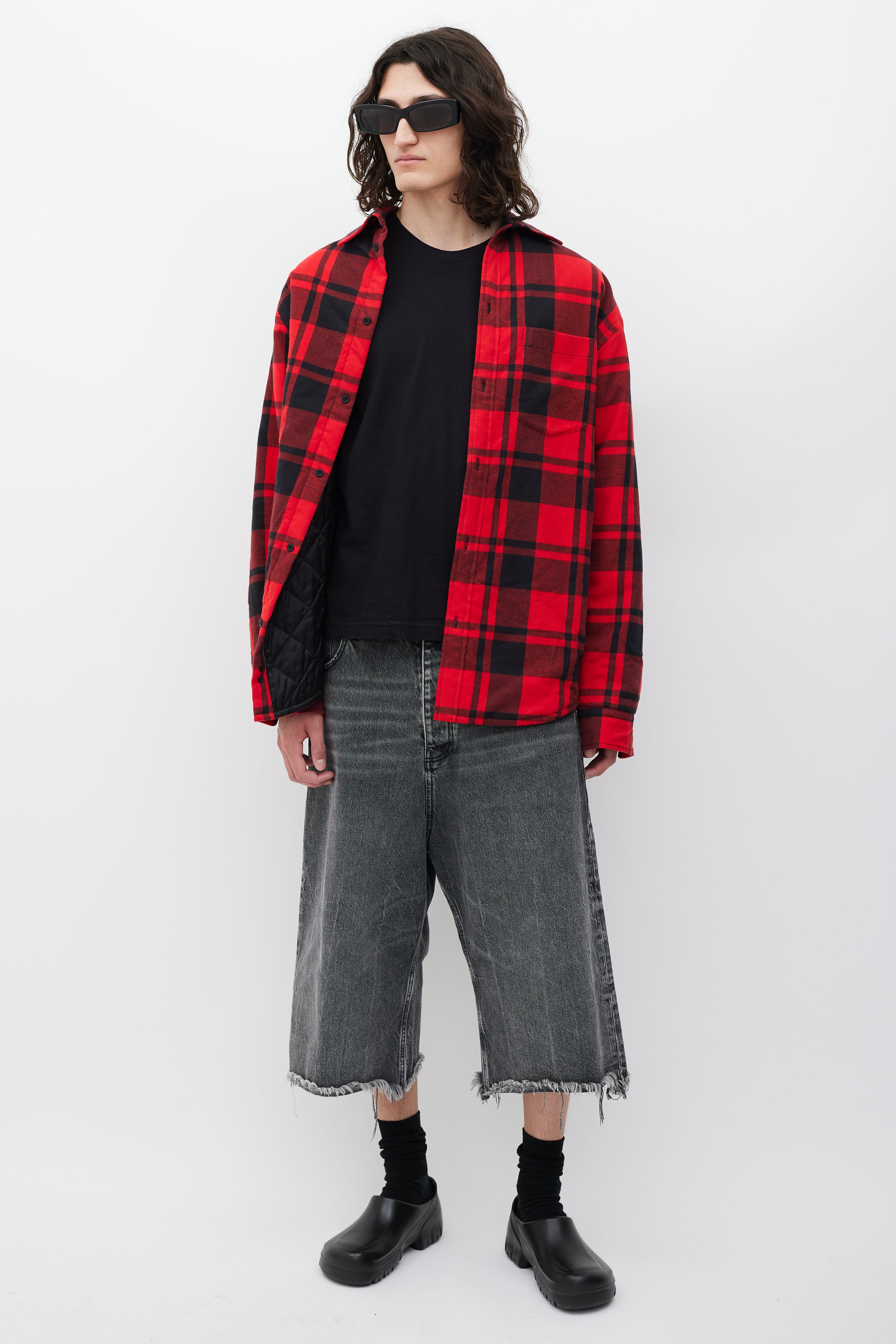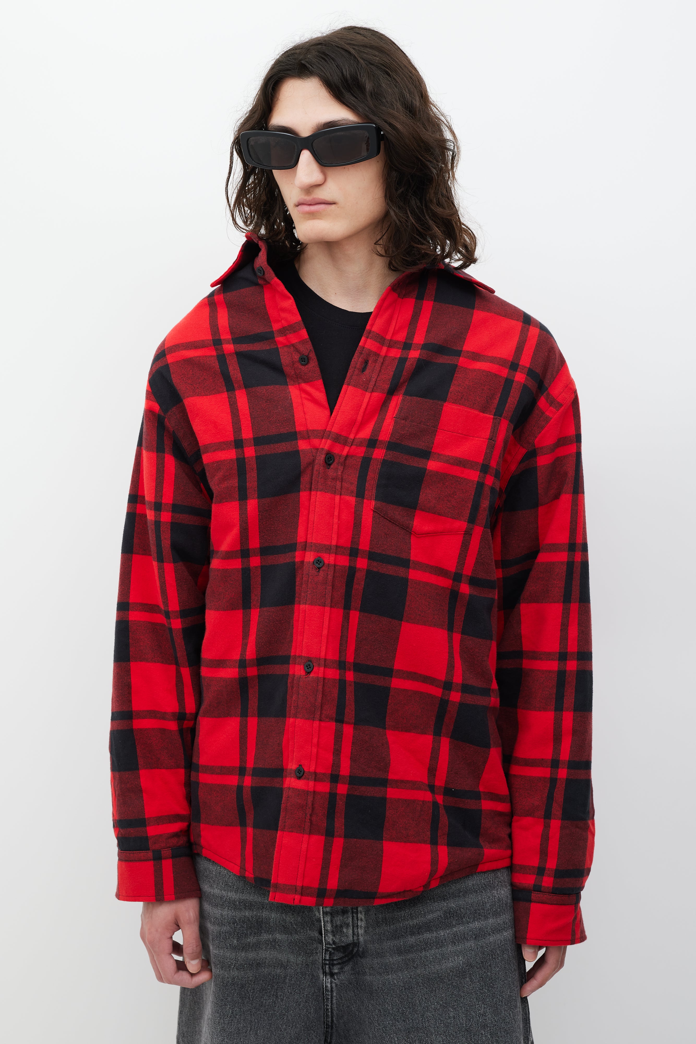 Pre-owned Balenciaga red padded jacket featuring a black plaid pattern throughout, pointed collar, long sleeves, one slip pocket at chest, asymmetrical styling, quilted lining, and button up closure. Lined.