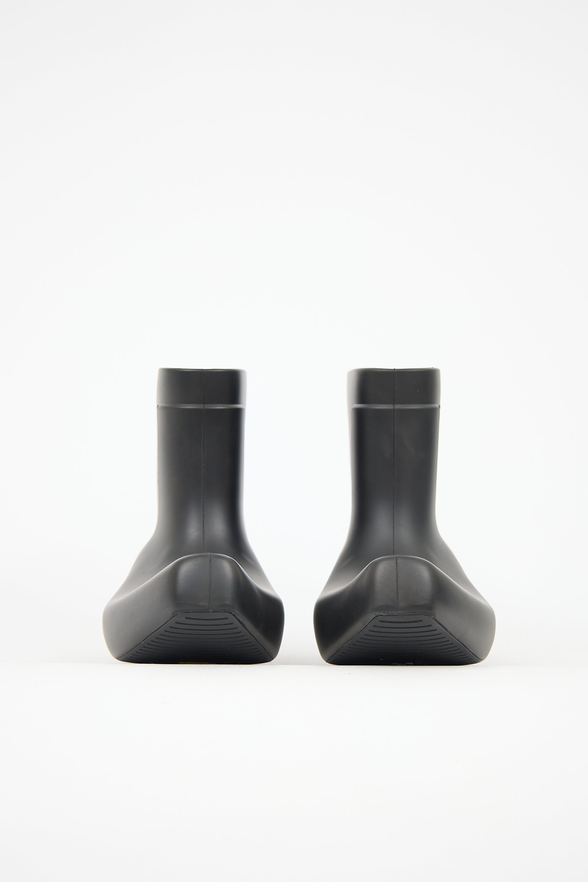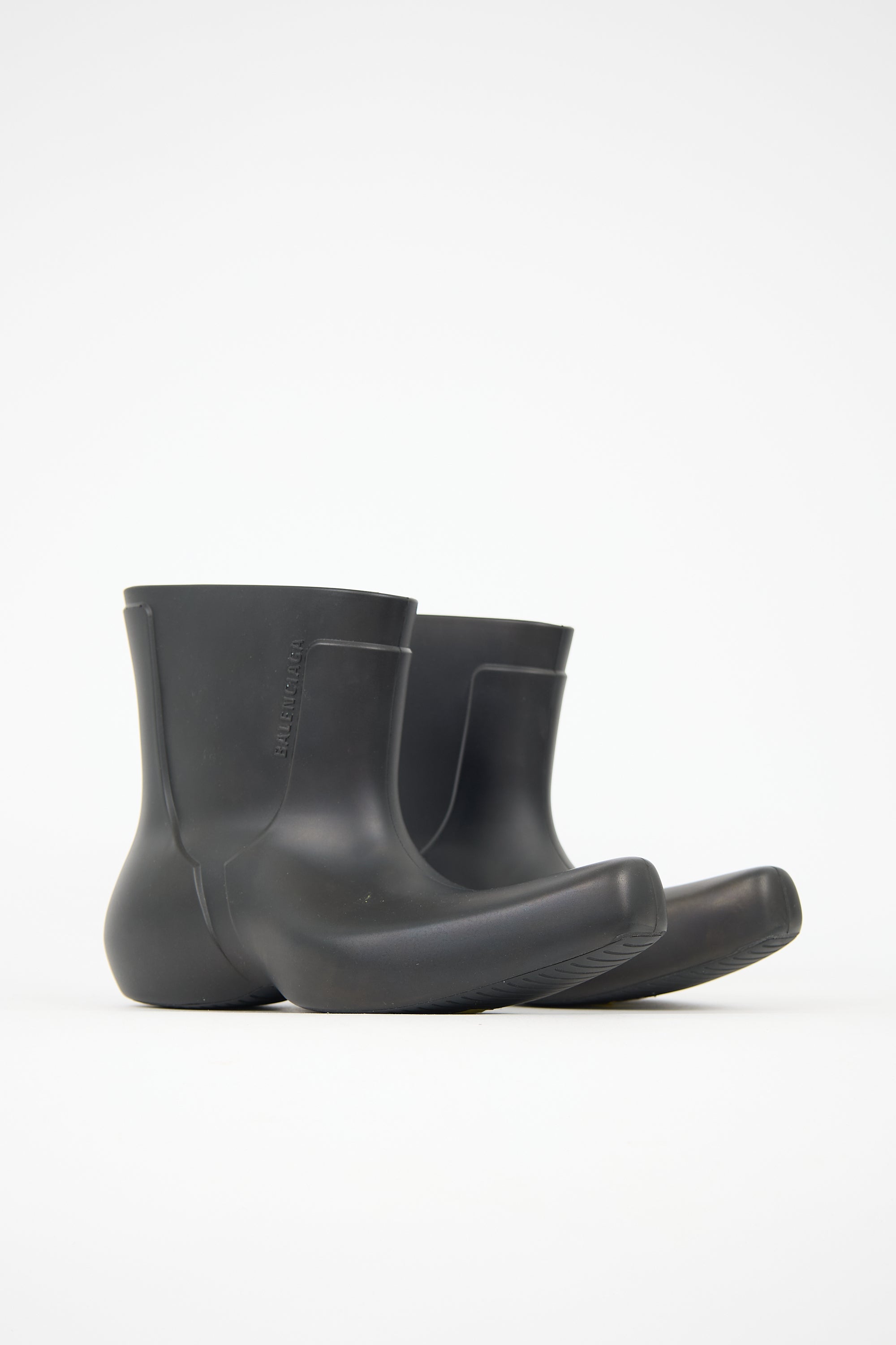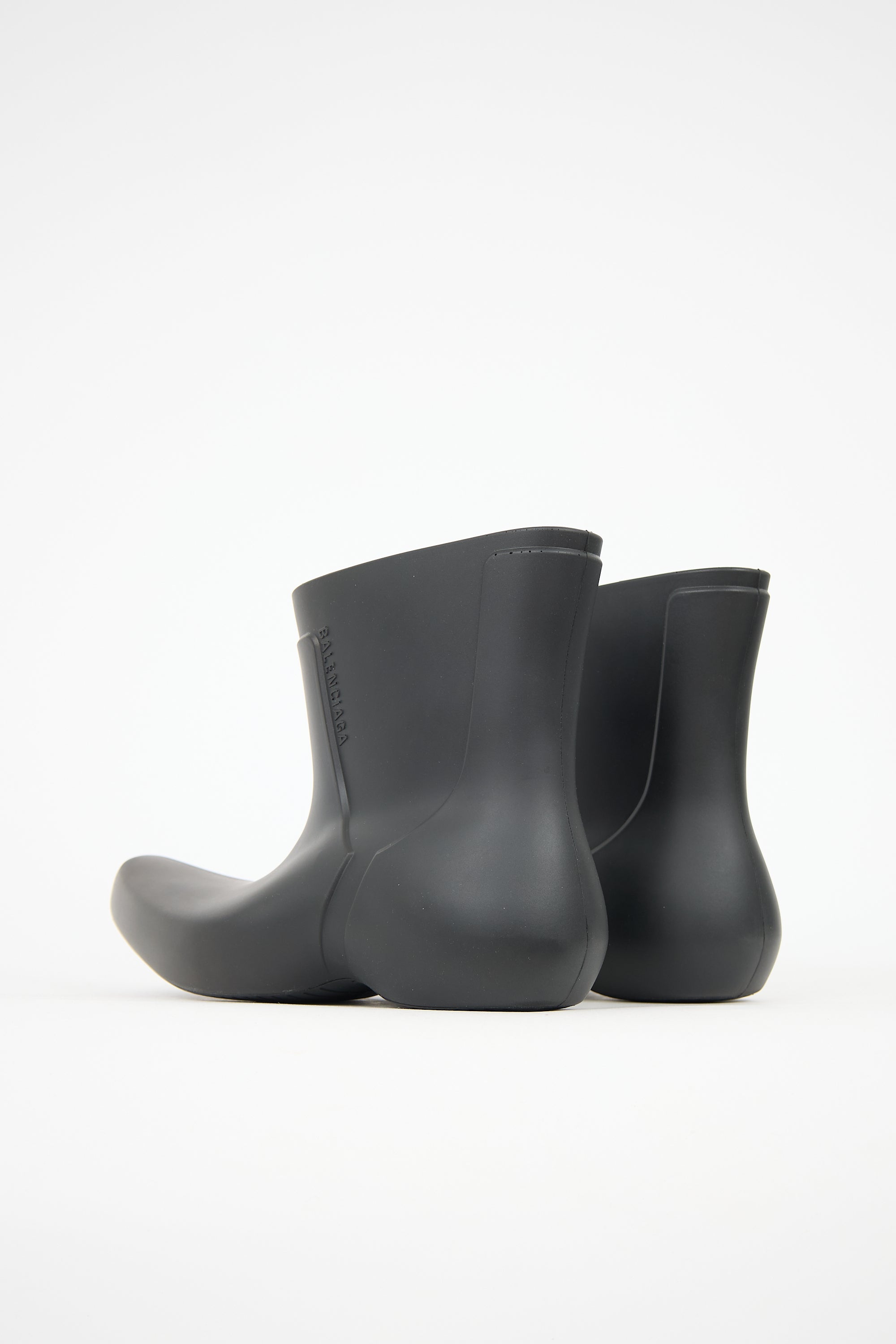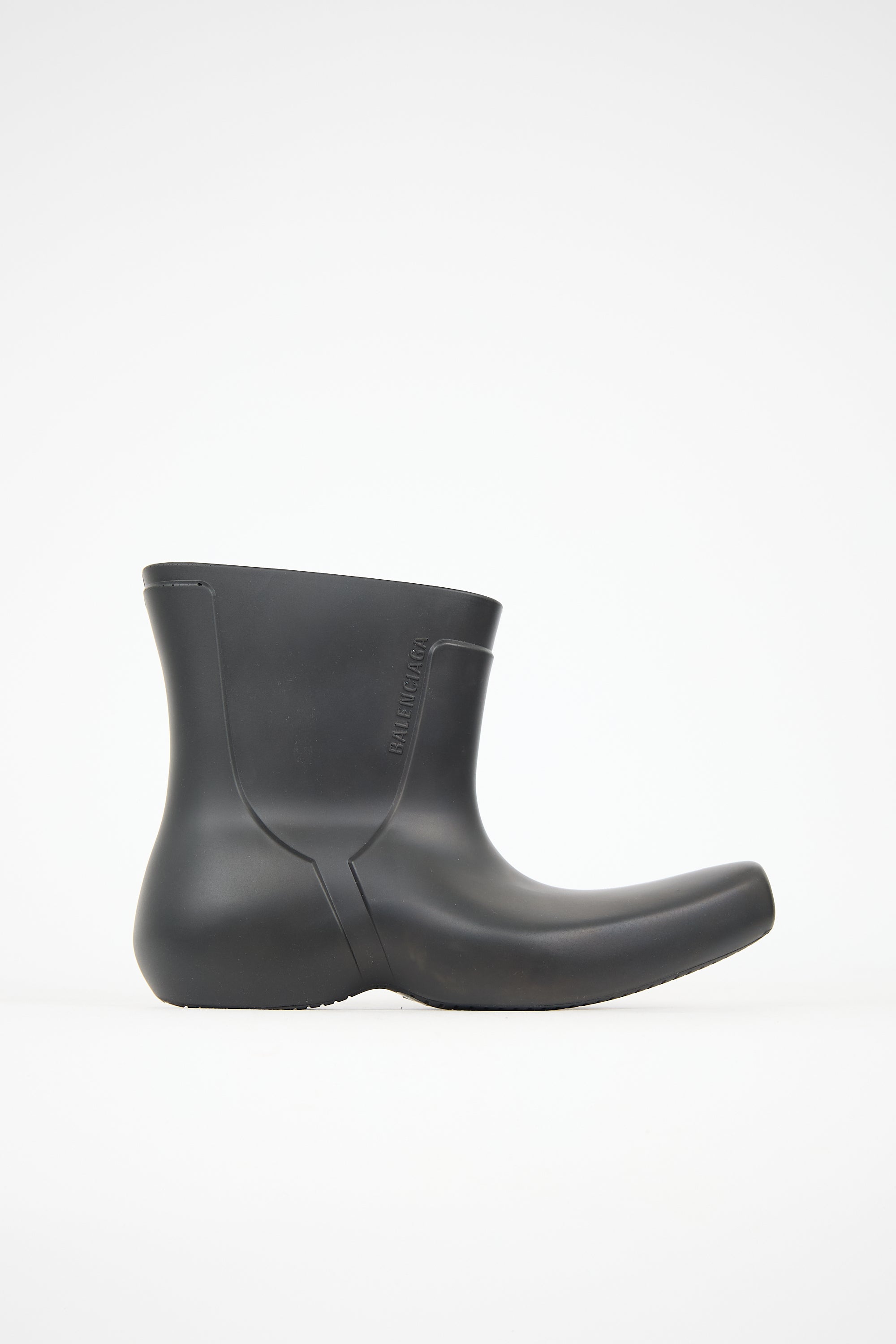 Pre-owned Balenciaga black rubber Excavator boots featuring a curved pointed toe, slip on entry, wide collar, embossed logo at side, and rubber sole. Comes with original box and dust bag.