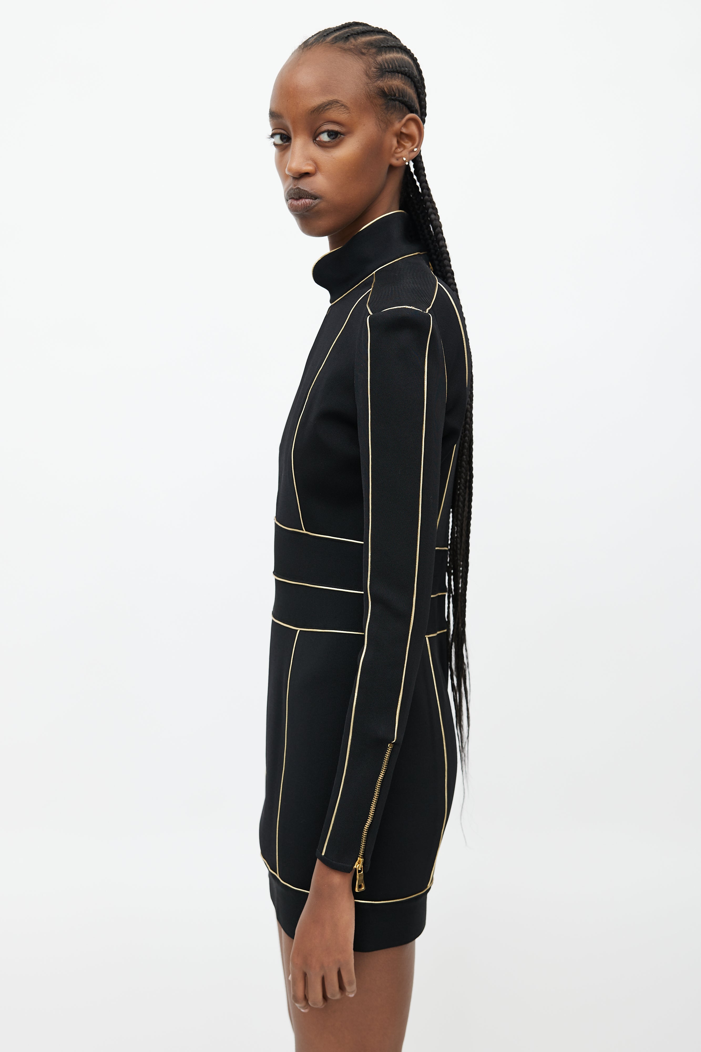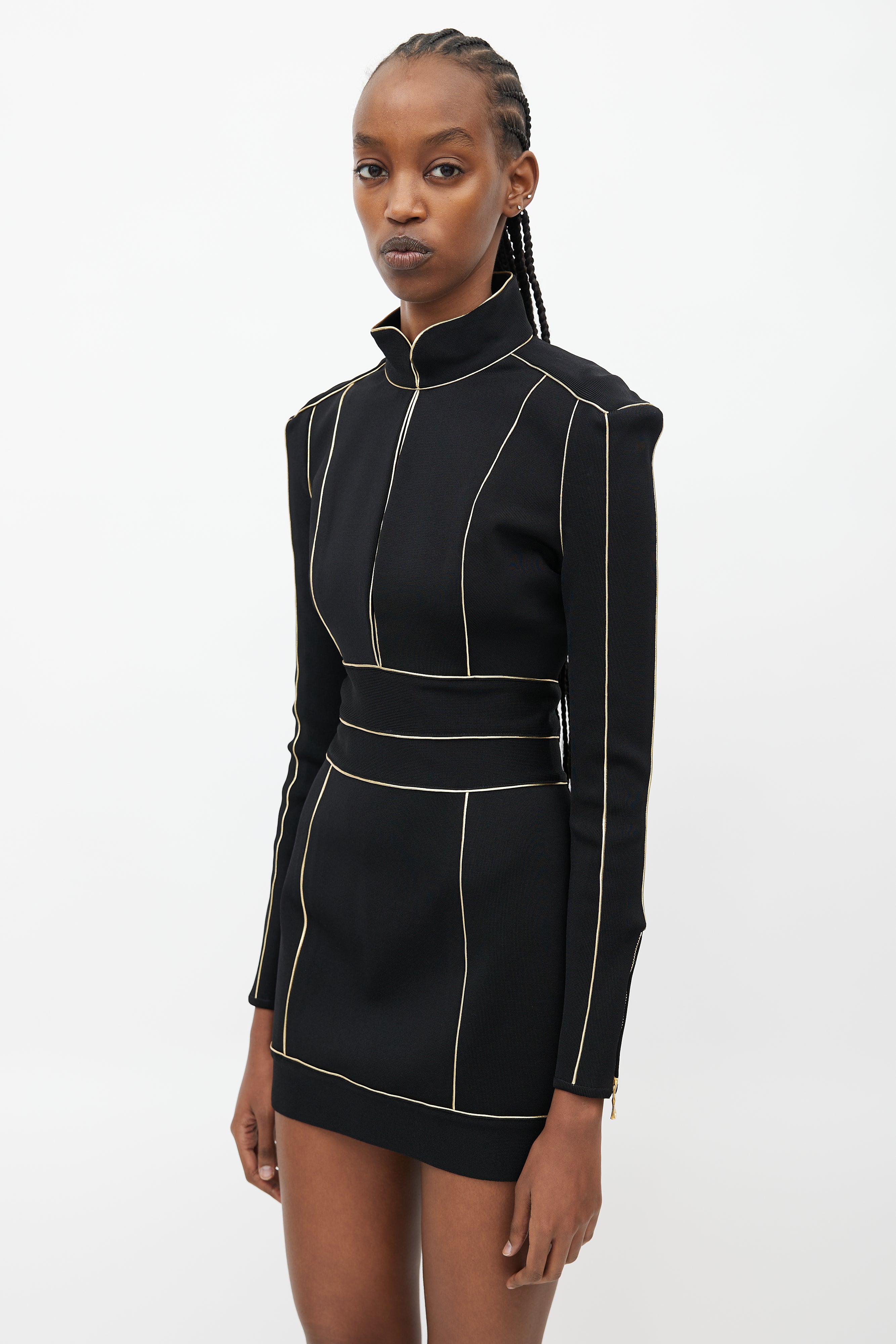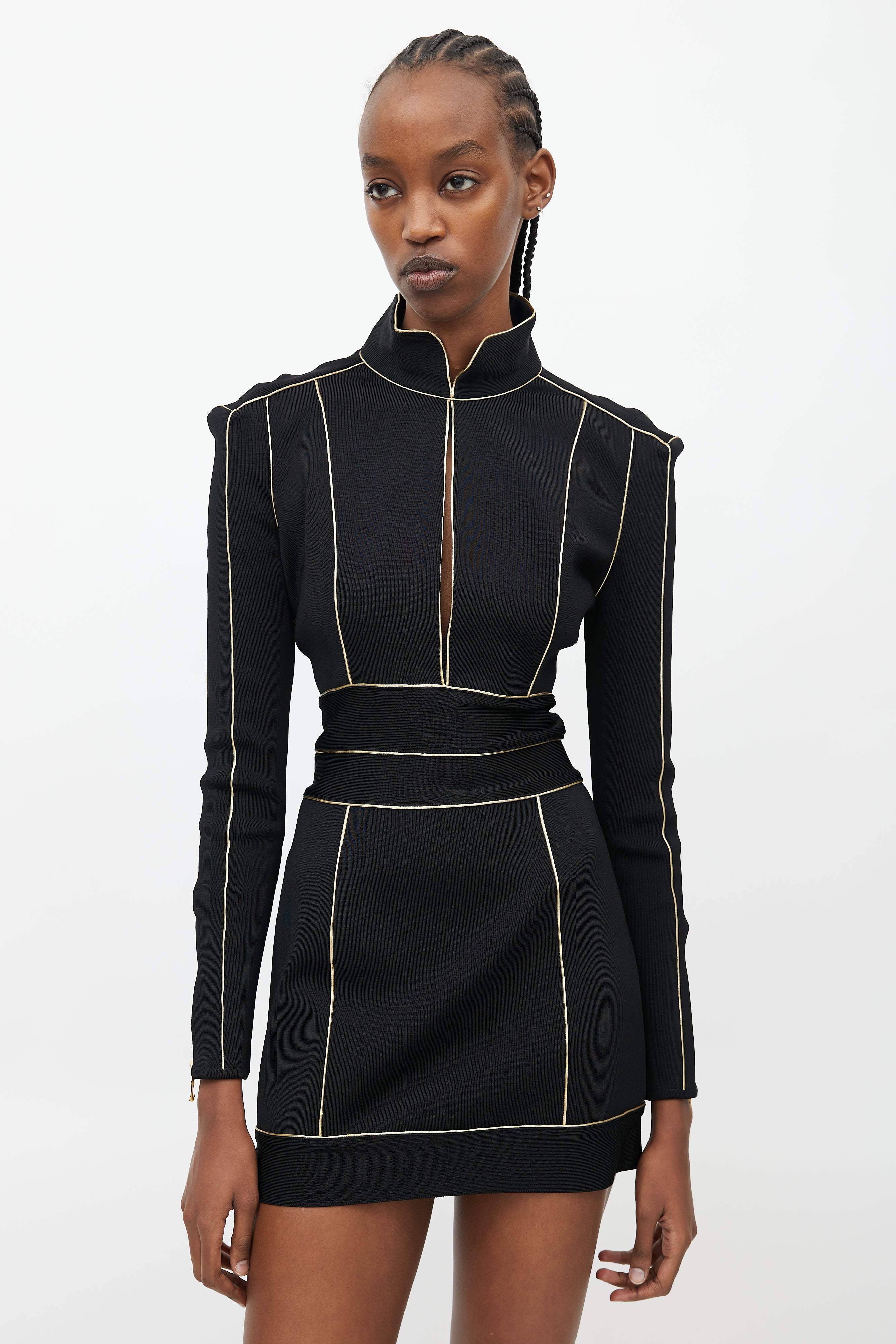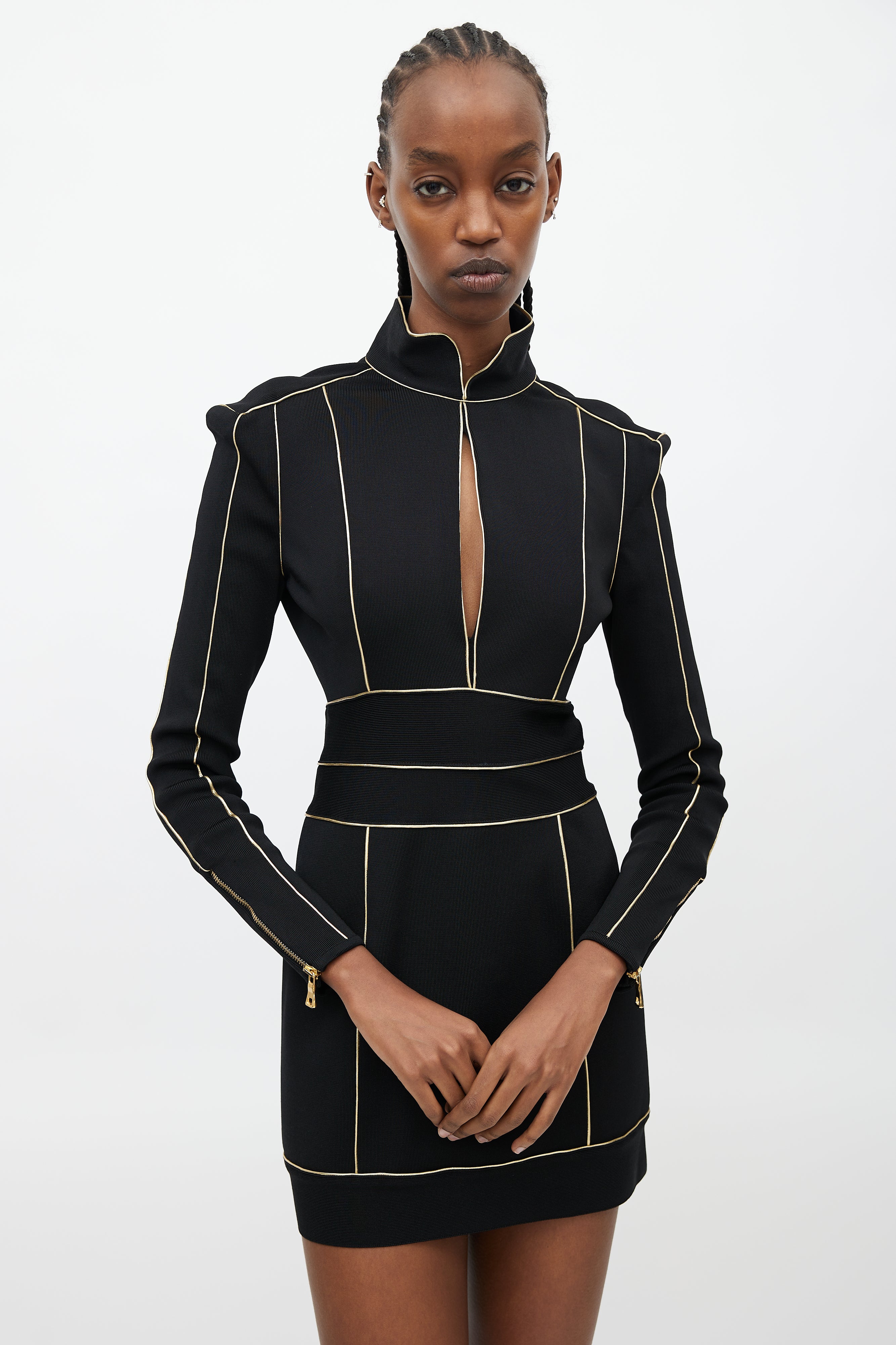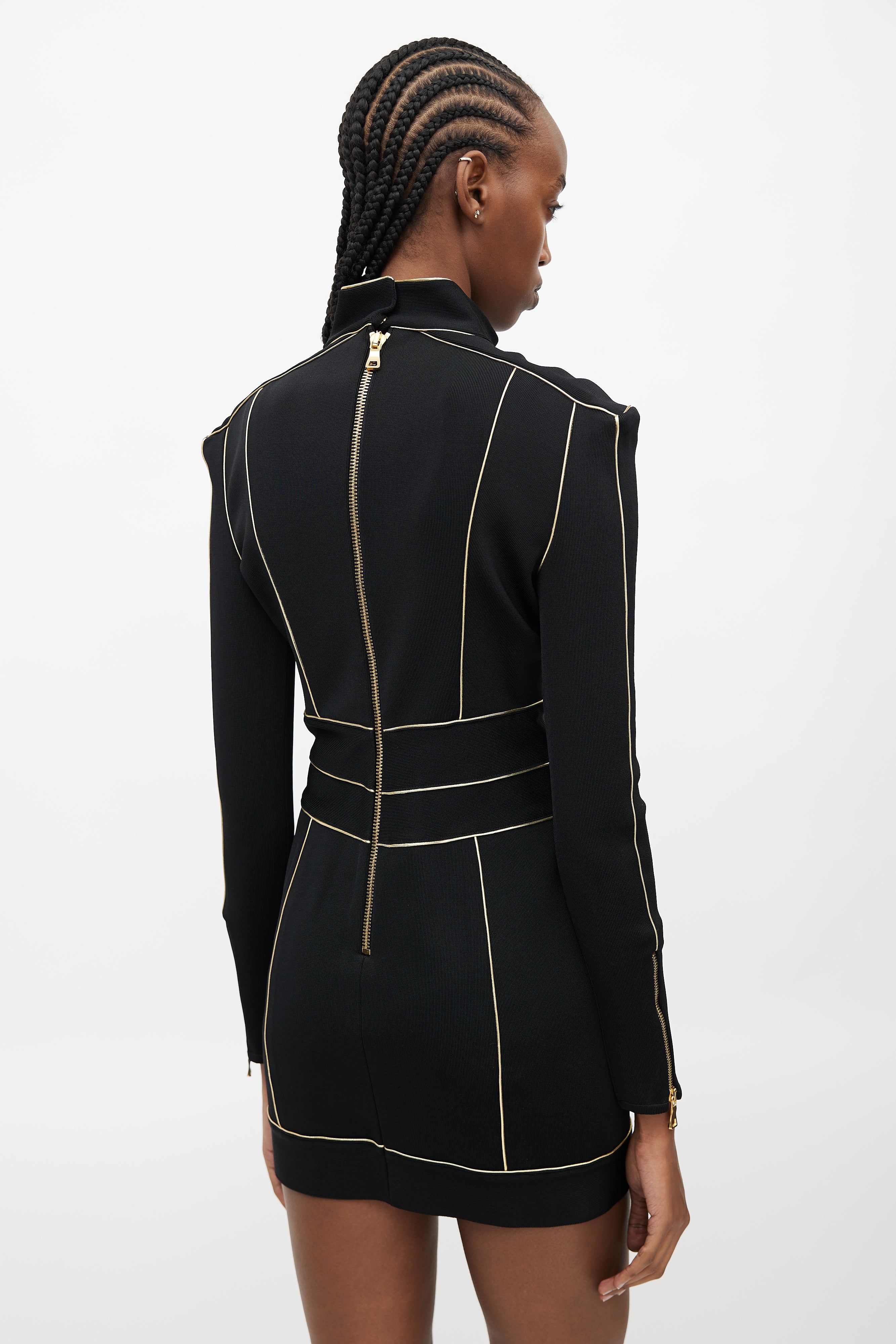 Pre-owned Balmain black knit midi dress featuring a band collar, keyhole neckline, gold trim throughout, long sleeves with zipped cuffs, and silver tone zip closure at back. Clipped to fit model.