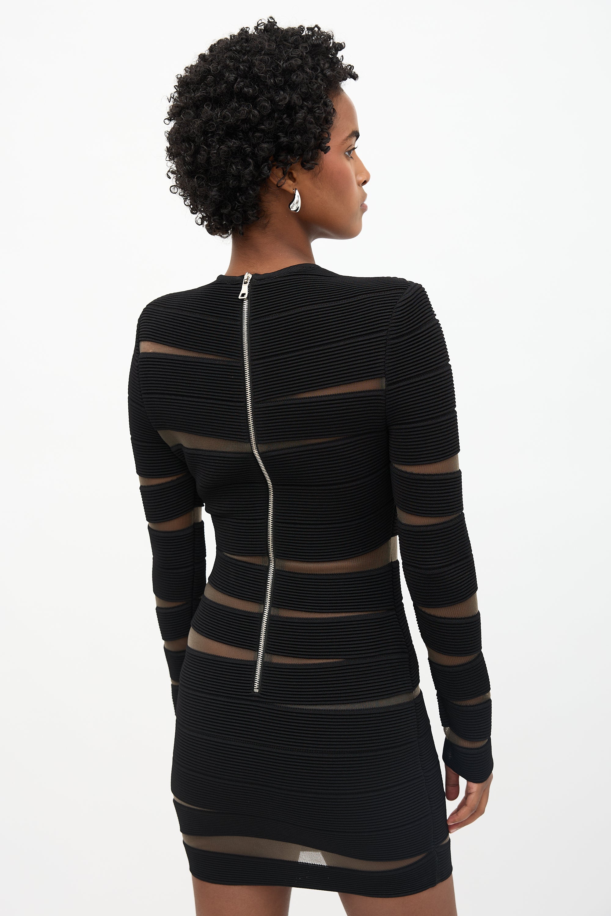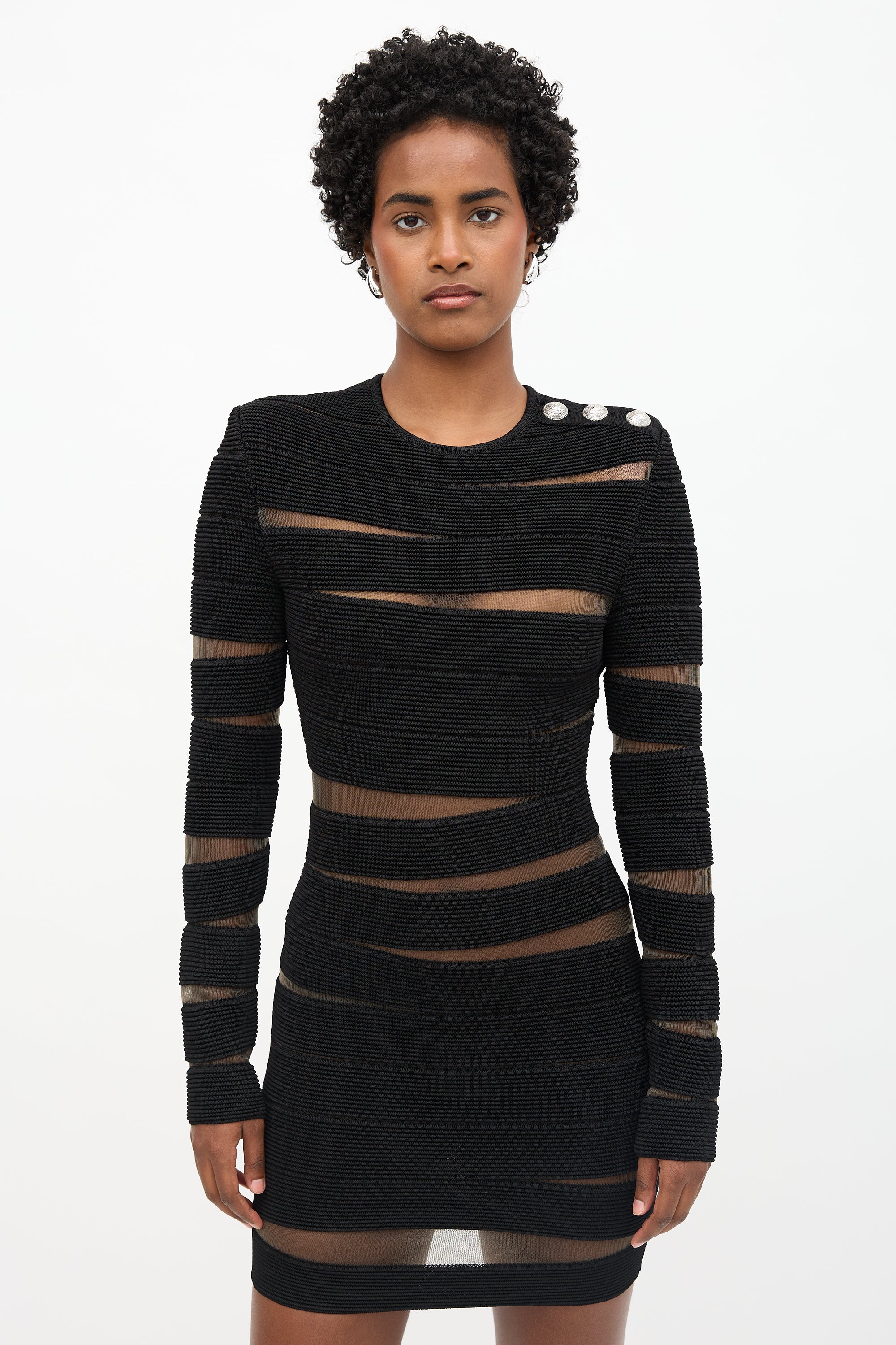 Pre-owned Balmain black mini bandage dress featuring mesh panels, round neckline, padded shoulders, epaulette detail with silver tone buttons, and back zip.