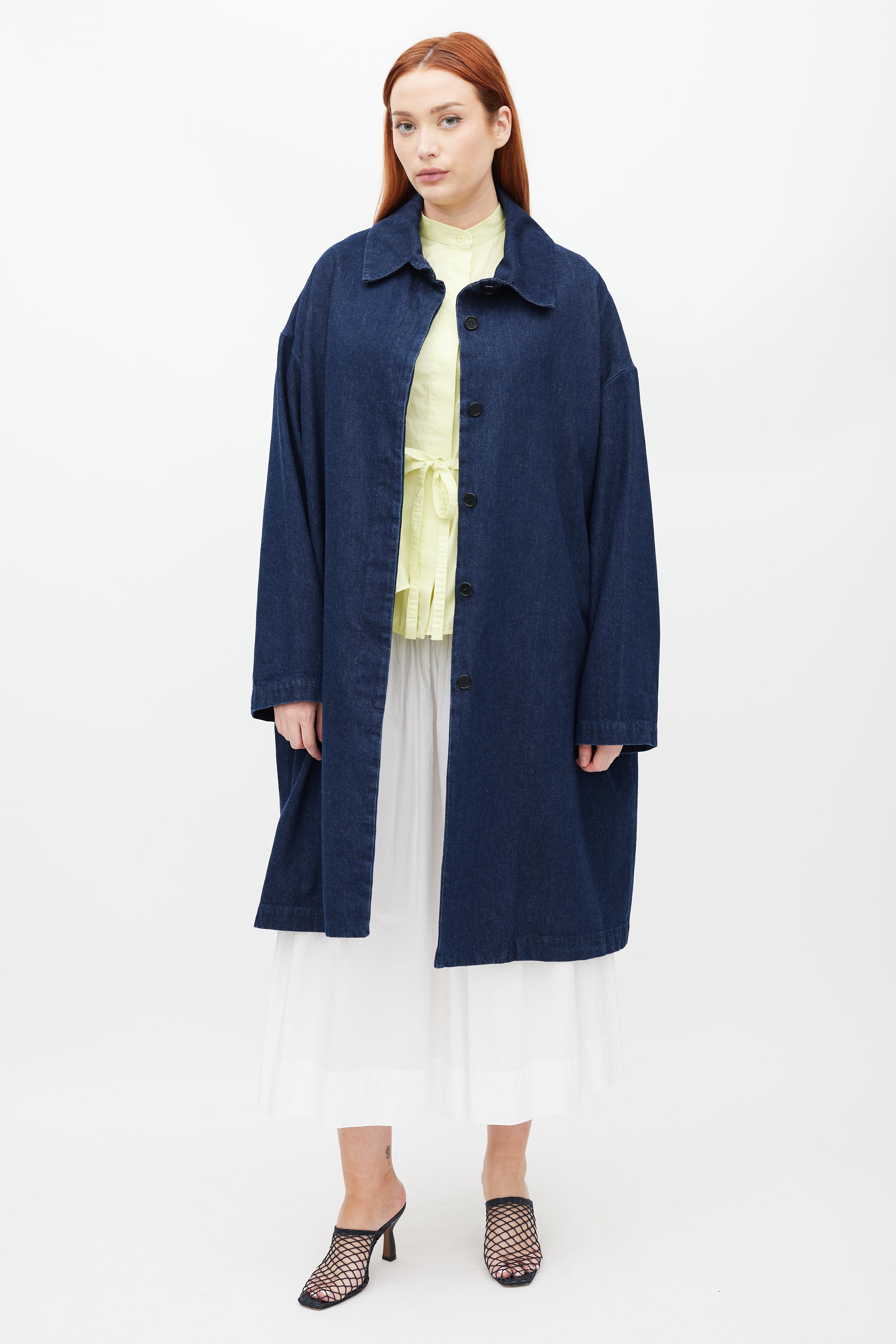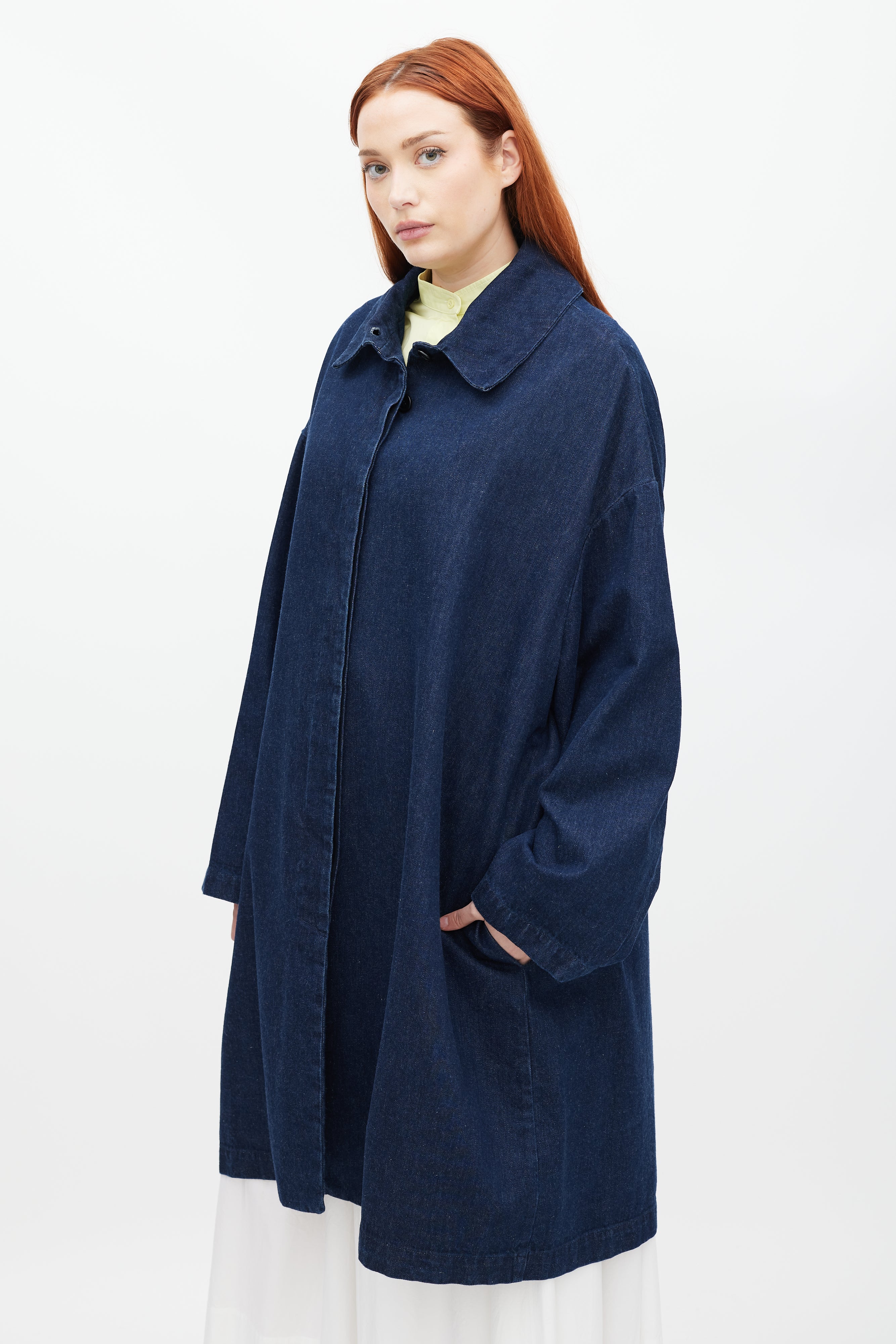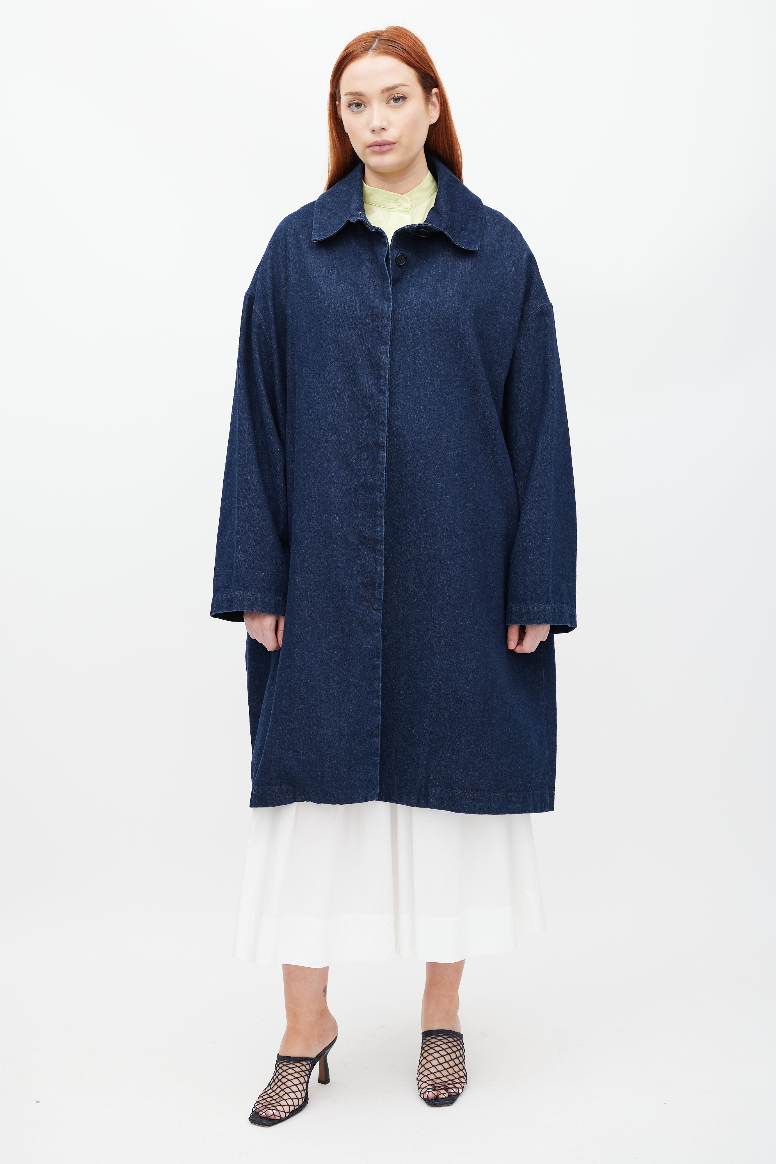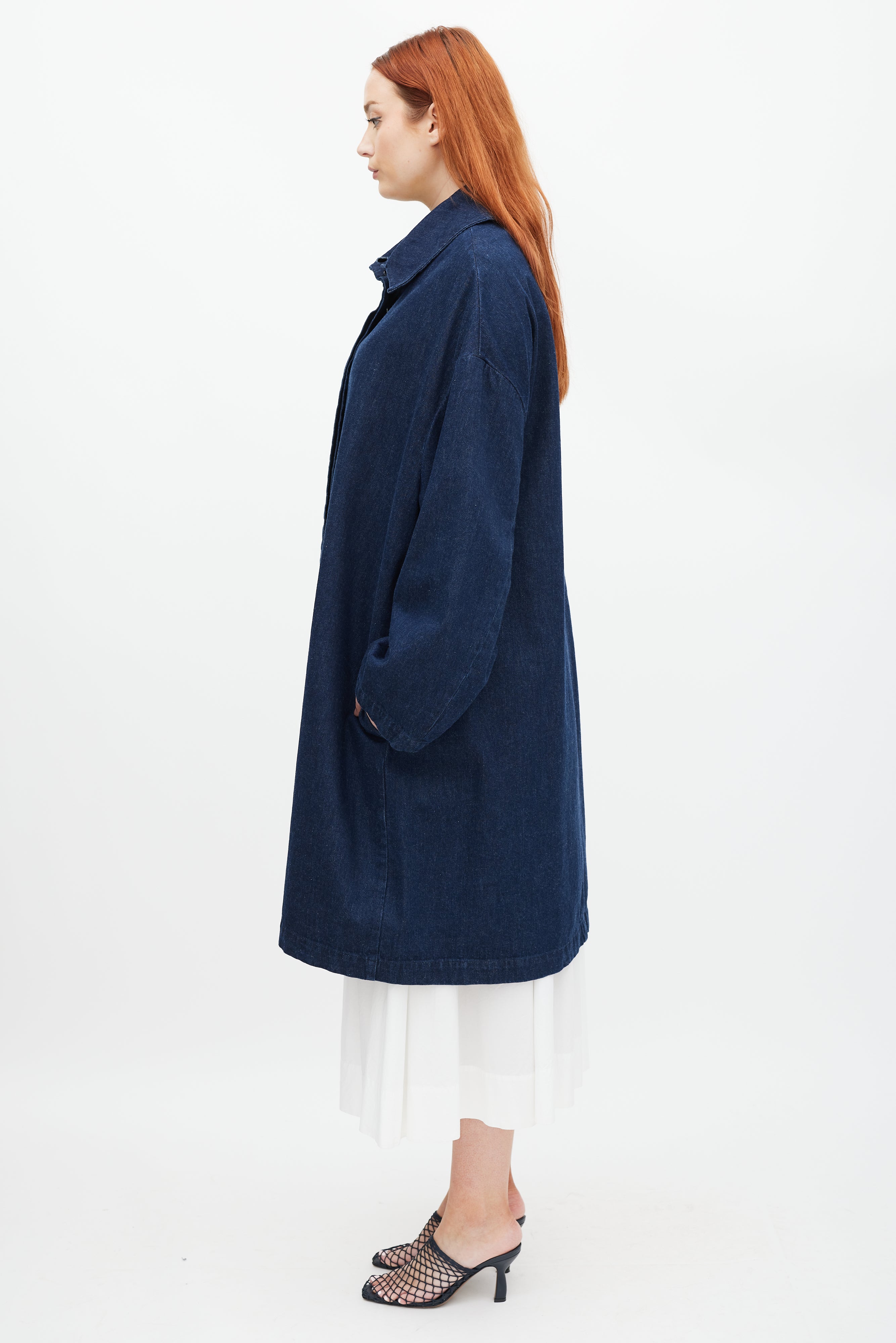 Pre-owned Barena navy dark wash denim coat featuring a pointed collar, long sleeves, two slip pockets at hip, and button up closure.