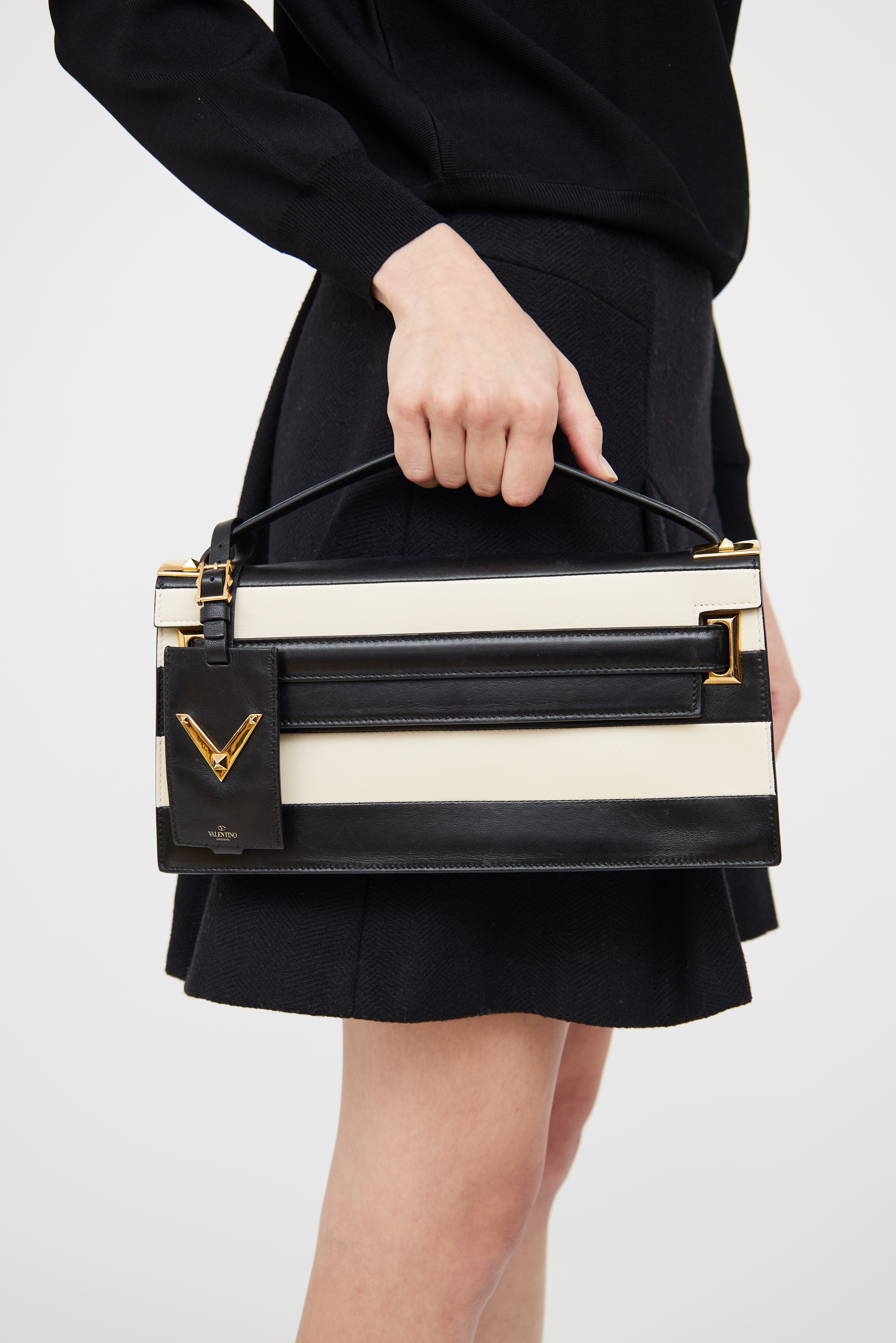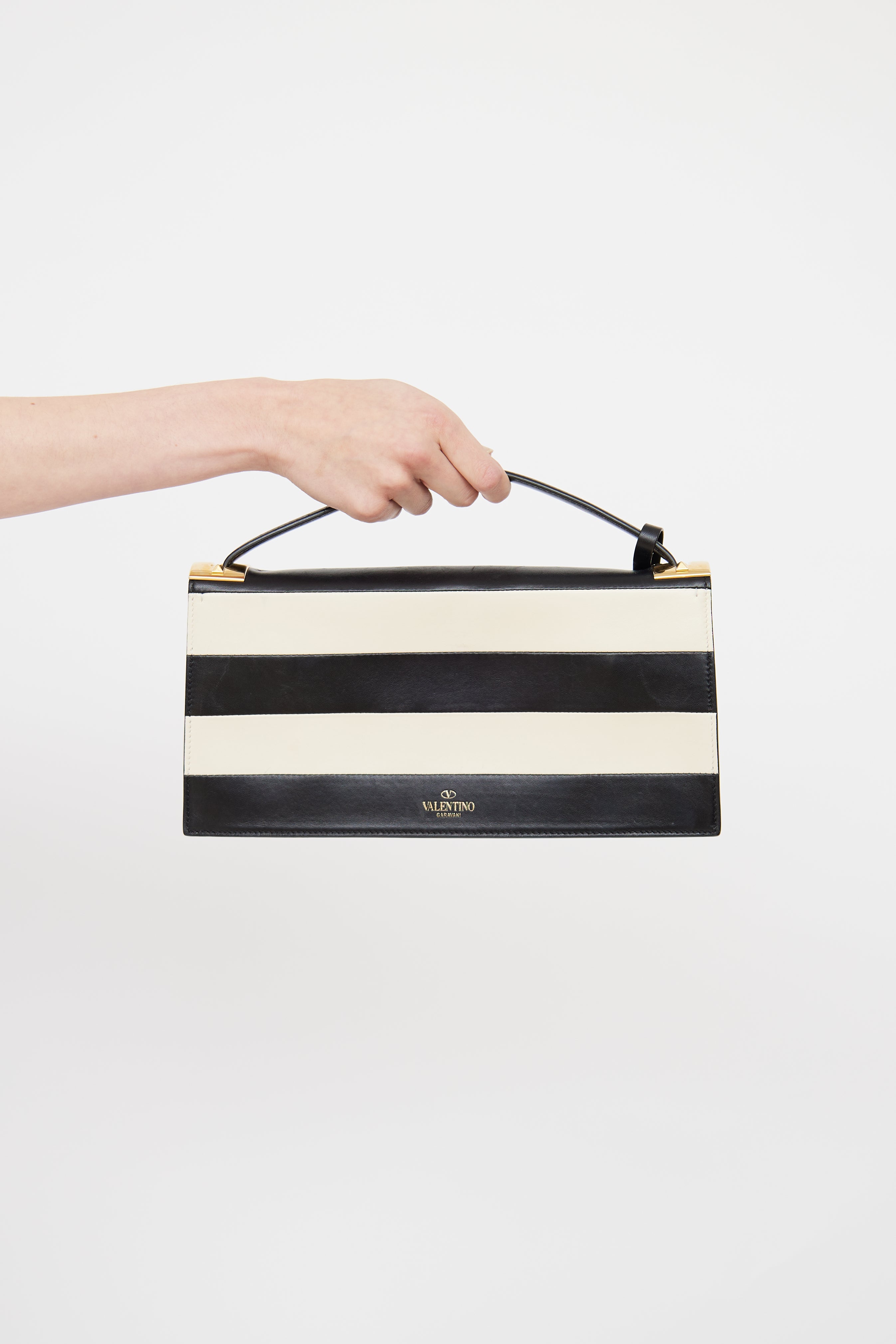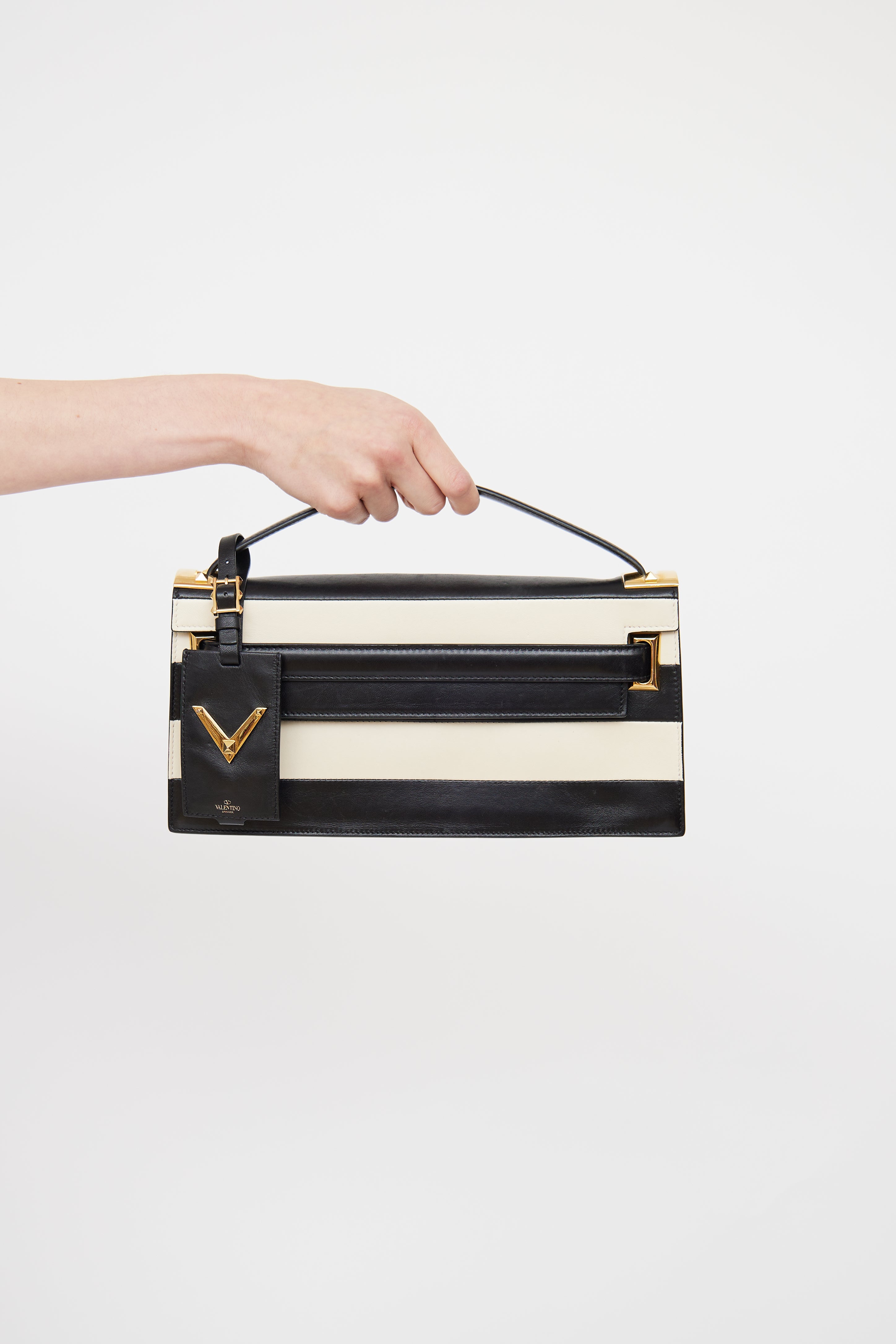 Pre-owned Valentino black and white My Rockstud striped clutch featuring top flap and snap closure, single flat top handle, detachable ID tag, gold tone hardware and gold foil logo at front.