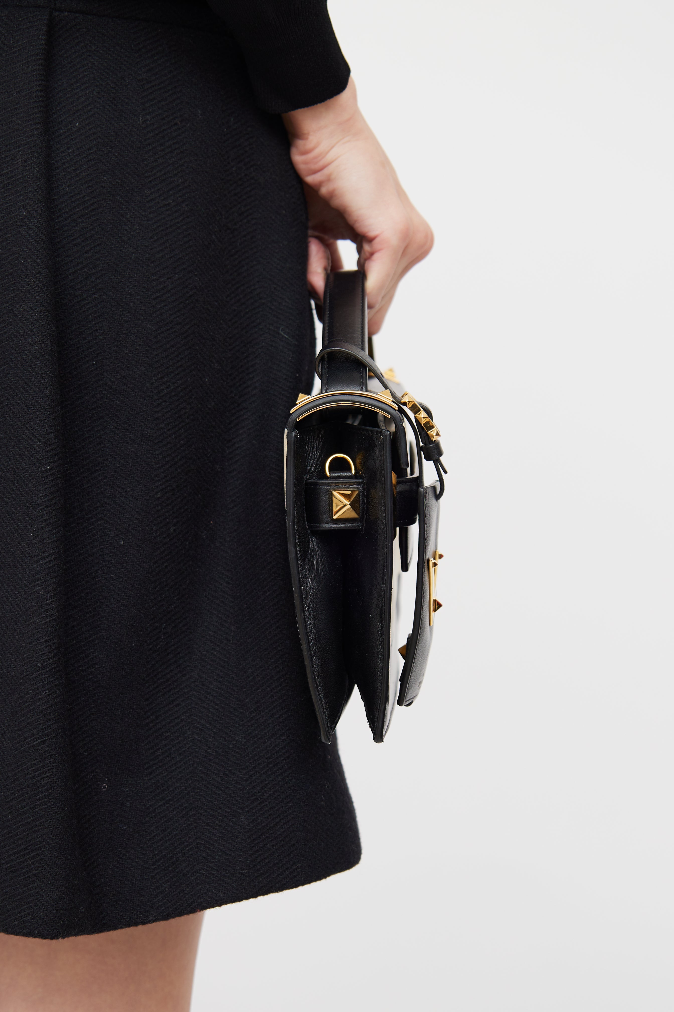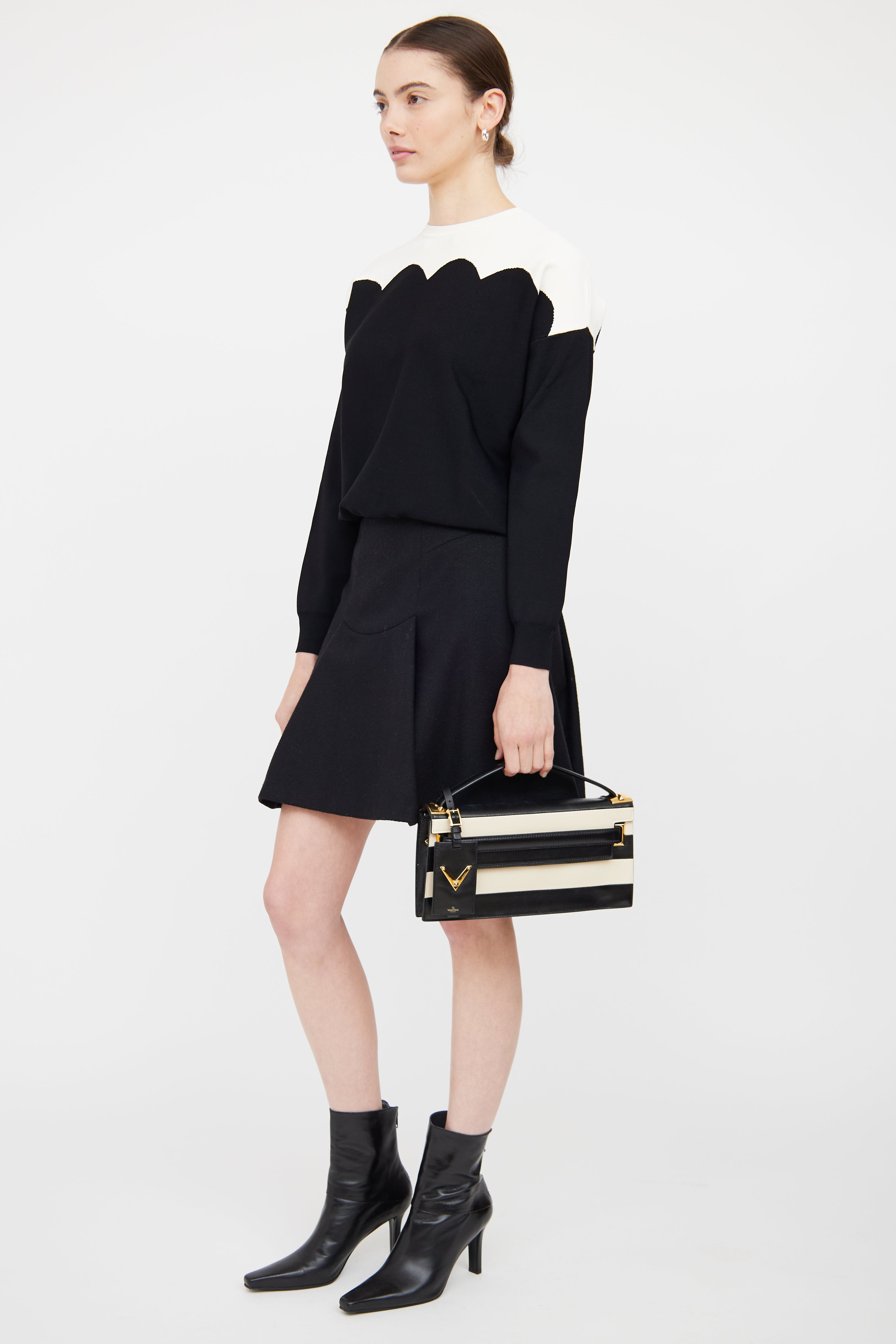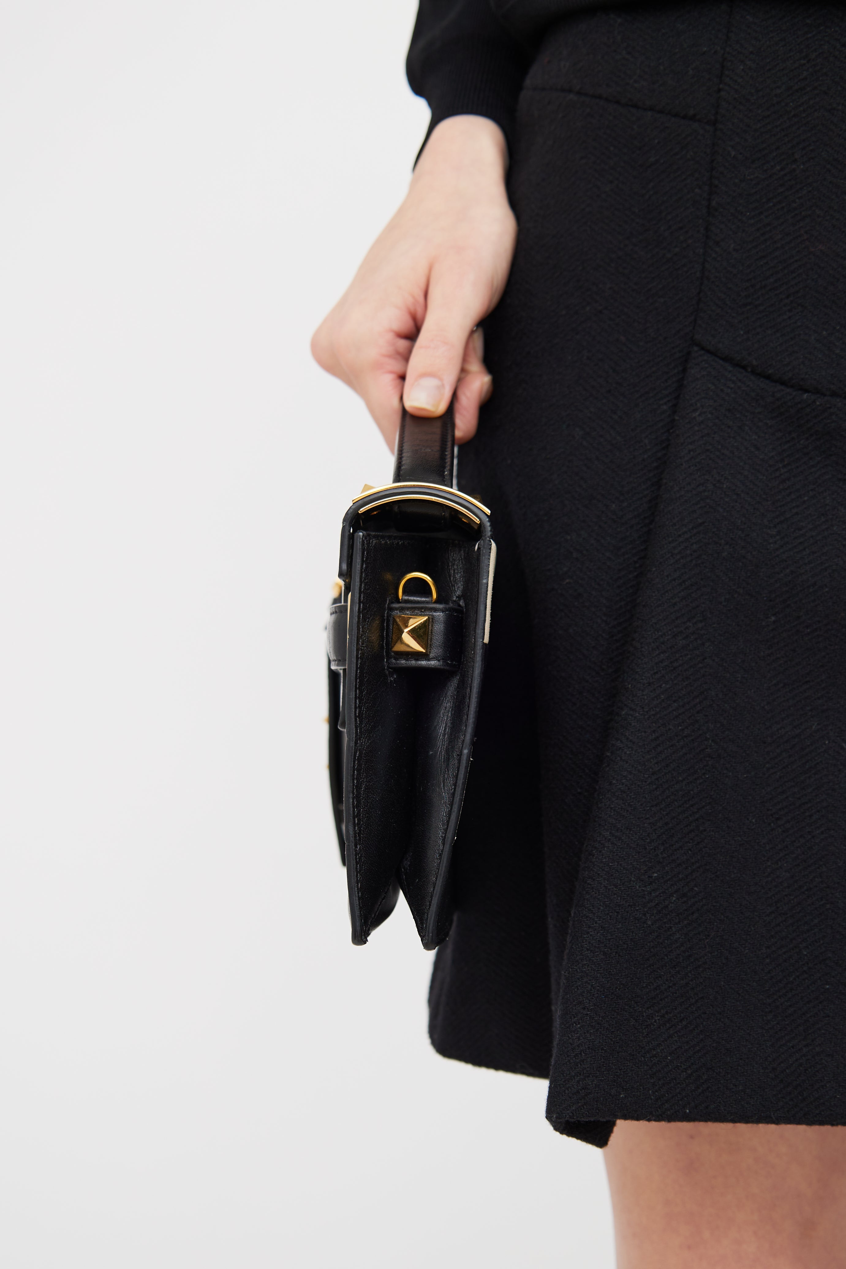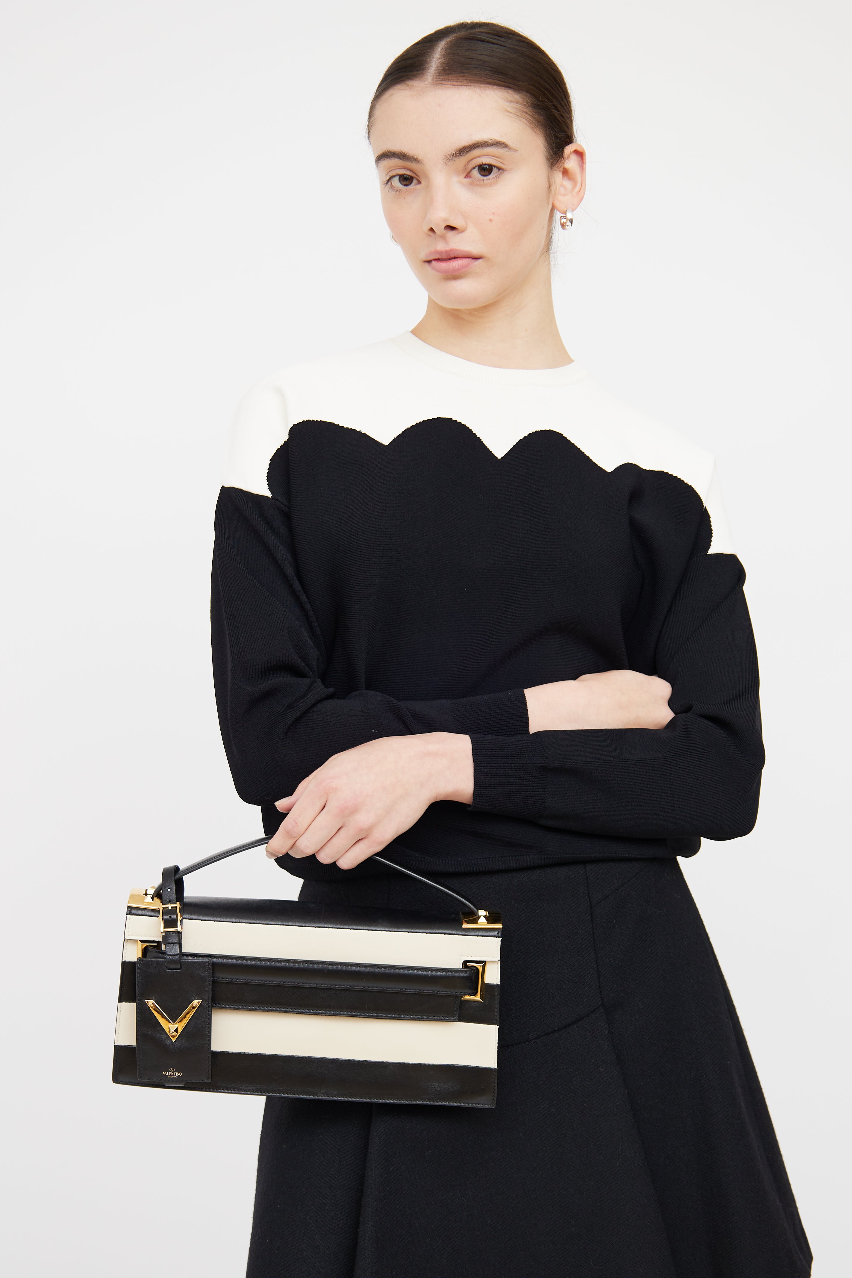 Pre-owned Valentino black and white My Rockstud striped clutch featuring top flap and snap closure, single flat top handle, detachable ID tag, gold tone hardware and gold foil logo at front.