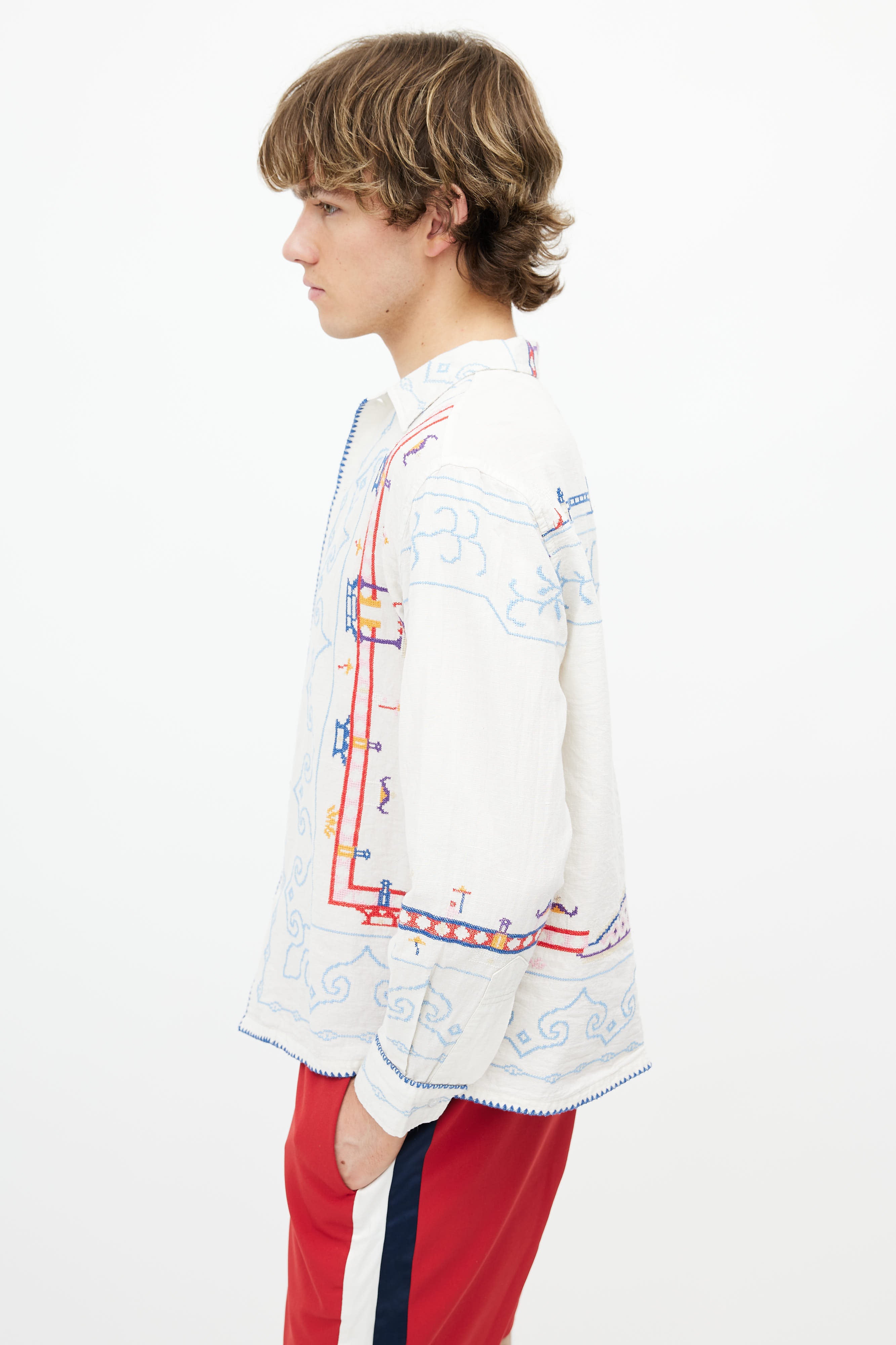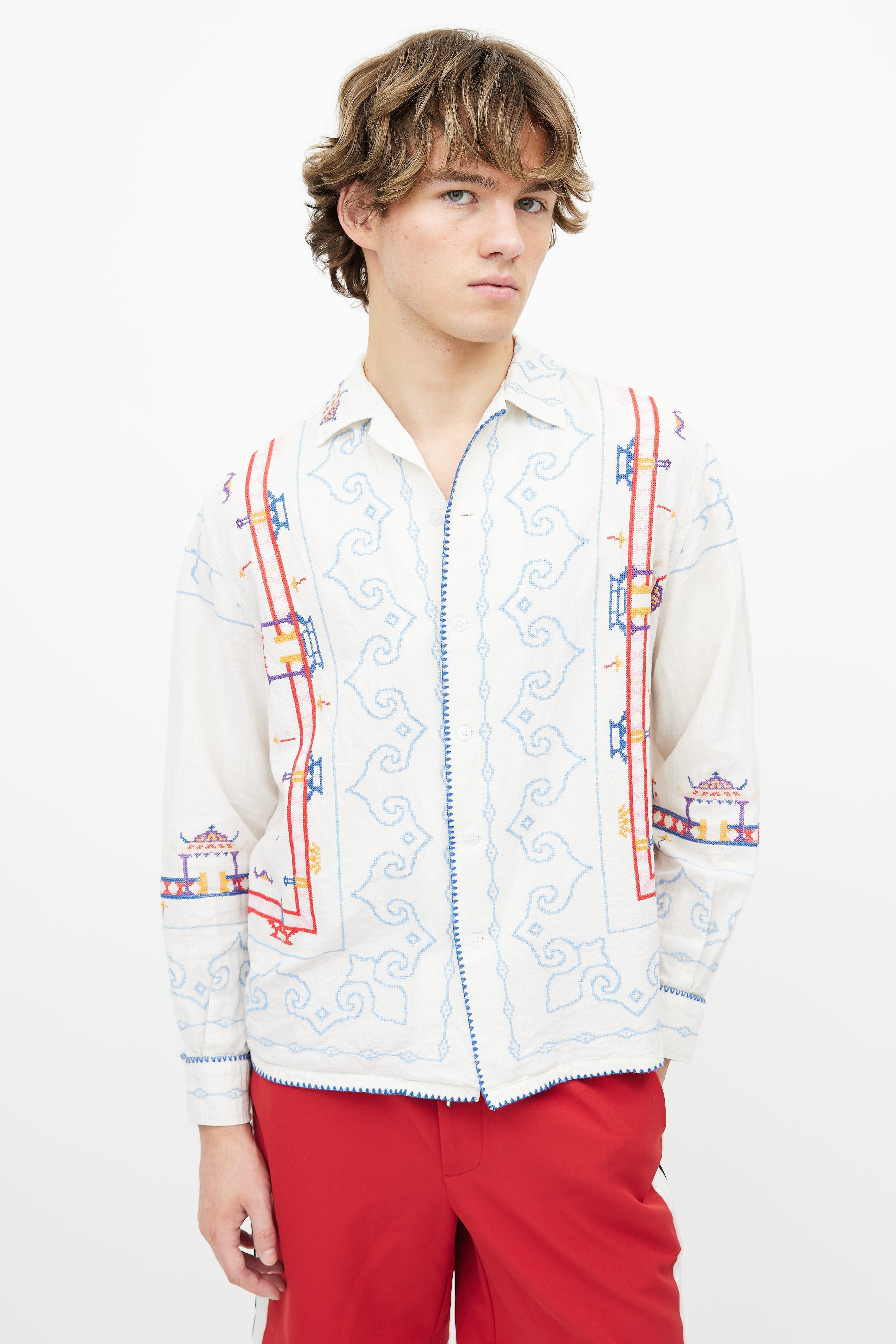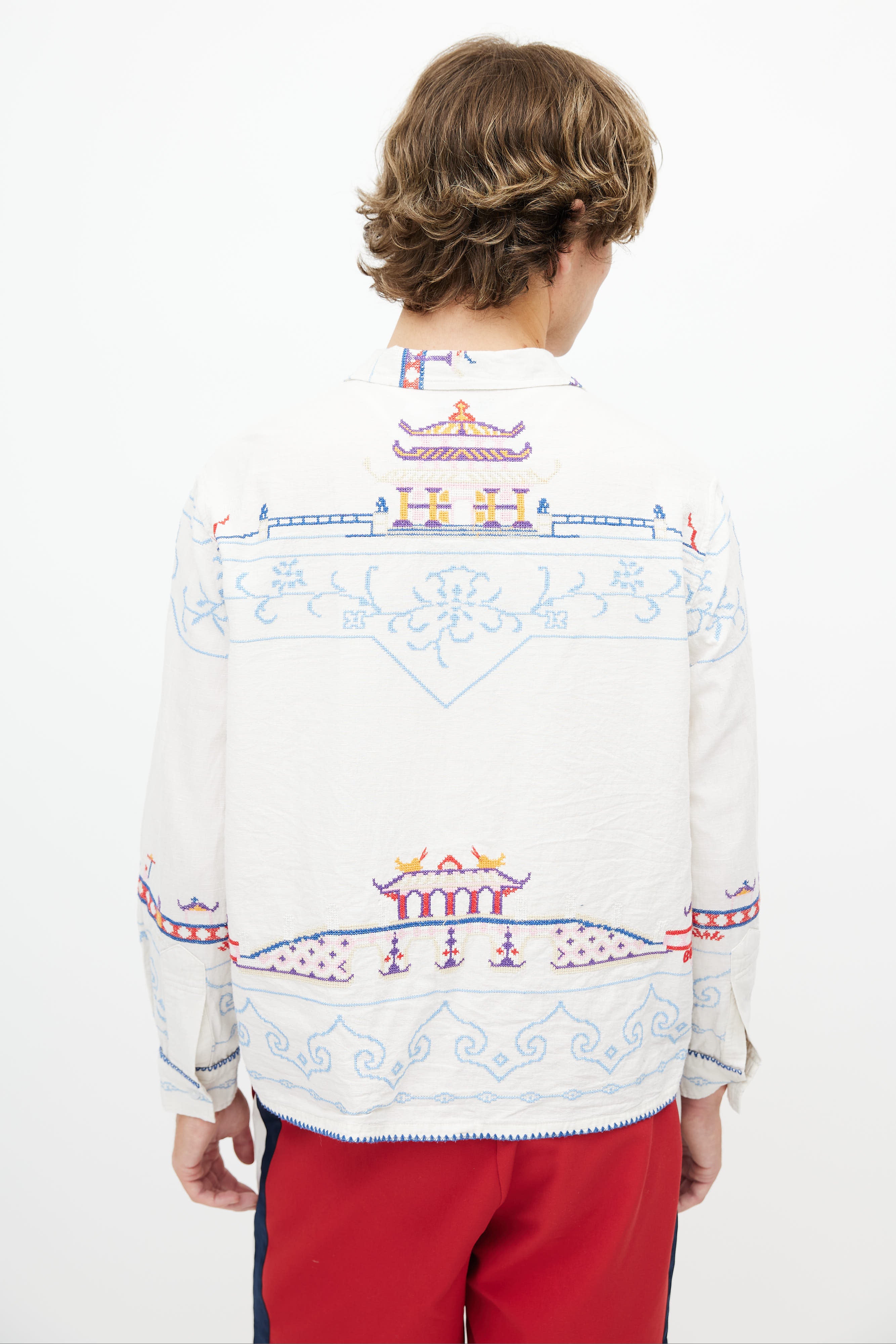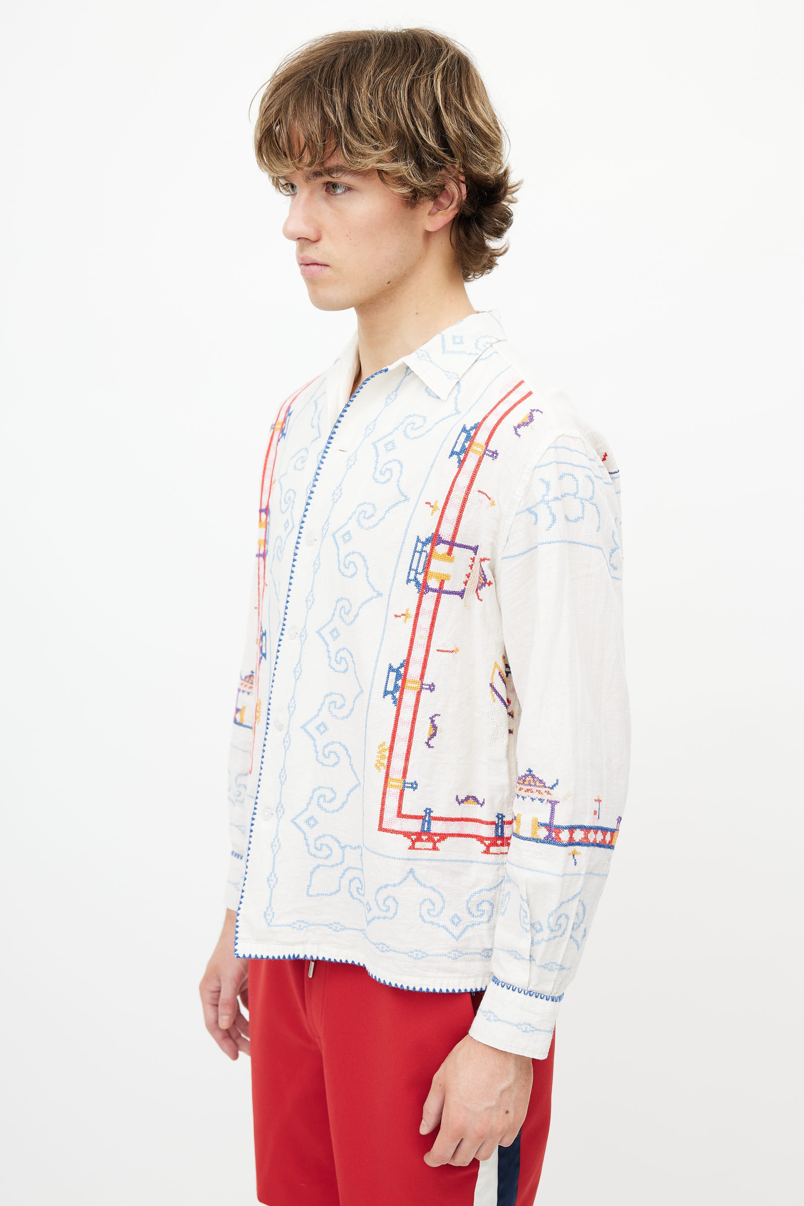 Pre-owned Bode white shirt featuring button up front, classic collar, and multicolor embroidery throughout.