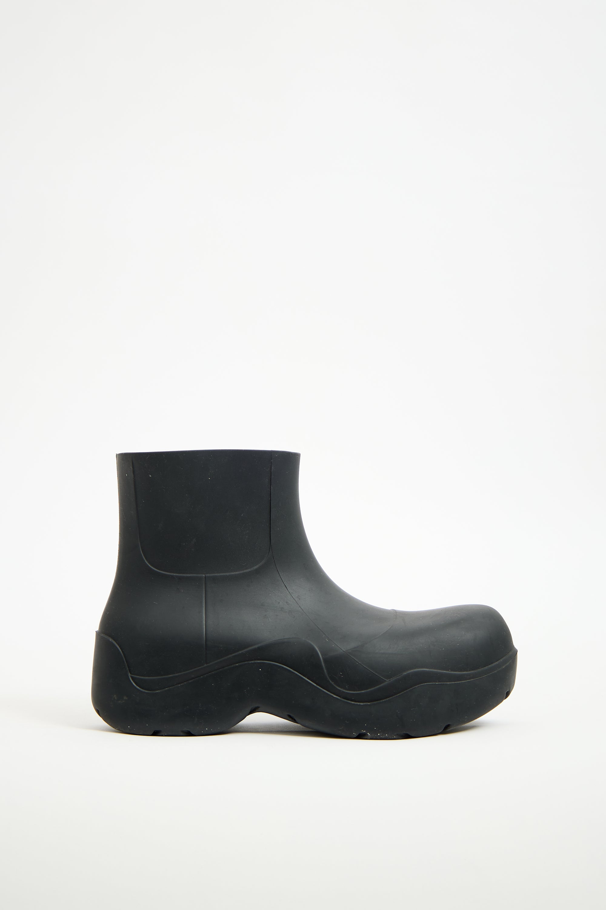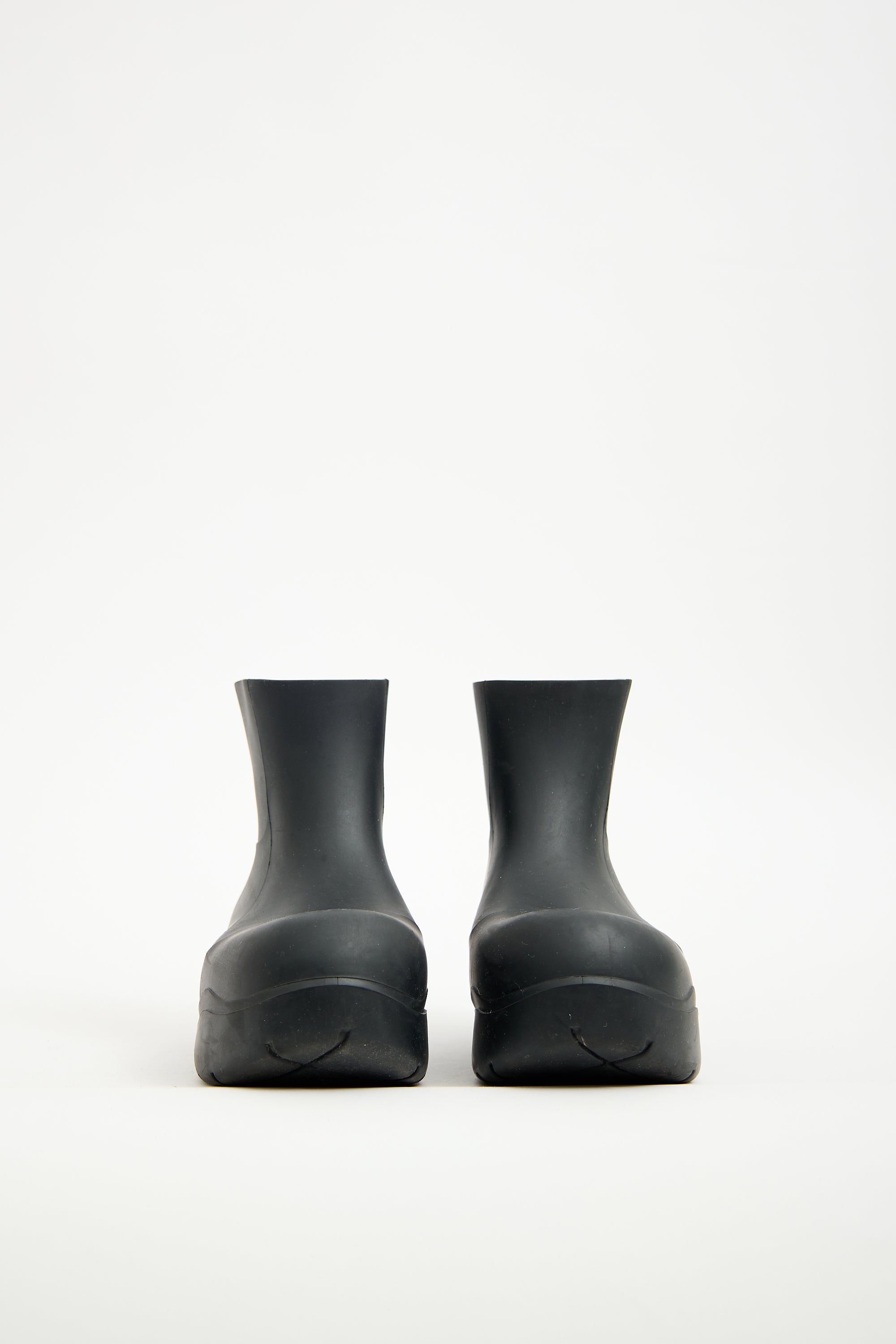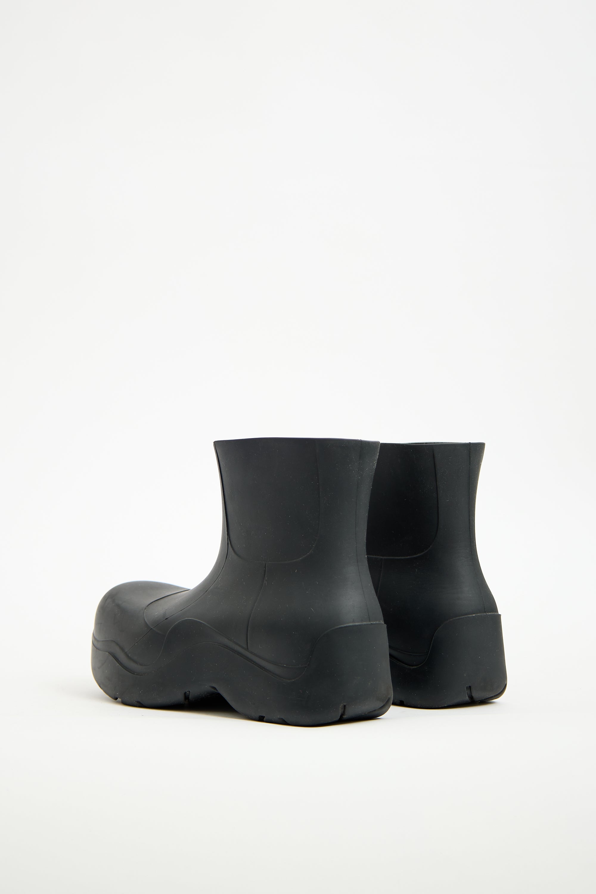Pre-owned Bottega Veneta black Puddle ankle boots featuring rounded toe, debossed gusset sides, platform midsole, and tonal treaded rubber outsole. Comes with original dust bag and box.