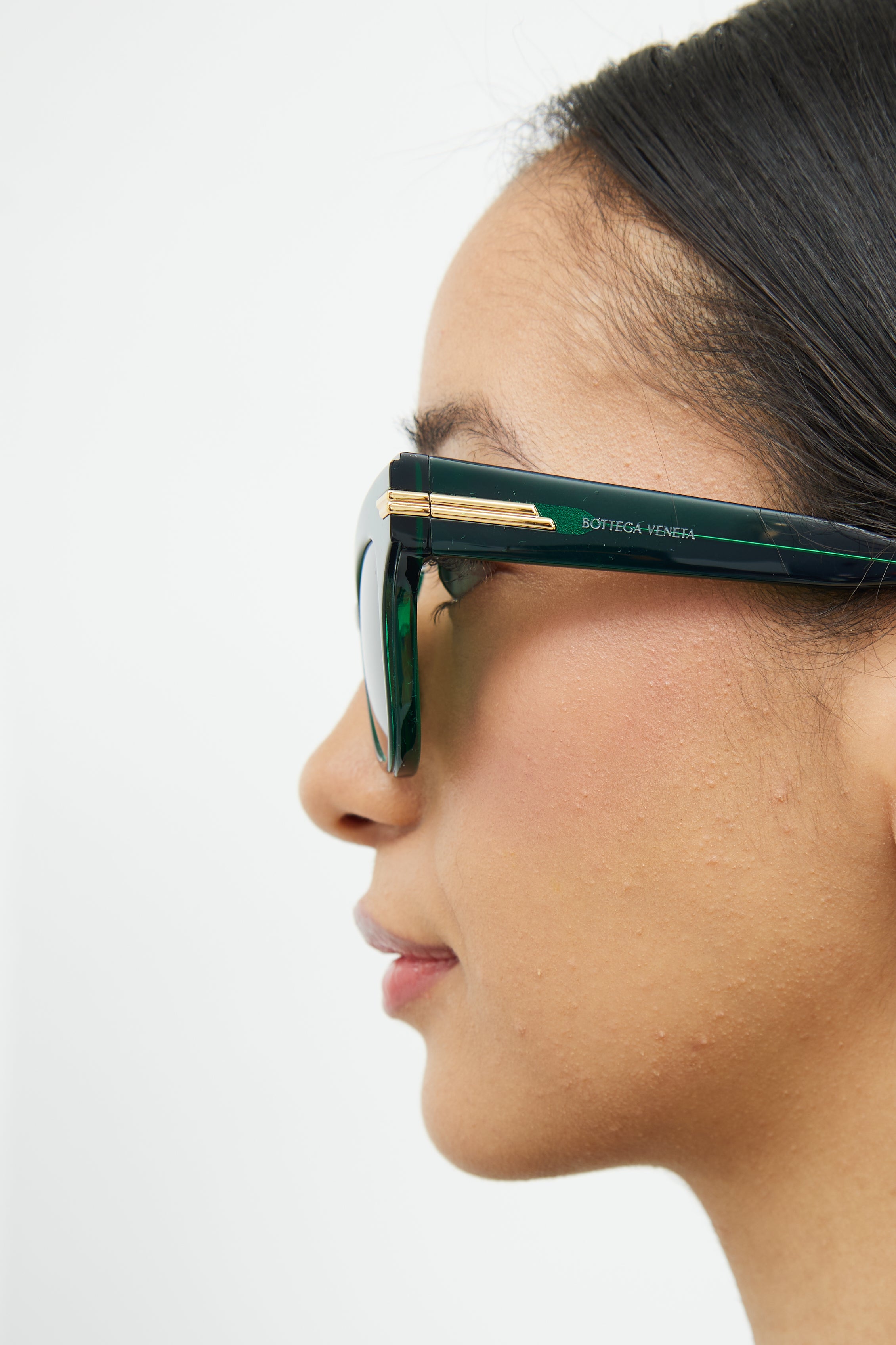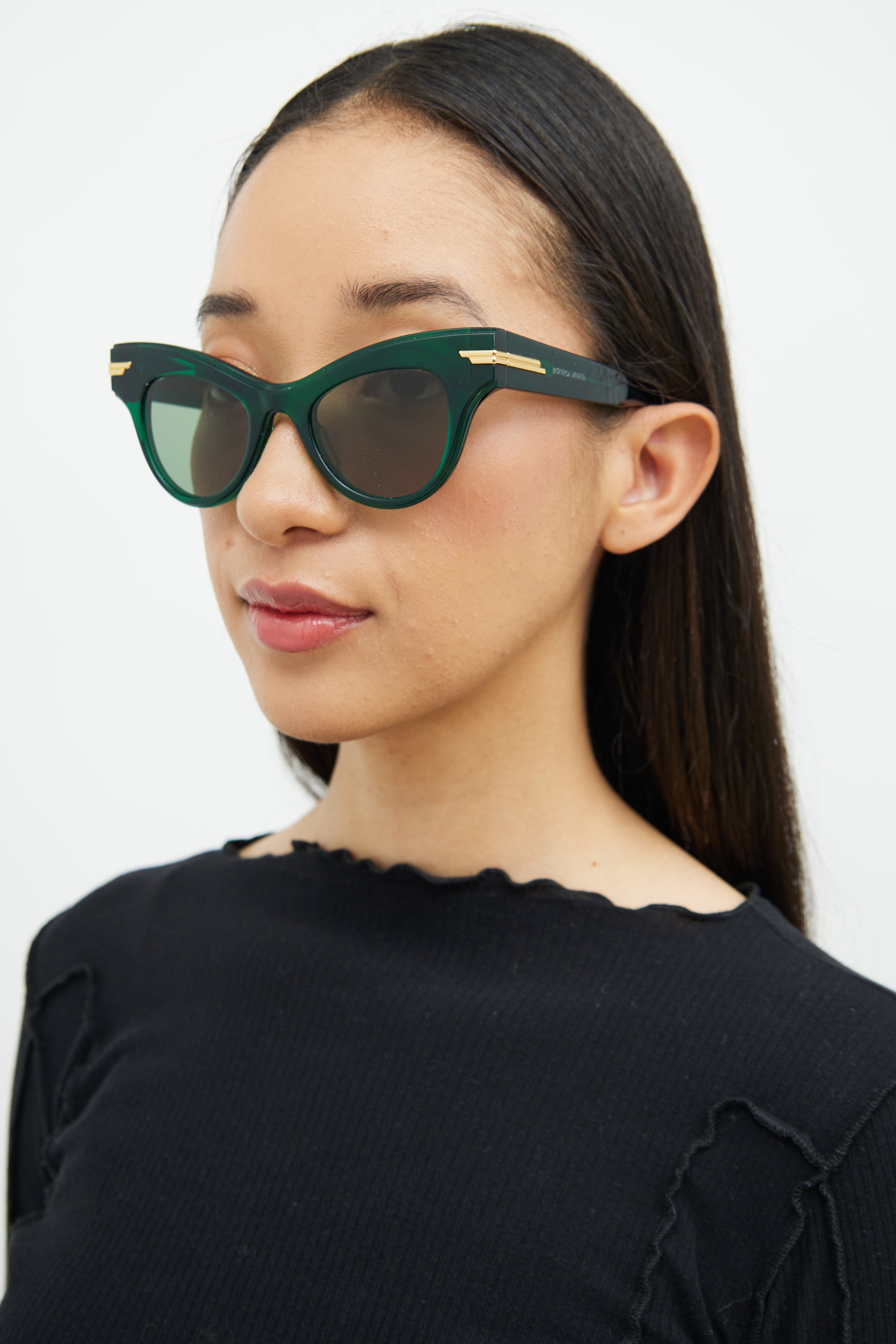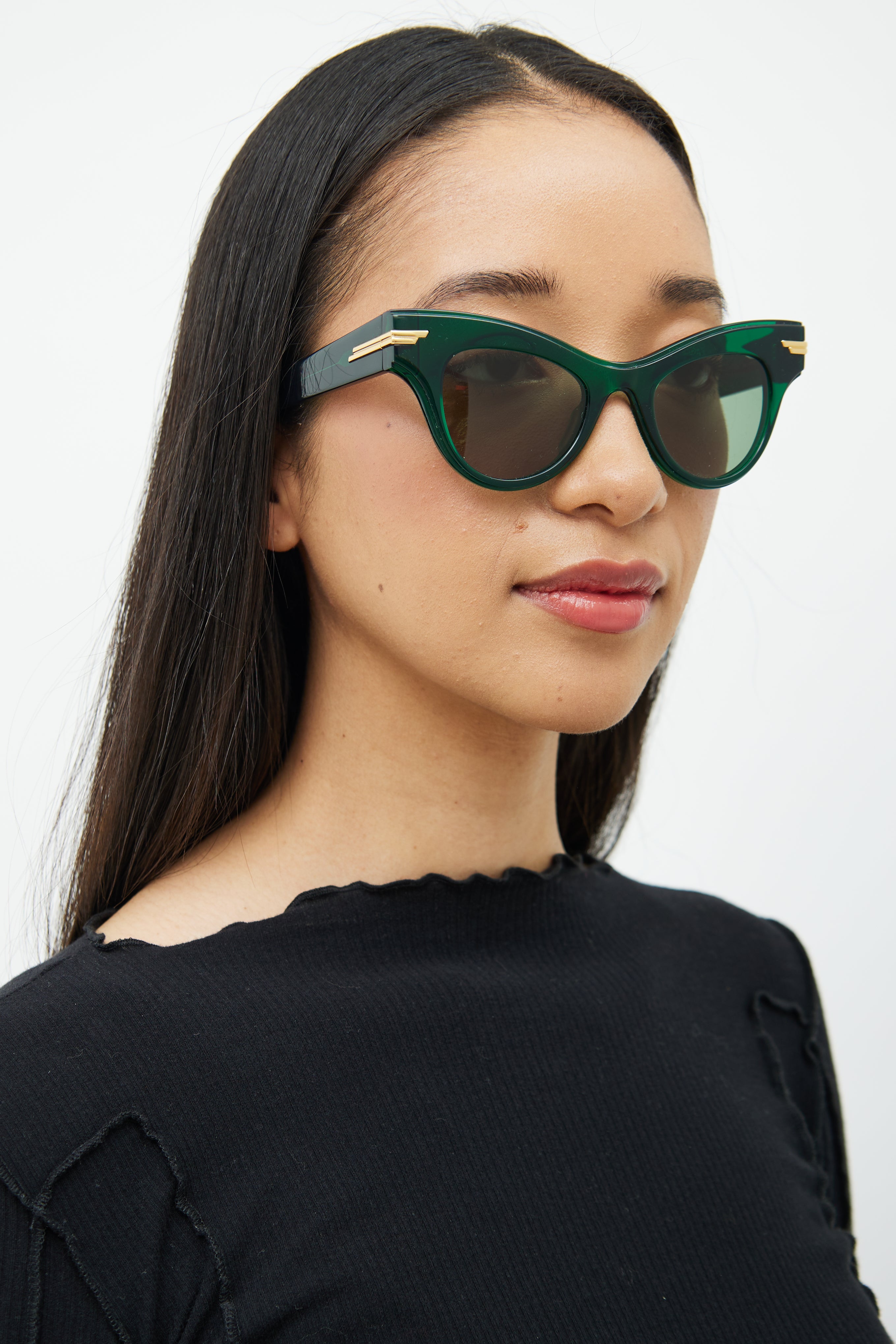Pre-owned Bottega Veneta green BV1004S sunglasses featuring green tinted lens, accentuated cat eye shape, green translucent frame, gold tone temple tips and silver tone logo text on arms.