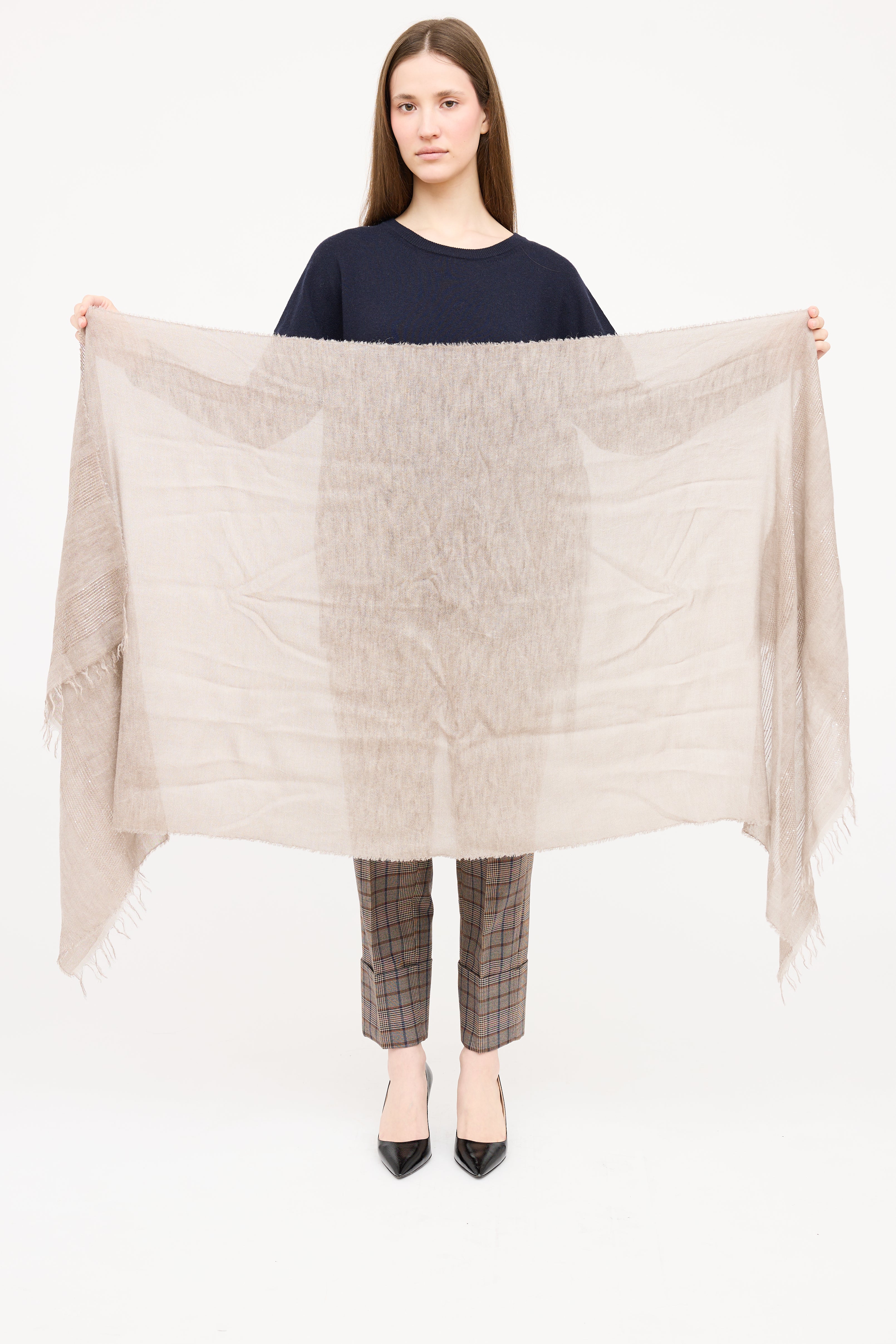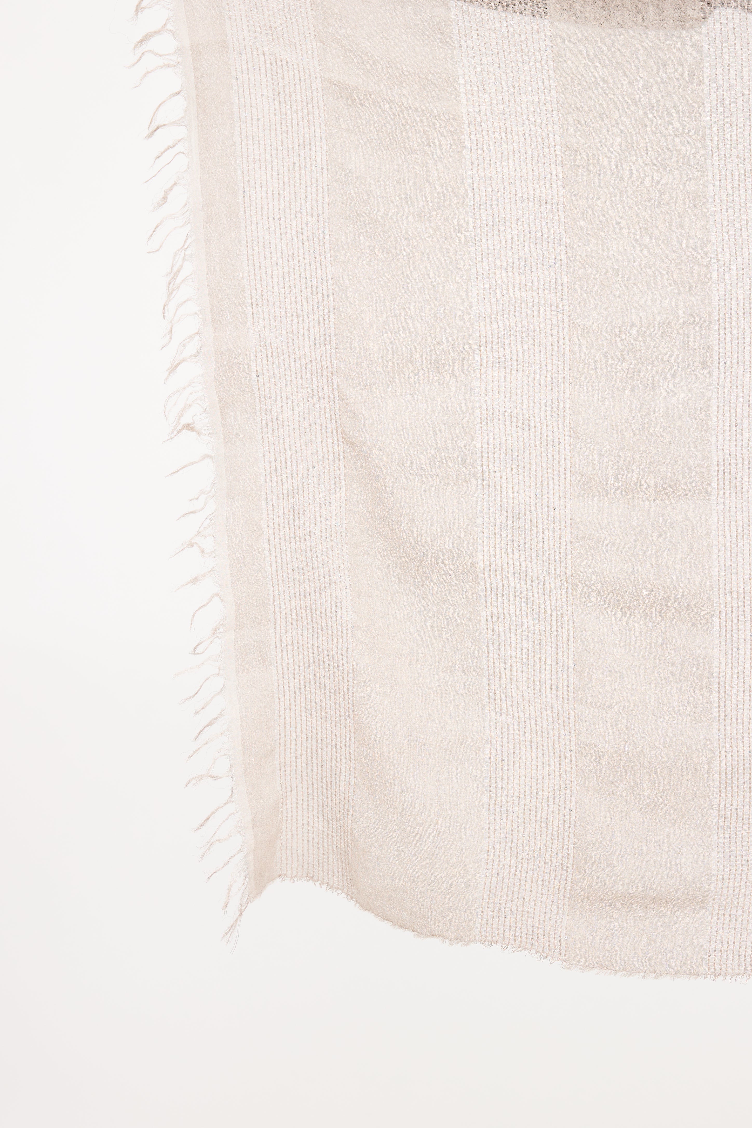 Pre-owned Brunello Cucinelli grey scarf featuring sequin detail with semi sheer panels and frayed edge trim.
