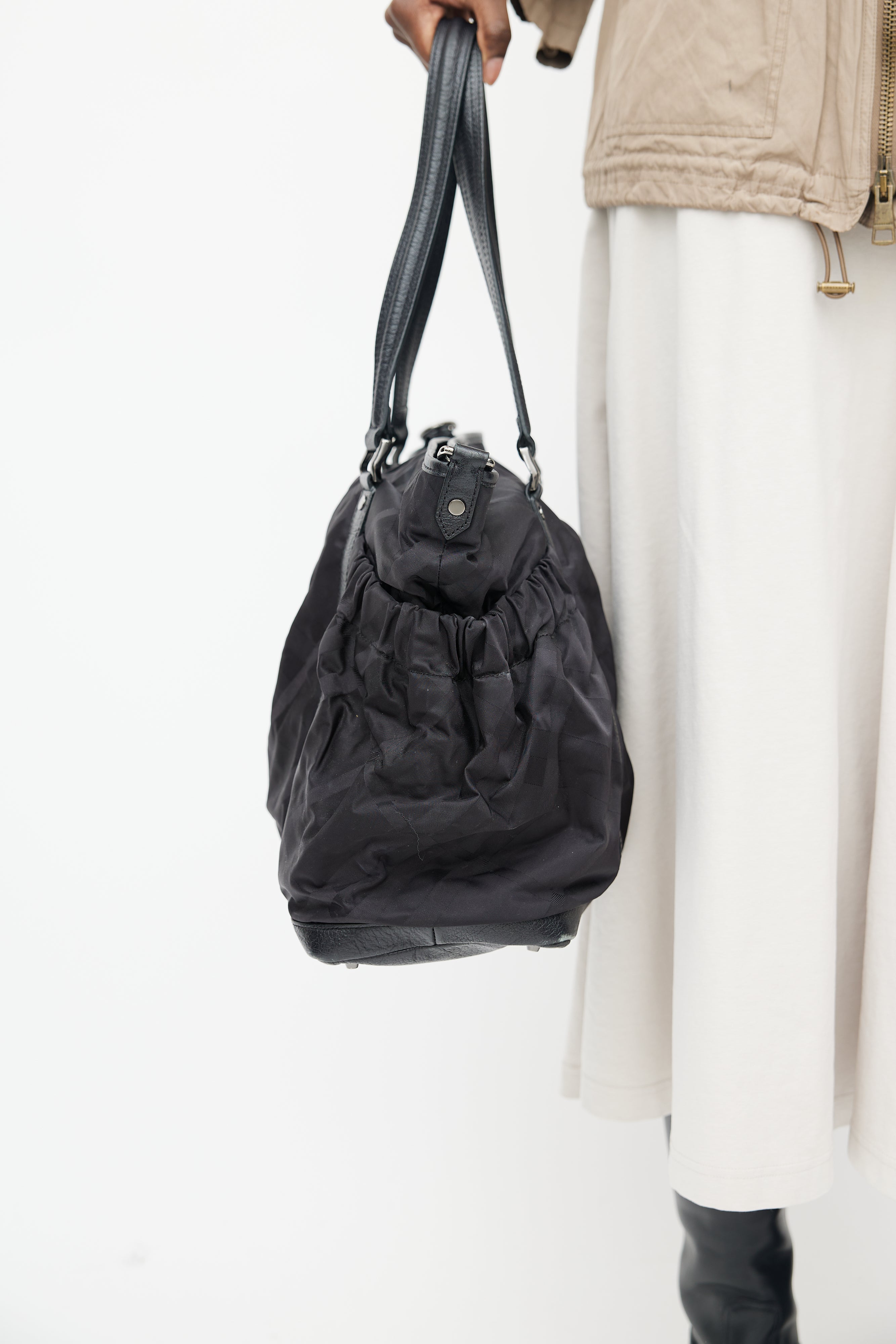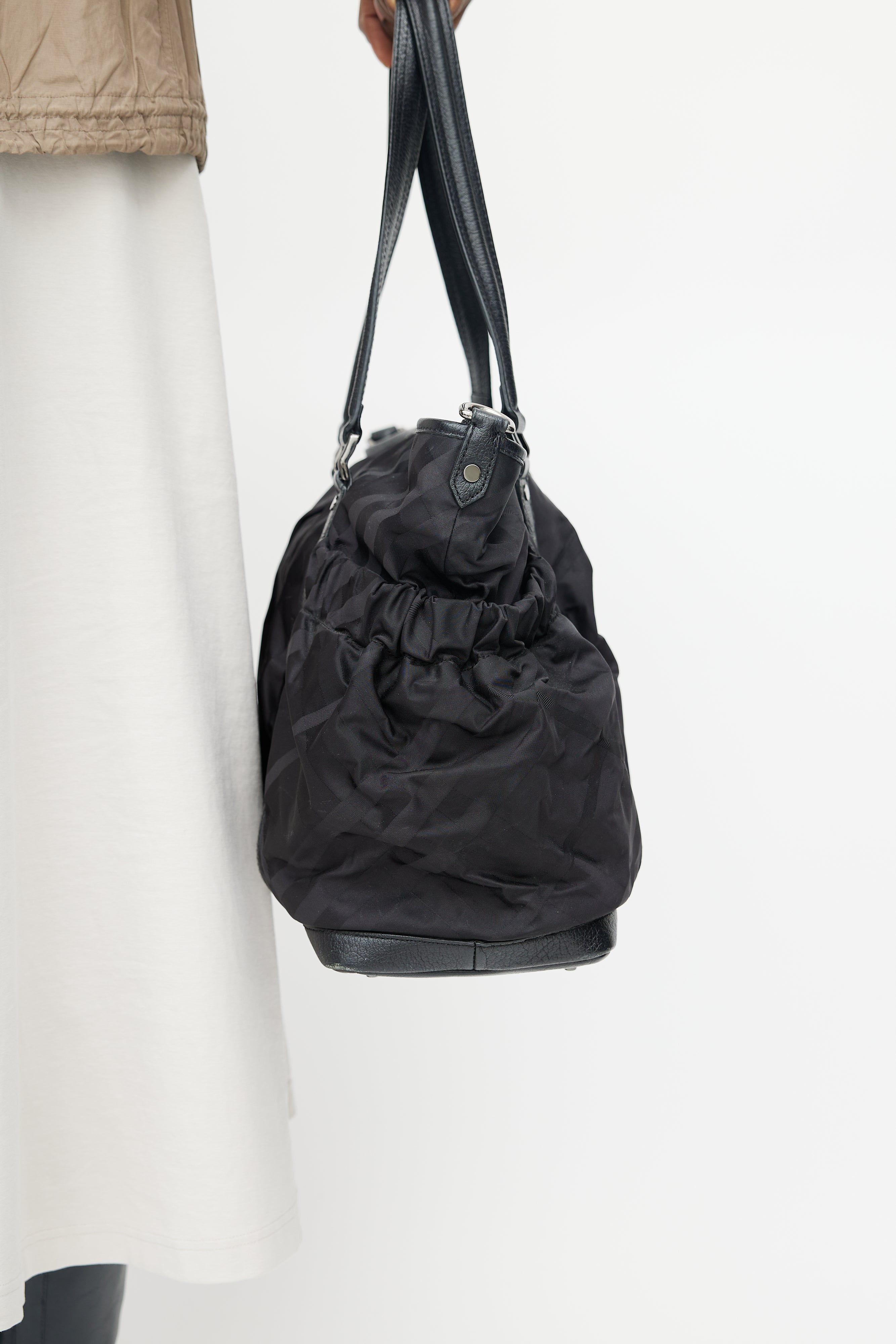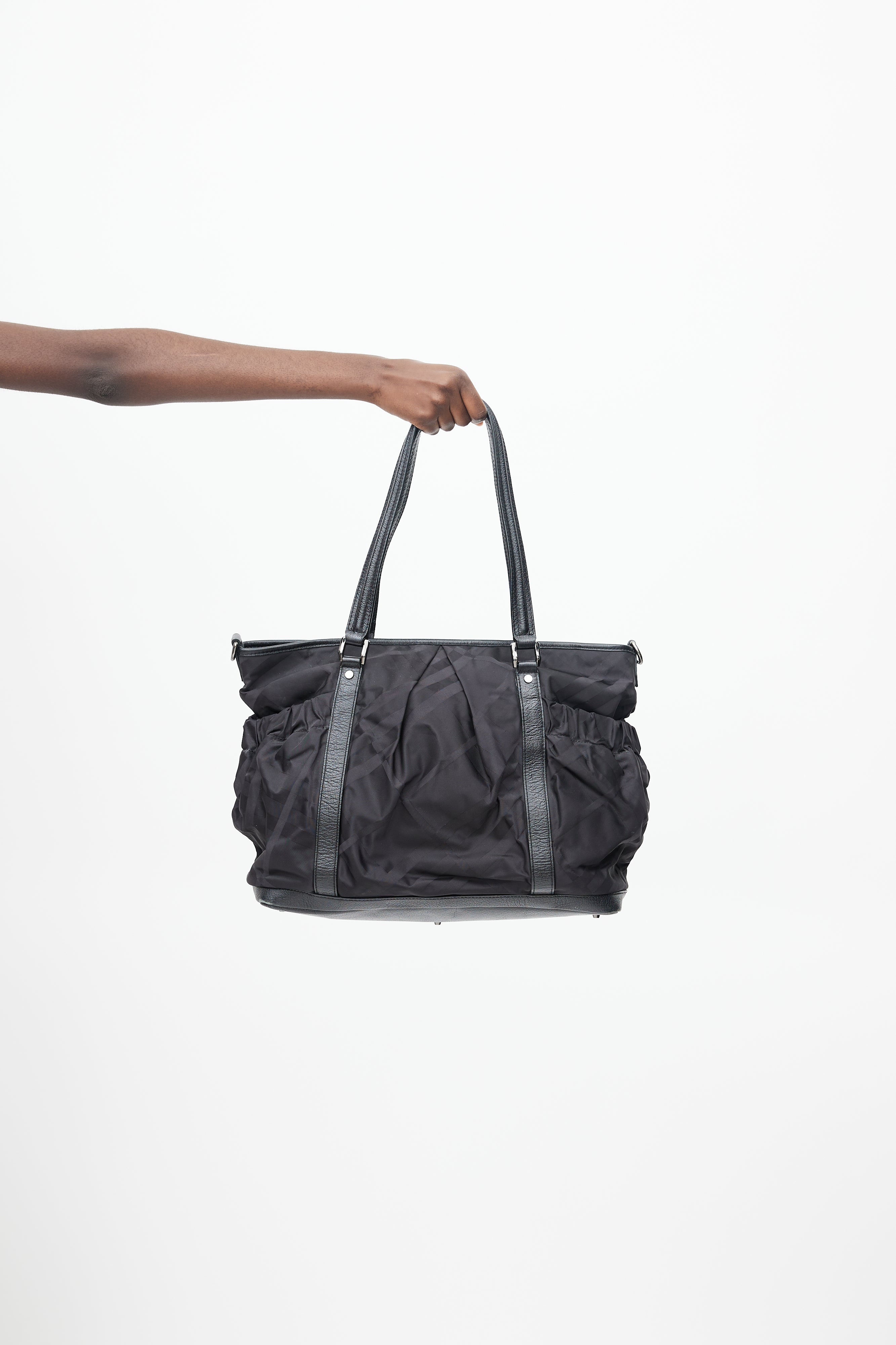 Pre-owned Burberry black nylon diaper bag featuring tonal Nova check print, two side pockets, black leather top handles, detachable shoulder strap, zip closure at top, lined main compartment, four internal pockets, and padded changing pad.
