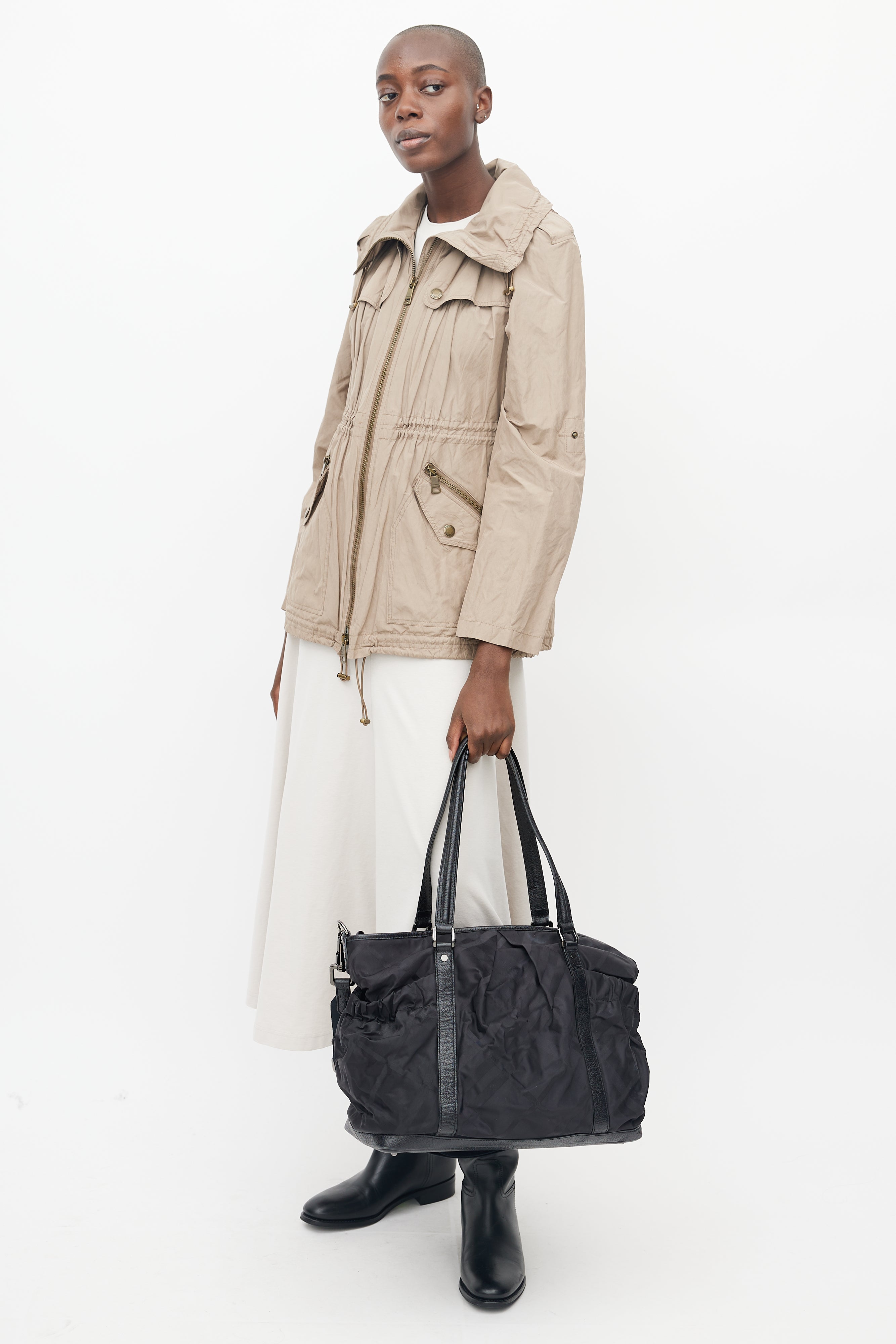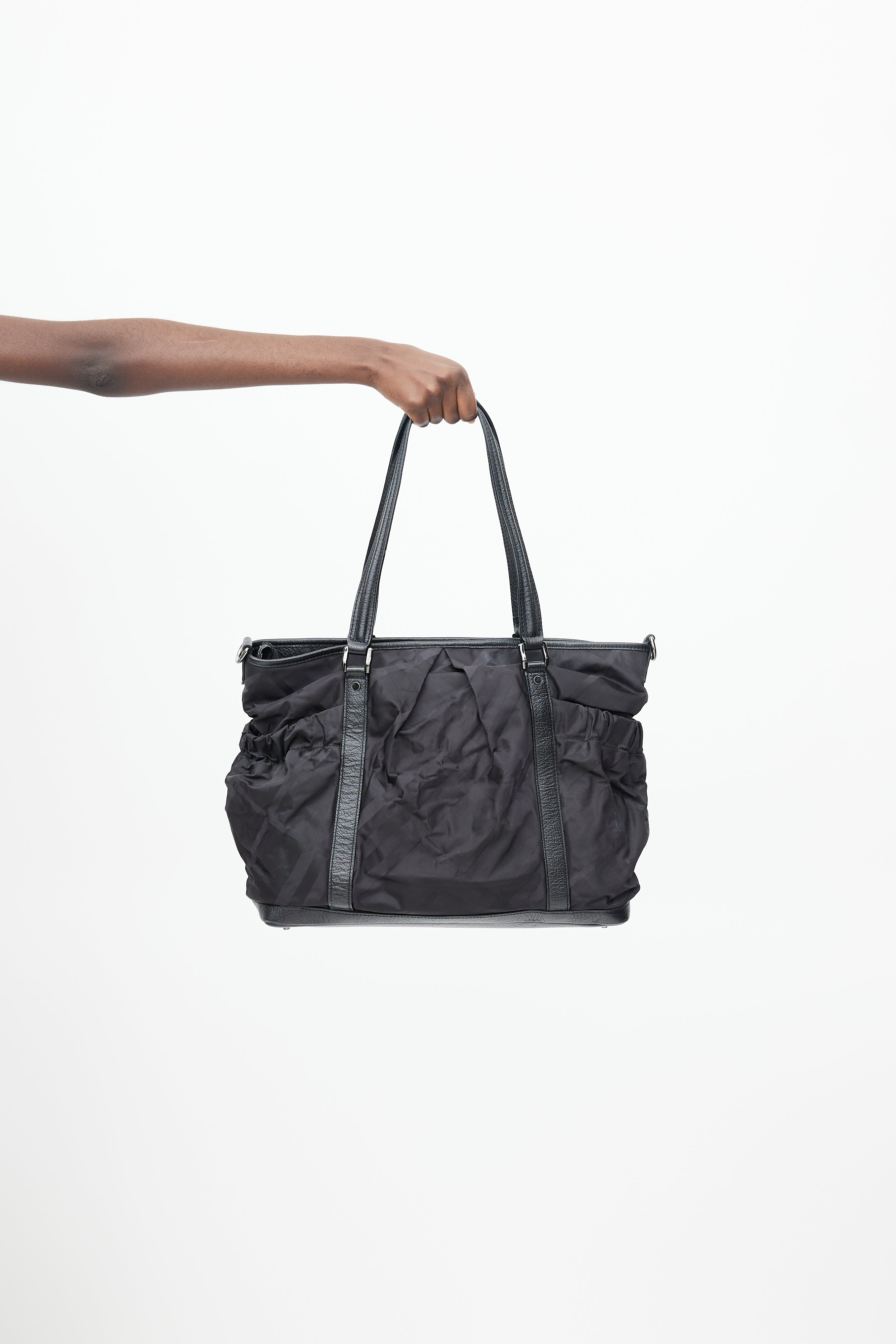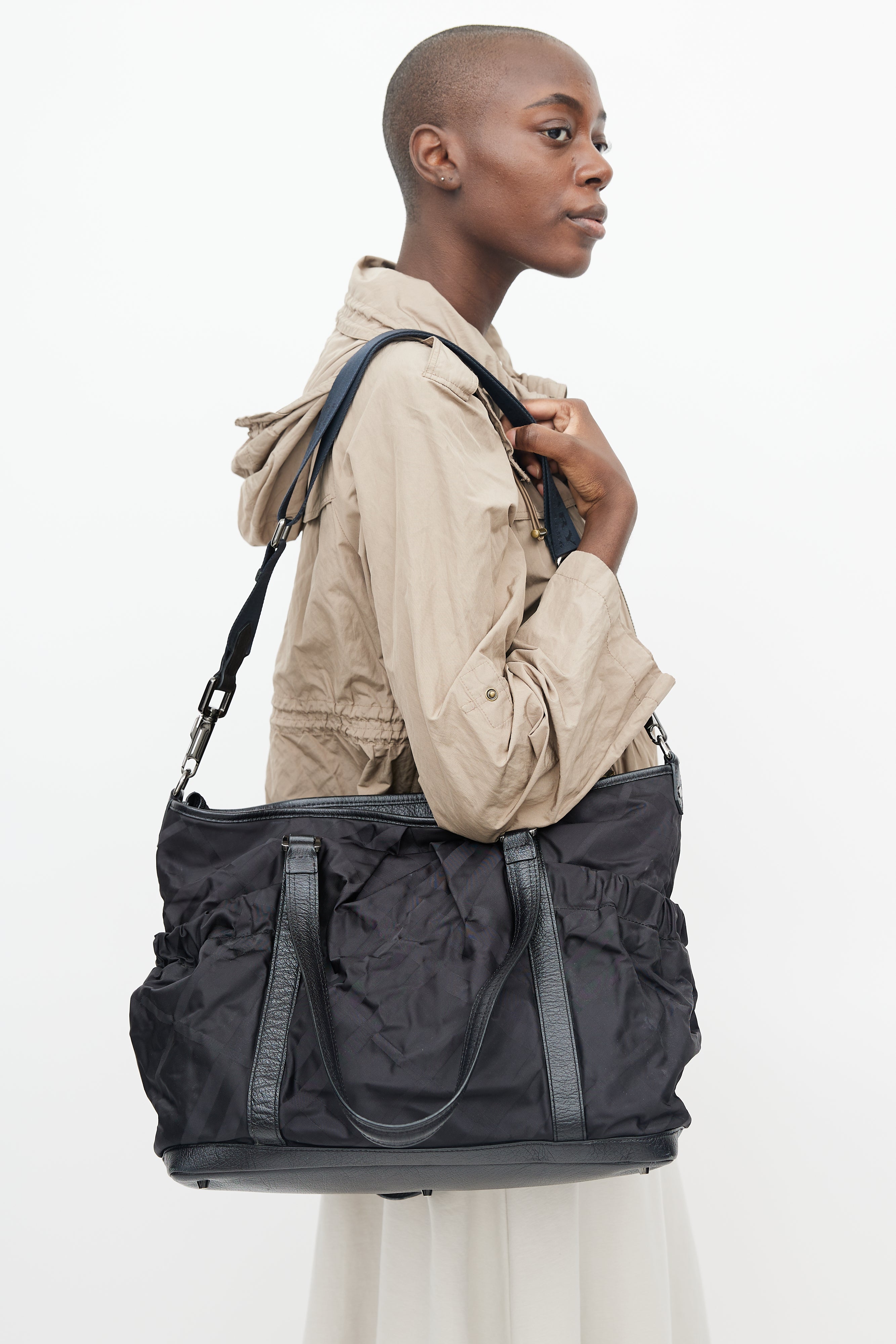 Pre-owned Burberry black nylon diaper bag featuring tonal Nova check print, two side pockets, black leather top handles, detachable shoulder strap, zip closure at top, lined main compartment, four internal pockets, and padded changing pad.