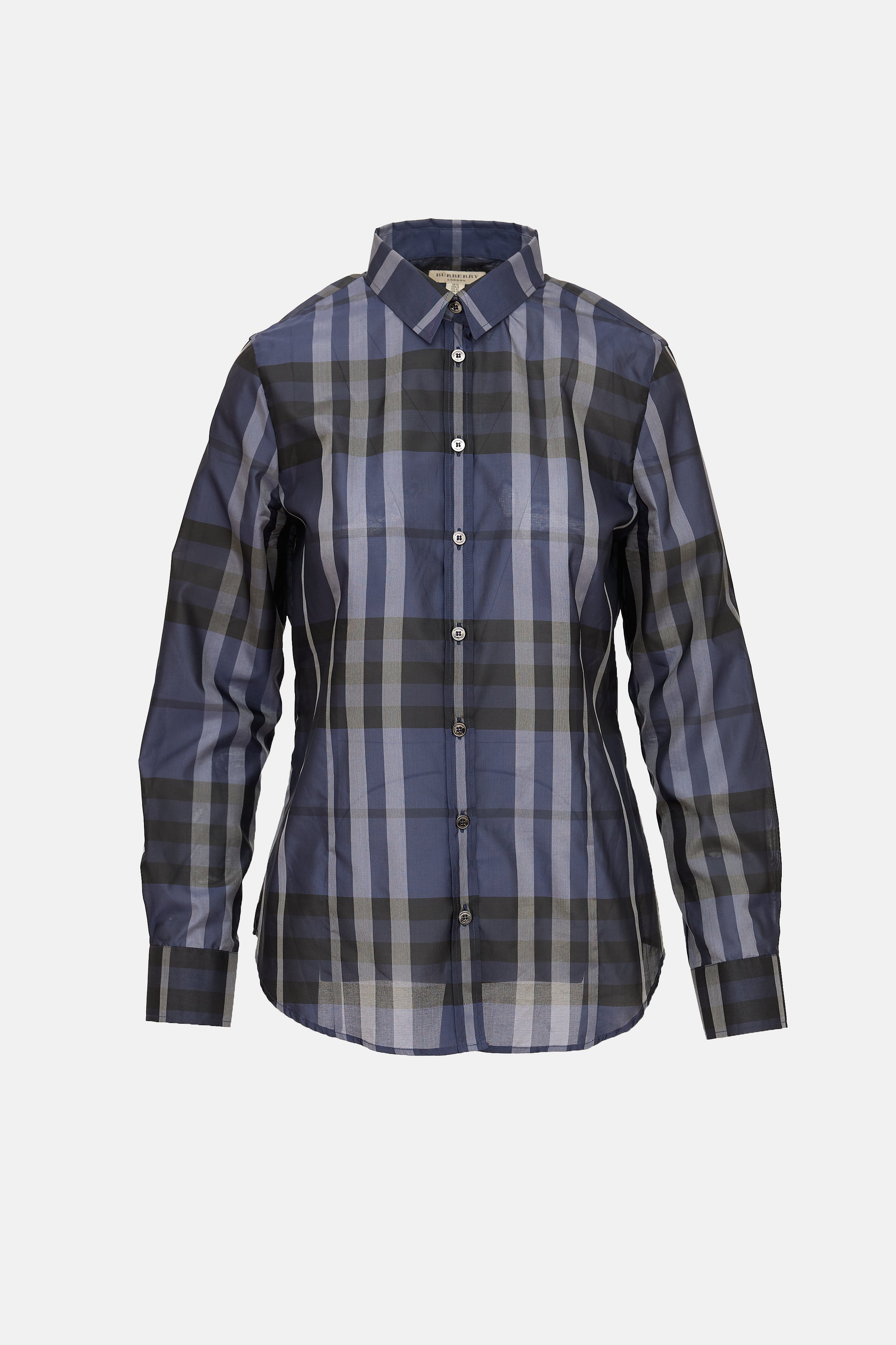 Pre-owned Burberry navy and multicolour check sheer button up shirt featuring pointed collar, buttoned cuffs, and button up closure.