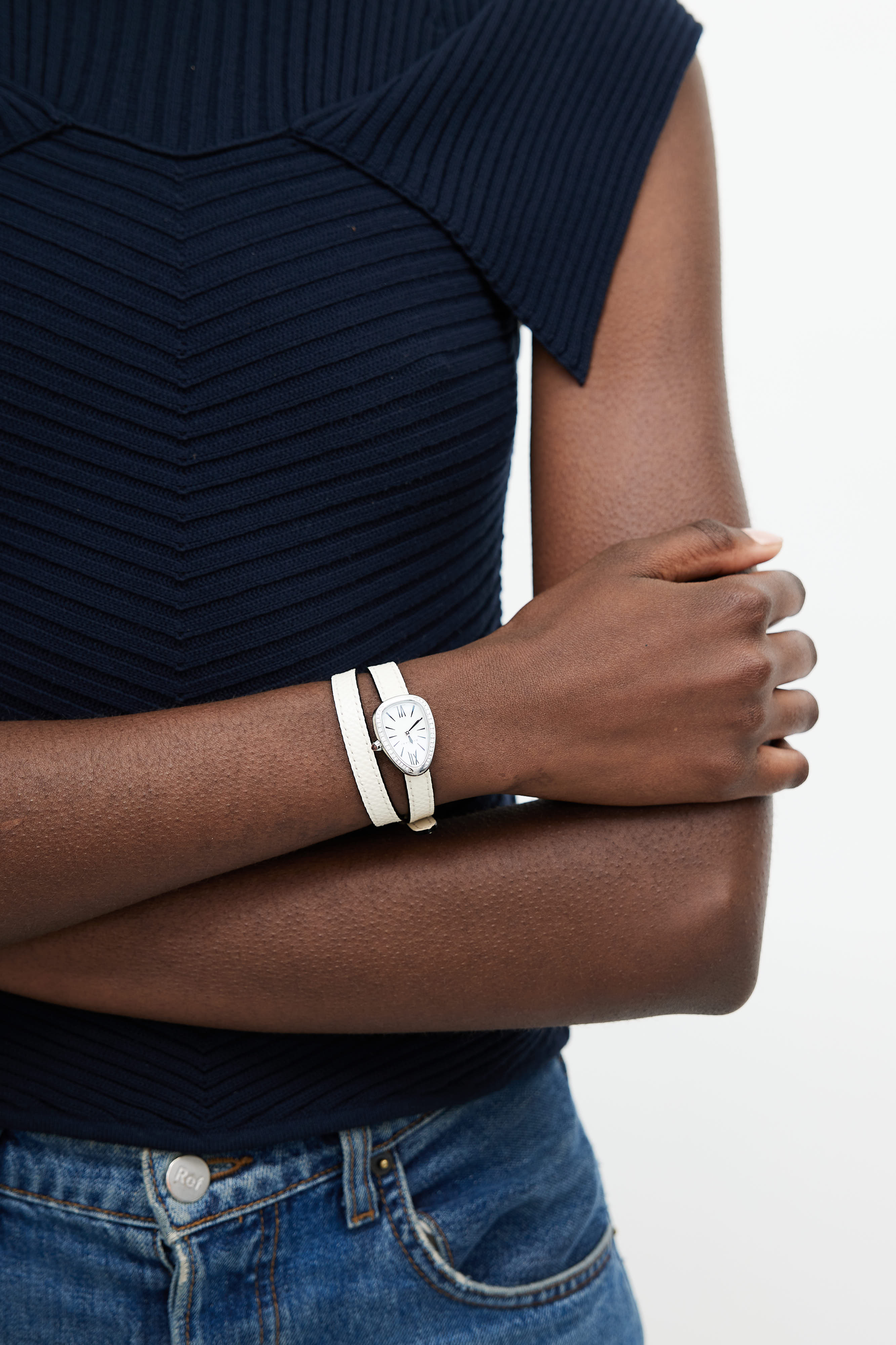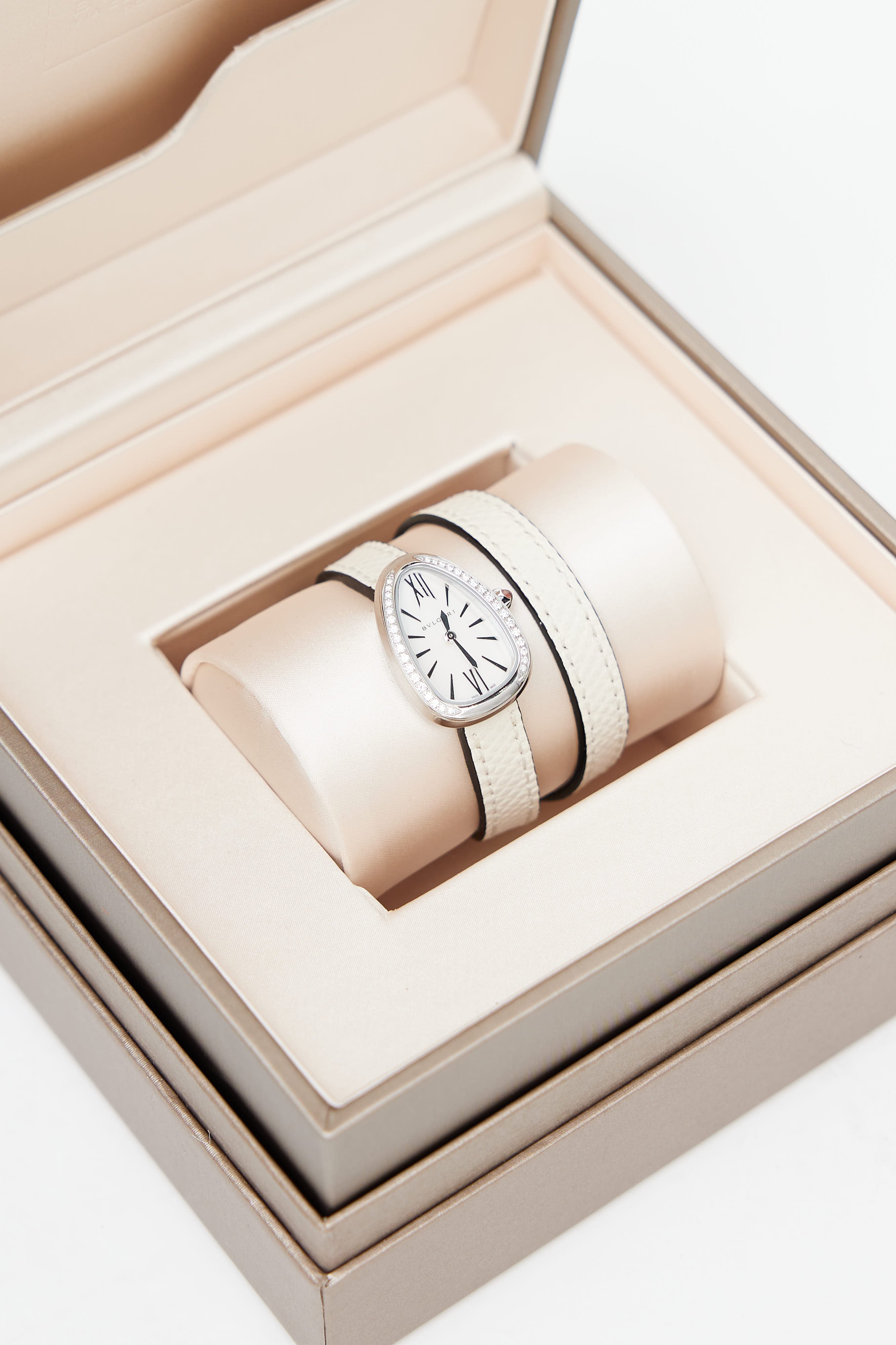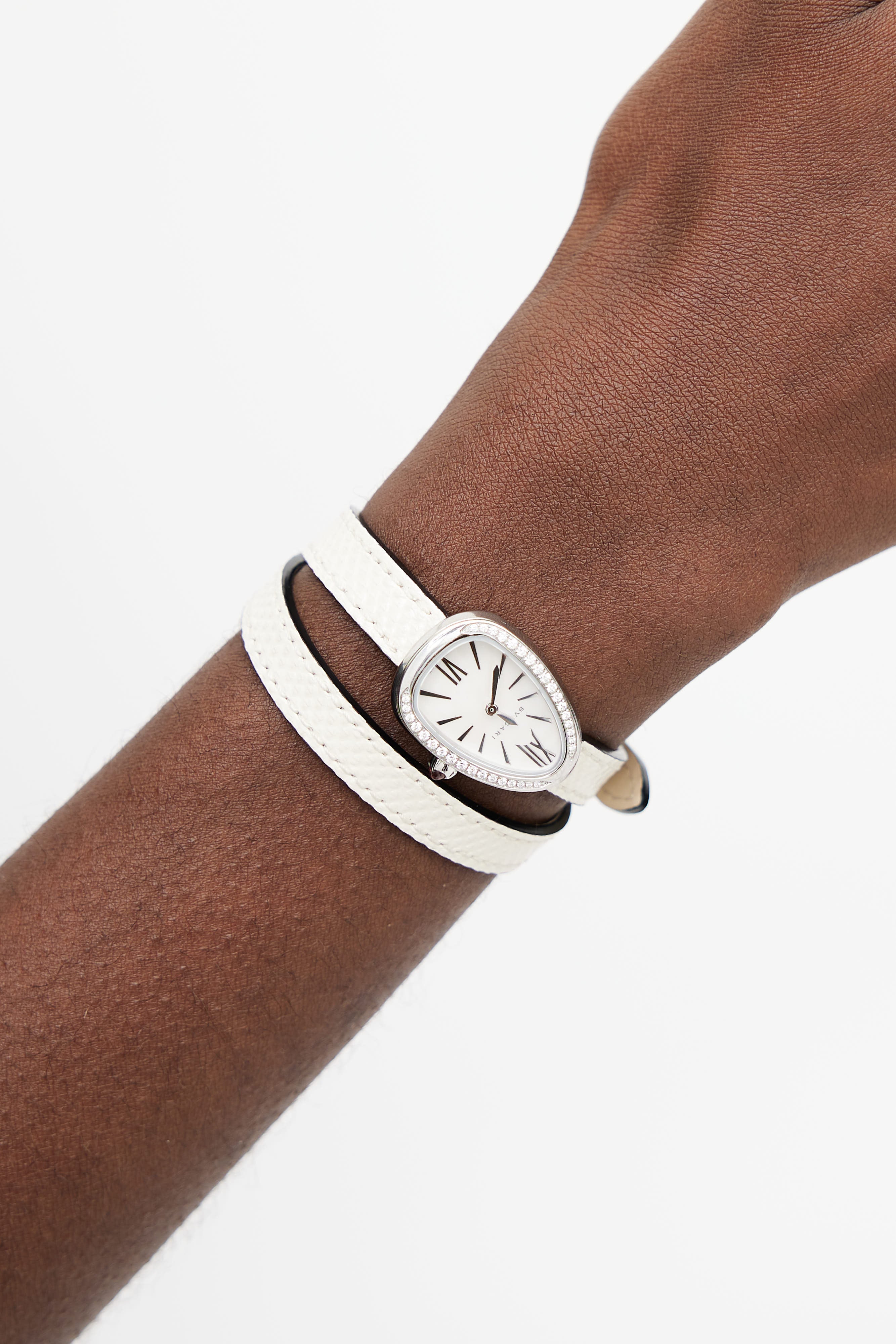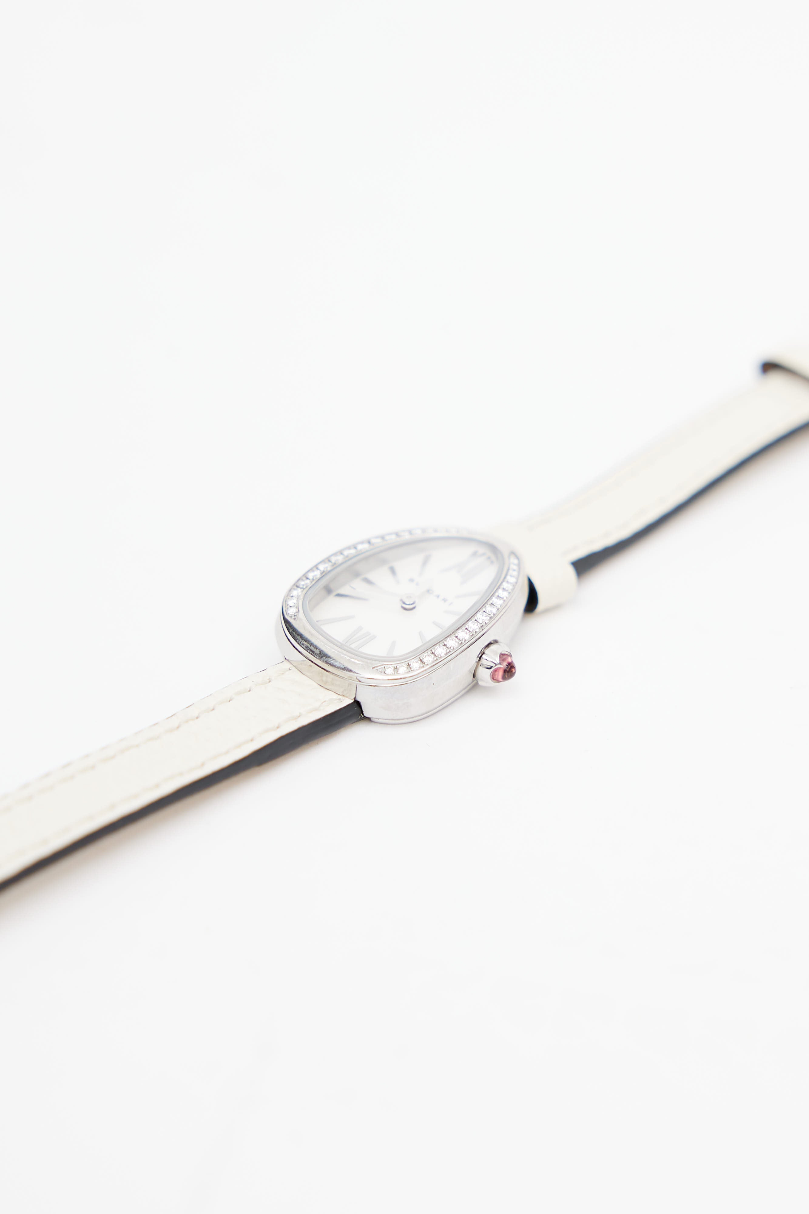 Pre-owned BVLGARI silver Serpenti Seduttori watch featuring a diamond bezel mounted on a 33mm stainless steel drop casebody, stainless steel crown set with a cabochon-cut pink rubellite, white silver opaline dial, silver roman numerals and bar indicators, quartz movement, and a white embossed leather strap. Comes with original box, alternate case and strap, and original paperwork.