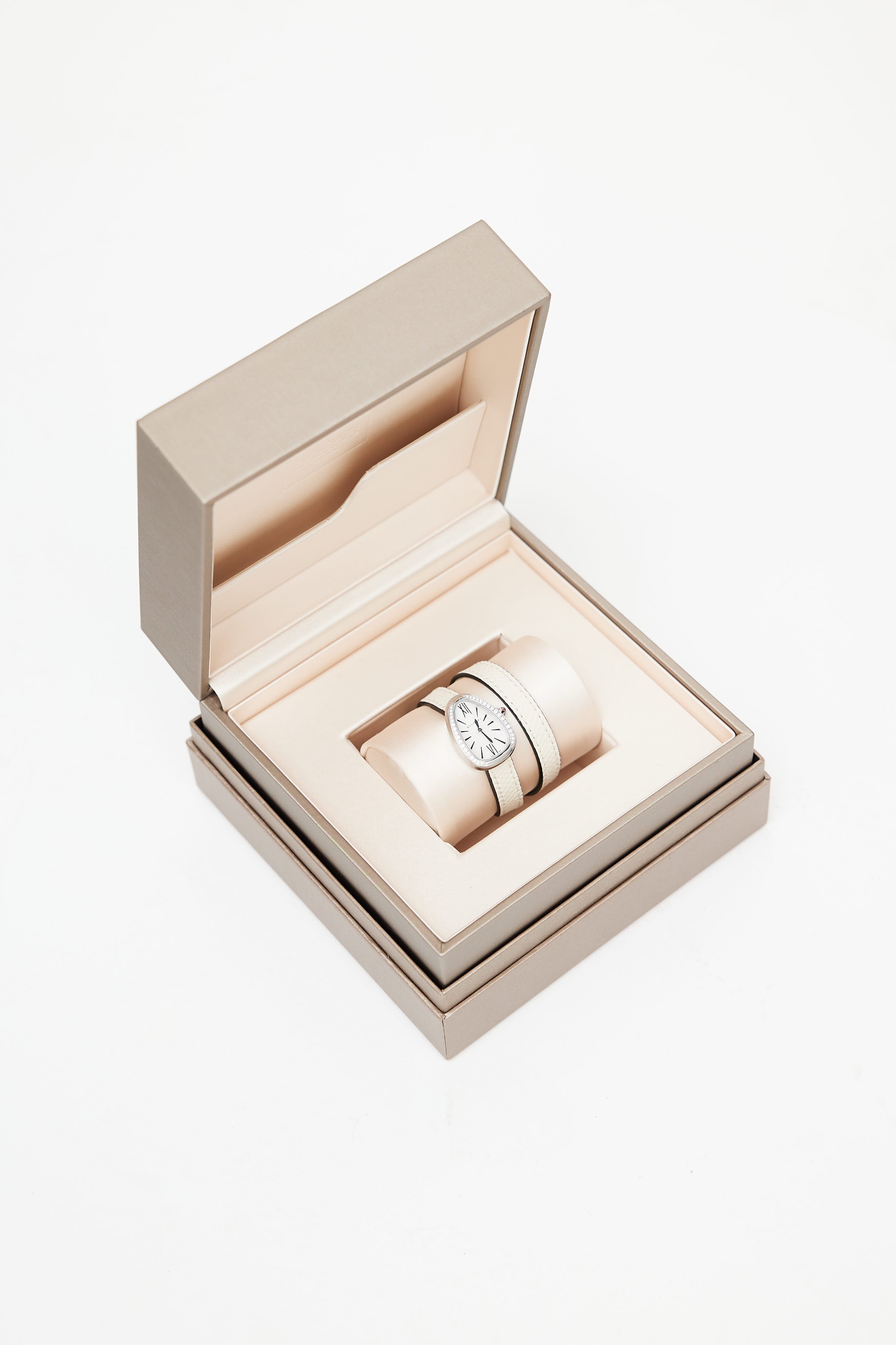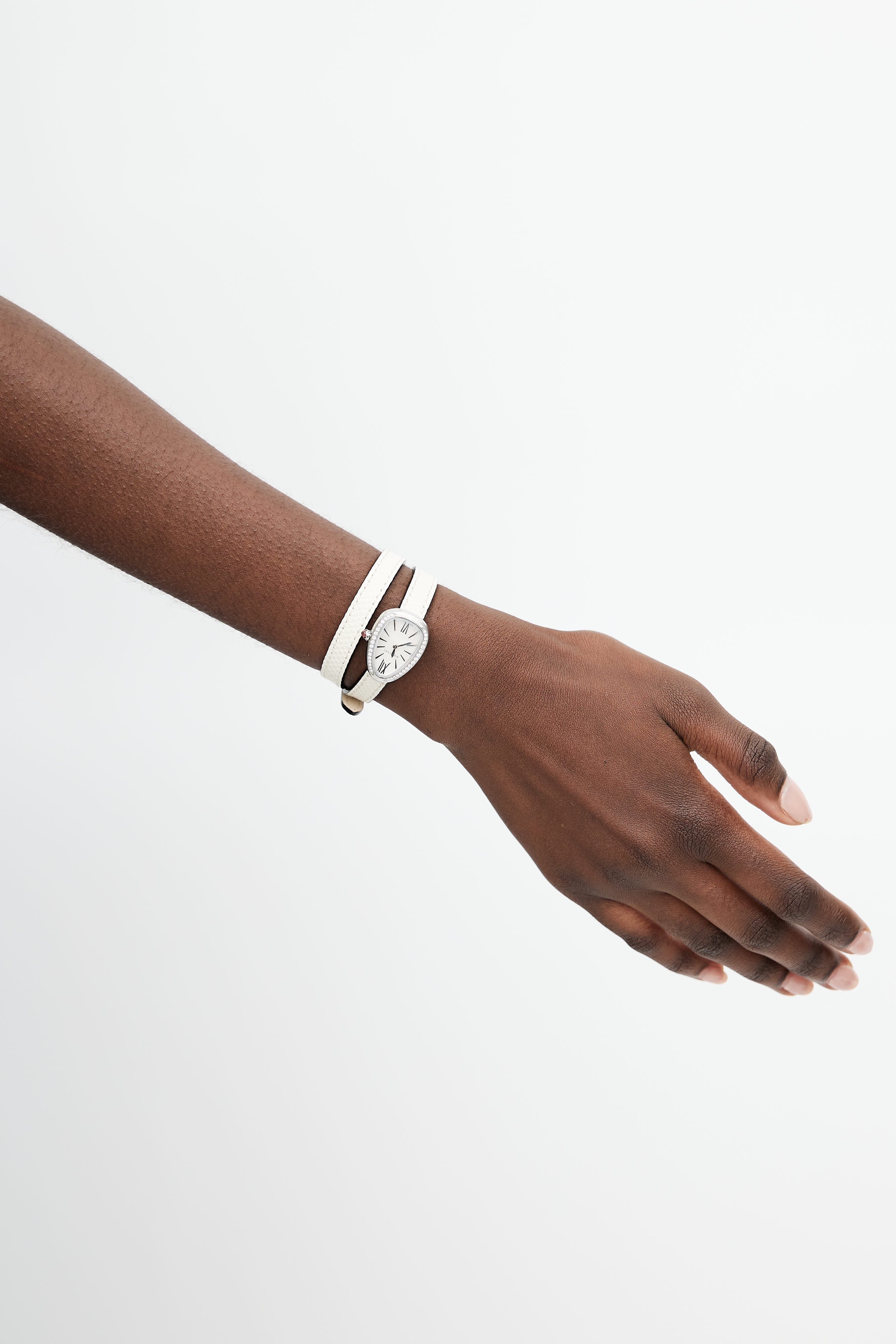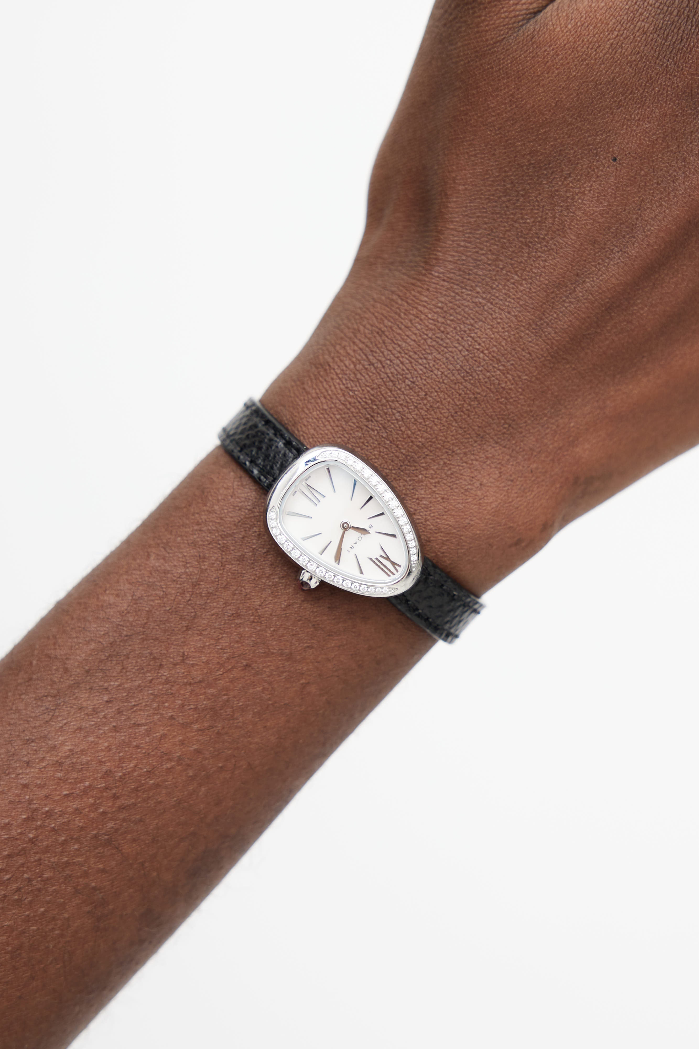 Pre-owned BVLGARI silver Serpenti Seduttori watch featuring a diamond bezel mounted on a 33mm stainless steel drop casebody, stainless steel crown set with a cabochon-cut pink rubellite, white silver opaline dial, silver roman numerals and bar indicators, quartz movement, and a white embossed leather strap. Comes with original box, alternate case and strap, and original paperwork.